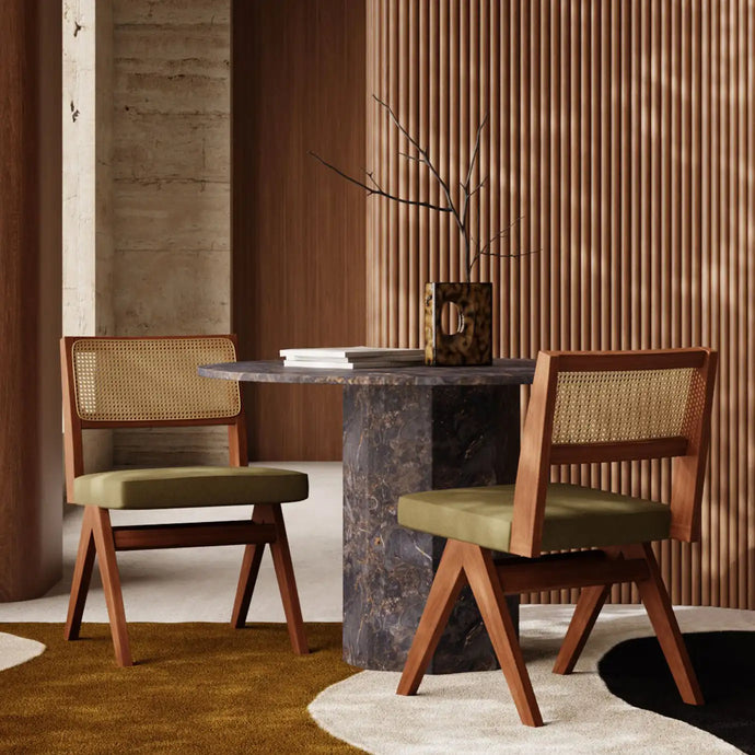 What oozes retro appeal more than the new Cary? From the sultry softness of sustainable soft mohair style velvet seats seen here, to the textural feels of it's eco-friendly, natural rattan backrest, Cary mixes functional and Luxe 70s Revival design. We love the retro vibe it brings; available in both dining and carver dining chair styles and a range of trending fabrics. Note those classic V-shaped legs, reminiscent of mid-century modern design.