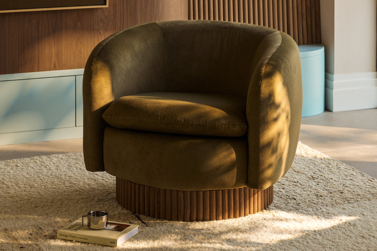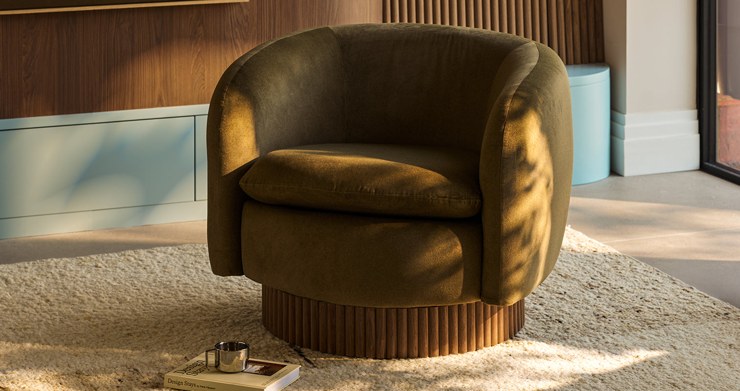 Introducing laid-back lounging with the Viva Swivel Chair in warm moss green. This classic tub chair design has a low-slung, wide seat with a 360° swivel function for a truly elevated look, reminiscent of the relaxed 1960s interiors.