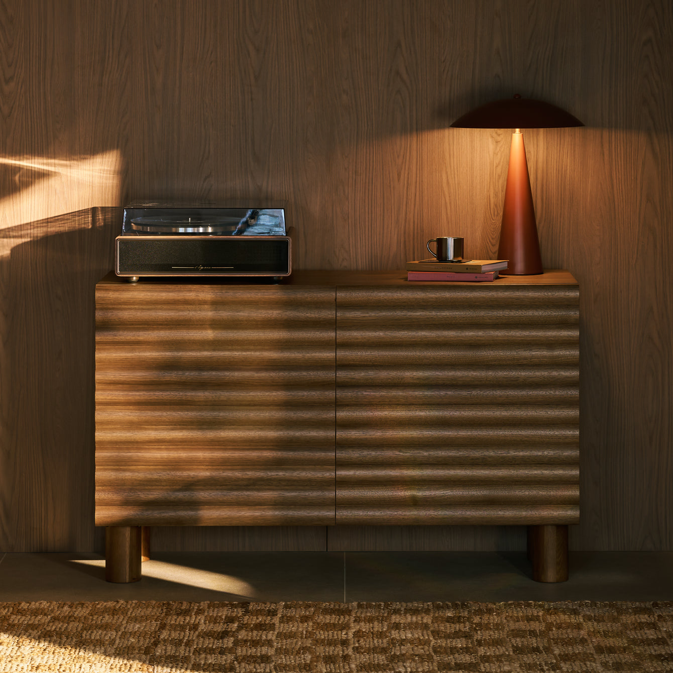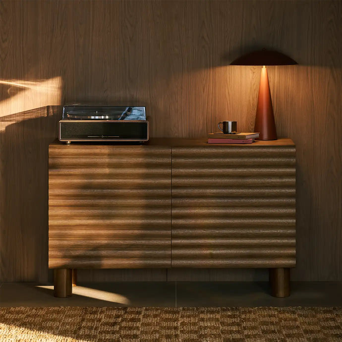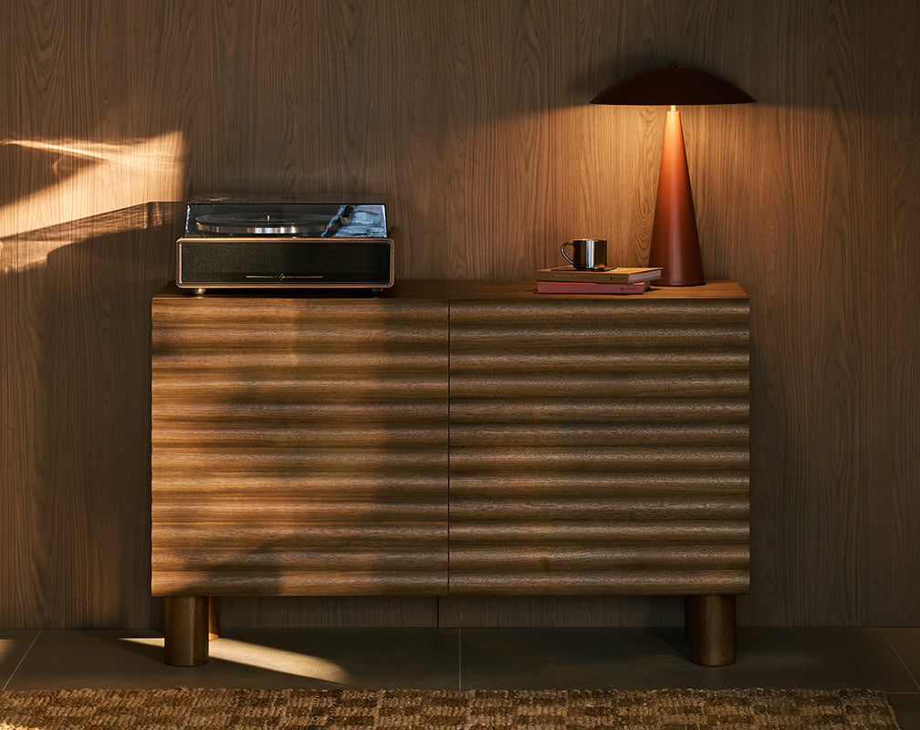 The Raphael makes a strong first impression with chunky ribbed doors and a rich dark wood finish — bold, confident, and impossible to ignore. Open it up and you’ll find generous storage with adjustable shelving, designed to keep everything neatly in sync.