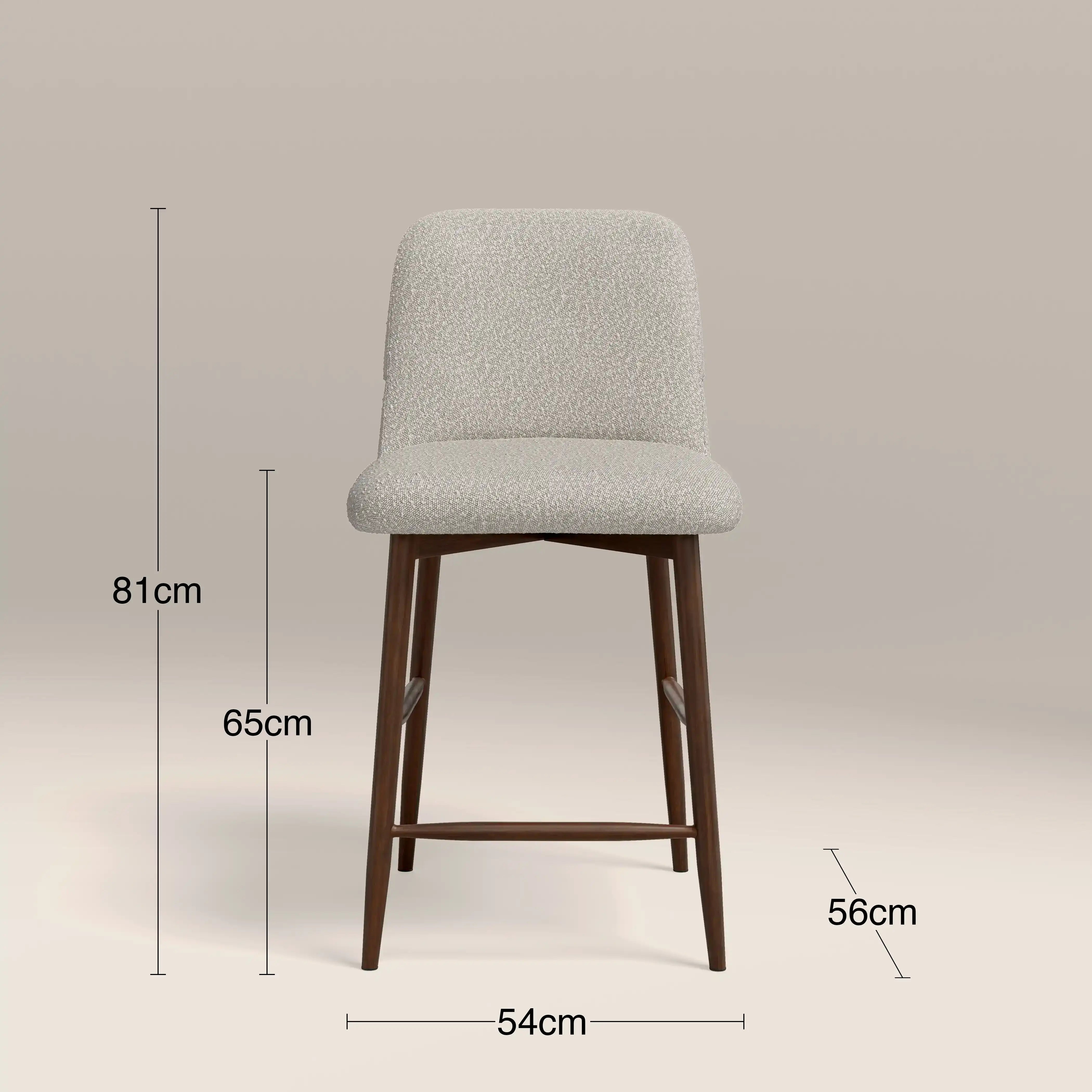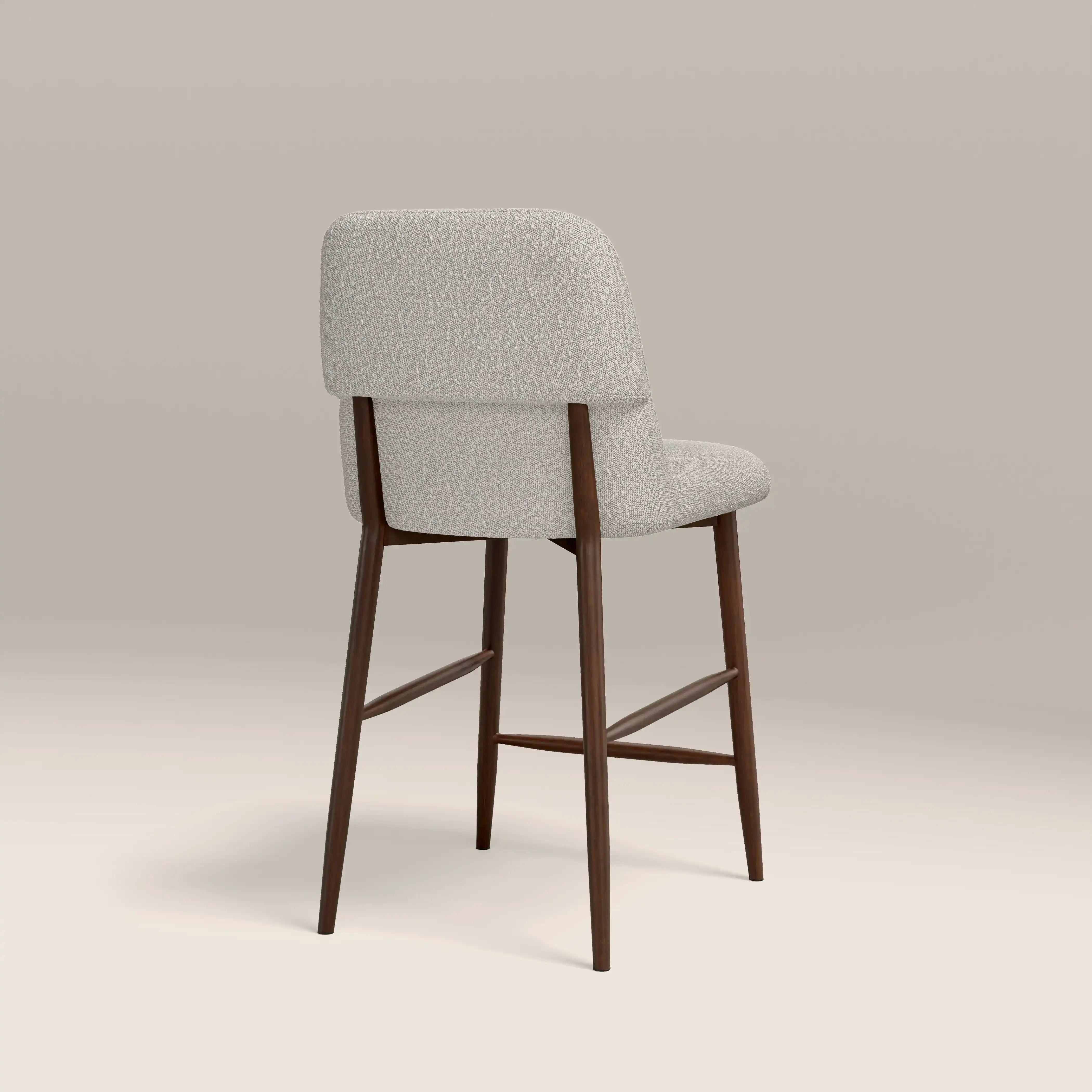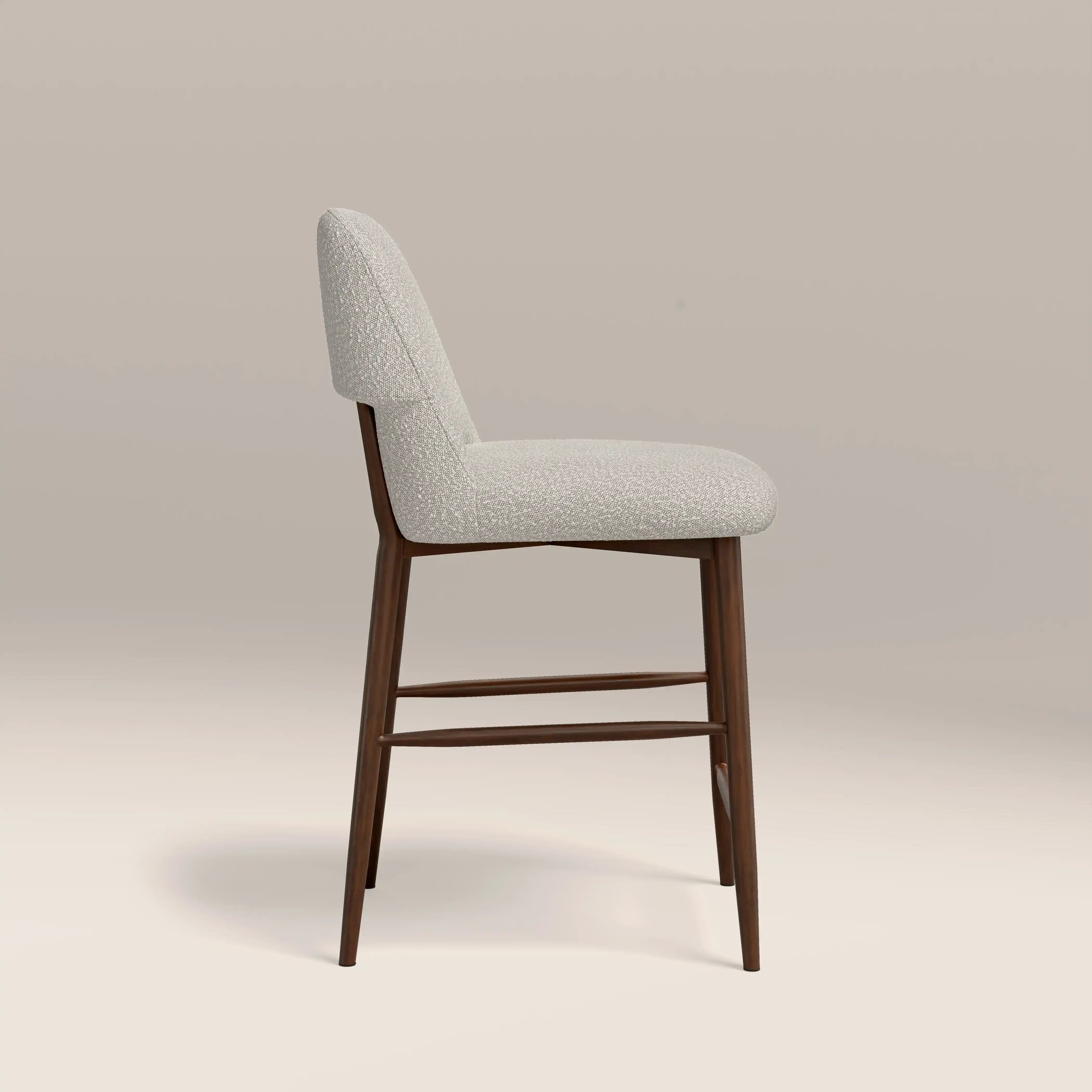 The Amari Kitchen Stool blends simplicity and elegance with a contemporary edge. Featuring a tactile boucle fabric in our signature speckled stone for a luxurious yet understated look, this counter height stool combines comfort with a sophisticated design. An ideal addition to both casual and formal settings, the durable metal legs in a walnut wood finish provide a sturdy foundation while complementing this modern chic style.