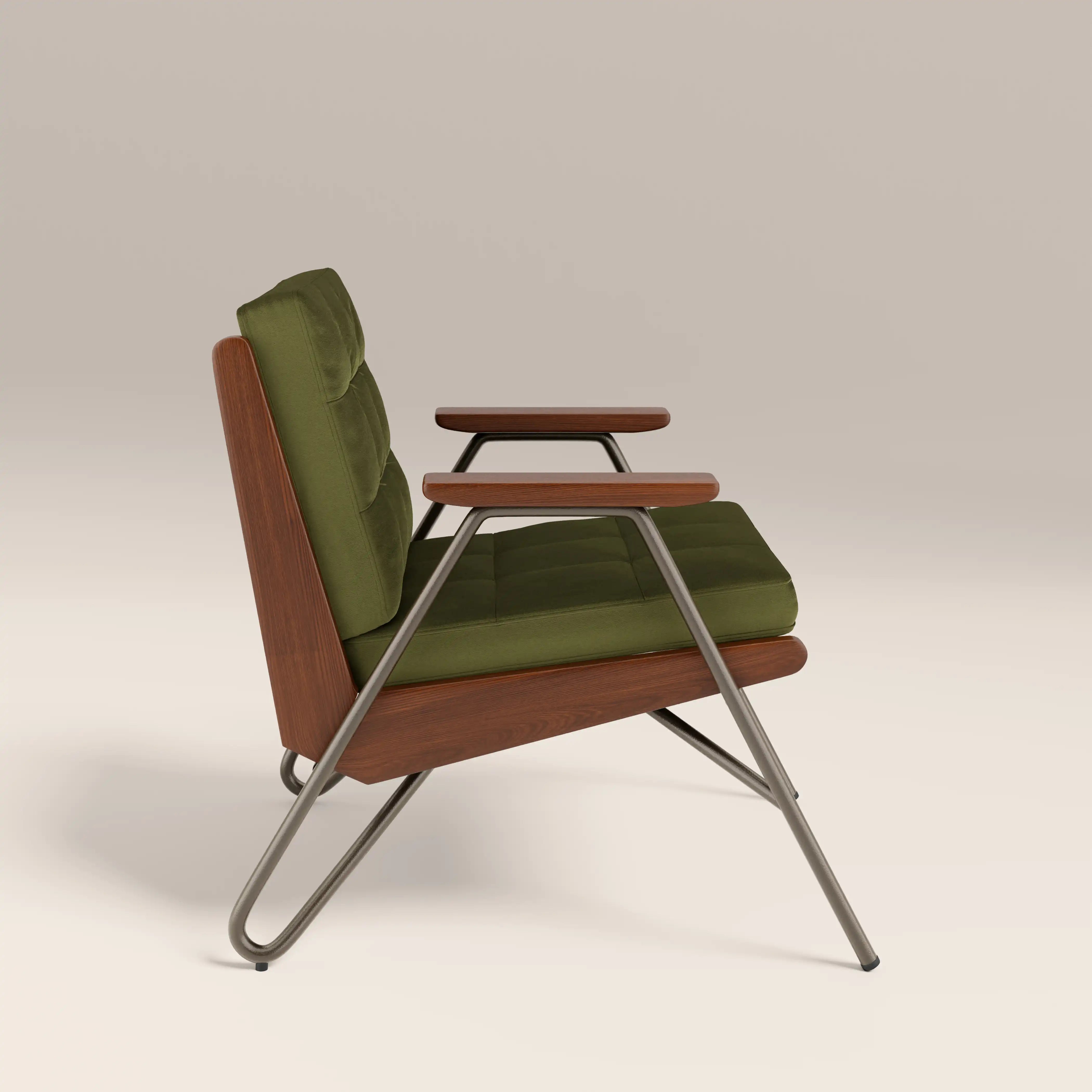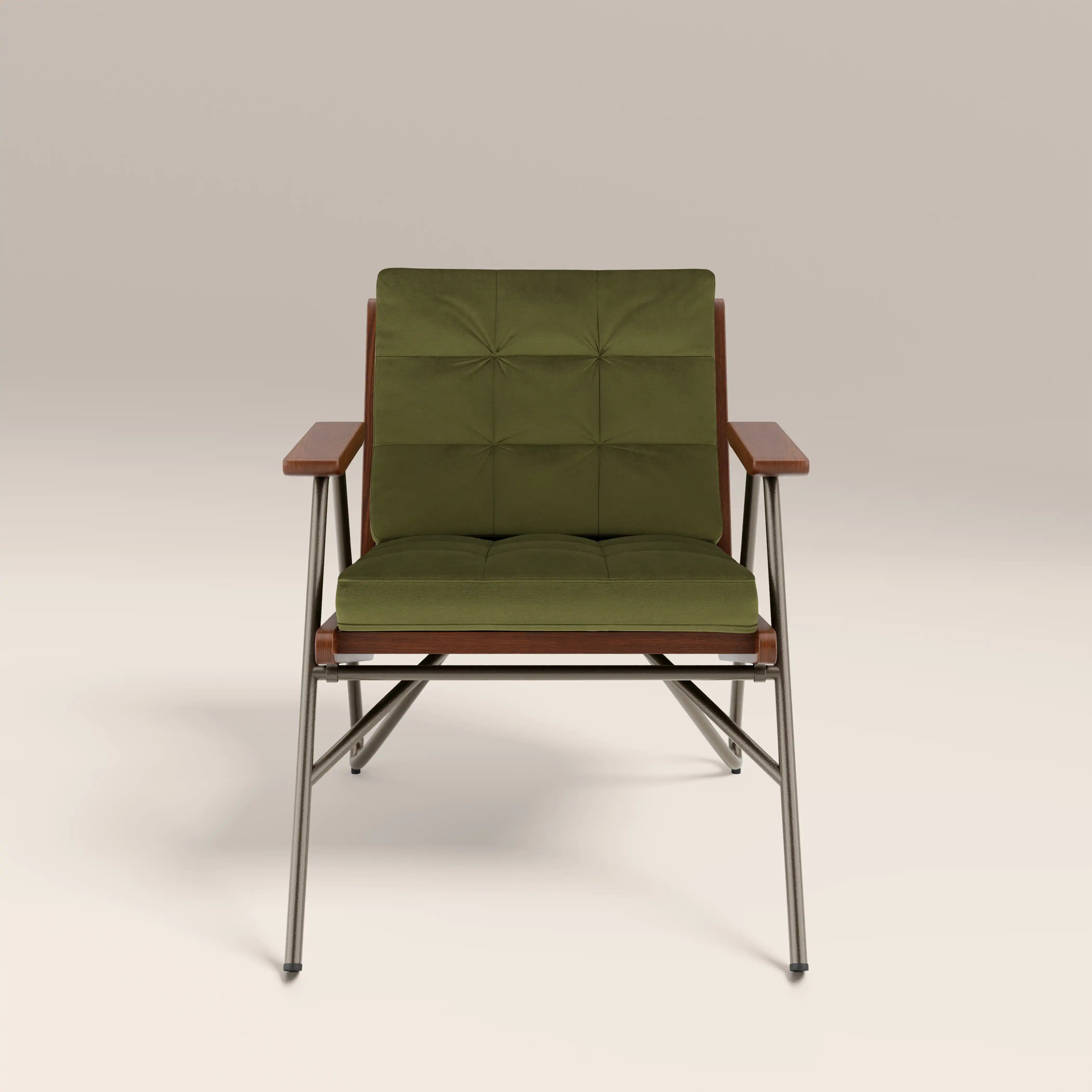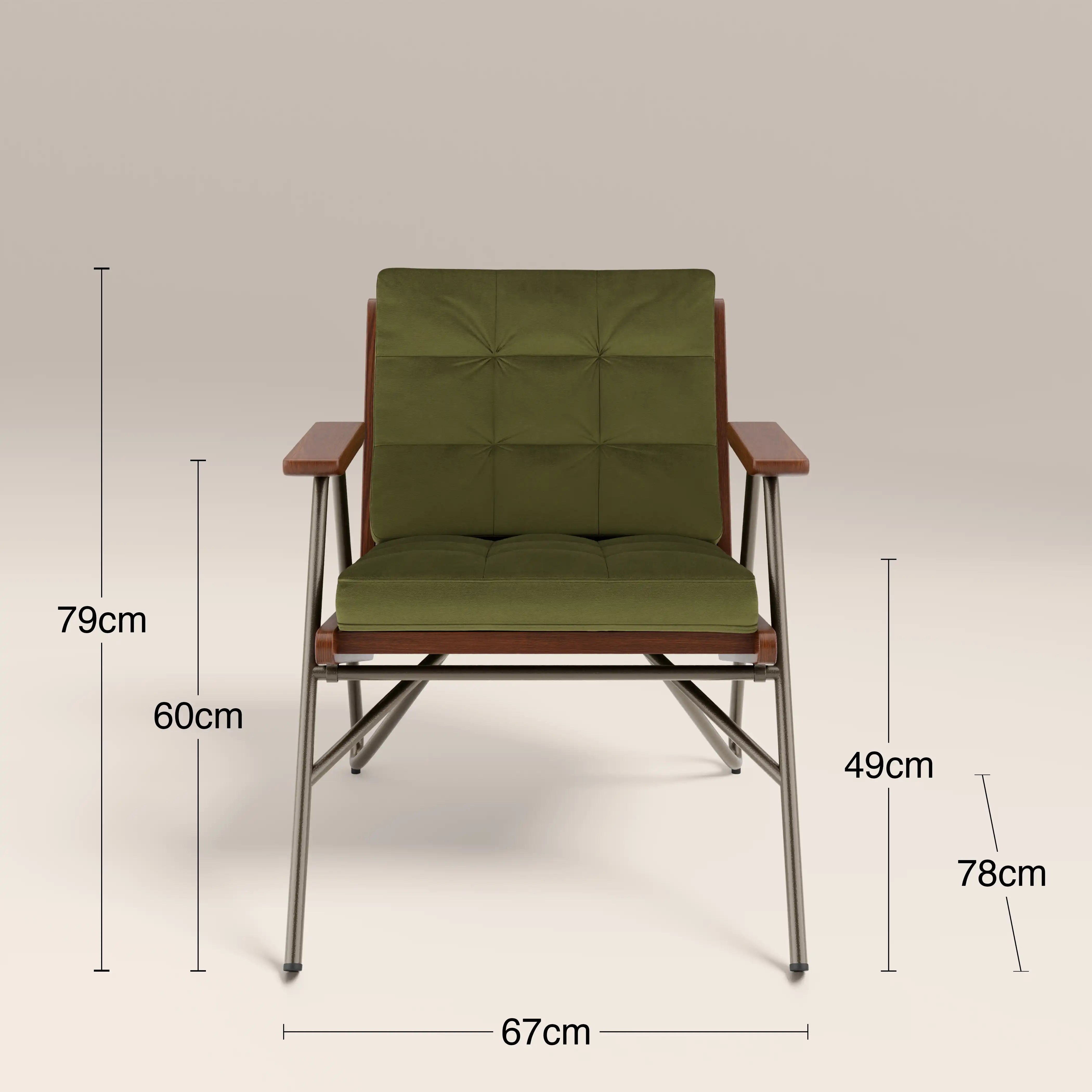 Meet the Aspen. A laid-back accent chair with serious mid-century credentials, featuring blind tufted cushions, and angled ash wood frame and armrests in a walnut stain. In olive green, the Aspen velvet chair brings warmth without shouting for attention. The slim yet sturdy iron legs in a gunmetal finish keep this look light yet architectural. Perfect for styling a reading nook or adding character to your living space, this is a mid-century design with just the right amount of retro attitude. Comfortable, considered, and effortlessly cool.
