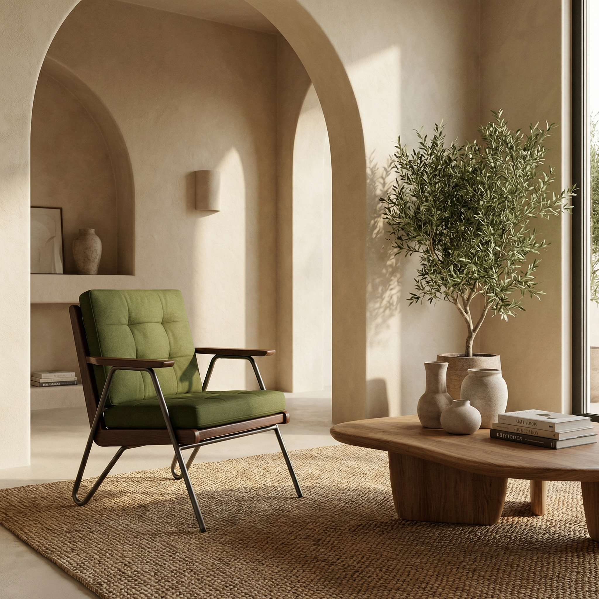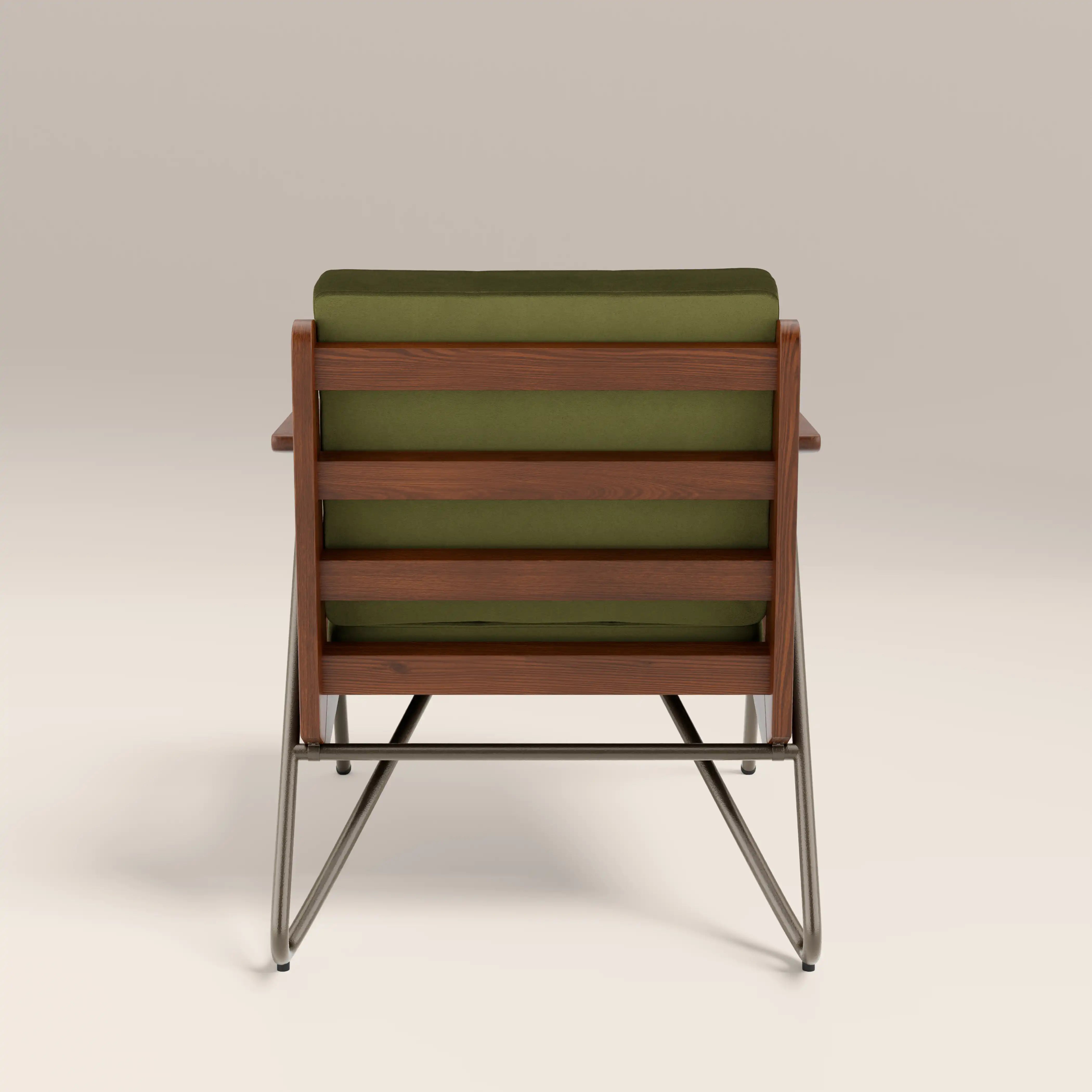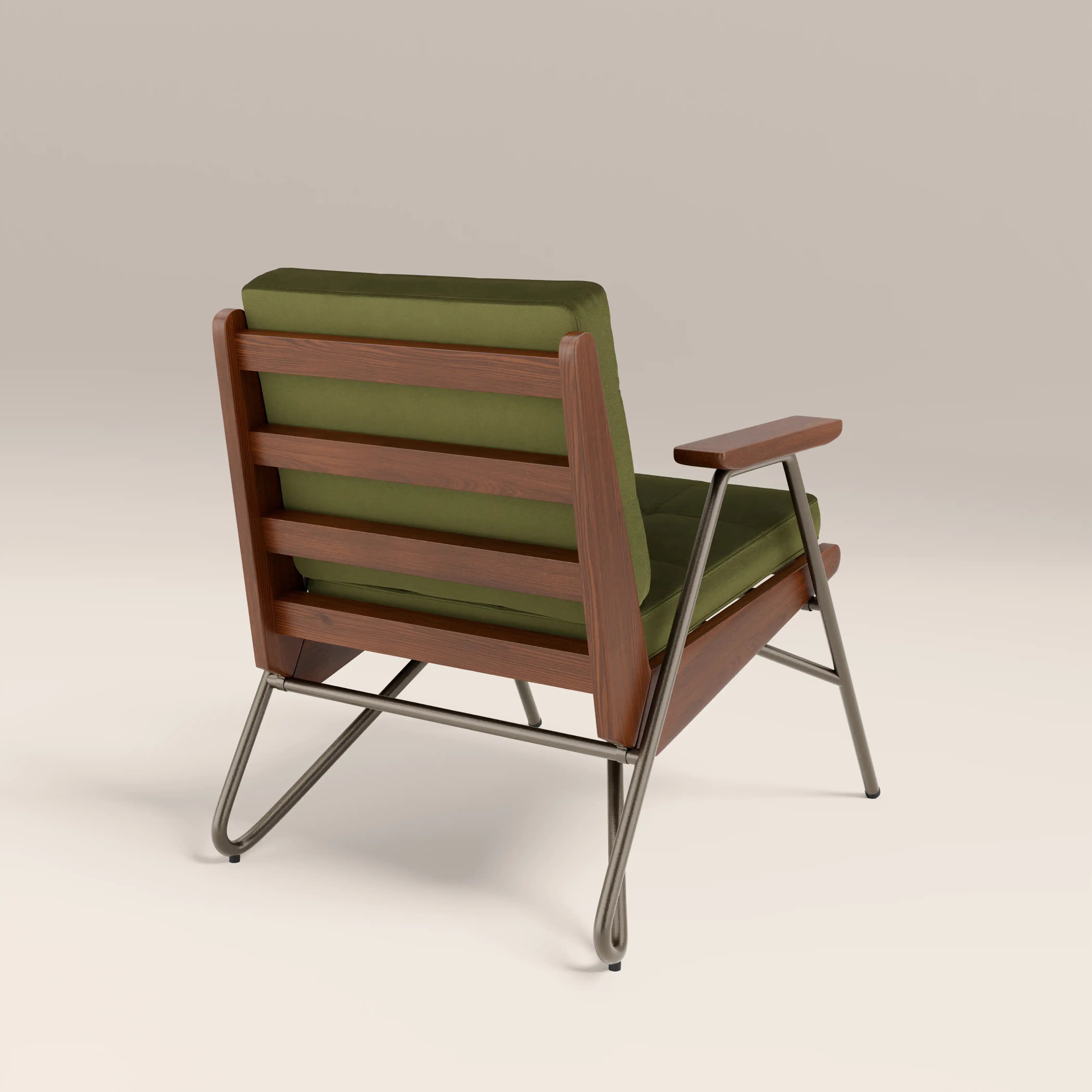 Meet the Aspen. A laid-back accent chair with serious mid-century credentials, featuring blind tufted cushions, and angled ash wood frame and armrests in a walnut stain. In olive green, the Aspen velvet chair brings warmth without shouting for attention. The slim yet sturdy iron legs in a gunmetal finish keep this look light yet architectural. Perfect for styling a reading nook or adding character to your living space, this is a mid-century design with just the right amount of retro attitude. Comfortable, considered, and effortlessly cool.