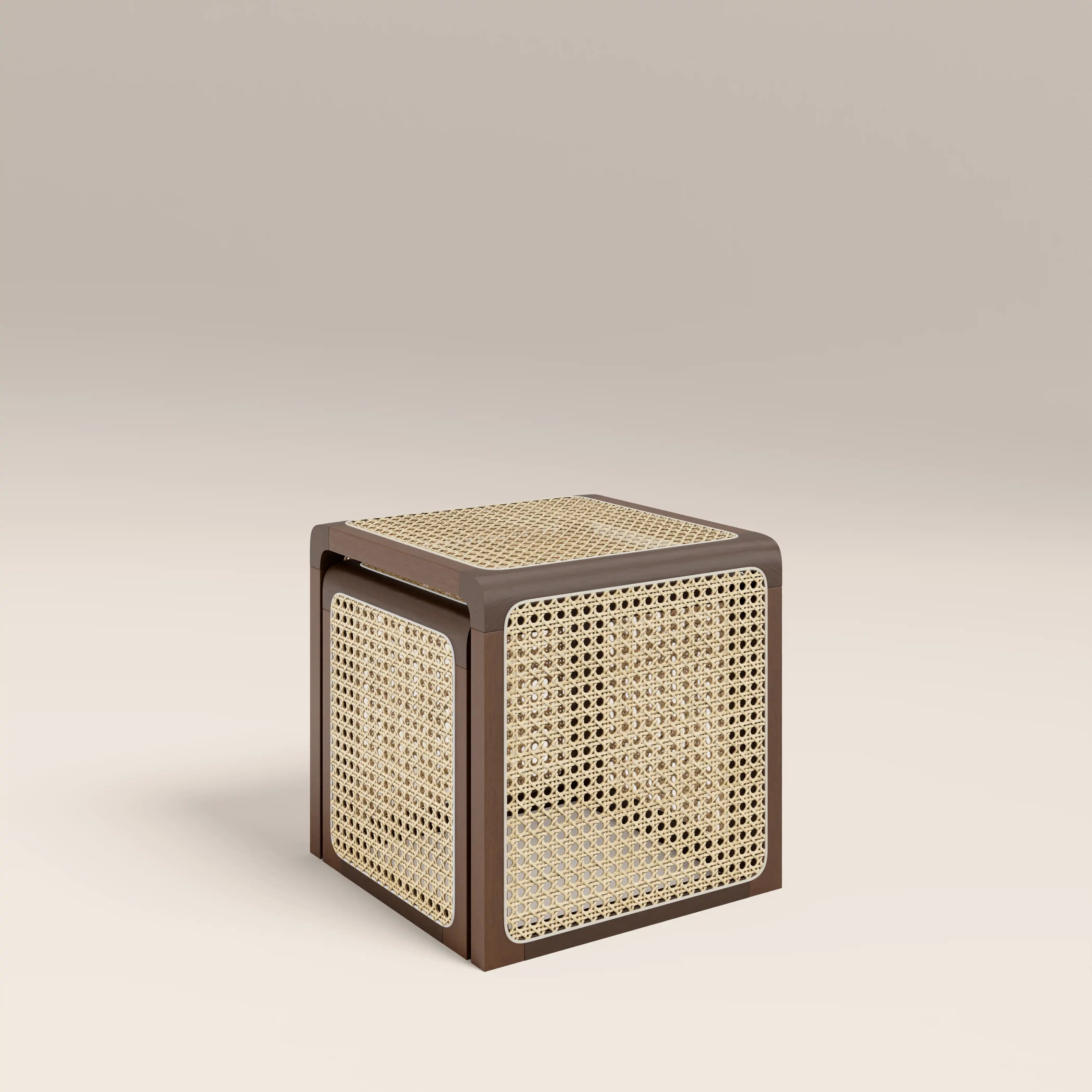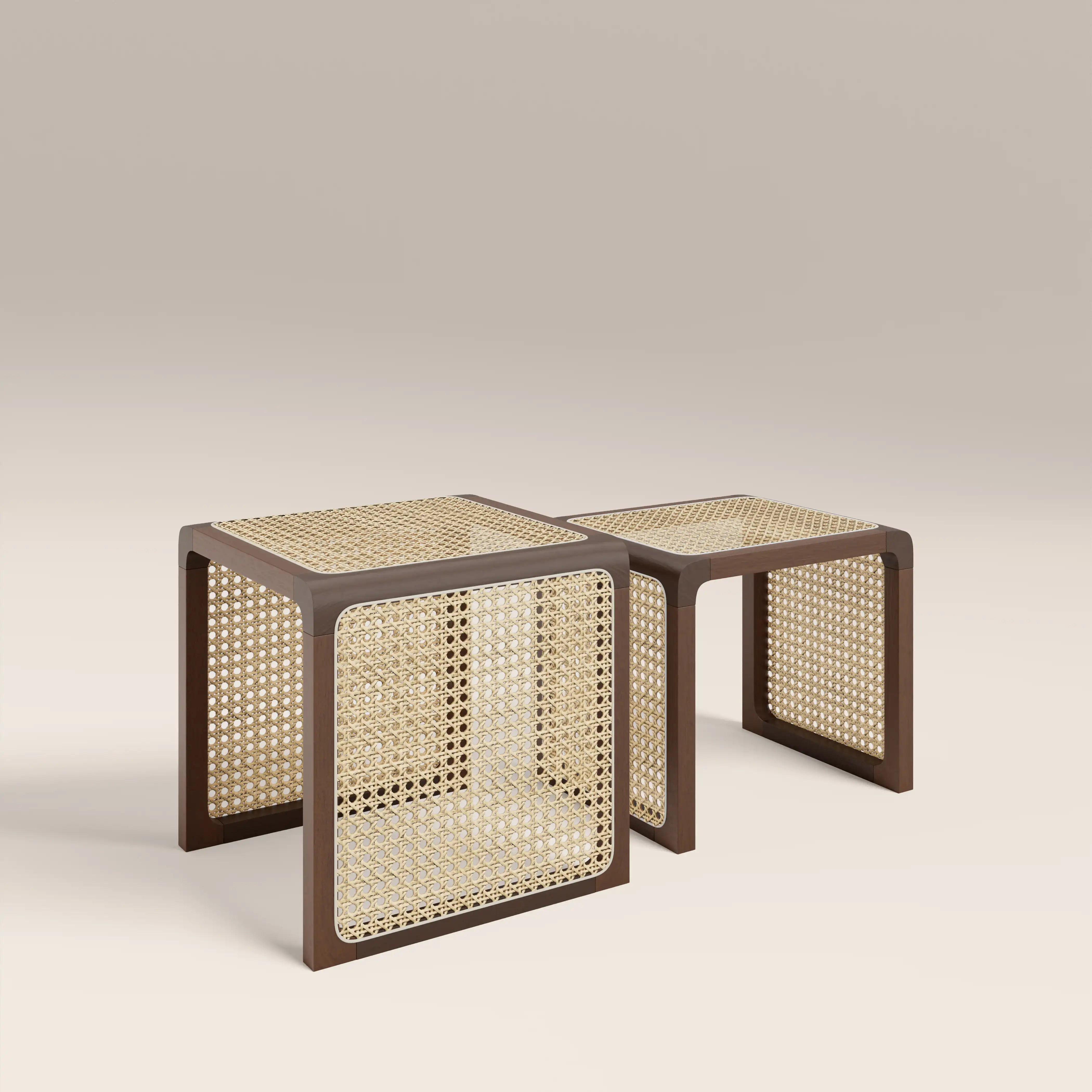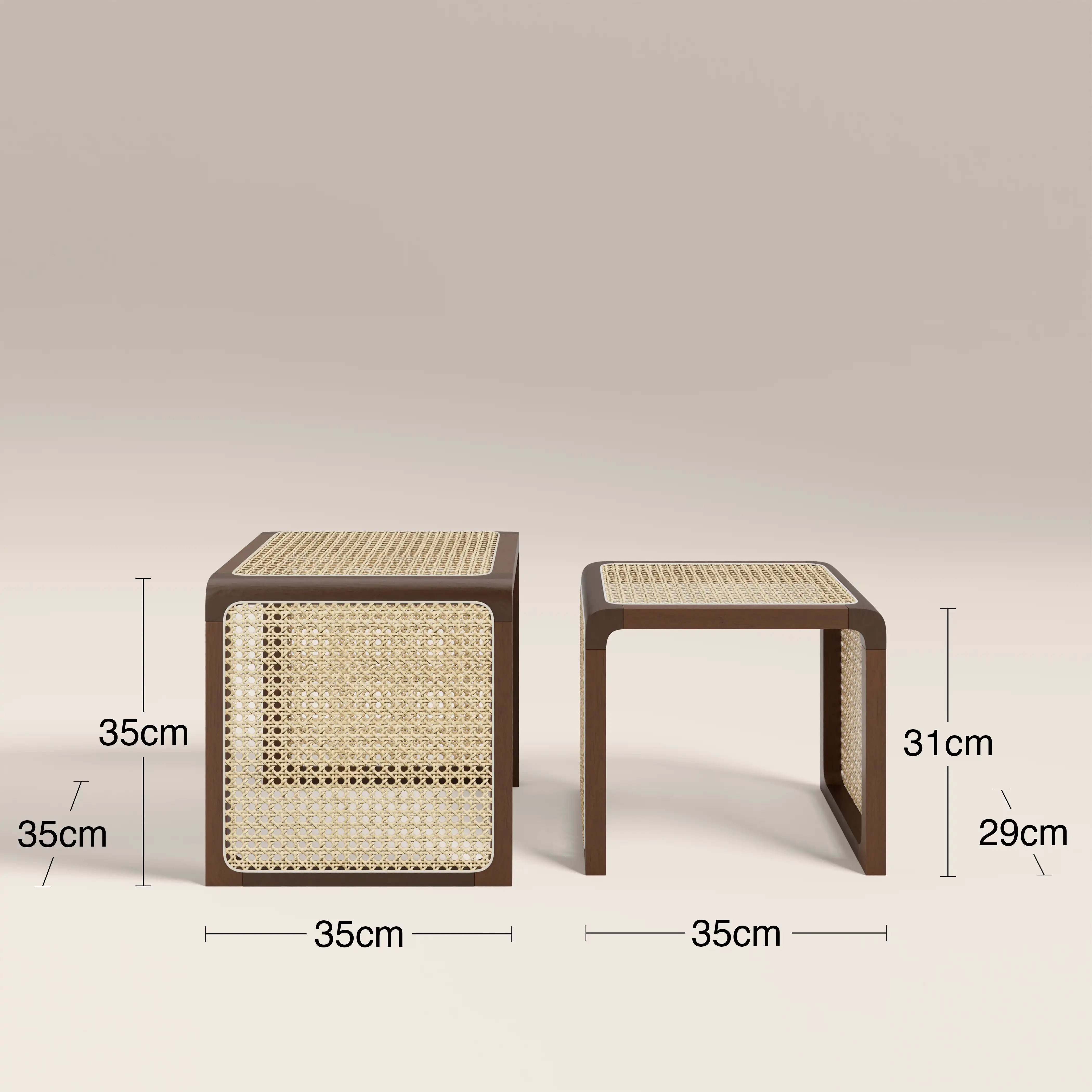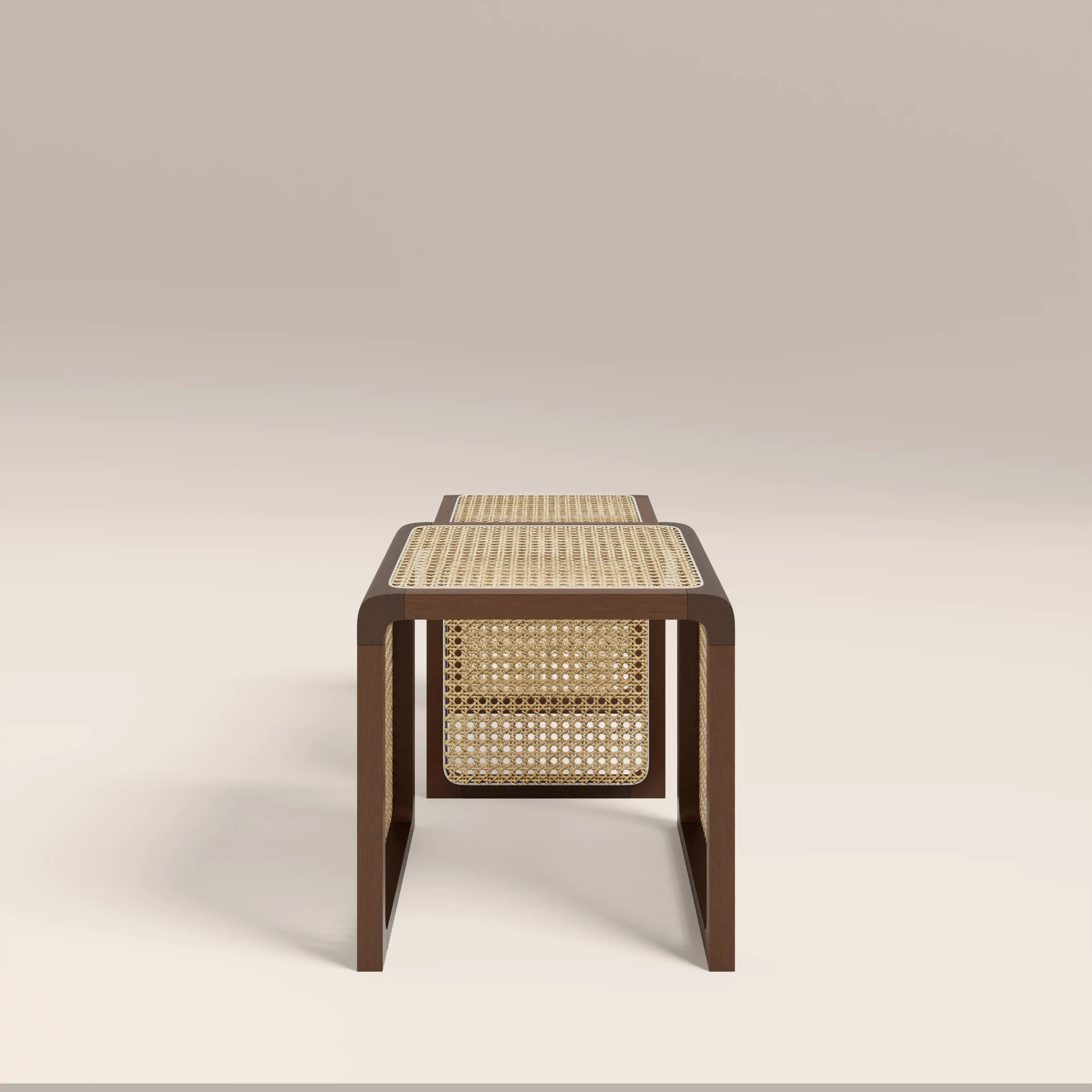 The Atley Side Tables are a space-saving duo that brings effortless style. With rattan cane surfaces framed in walnut-stained wood, this set of 2 tables beautifully balances symmetry and functionality. Sliding neatly together for a clean, uncluttered look, their organic texture channels Japandi, Scandi, and subtle boho vibes, making them a versatile piece with warm, calming charm.