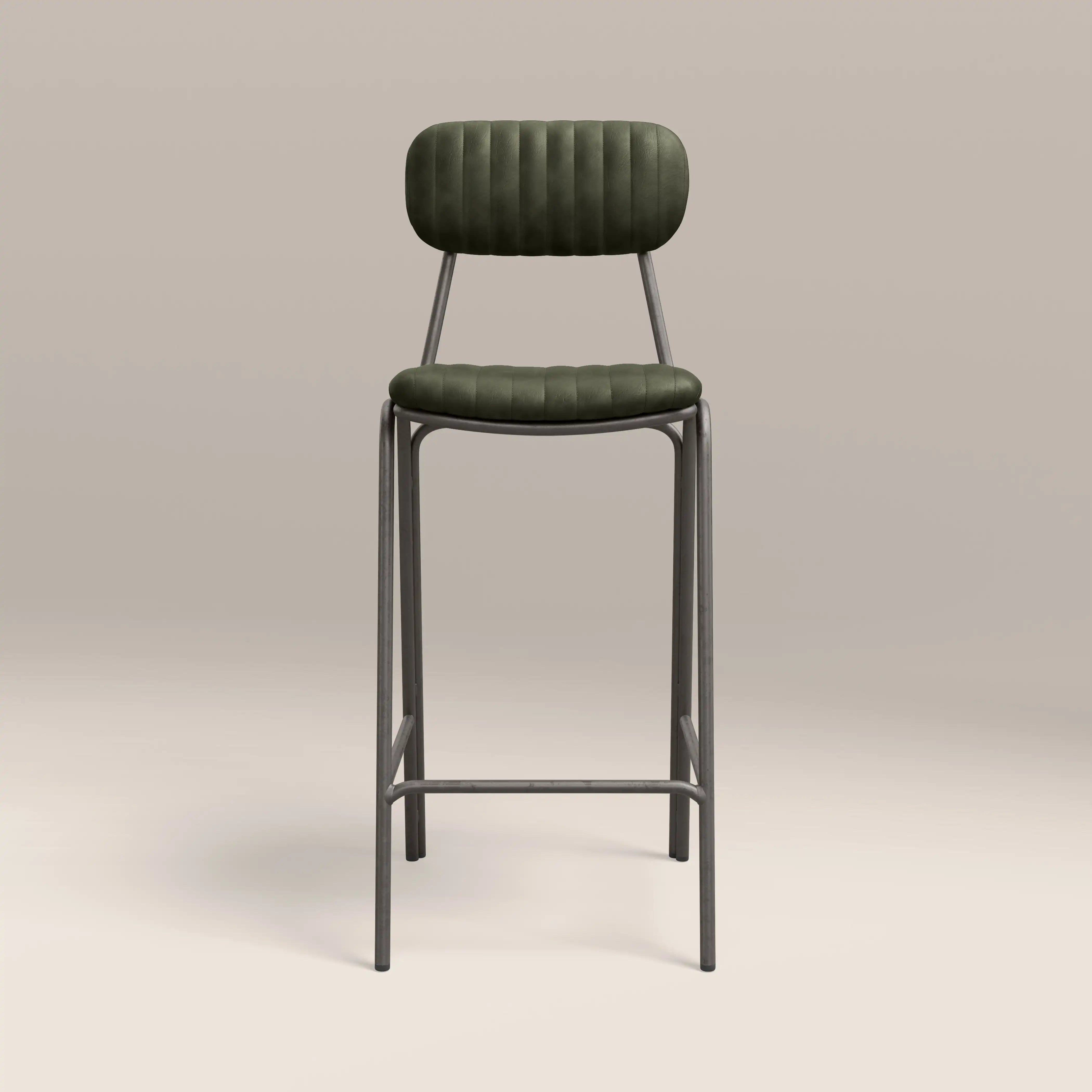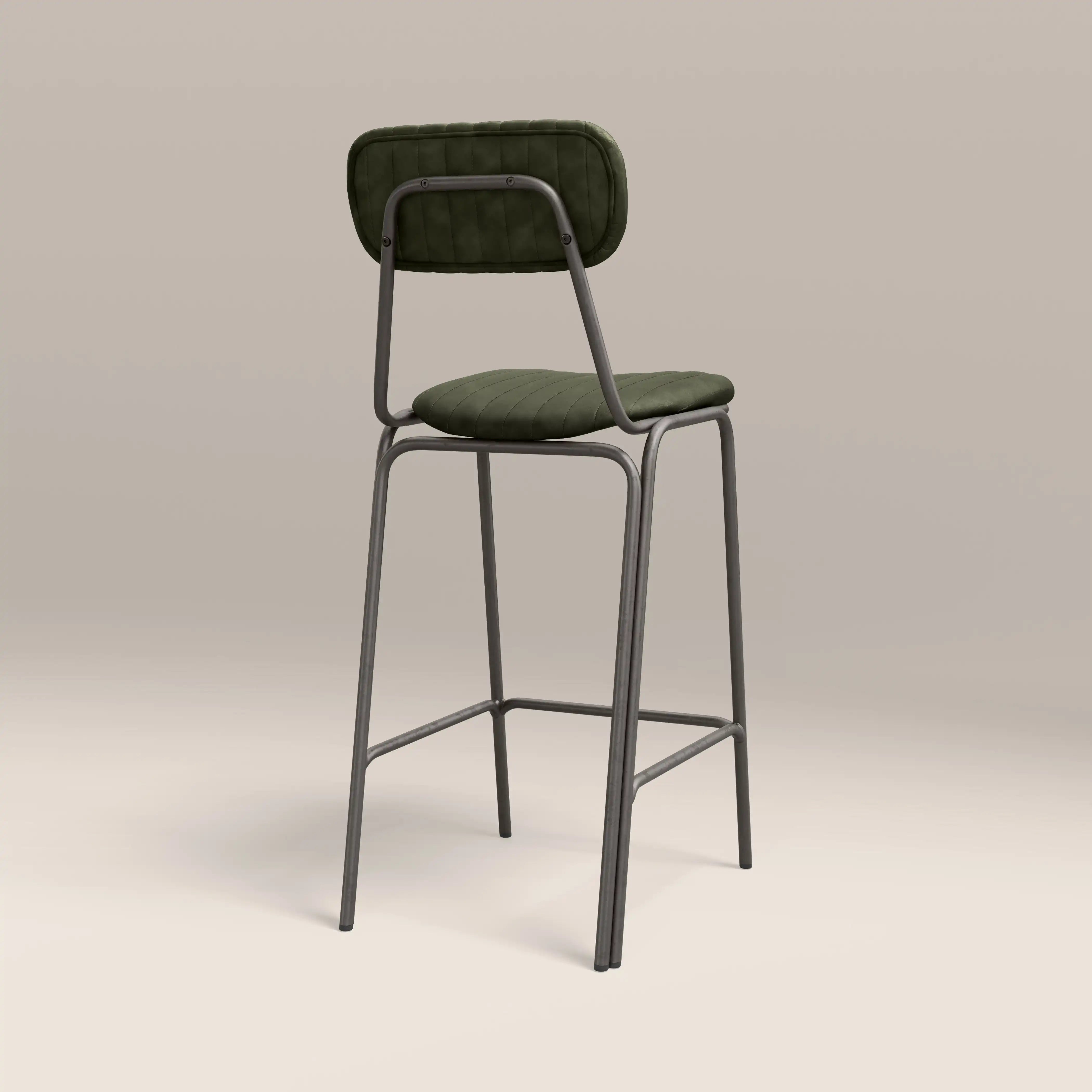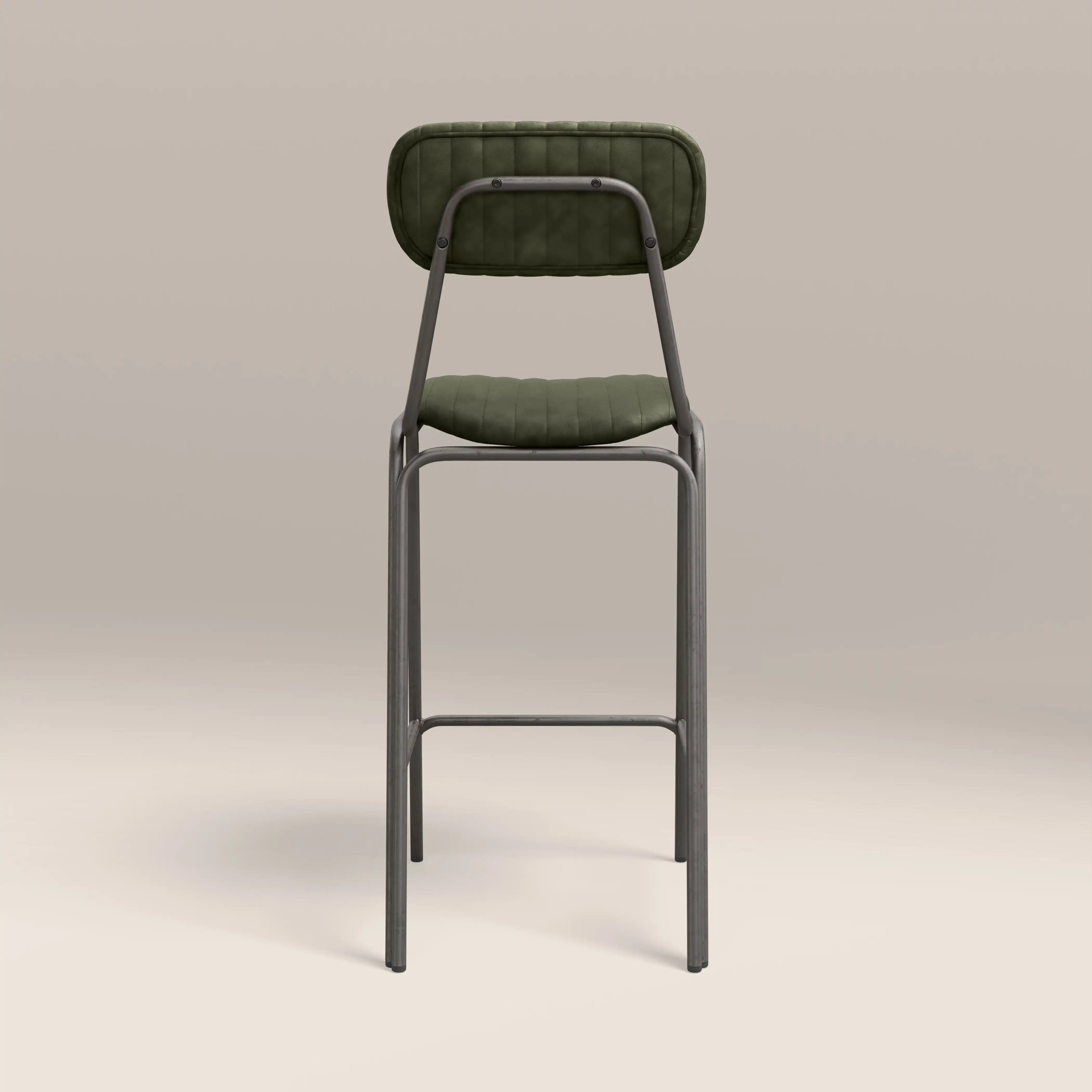 Introducing the Boston Bar Stool; a fresh take on a classic industrial design, this dark green faux leather upholstered bar stool features a padded seat with a backrest and a black metal frame with a built-in footrest. Upgrade your kitchen breakfast bar or counter area without compromising comfort.