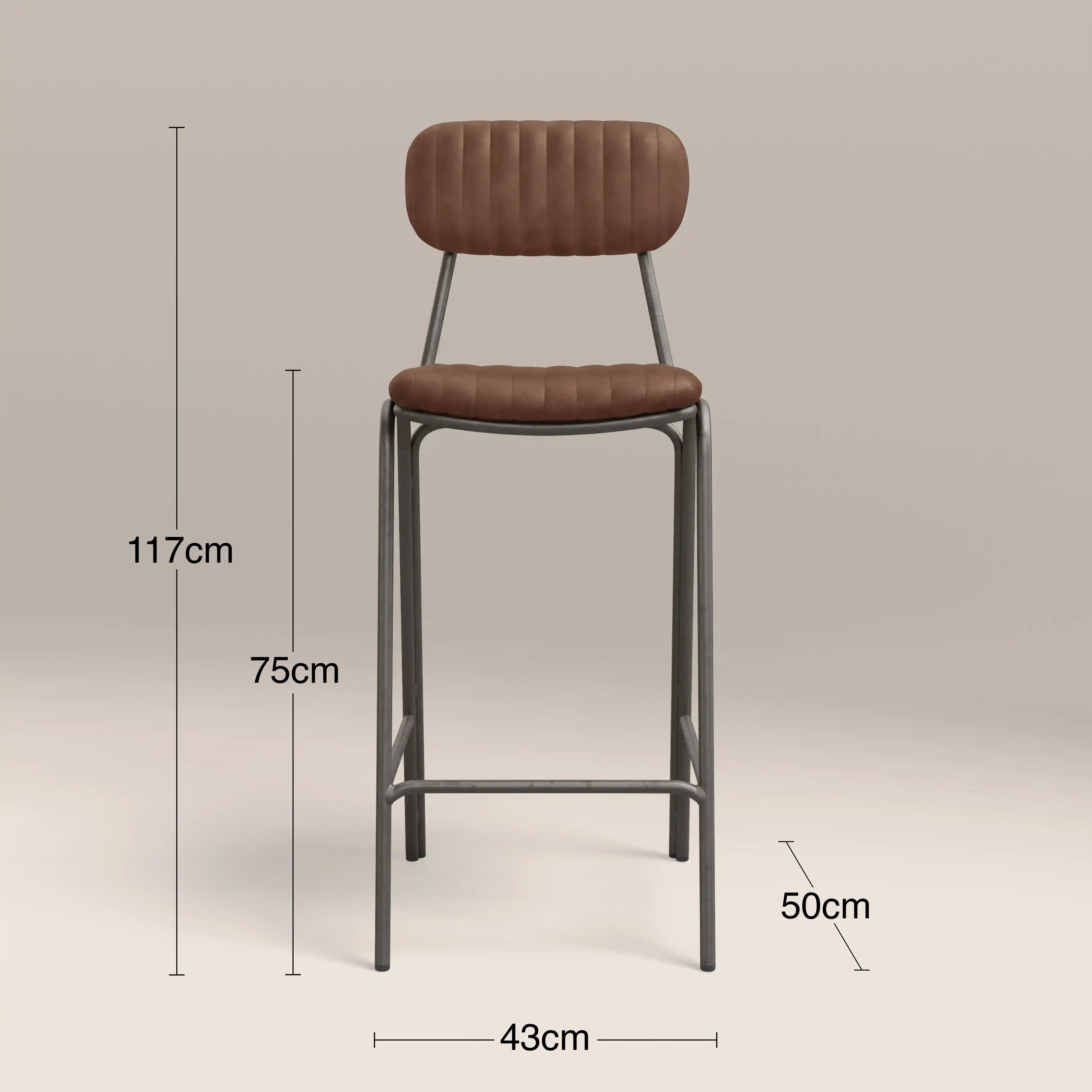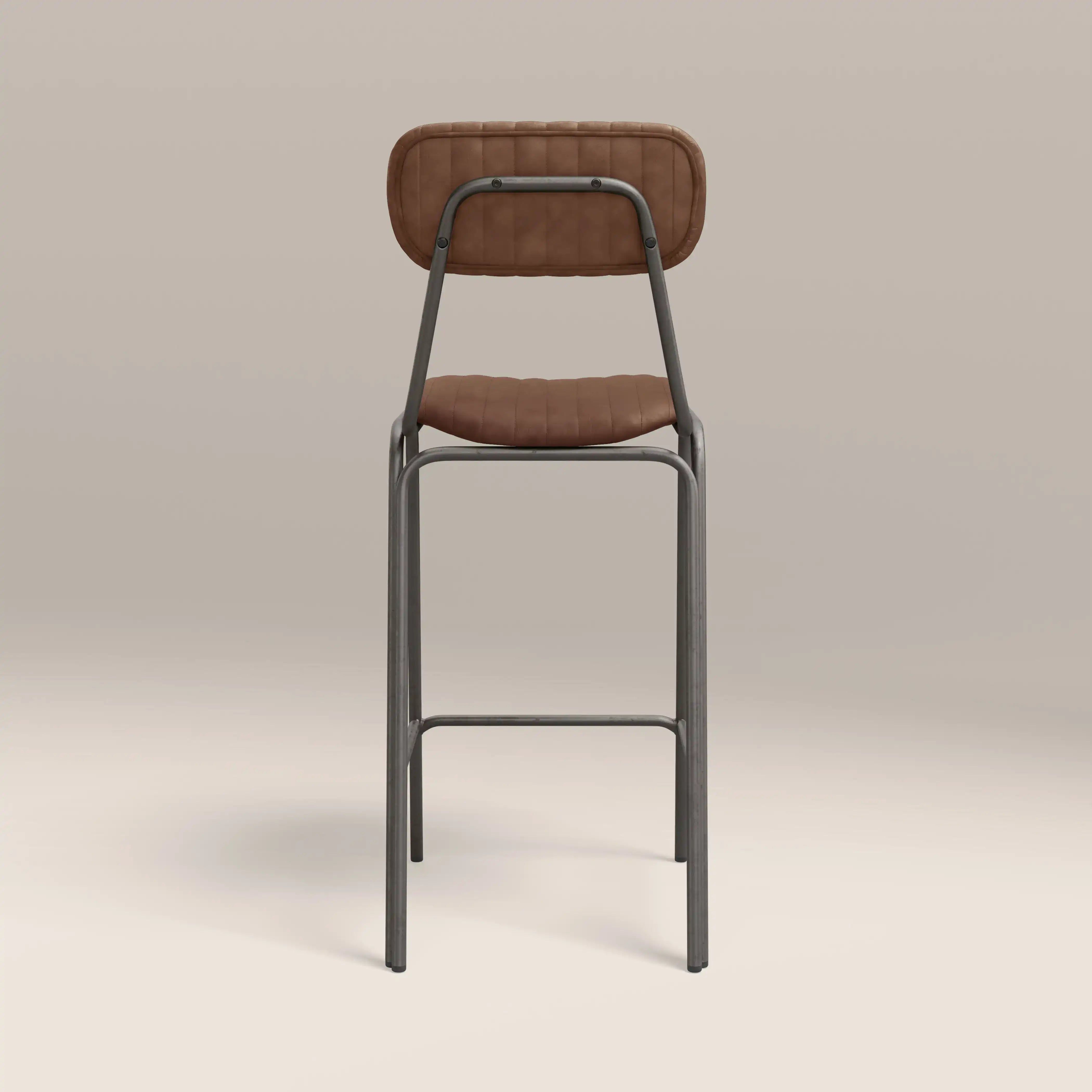 Introducing the Boston Bar Stool; a fresh take on a classic industrial design, this tan faux leather upholstered bar stool features a padded seat with a backrest and a black metal frame with a built-in footrest. Upgrade your kitchen breakfast bar or counter area without compromising comfort.