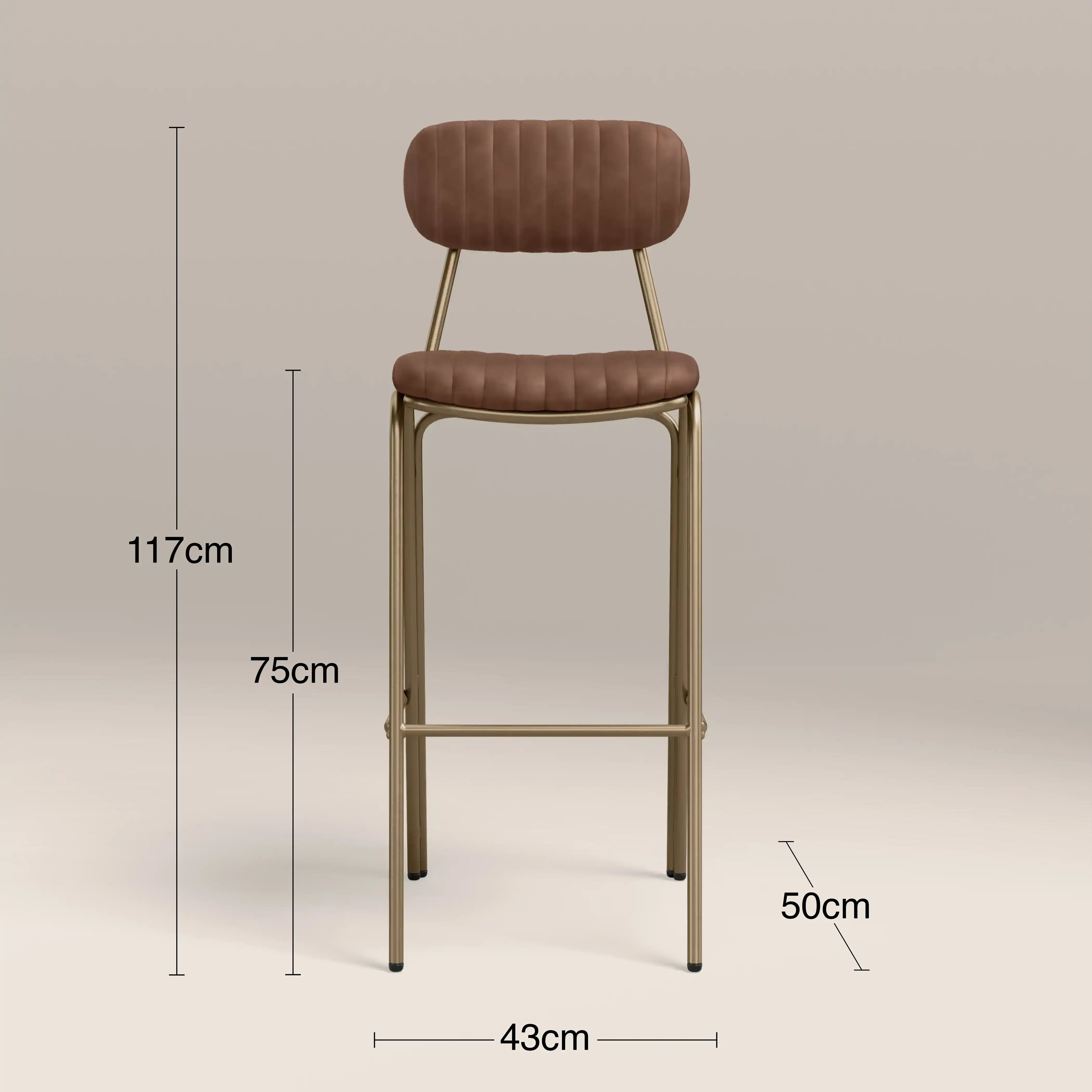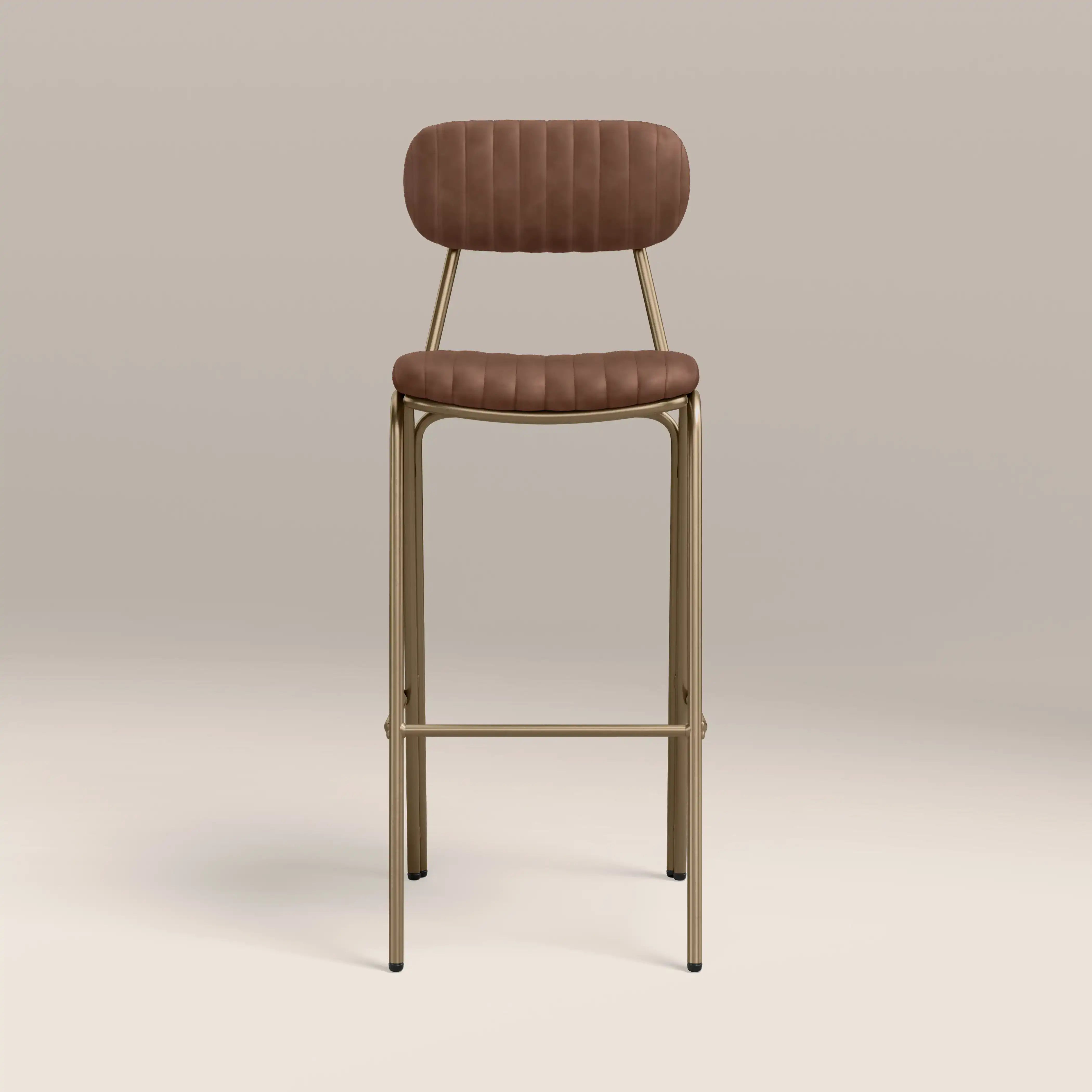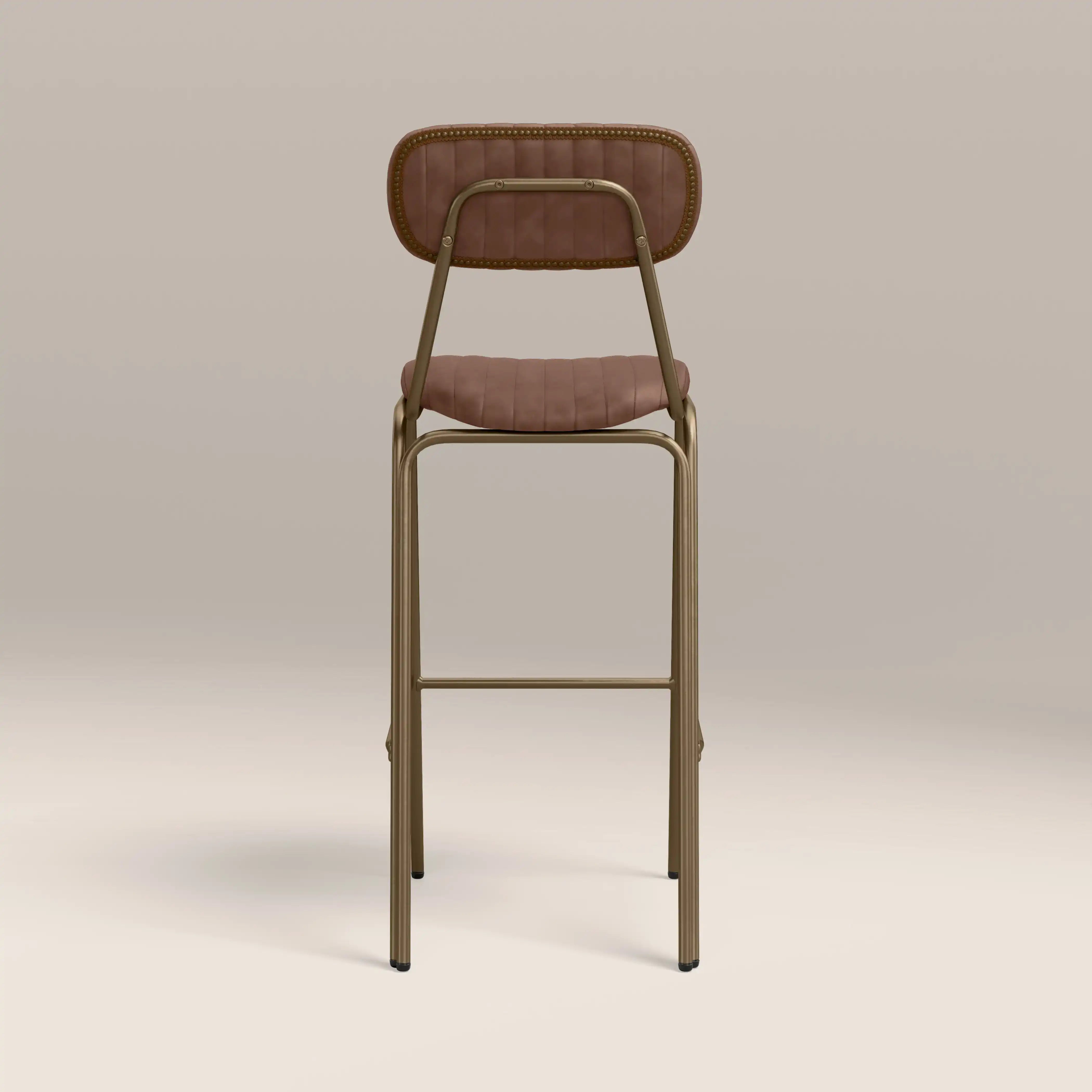 Introducing the Boston Bar Stool; a fresh take on a classic industrial design, this vintage tan faux leather upholstered bar stool features a padded seat with a backrest and a brushed antique brass metal frame with a built-in footrest. Upgrade your kitchen breakfast bar or counter area without compromising comfort.