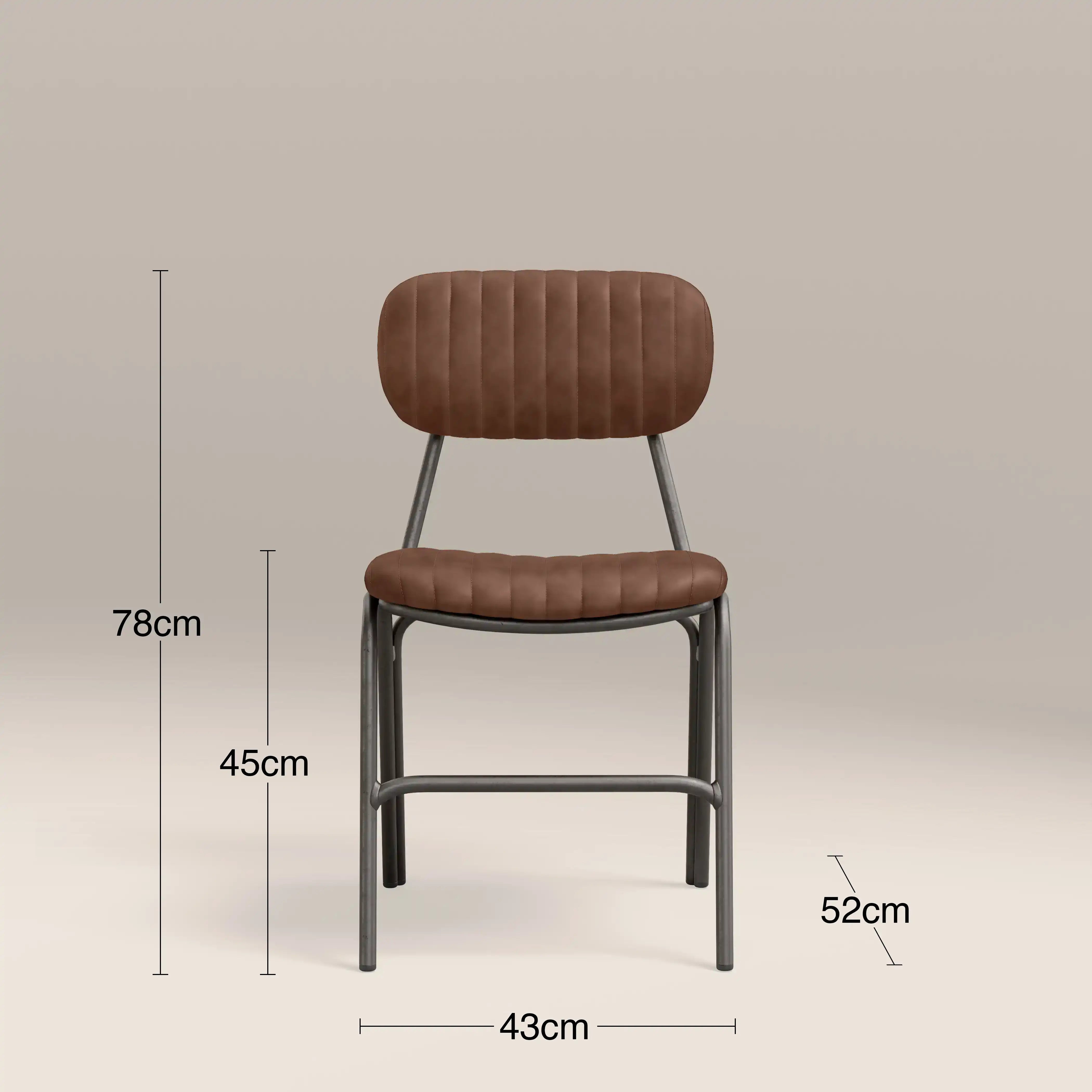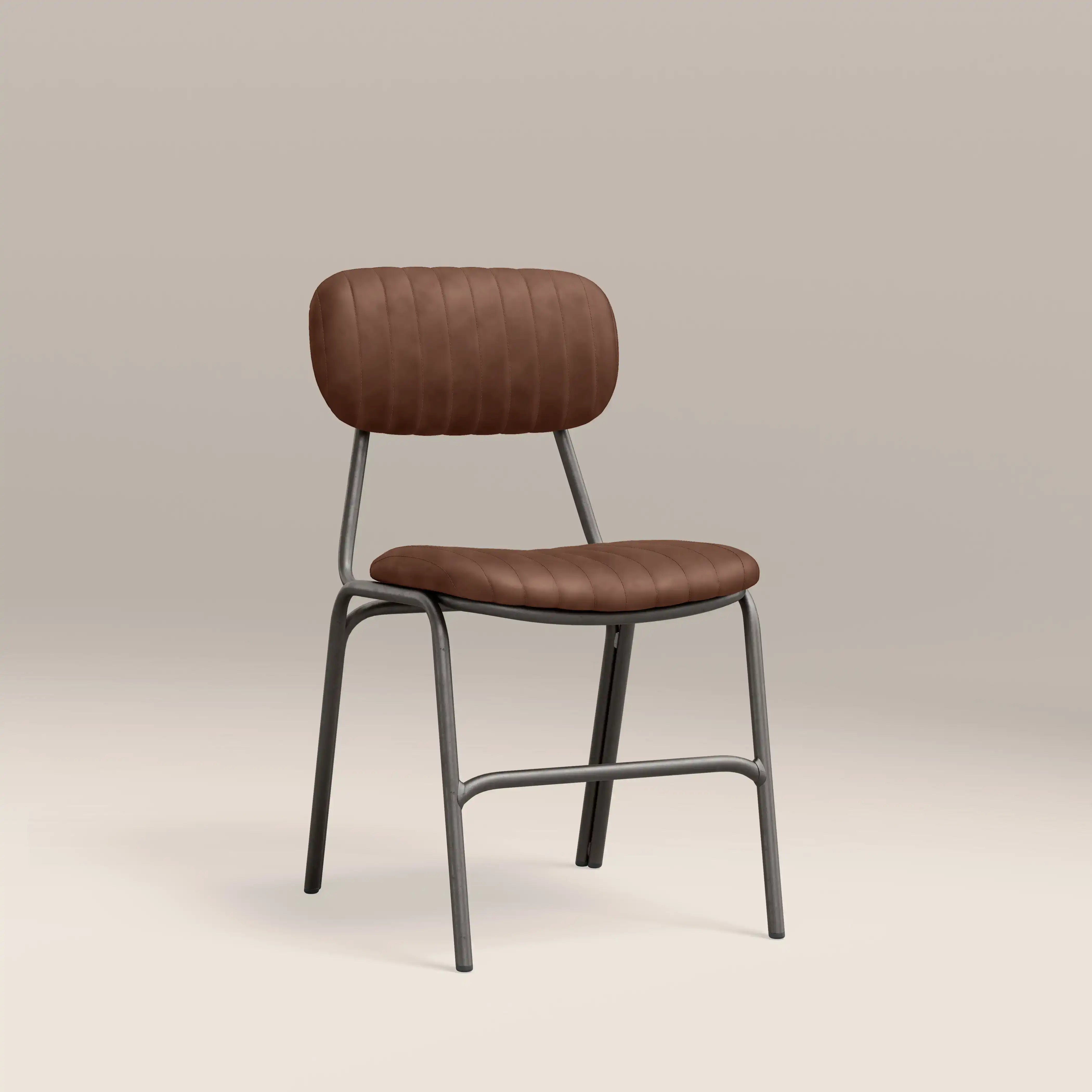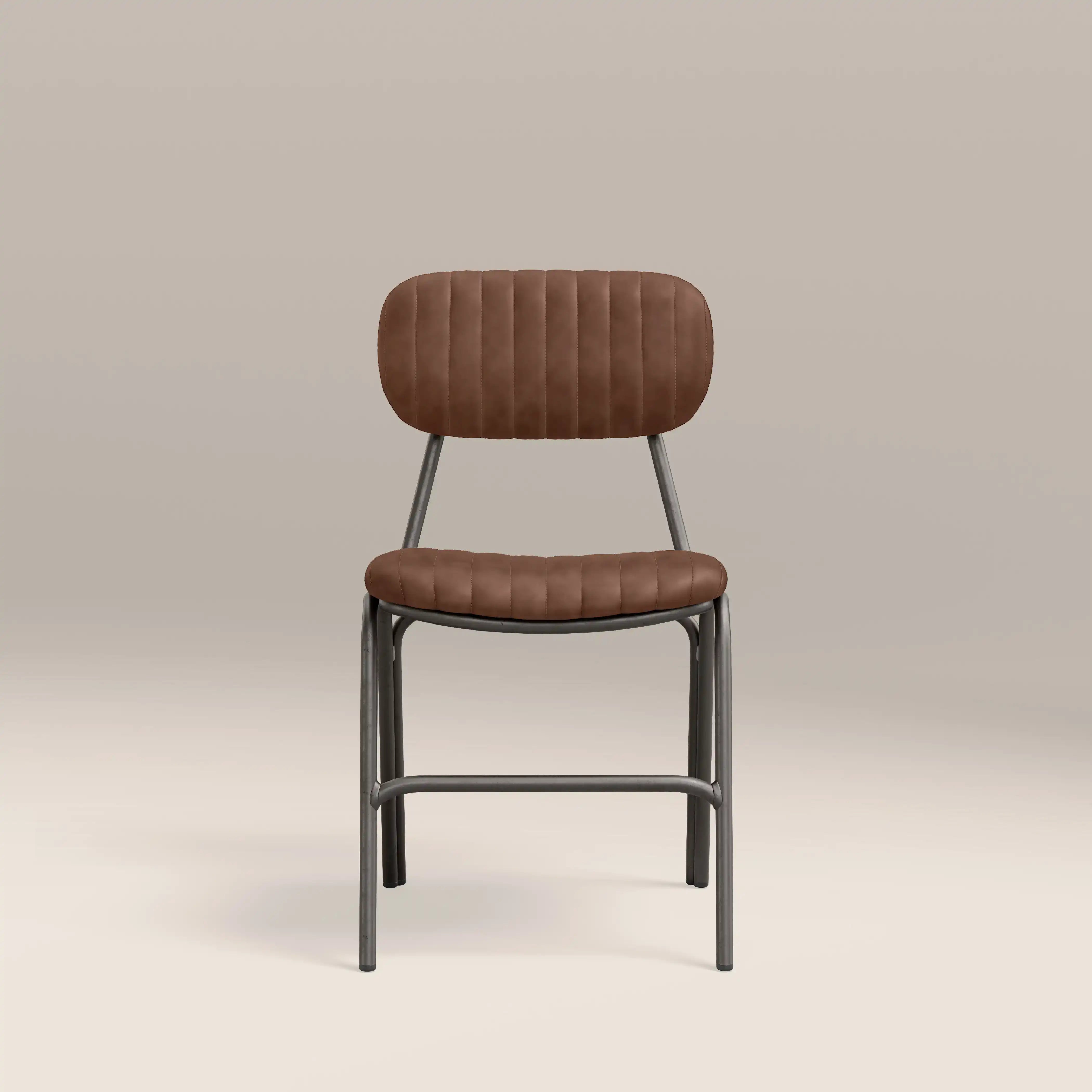 Showcasing the best of industrial design, the Boston dining chair is upholstered in soft tan faux leather with padded seat for extra comfort. Featuring ribbed backrest and slim dark gunmetal legs, the Boston is a modern chair for your dining room or kitchen.