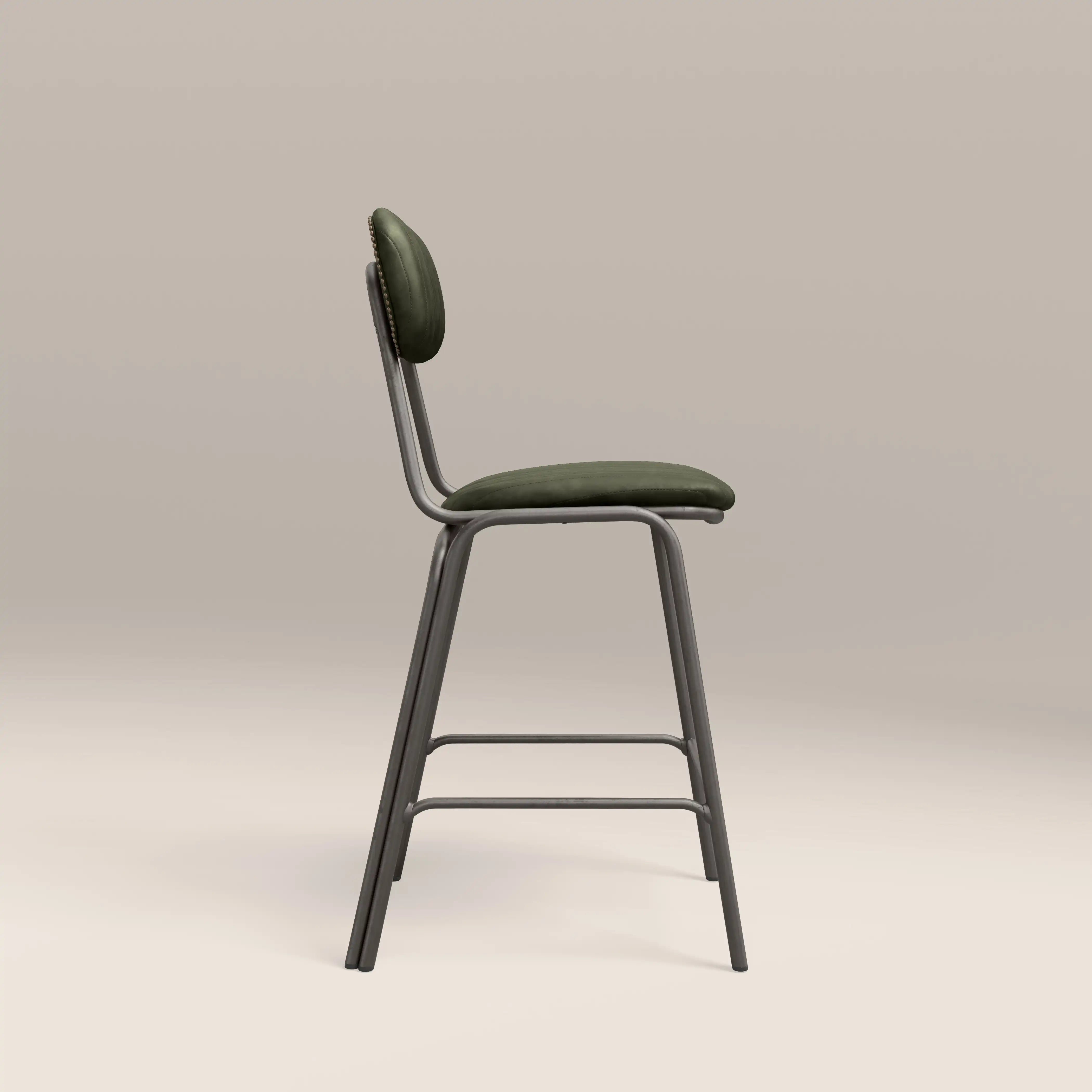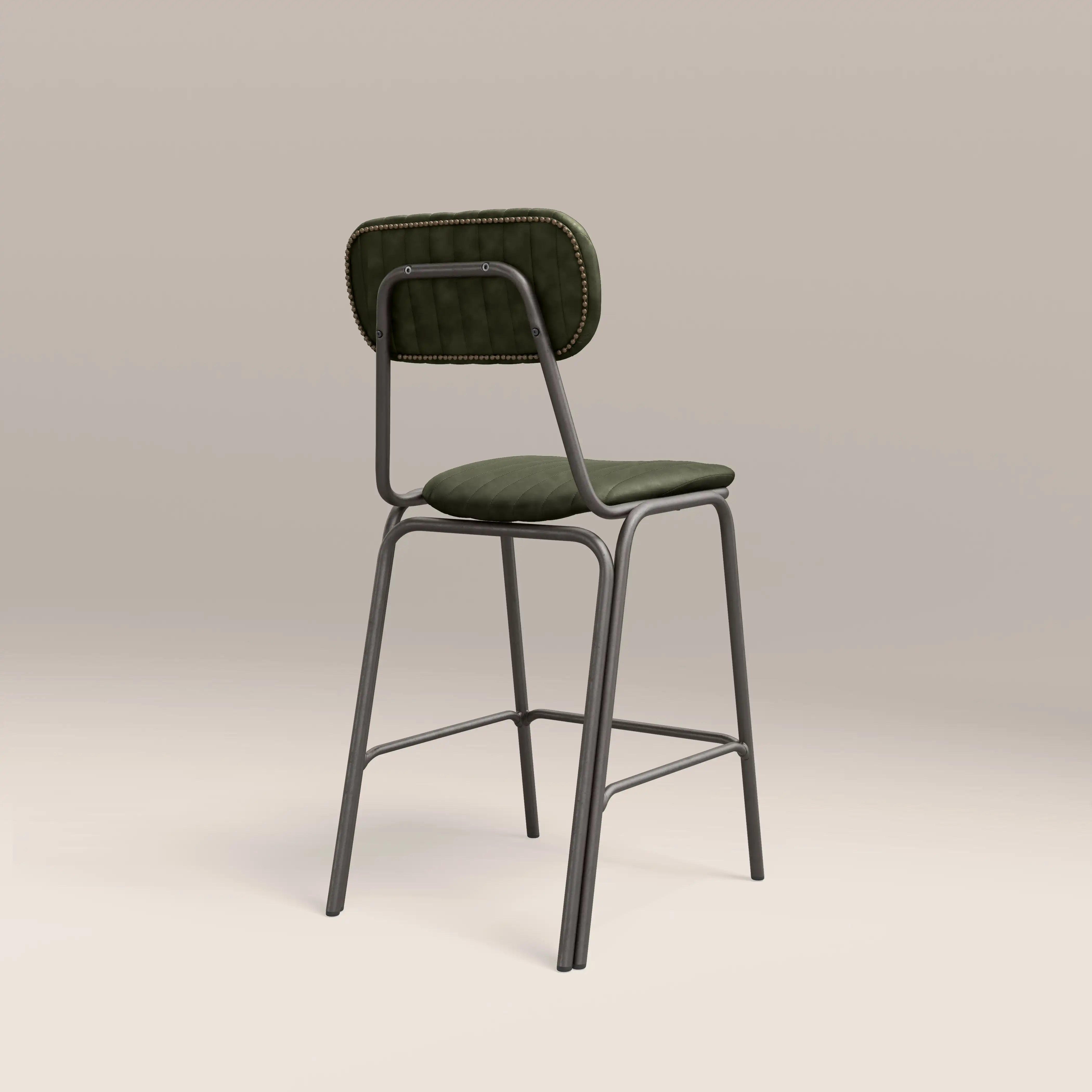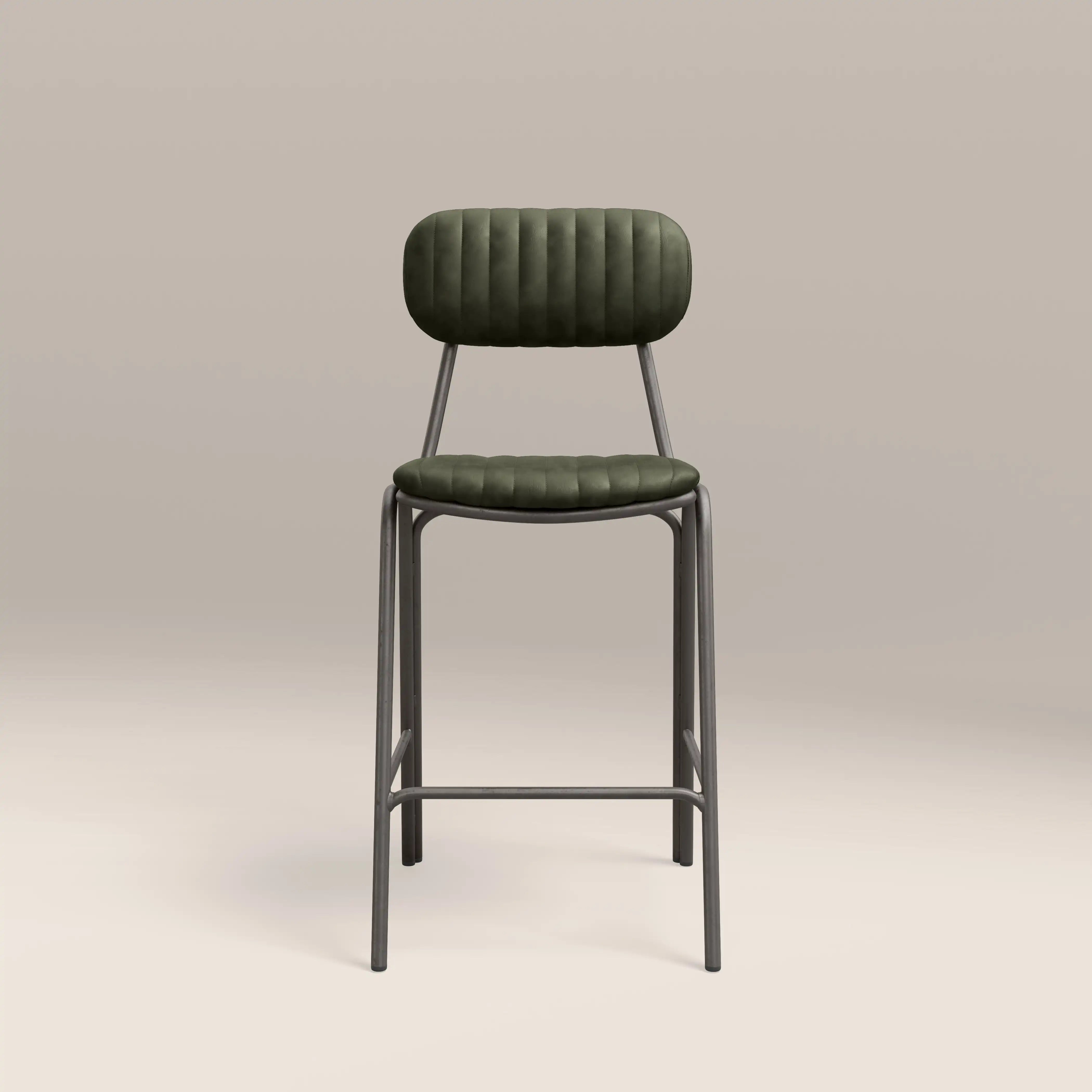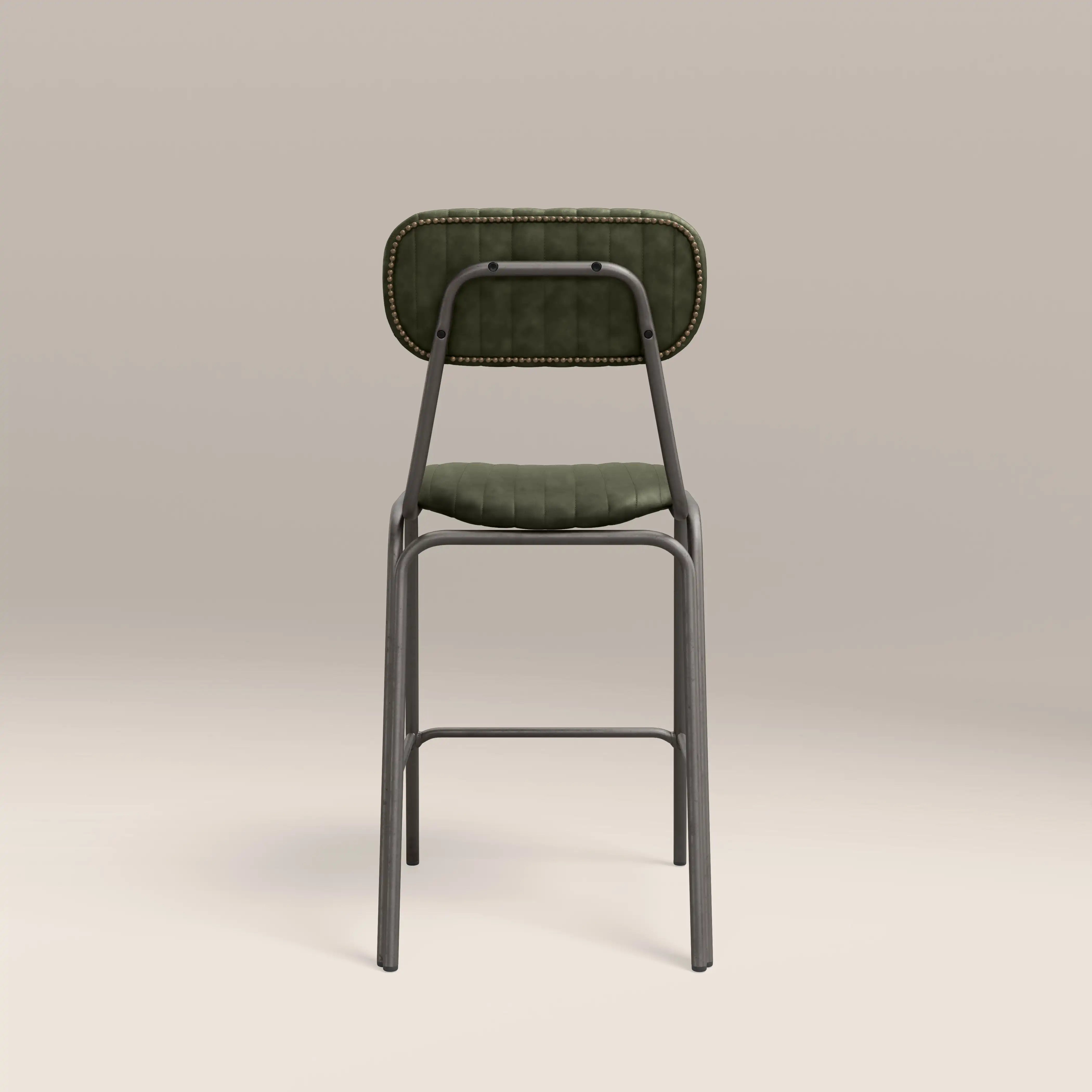 Introducing the Boston Kitchen Stool; a fresh take on a classic industrial design, this dark green faux leather upholstered bar stool features a padded seat with a backrest and a black metal frame with a built-in footrest. Upgrade your kitchen breakfast bar or counter area without compromising comfort.