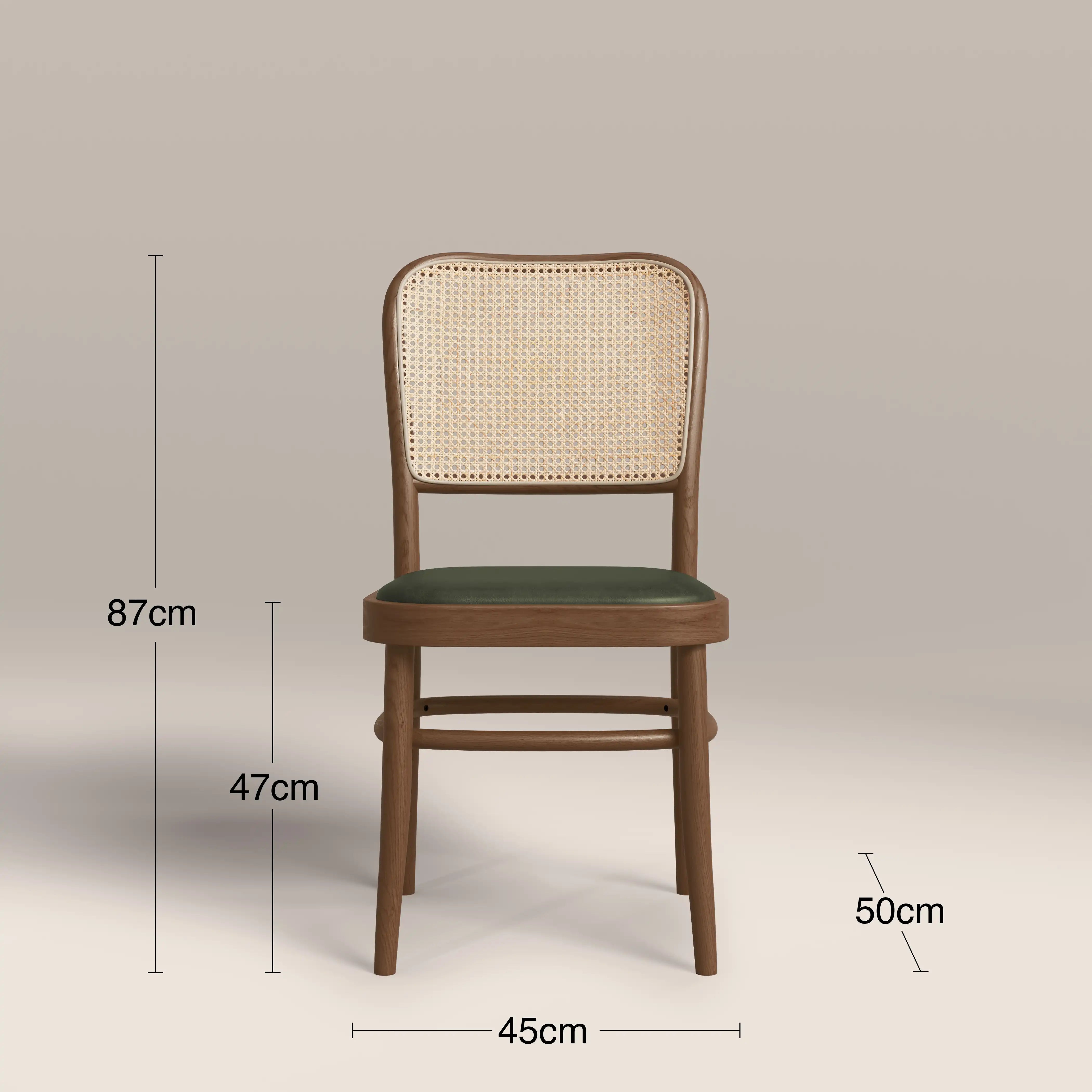 Tapping into those Japandi vibes, the soft curves and natural cane of the Bourne Dining Chair are hard to resist. We love the contrast between the vintage green faux leather seat and the light natural cane backrest. There is an organic sculptural feel to the walnut-stained beechwood frame with angled legs for durability. Undeniable Nordic charm.
