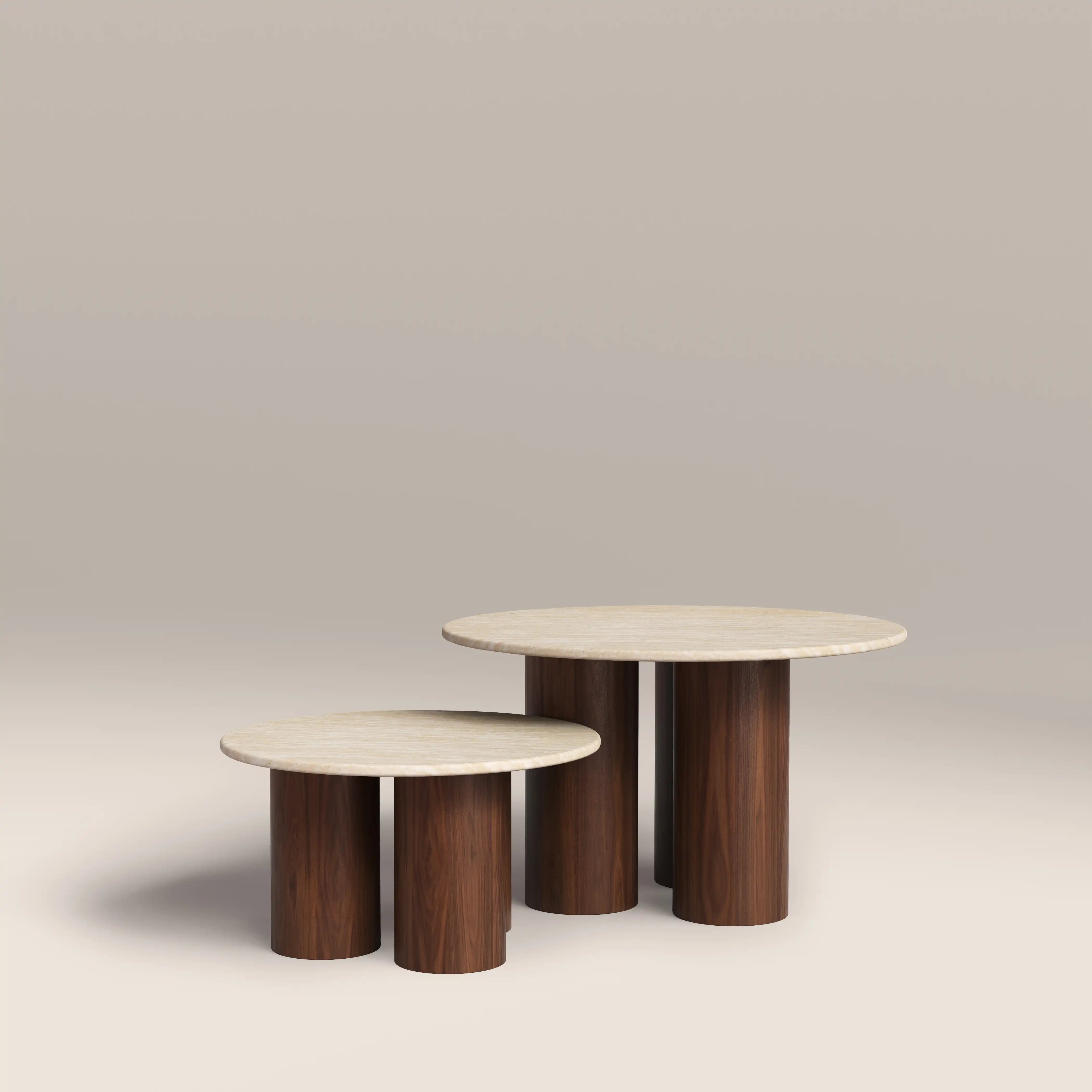 The Brynleigh Nest of Coffee Tables is a nod to retro and minimalist design. We love the travertine finish, featuring characteristic creams and browns, whilst the three-pillared legs complement the neutral tones perfectly in a walnut hue. This set of 2 coffee tables offers a dynamic silhouette for your living space whilst keeping essential everyday items within reach. Crafted from durable materials without the maintenance and price tag.