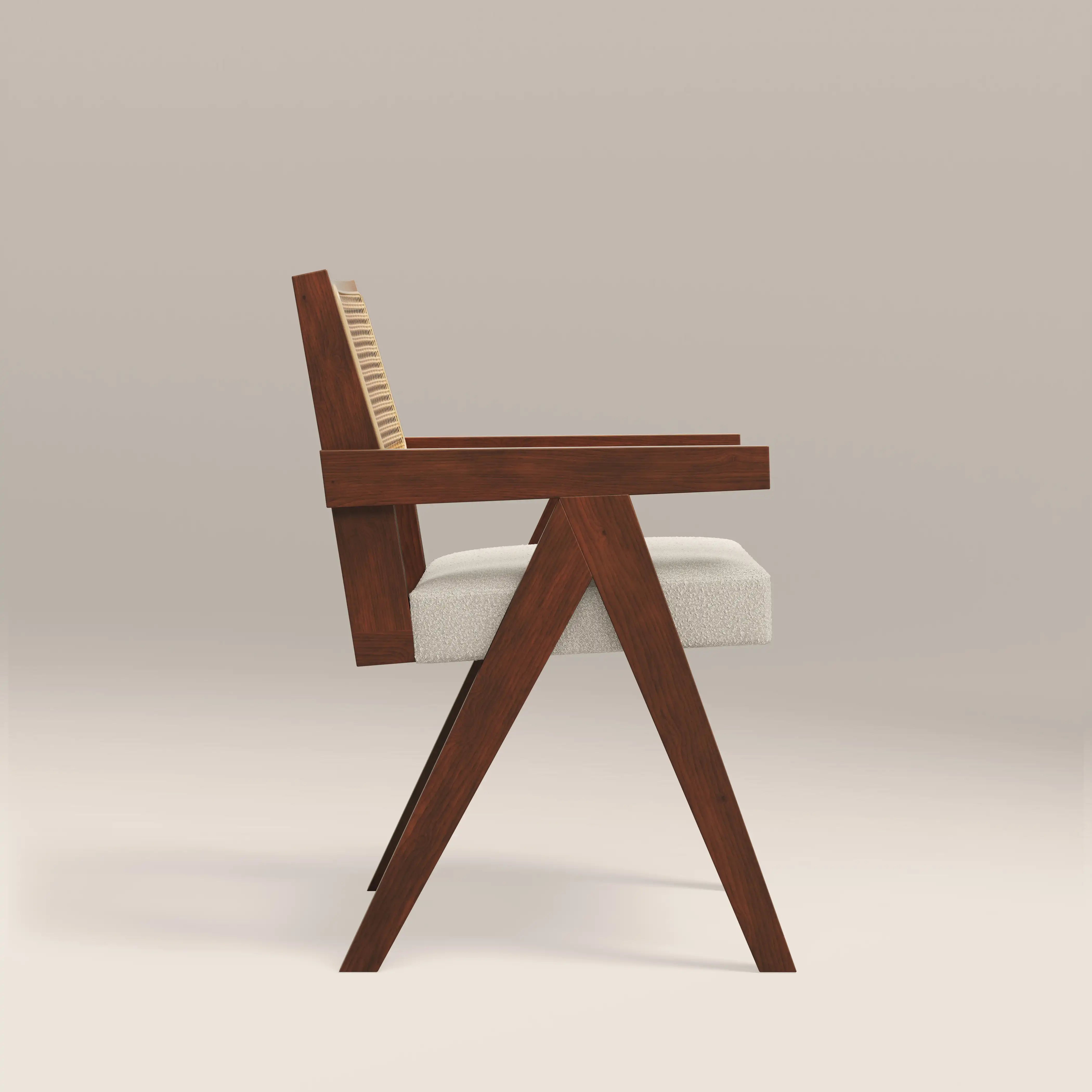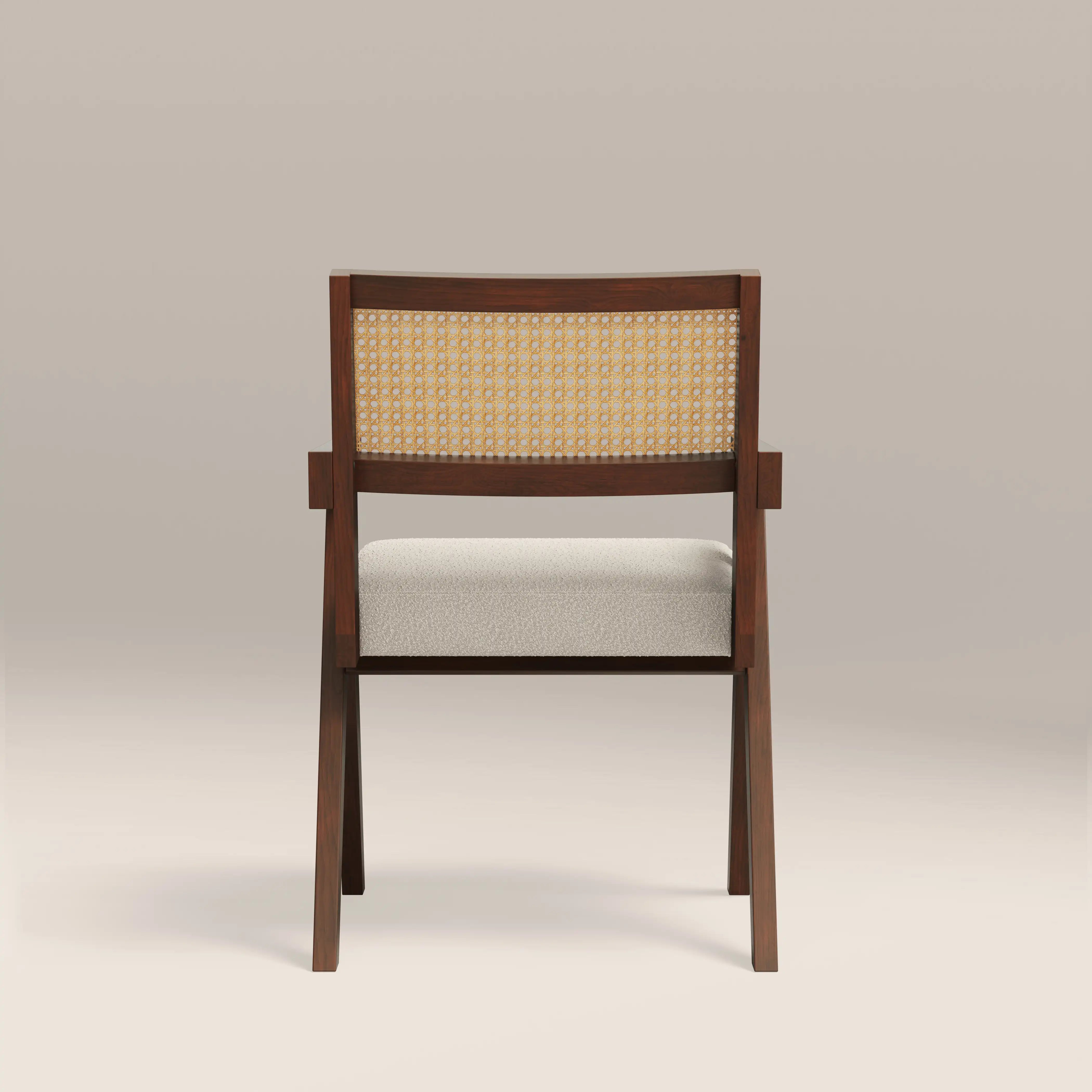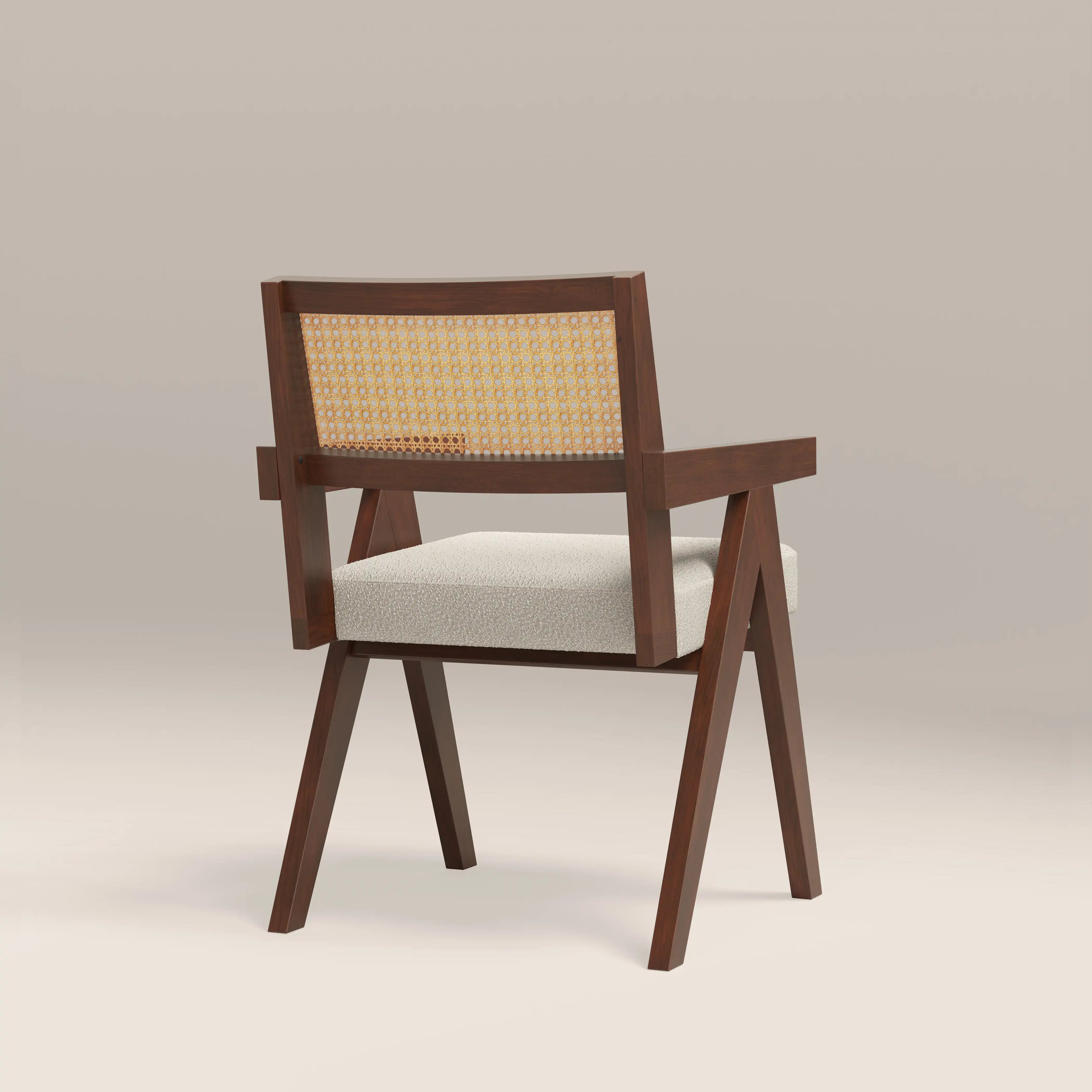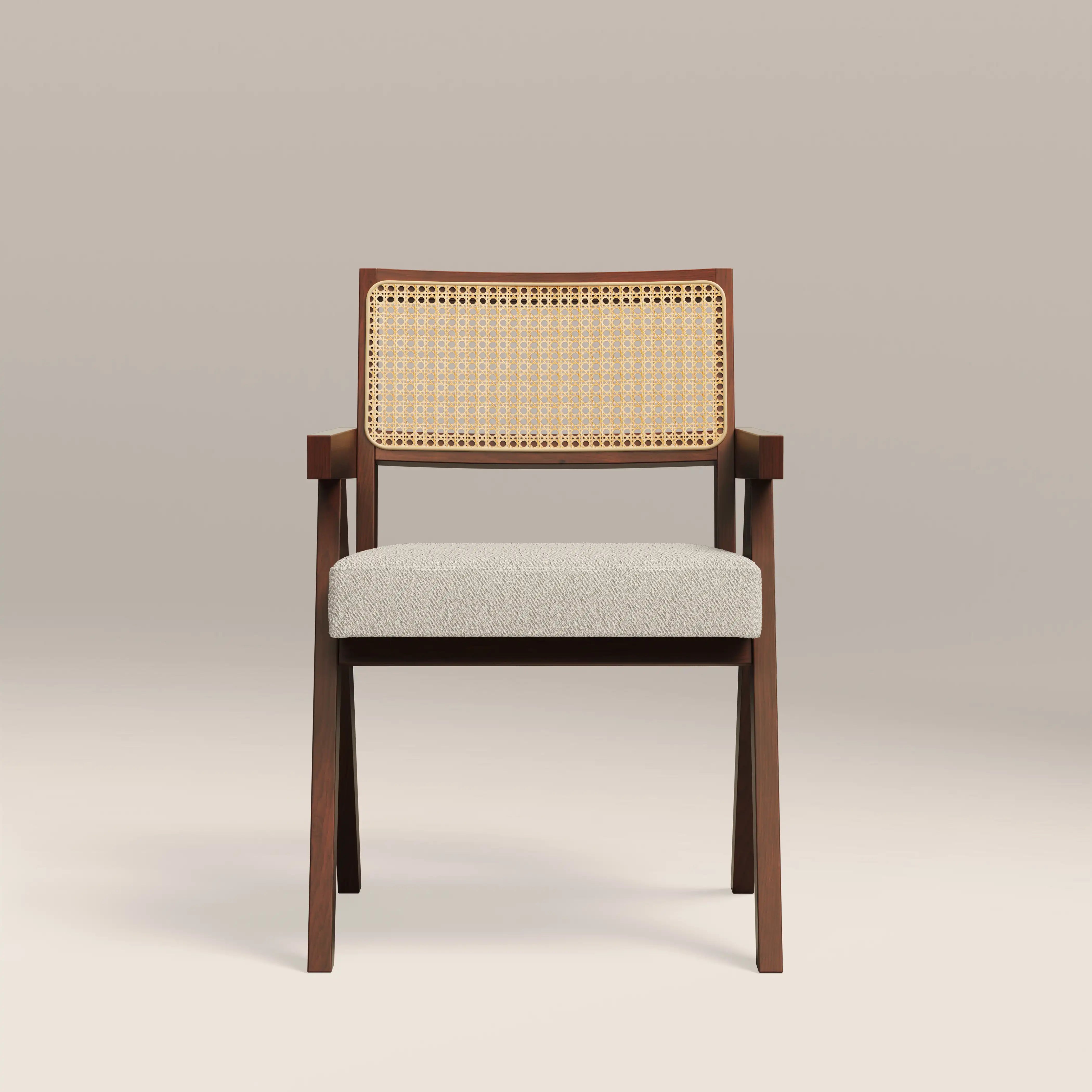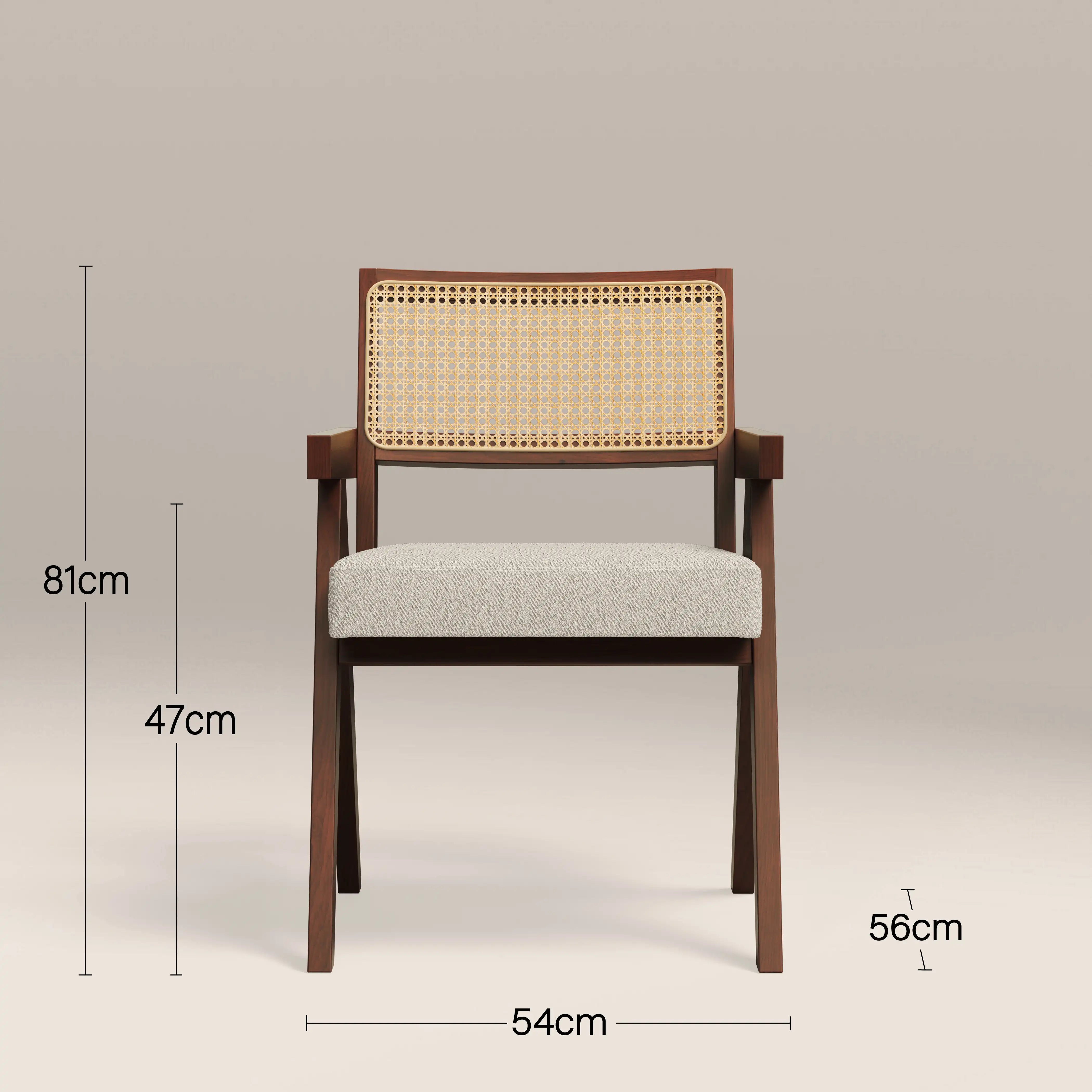 Inspired by the iconic Pierre Jeanneret design, the Cary Carver Dining Chair is a timeless classic with soft sustainable boucle in speckled stone. Oozing retro appeal, the Cary Wooden Chair with armrests has a rattan cane backrest in the classic cannage stitched technique for a standout piece with distinctive style. Note the classic V-shaped legs, reminiscent of mid-century modern design.