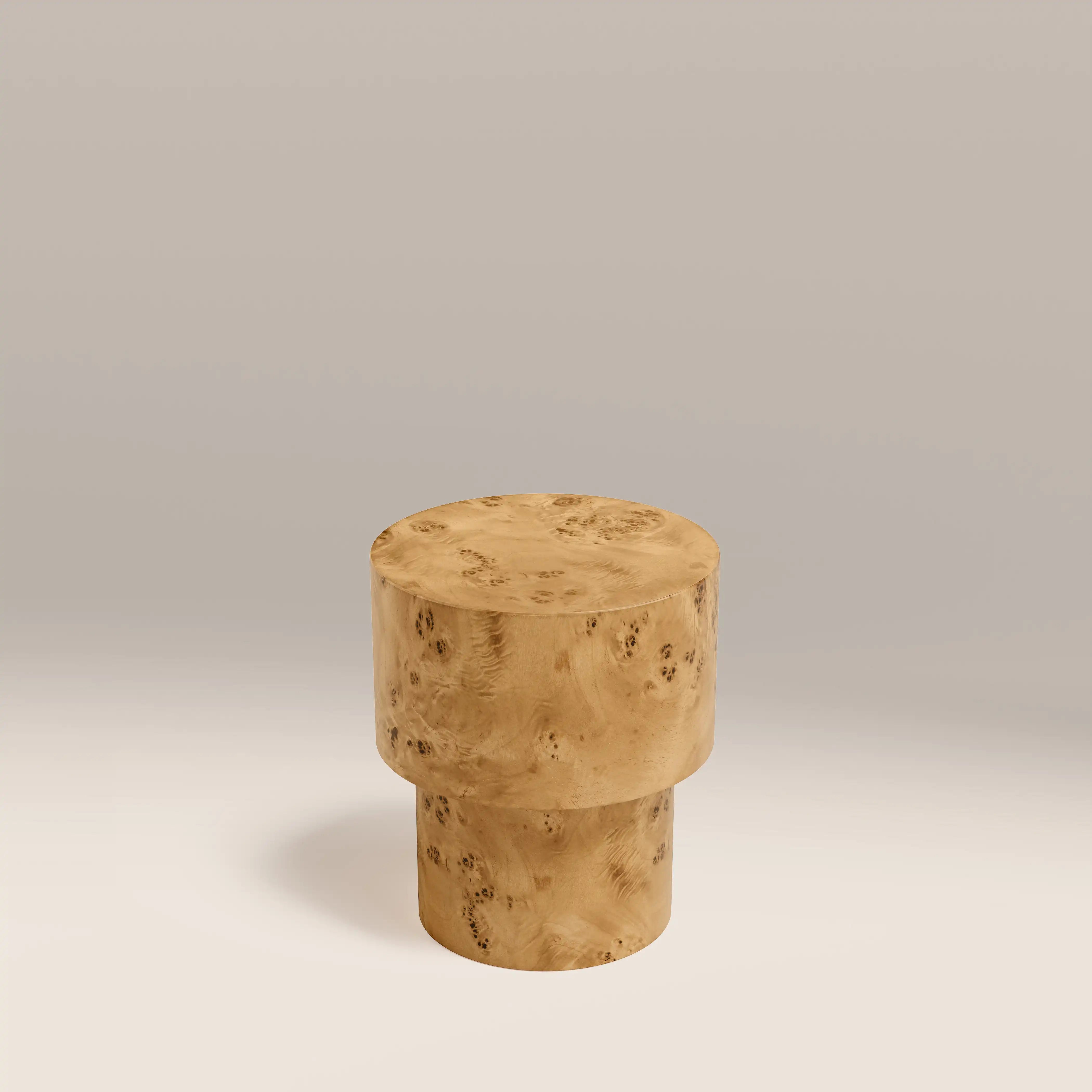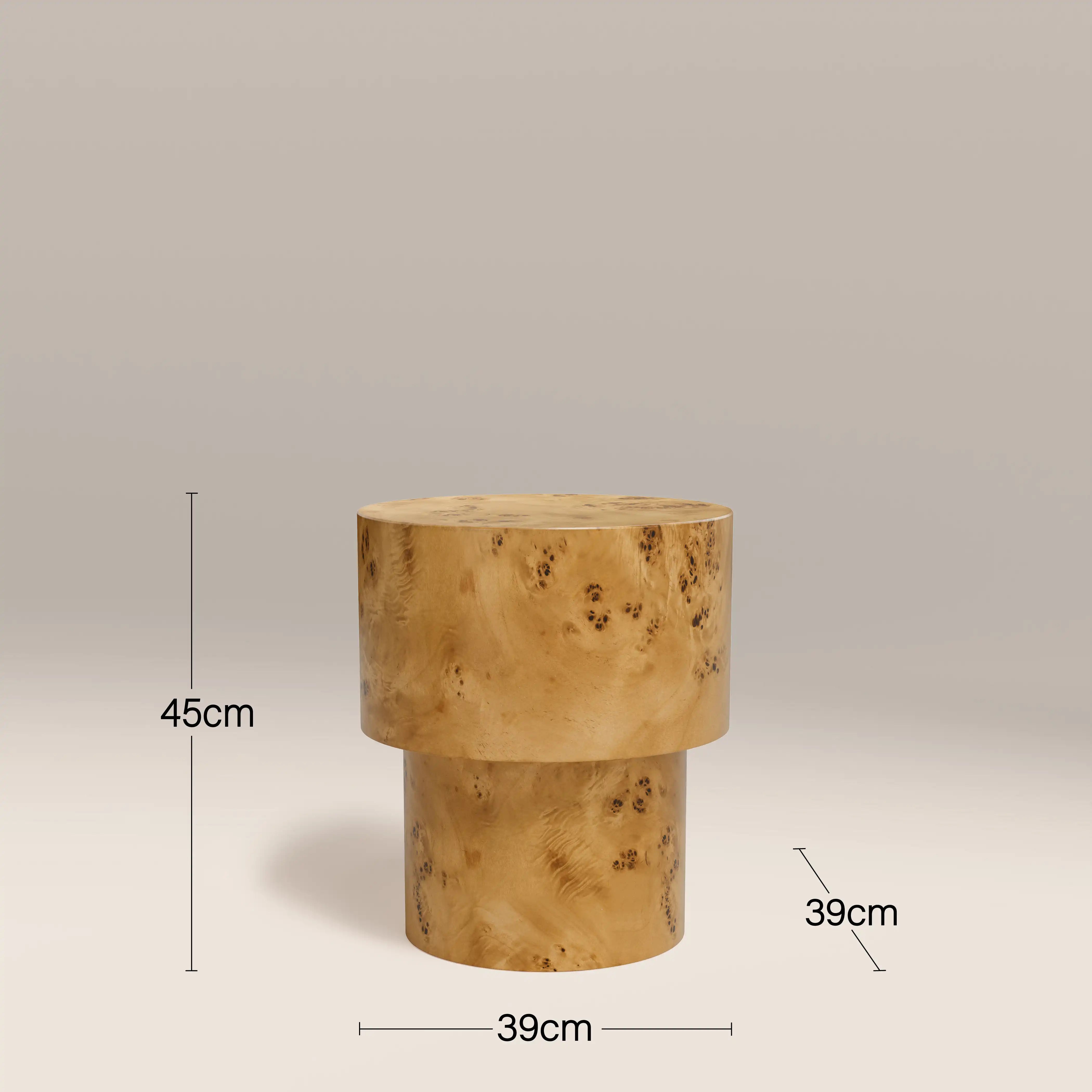 A sculptural accent with timeless appeal, the Dalton round side table is crafted from richly figured burl wood veneer. The striking grain patterns lend depth and character, while the circular top offers a soft, balanced contrast to the bold geometry of its solid plinth base. Perfect beside a lounge chair, sofa, or bed, this versatile piece brings organic texture and understated elegance to any setting.