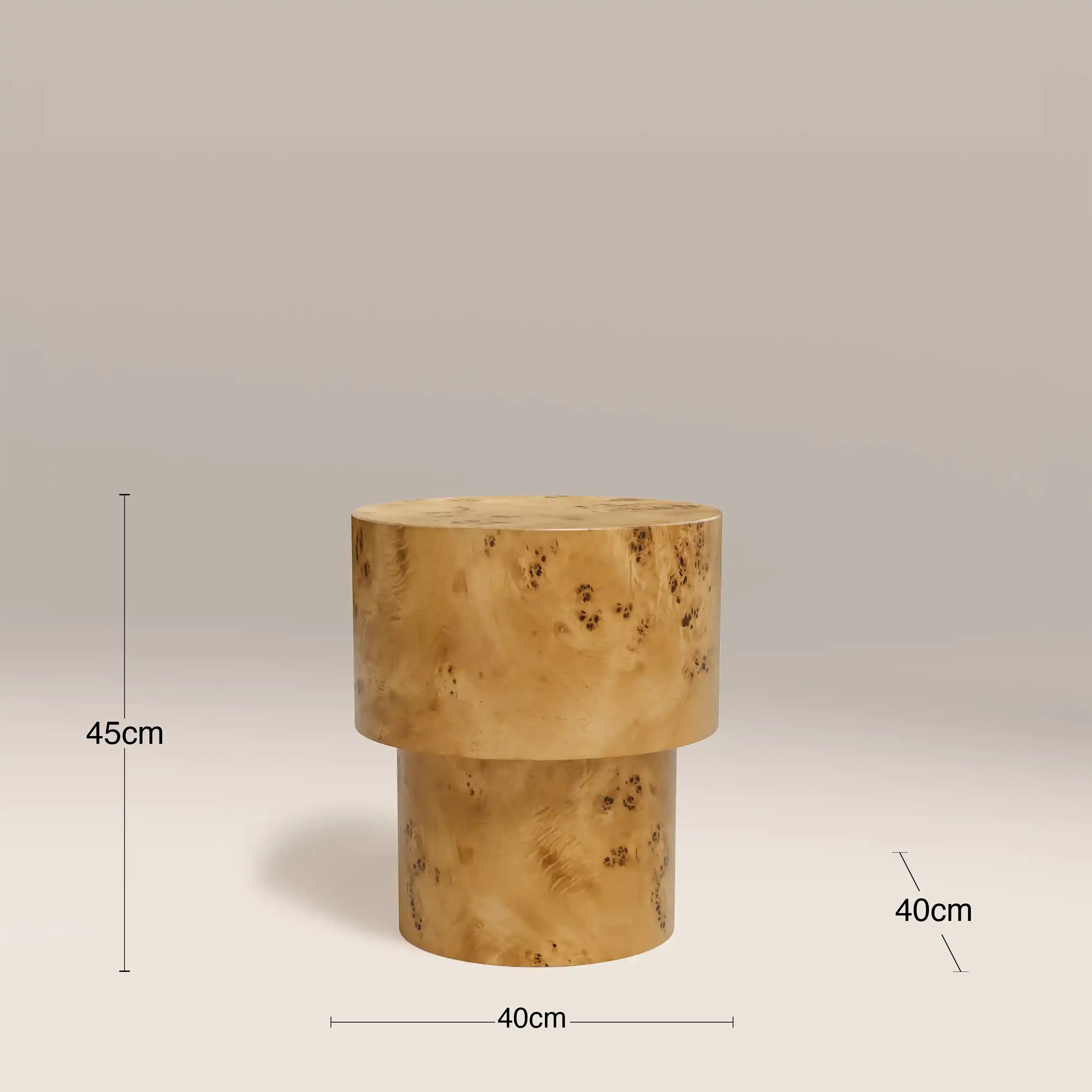 A sculptural accent with timeless appeal, the Dalton round side table is crafted from richly figured burl wood veneer. The striking grain patterns lend depth and character, while the circular top offers a soft, balanced contrast to the bold geometry of its solid plinth base. Perfect beside a lounge chair, sofa, or bed, this versatile piece brings organic texture and understated elegance to any setting.