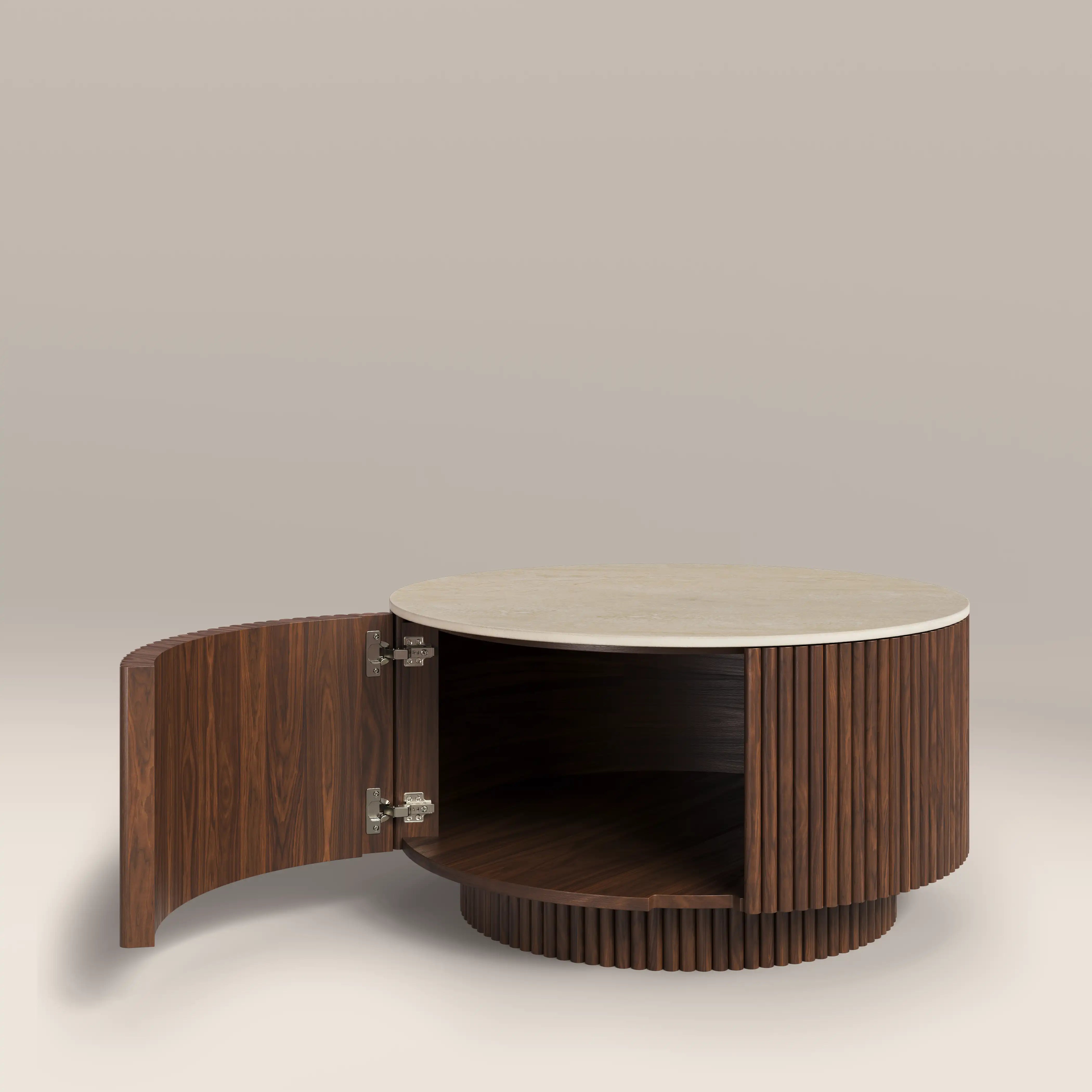 The Everly Round Coffee Table harmonises modernity and functionality. This modern coffee table with storage has an on-trend ribbed fluted base in a walnut stain that is indented around the bottom for an elevated look. Finished with a natural sintered stone top across a large surface for home decor. And as living rooms come with clutter - it can't be helped - this spacious storage compartment is just the ticket.