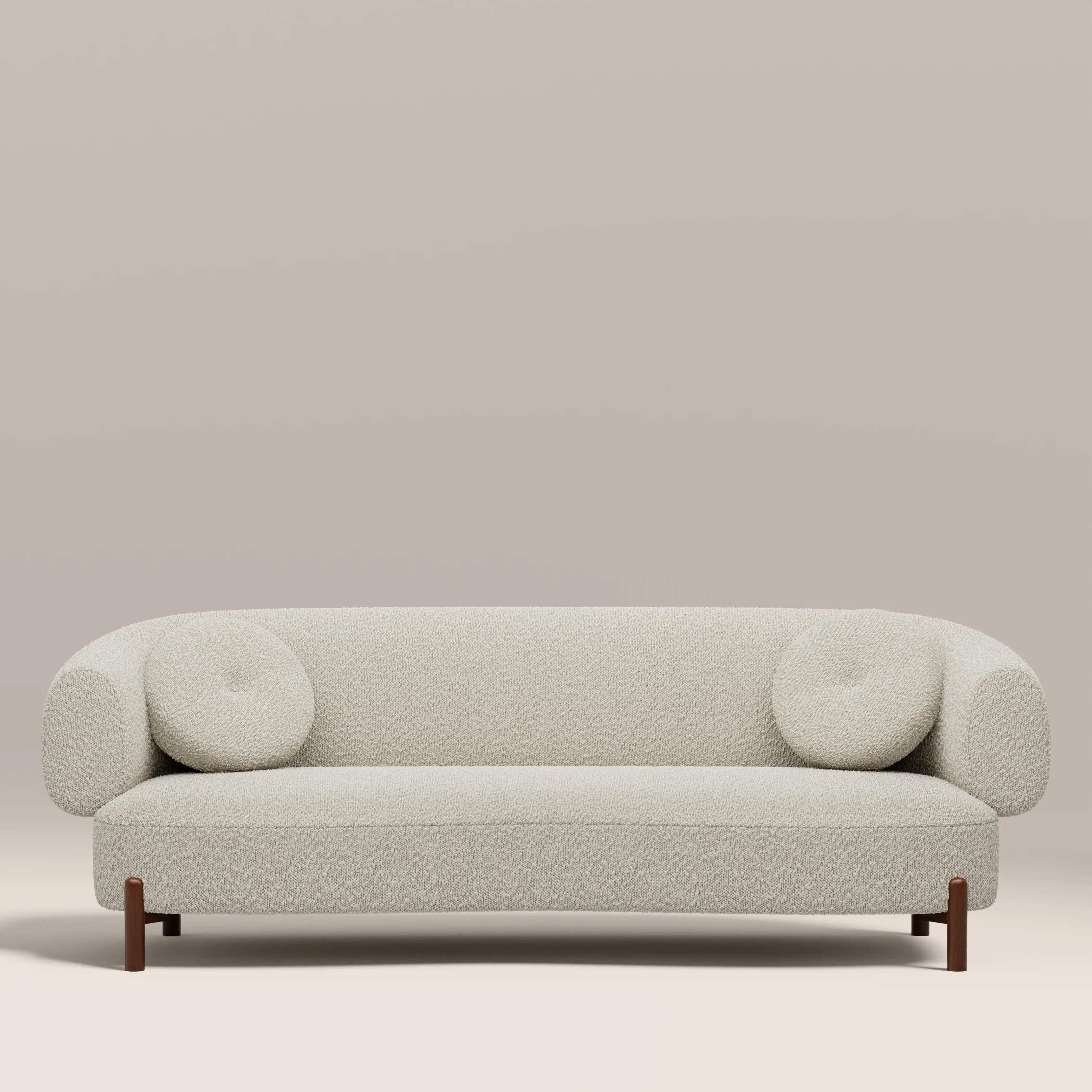 The Hallfield 3 Seater Sofa is inspired by the organic curves and softness of 70s Revival. The luxe speckled stone boucle upholstery with wood legs in walnut finish adds a feeling of luxury and design. The two cushions pictured are also included.