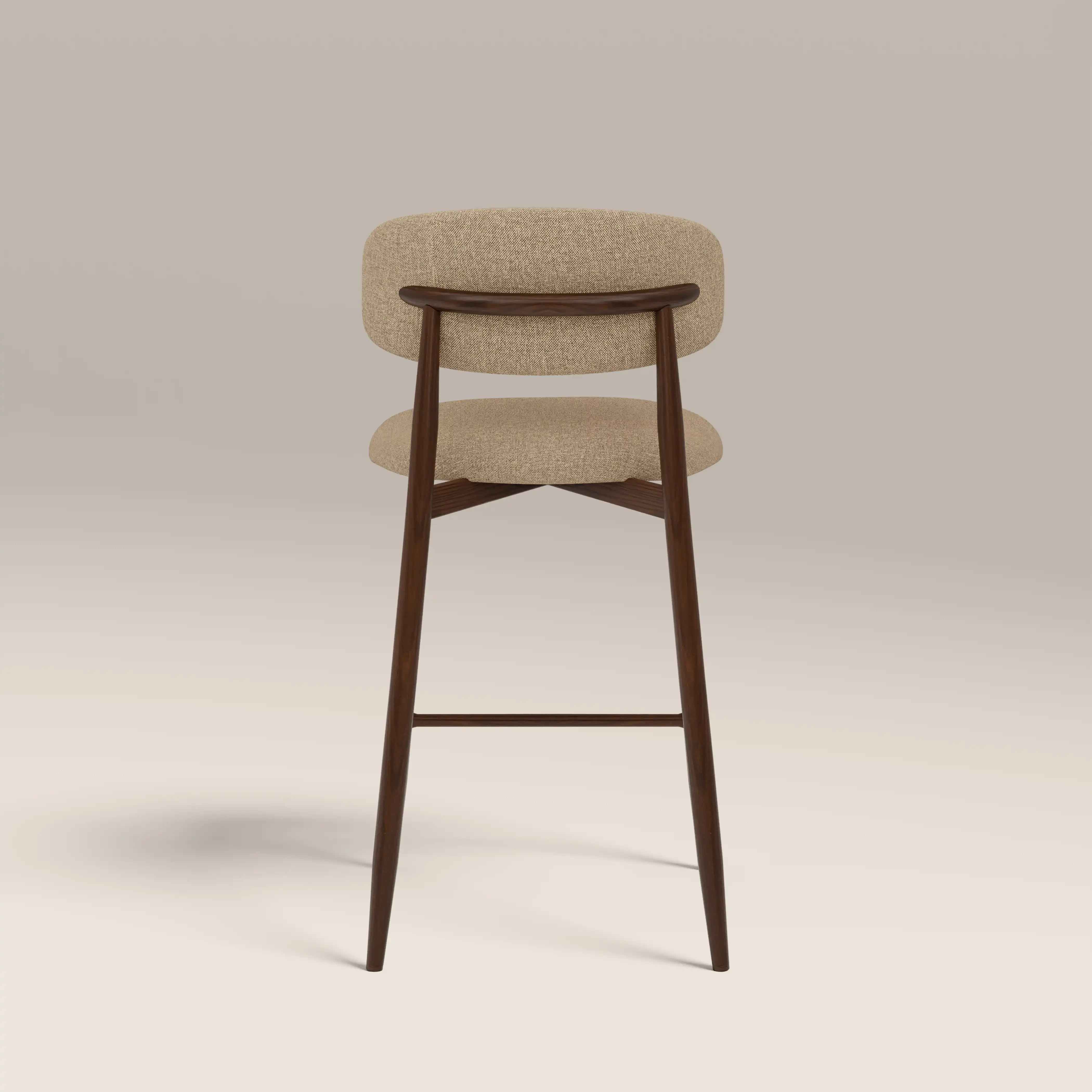The harmonious blend of Nordic and Mid-Century in the Halston Bar Stool makes it an irresistible option for kitchen counters. The curved metal frame has a walnut effect finish and is cross-fixed, making the Halston durable and long-lasting for a high quality finish built to last. Crafted for comfort, the seat is upholstered in sustainably-sourced fabric, soft and textural to the touch, in a light brown and cream hue.