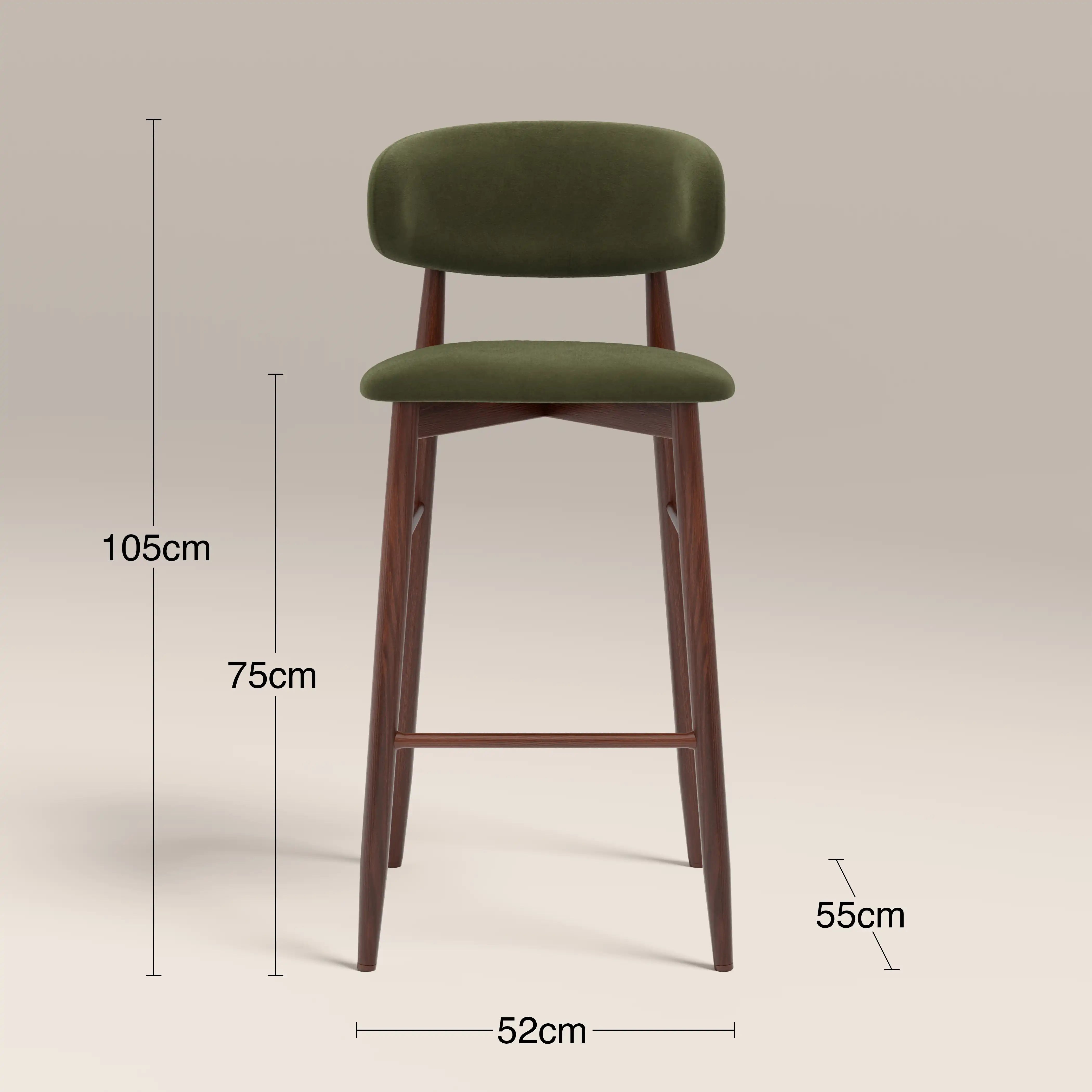 The harmonious blend of Nordic and Mid-Century in the Halston Bar Stool makes it an irresistible option for kitchen counters. The curved metal frame has a walnut effect finish and is cross-fixed, making the Halston durable and long-lasting for a high quality finish built to last. Crafted for comfort, the seat is upholstered in sustainably-sourced velvet, soft and textural to the touch, in a olive green hue.