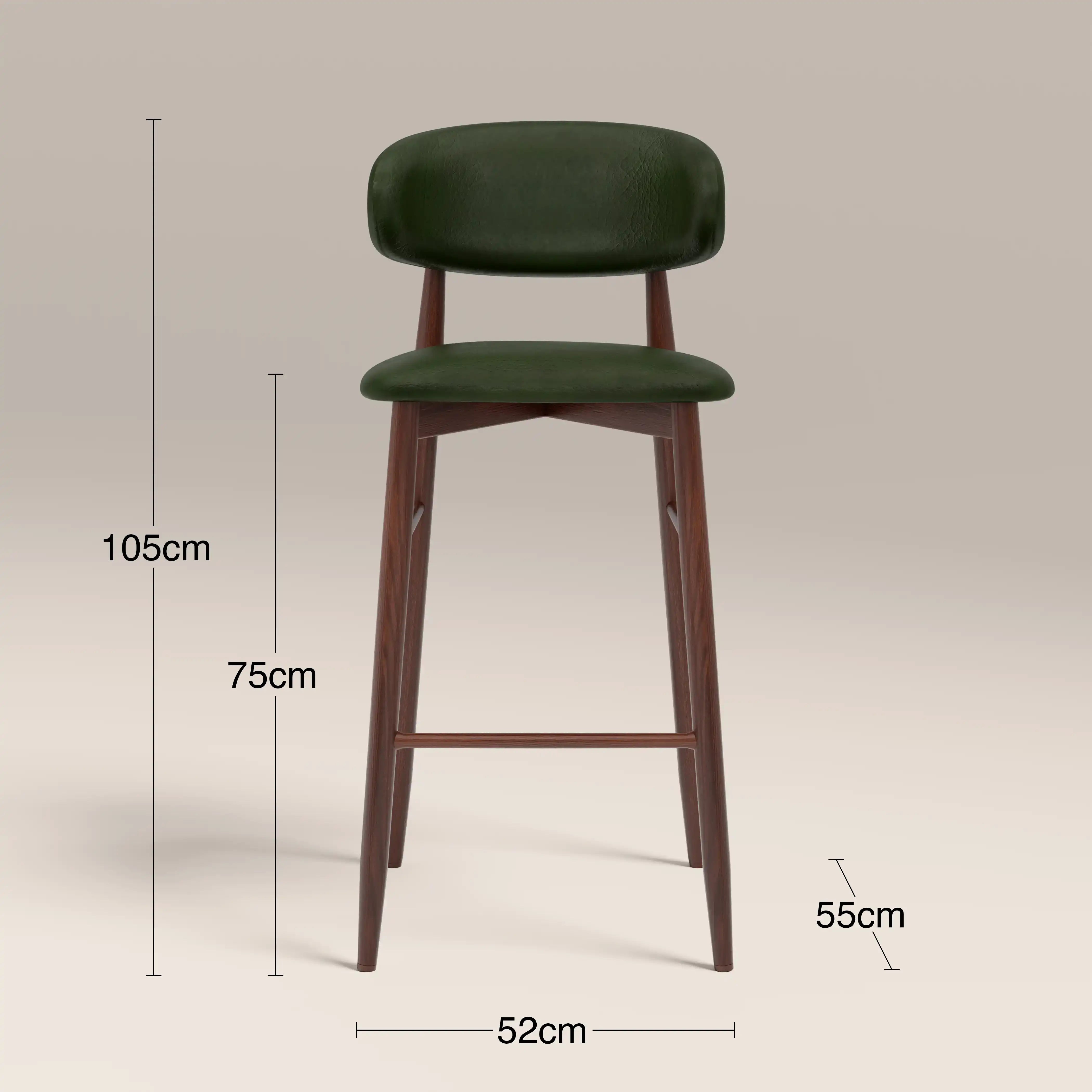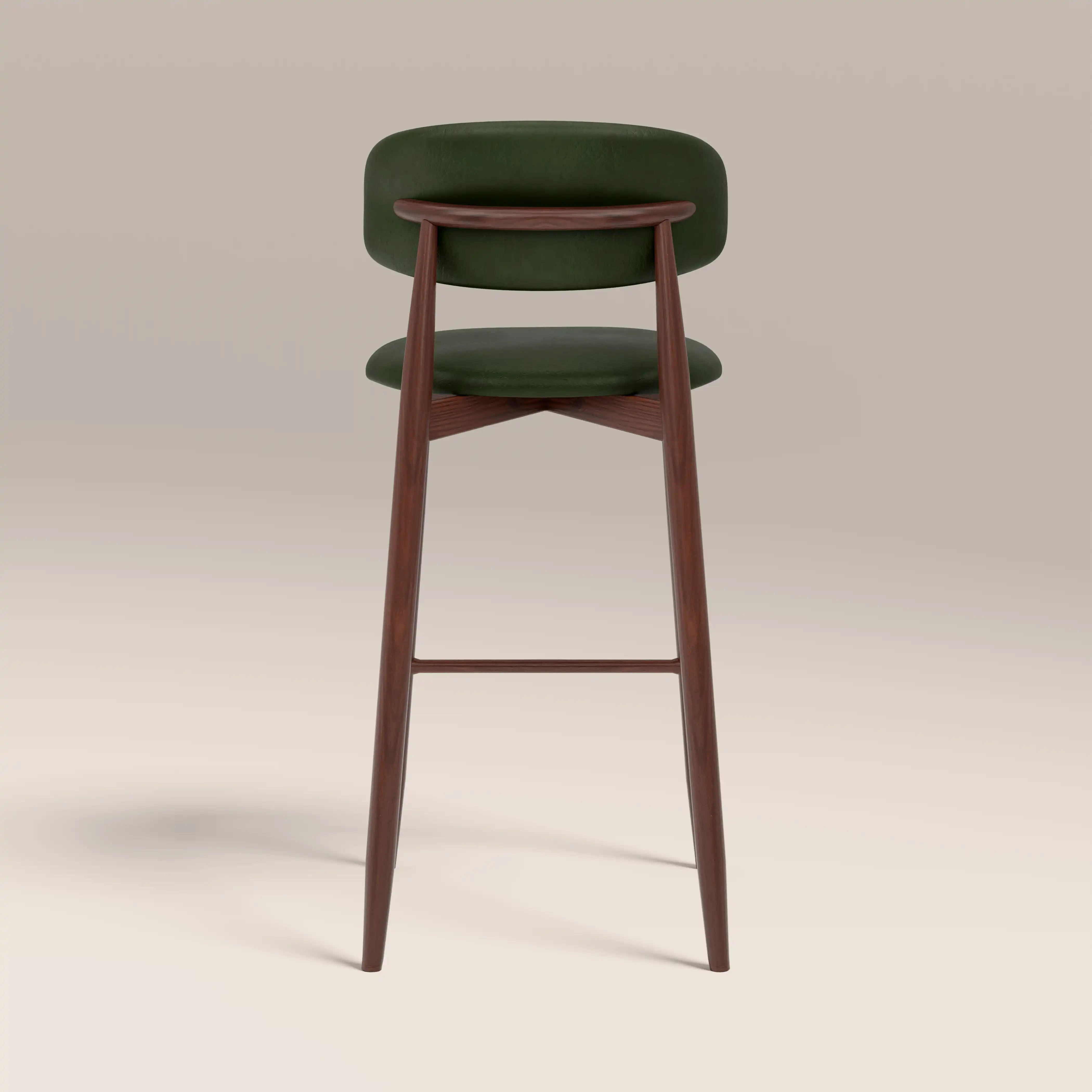 The harmonious blend of Nordic and Mid-Century in the Halston Bar Stool makes it an irresistible option for kitchen counters. The curved metal frame has a walnut effect finish and is cross-fixed, making the Halston durable and long-lasting for a high quality finish built to last. Crafted for comfort, the seat is upholstered in soft faux leather in vintage green.