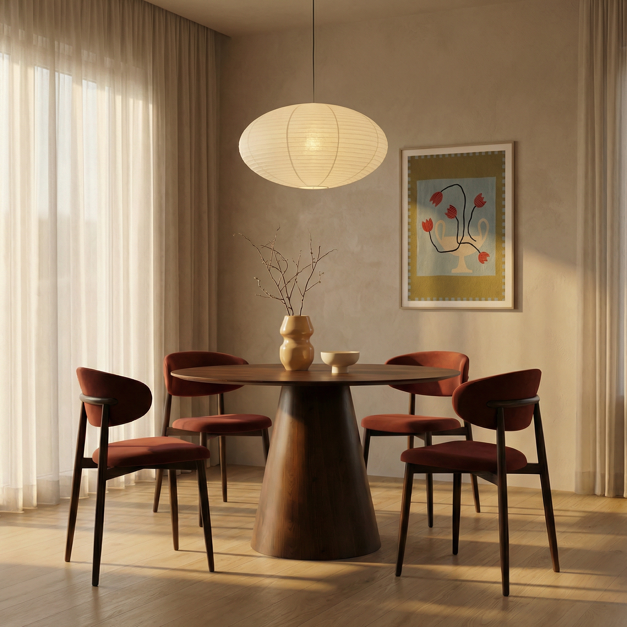 The harmonious blend of Nordic and Mid-Century in the Halston Dining Chair makes it an irresistible option for kitchen and dining spaces. The curved metal frame has a walnut effect finish and is cross-fixed, making the Halston durable and long-lasting for a high quality finish built to last. Crafted for comfort, the seat is upholstered in sustainably-sourced velvet, soft and textural to the touch, in a rust red hue.