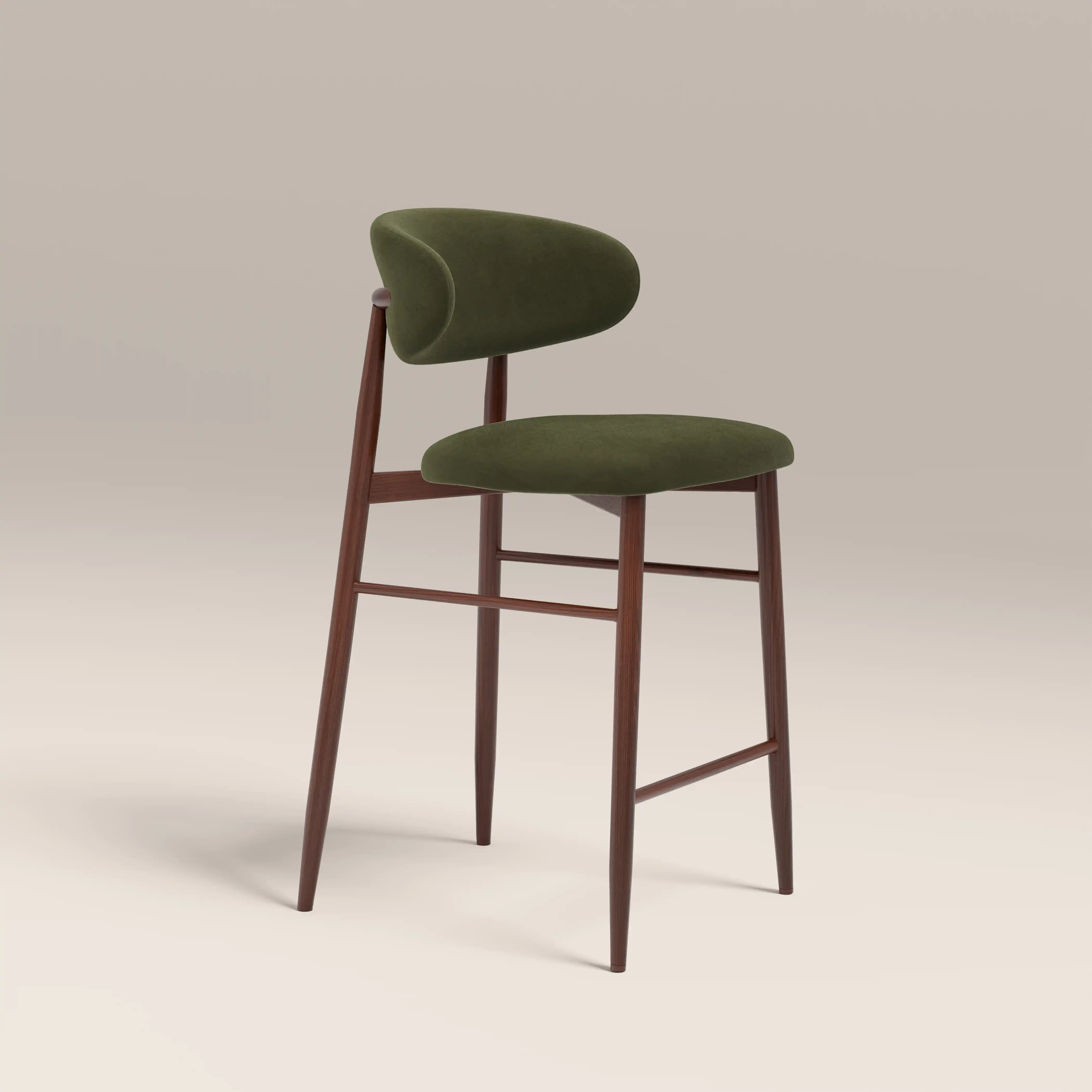 The harmonious blend of Nordic and Mid-Century in the Halston Kitchen Stool makes it an irresistible option for kitchen counters. The curved metal frame has a walnut effect finish and is cross-fixed, making the Halston durable and long-lasting for a high quality finish built to last. Crafted for comfort, the seat is upholstered in sustainably-sourced velvet, soft and textural to the touch, in a olive green hue.