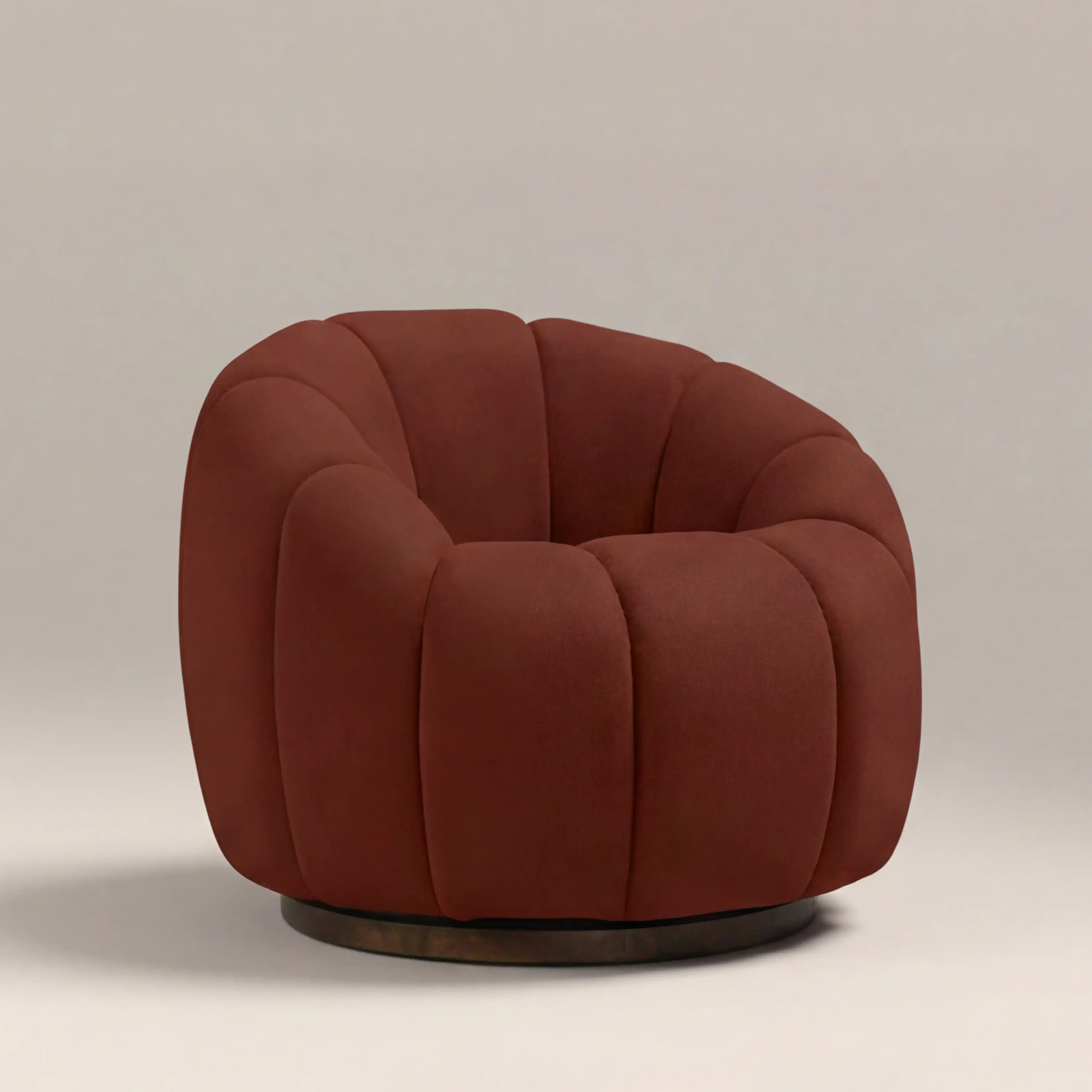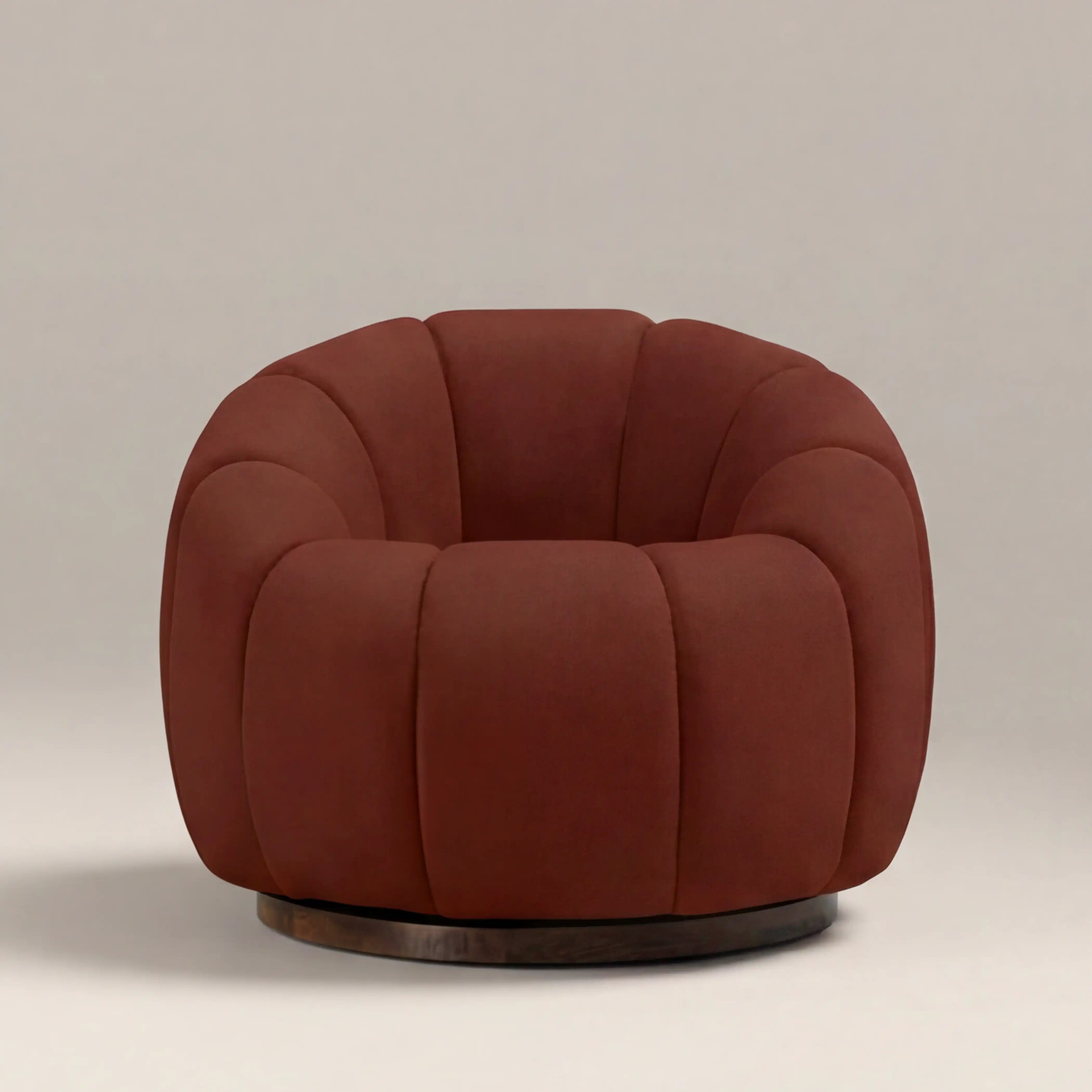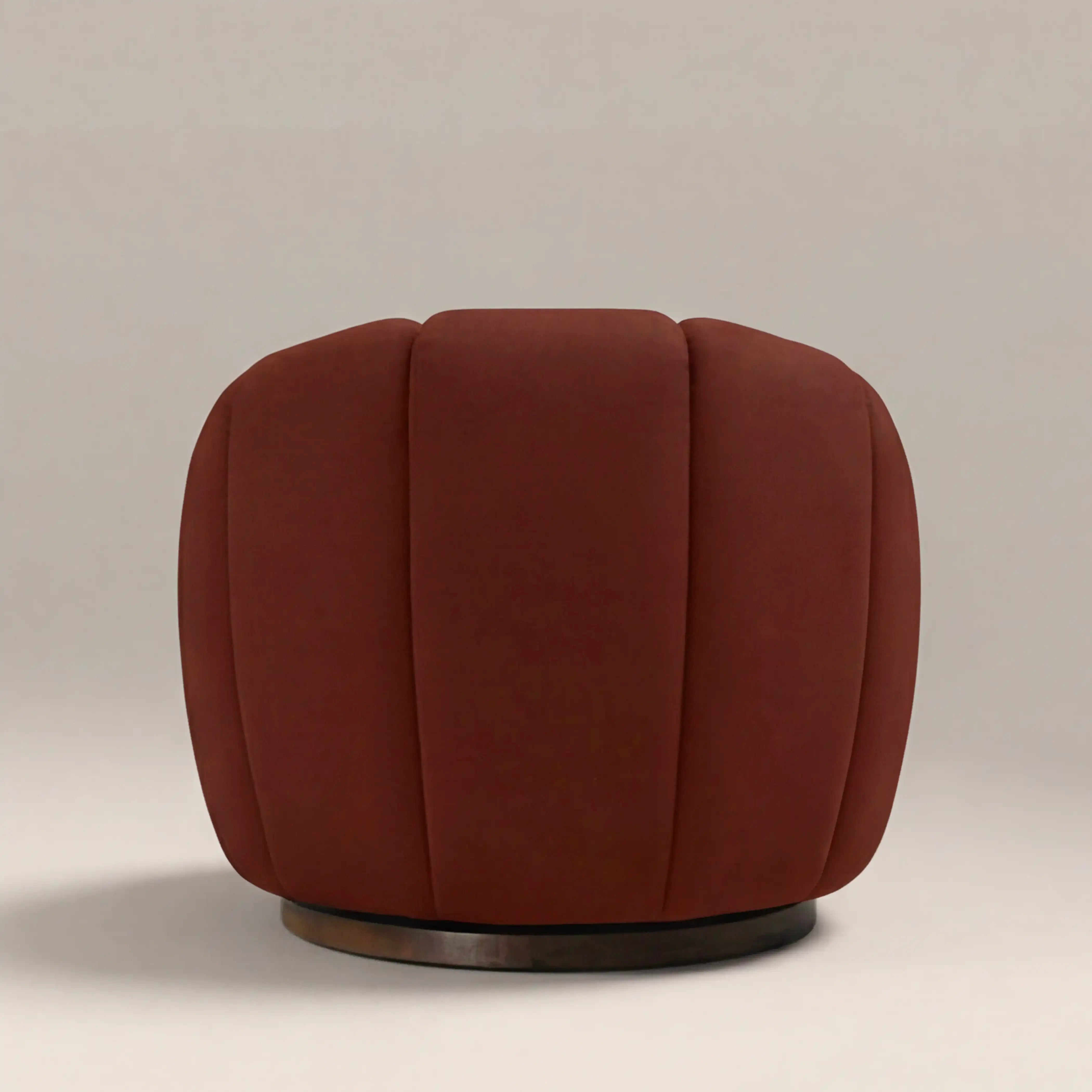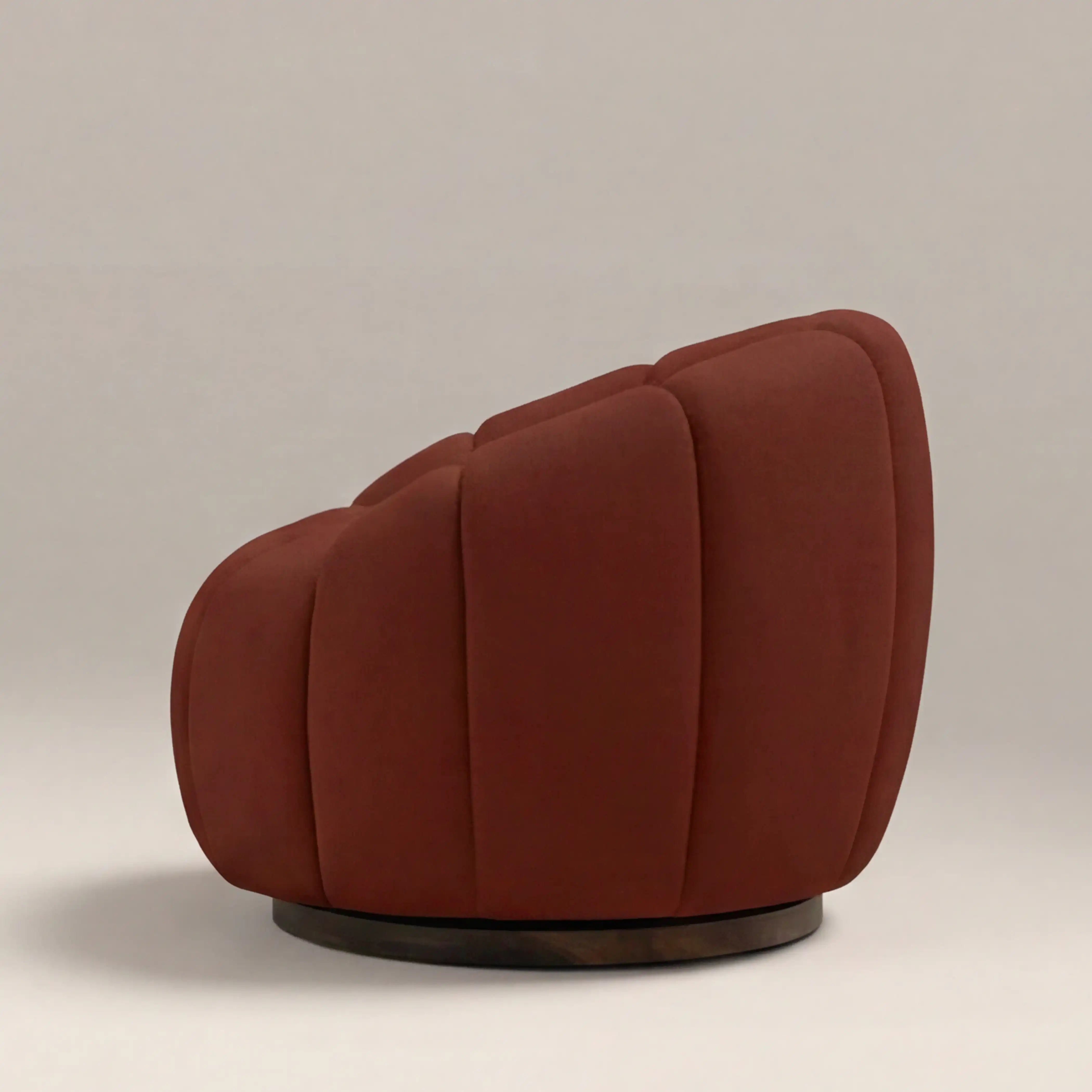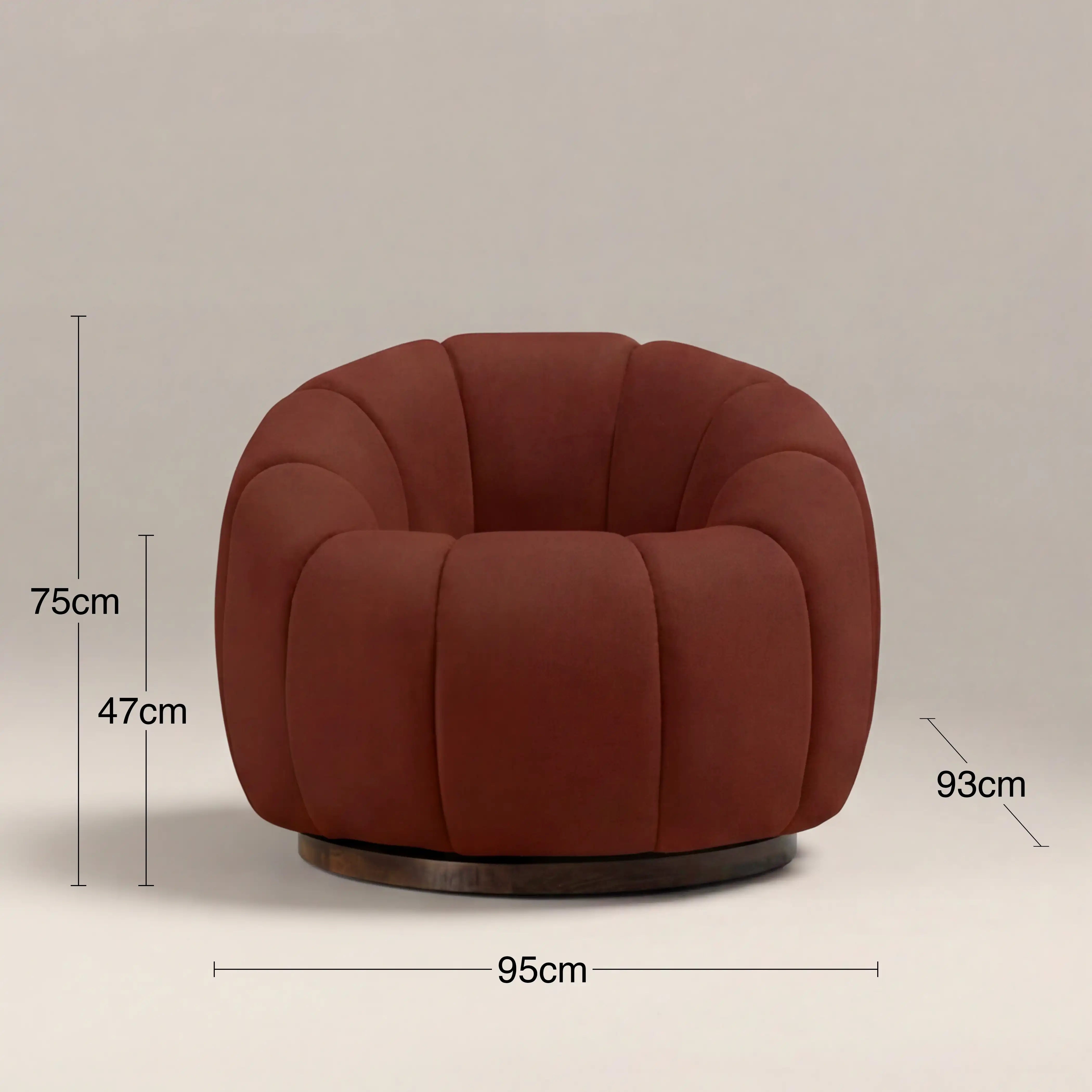 Inspired by the 70s Revival with a ribbed design, the swooping curves of the Ivy Red Armchair are finely balanced with soft velvet upholstery in rust. This accent chair is more than a statement piece - the padded seat and slouchy style is so comfortable, and with a 360° swivel function, you needn't move all day. Note the wood detailing in a walnut finish around the base to complete this cosy yet slouchy style, perfect for lounging.