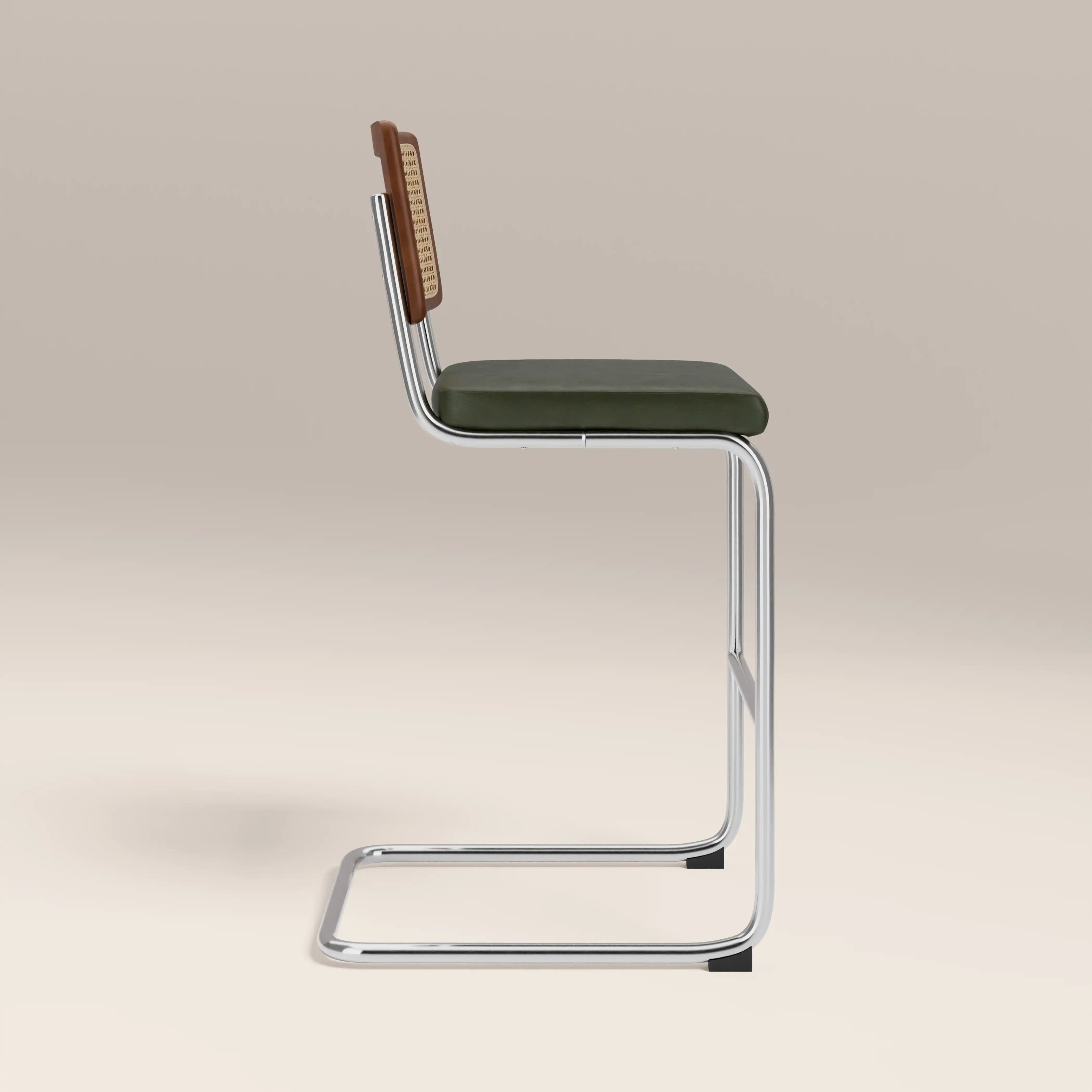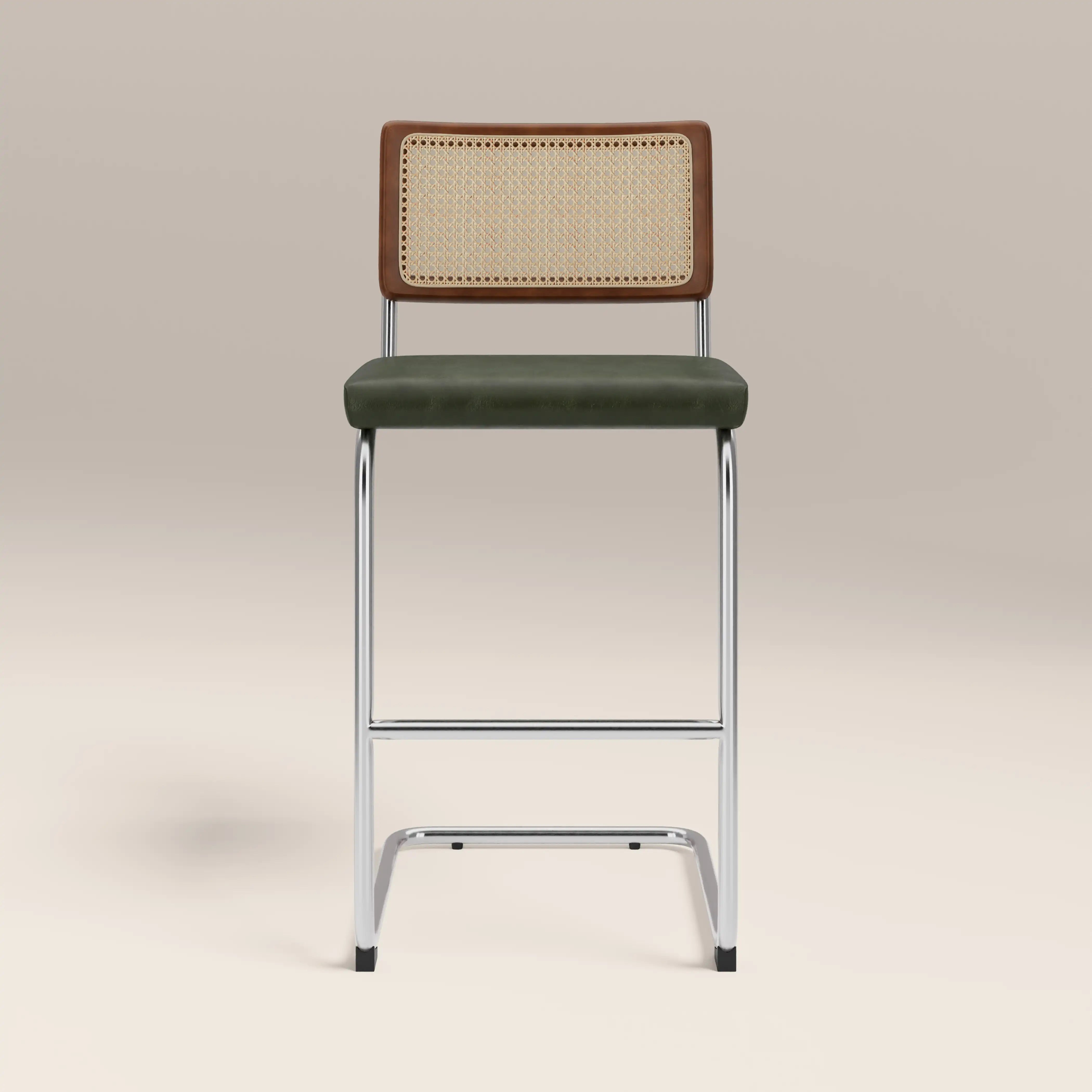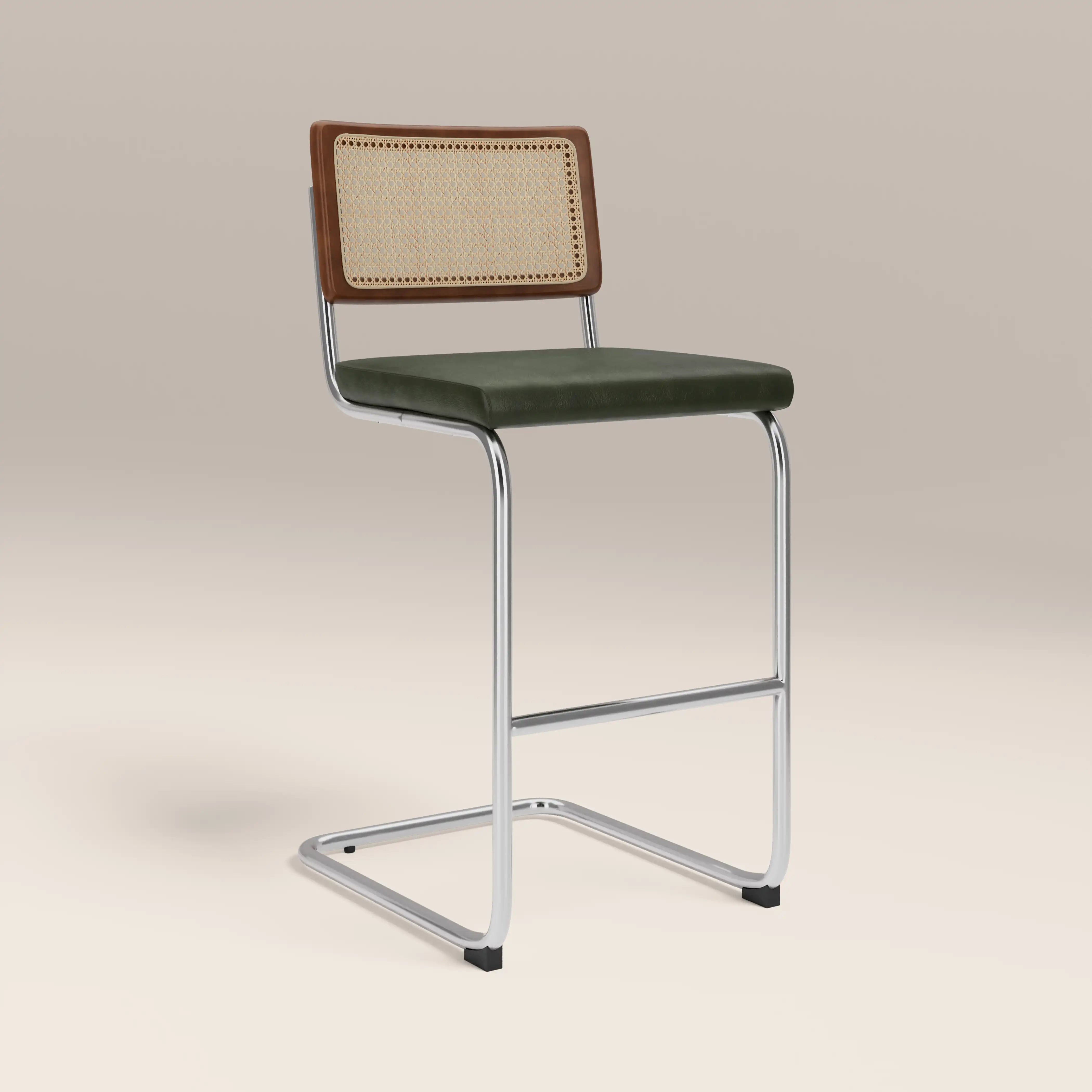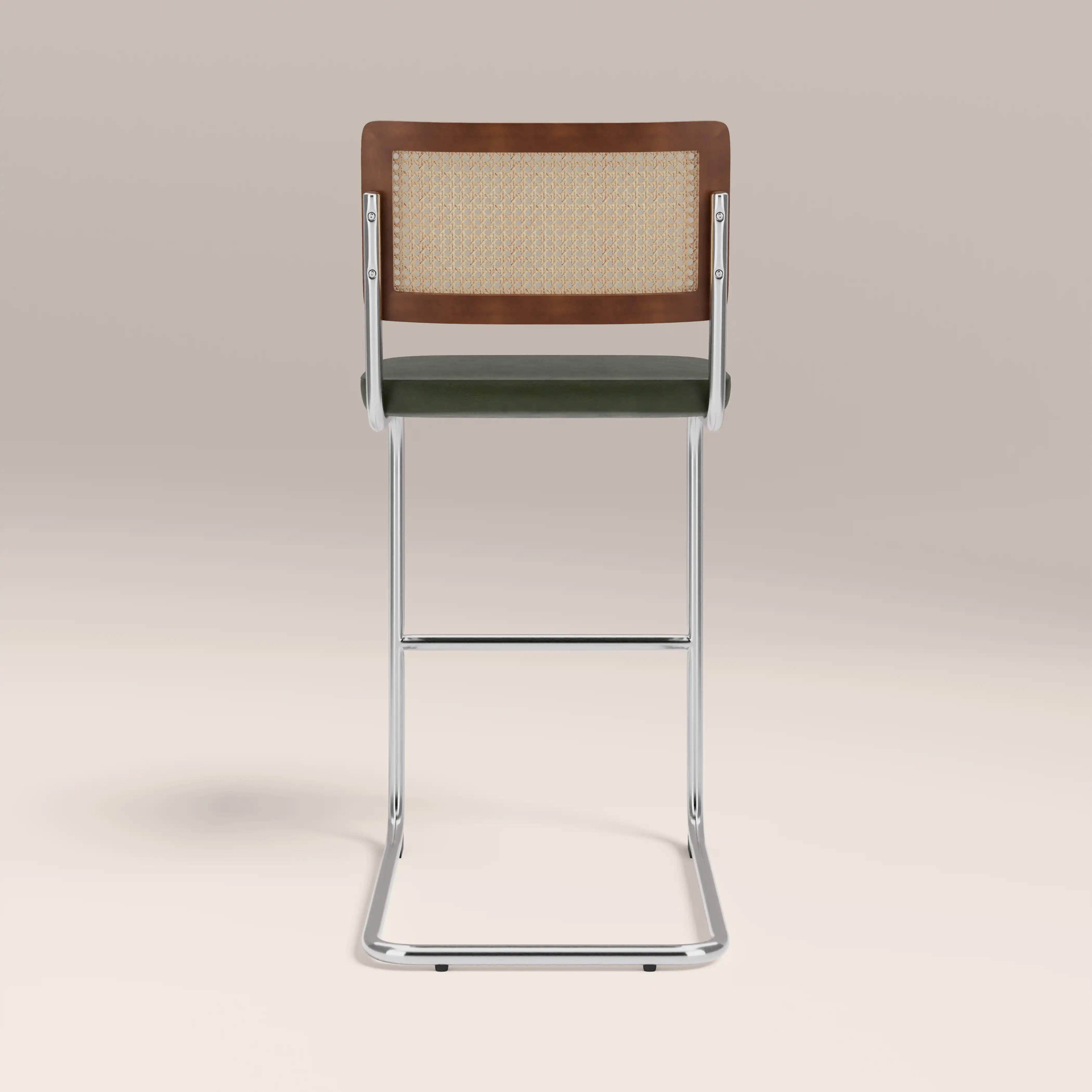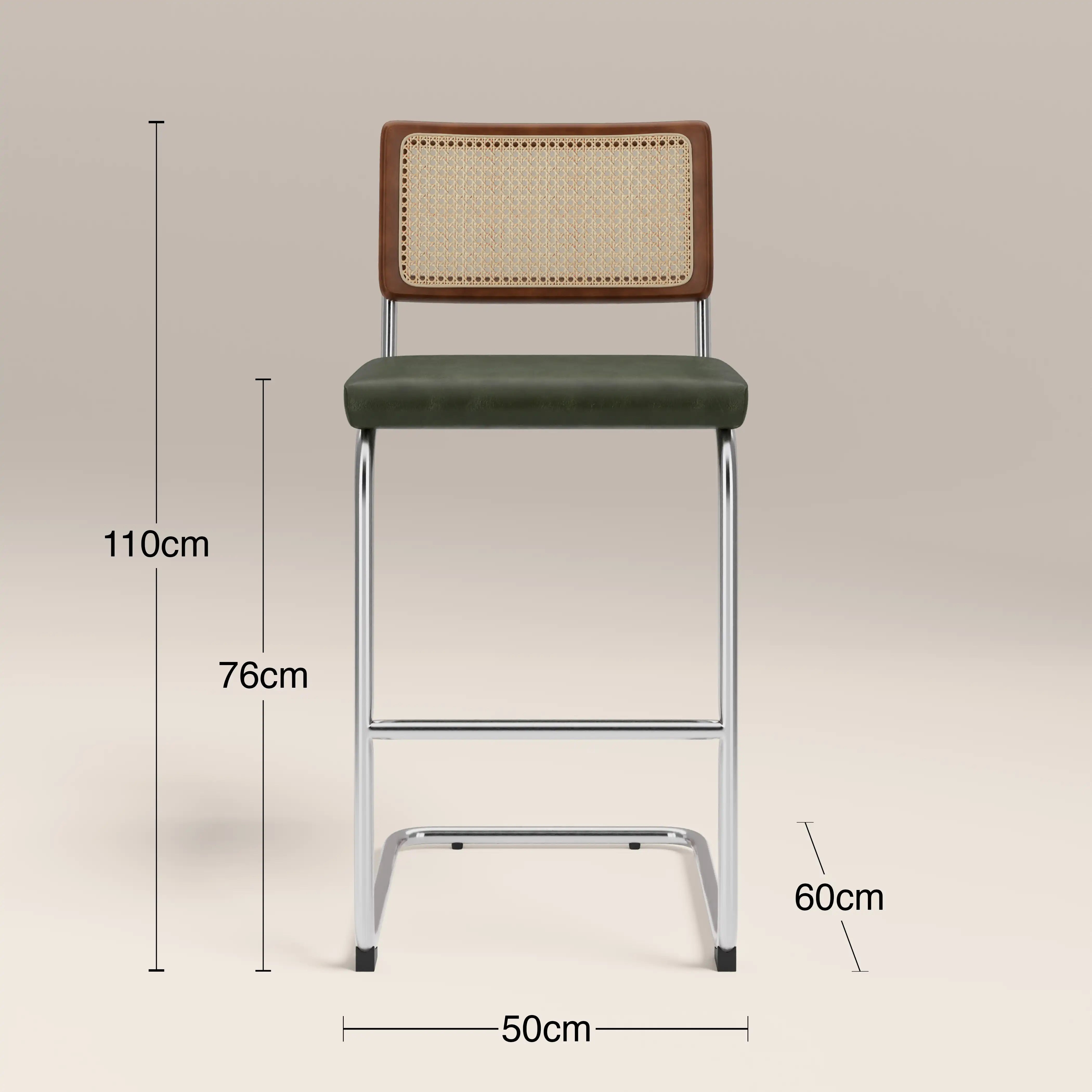 The Kenton Range is instantly recognisable for its Bauhaus roots including an S-shaped framework and blend of modernist materials. A staple in homes for its beautifully simple design, this Kenton Cantilever Bar Stool features a soft vintage green faux leather seat and chrome metal frame with stained wood and cane backrest. Considered one of the most influential designs of the 20th century, this bar stool has a timeless appeal you've just got to have in your kitchen.