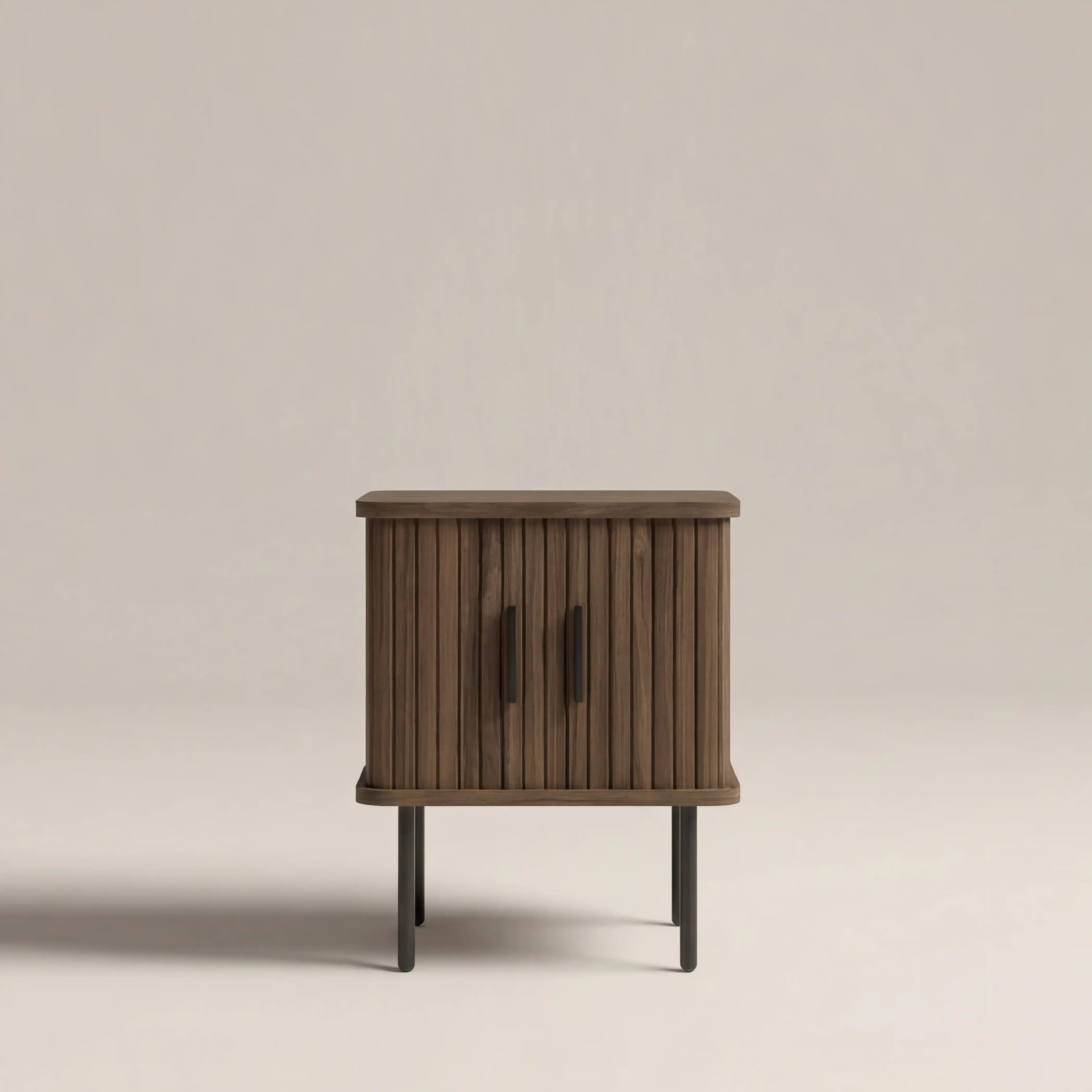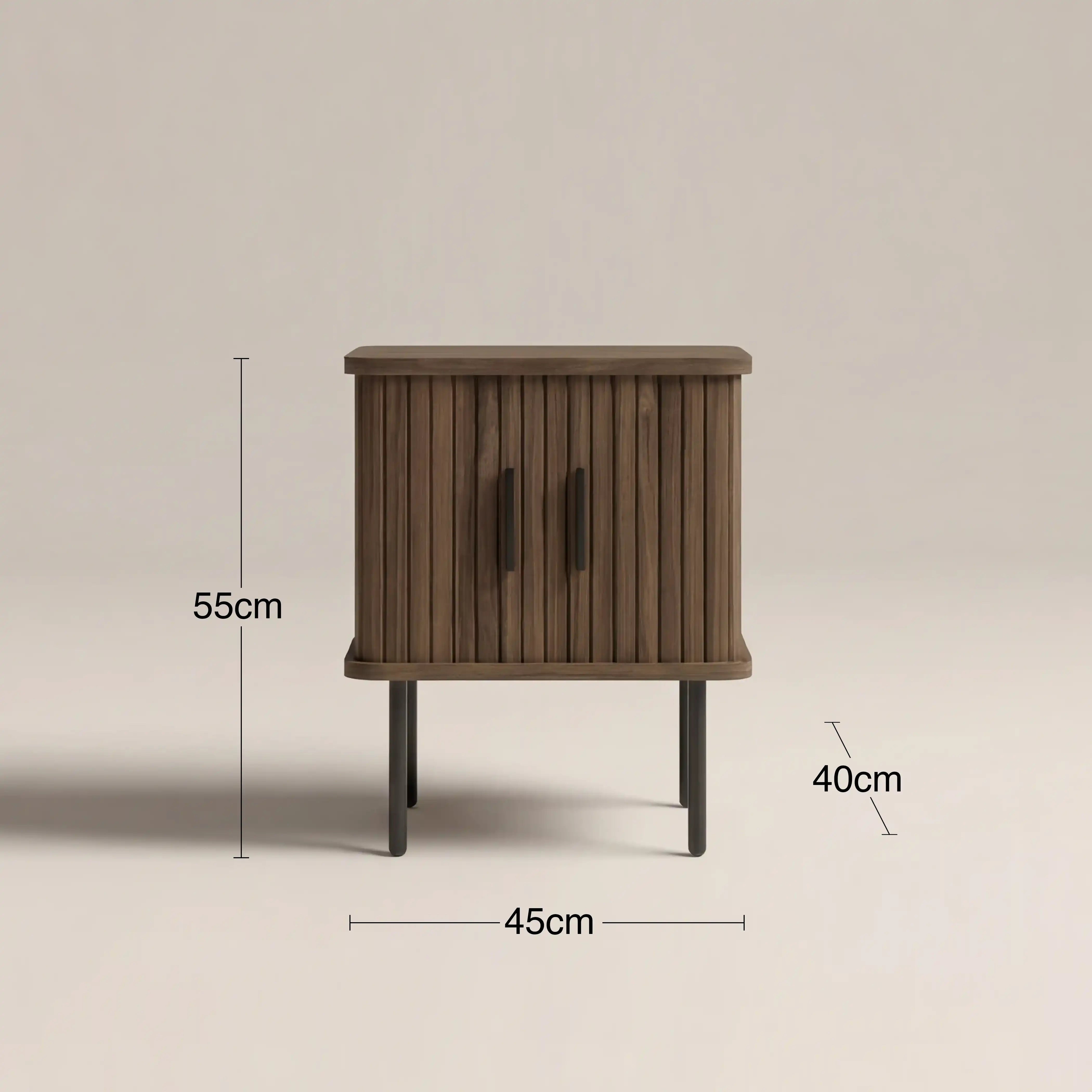 To declutter in style, the concertina doors of the Mika Wooden Bedside Table glide effortlessly across revealing two spacious storage compartments with adjustable shelving so you can organise your personal belongings exactly how you like them. In a walnut-stained finish with ribbed detailing, the Mika Bedside Table with storage incorporates contemporary design with durable materials for a gorgeous storage option with practicality.