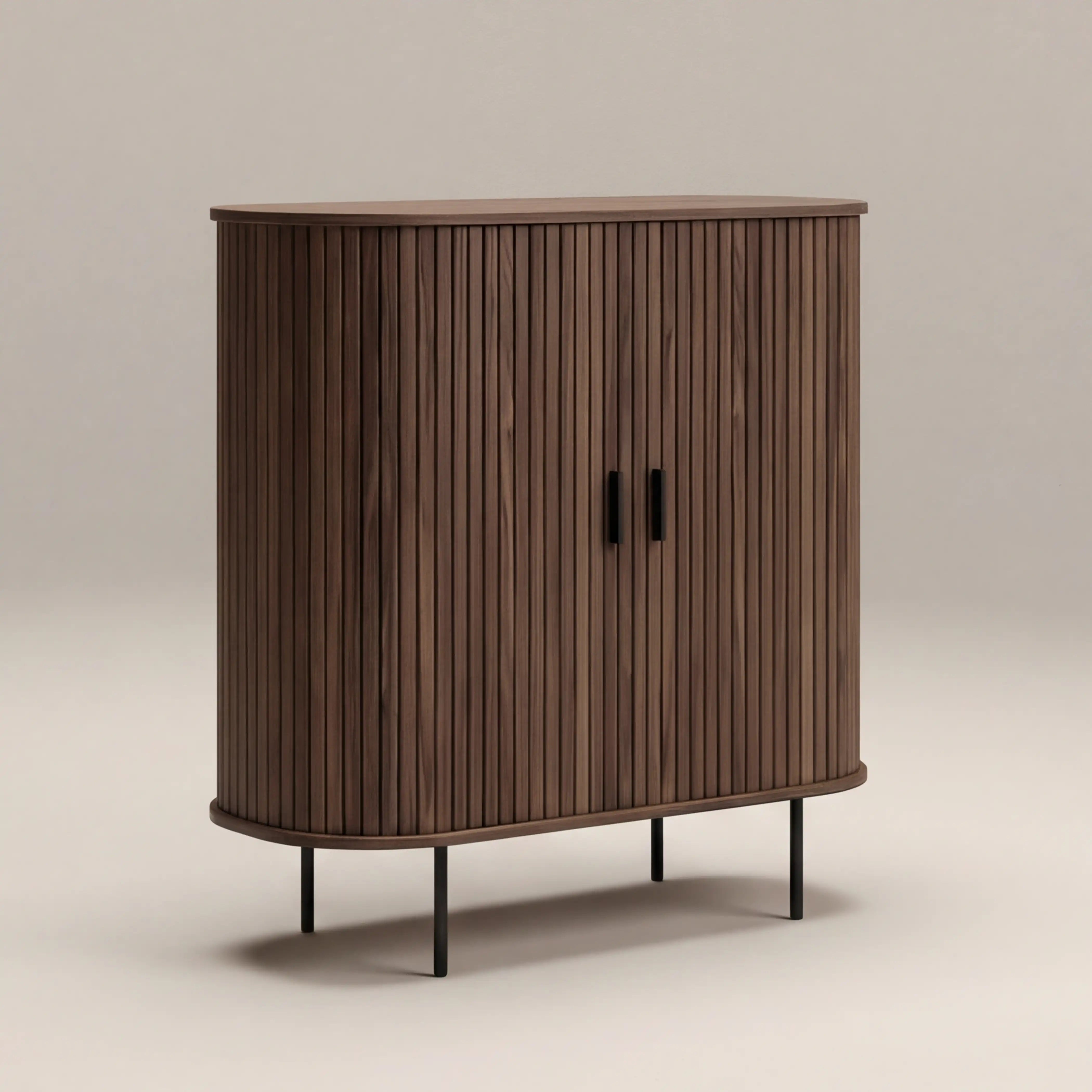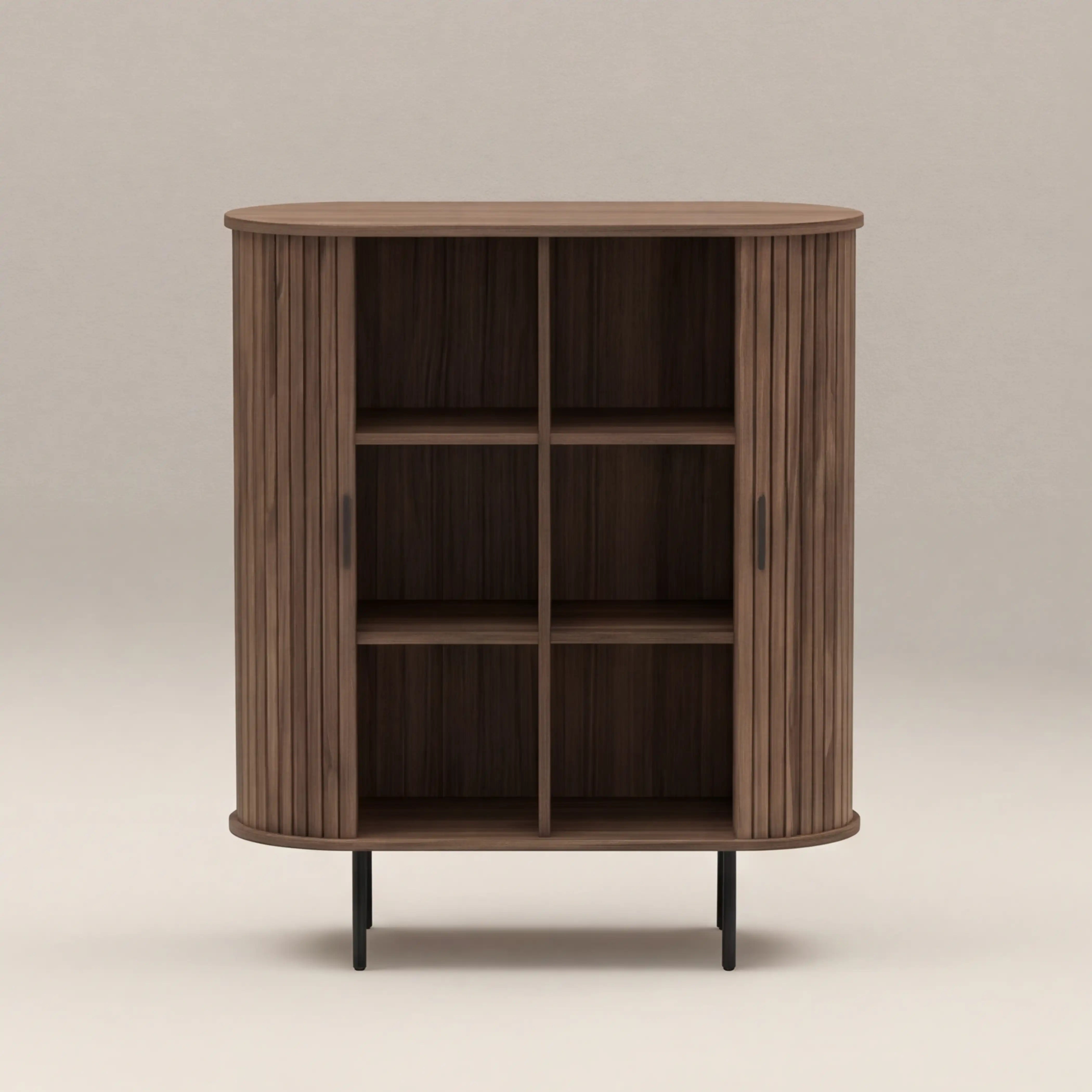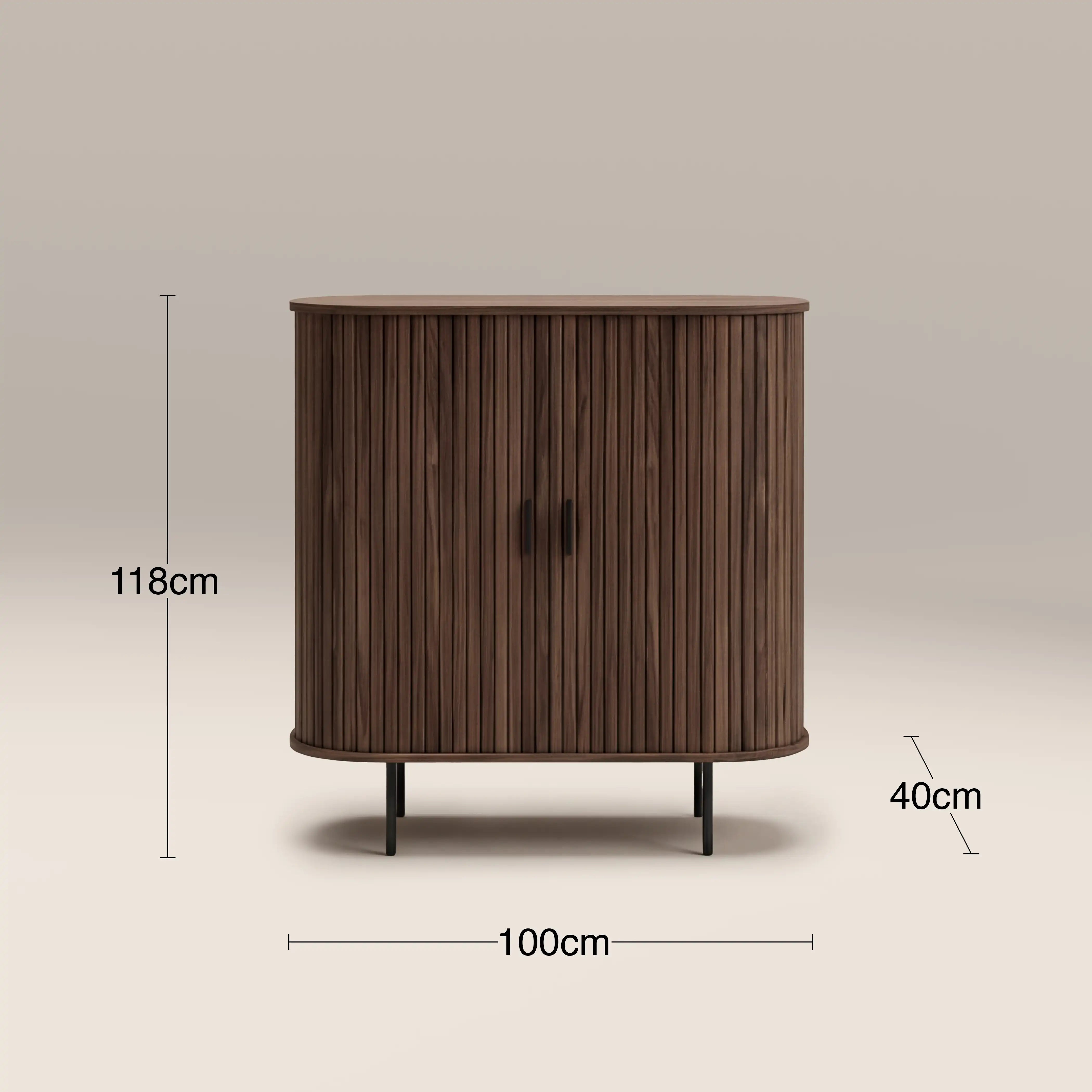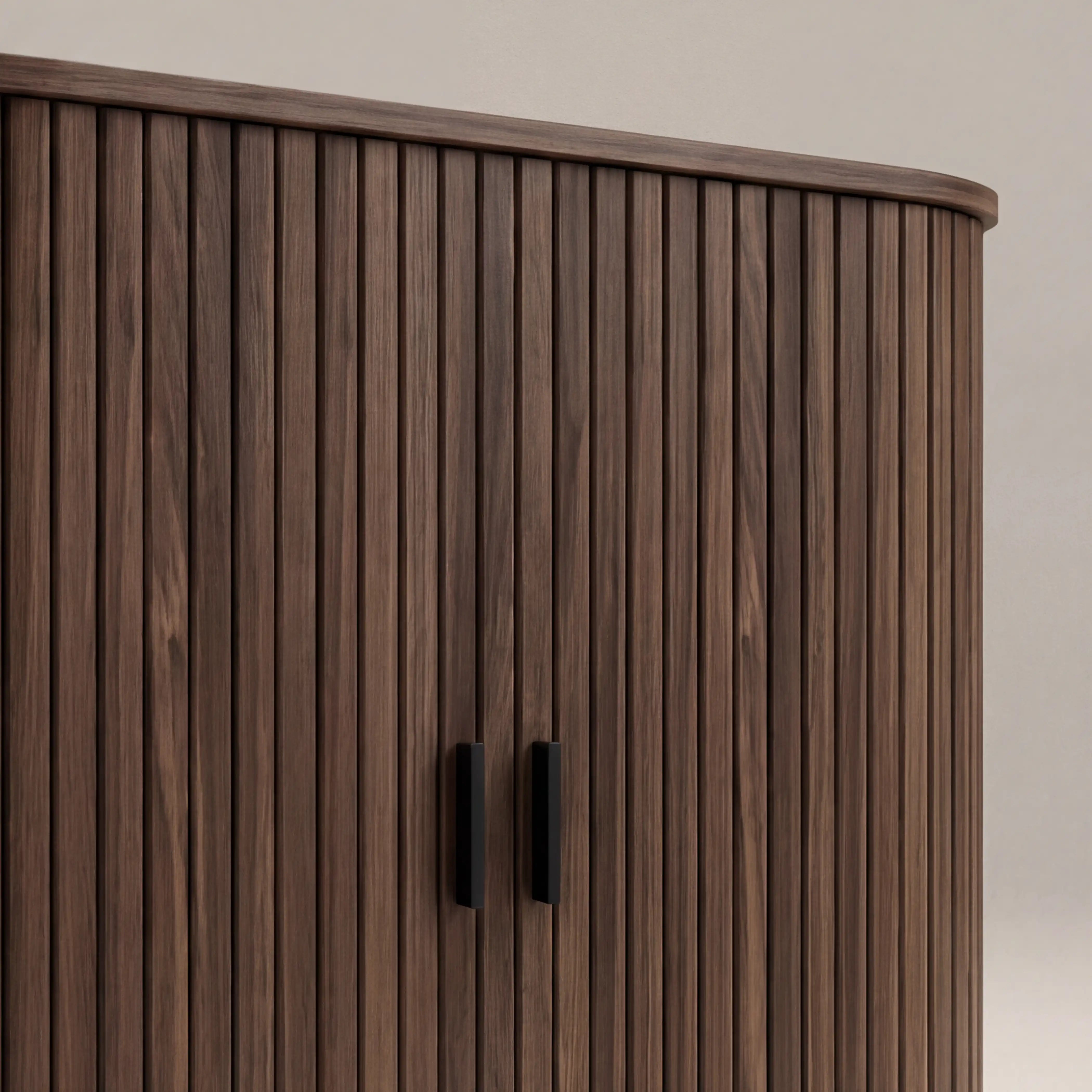 To declutter and organise in style, the concertina doors of the Mika Wooden Sideboard glide effortlessly across, revealing six spacious storage sections with fixed shelving. suitable for living rooms, dining rooms, and hallways. In a walnut-stained finish with ribbed detailing, the Mika Tall Sideboard incorporates contemporary design with durable materials for a gorgeous storage option with practicality. Made from a specially treated walnut veneer that is waterproof and stain resistant, the Mika Collection is easy to maintain and durable, for a long-lasting piece suitable for everyday use.
