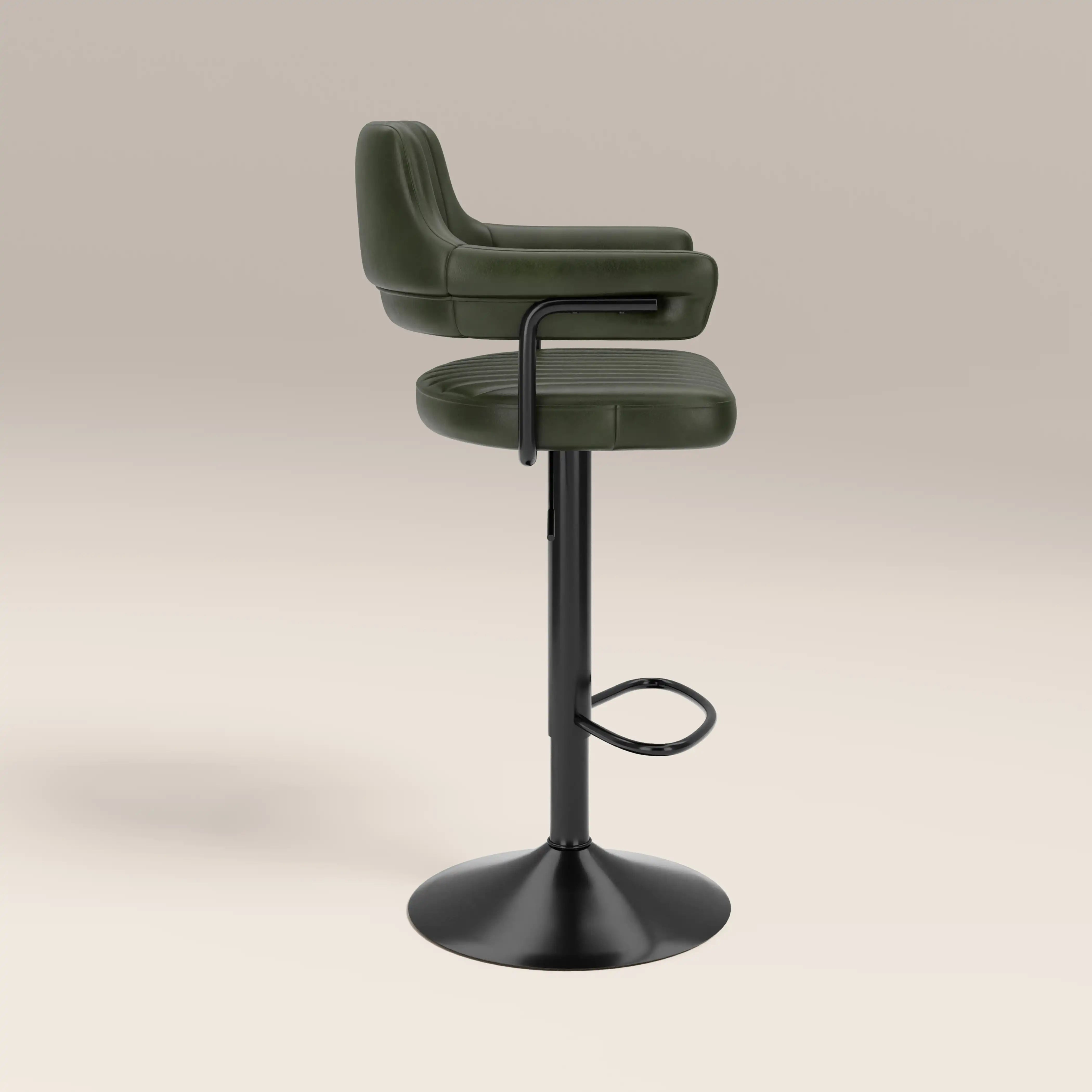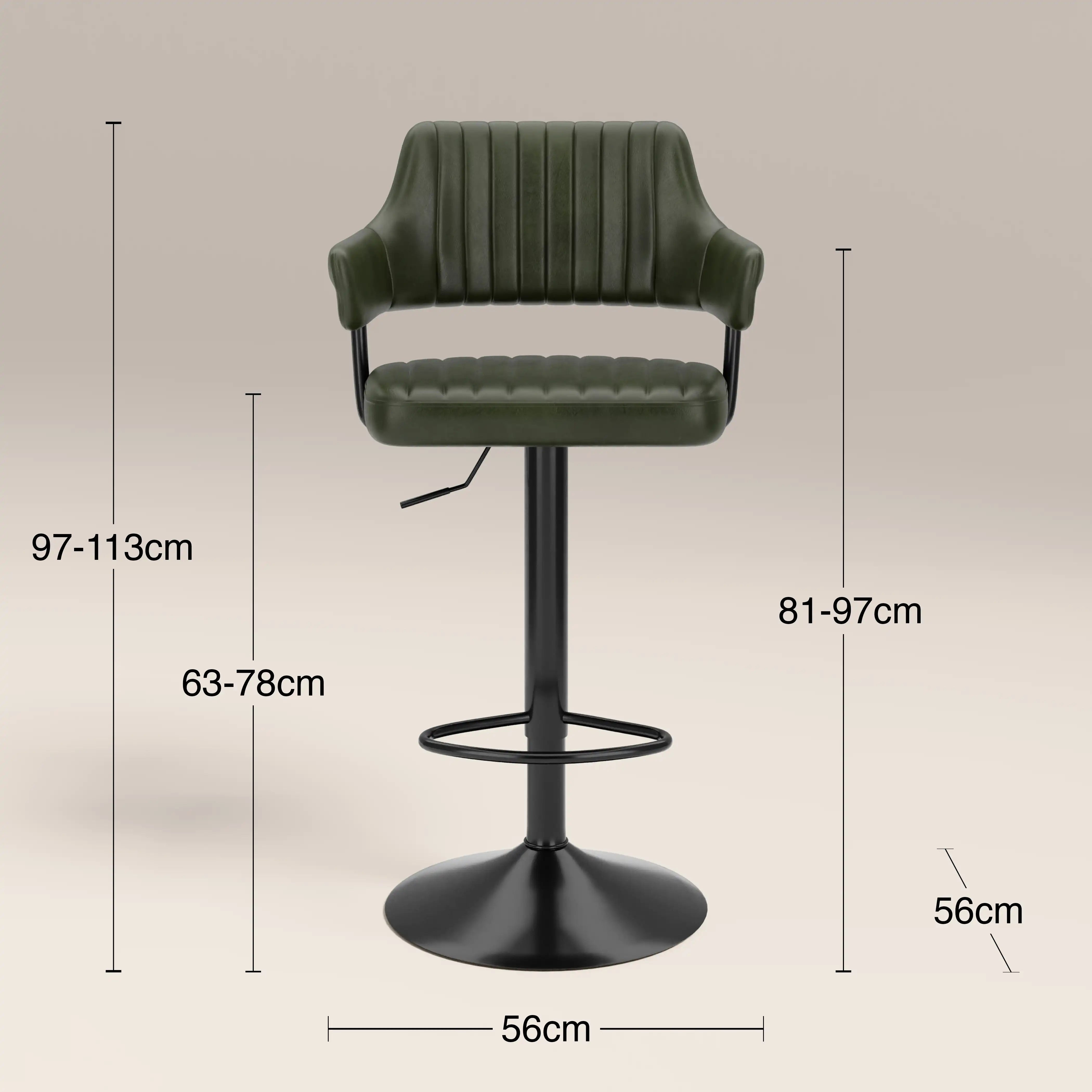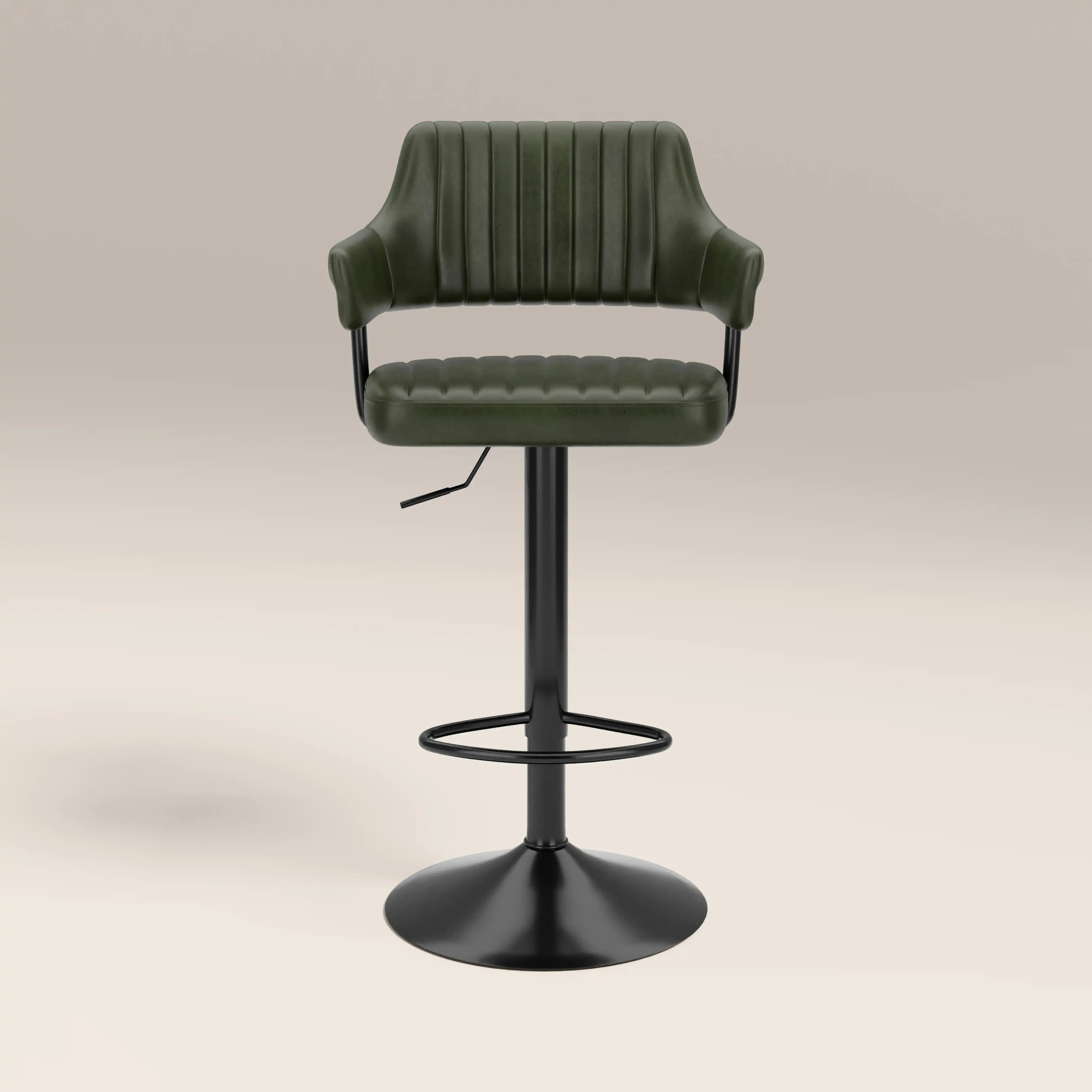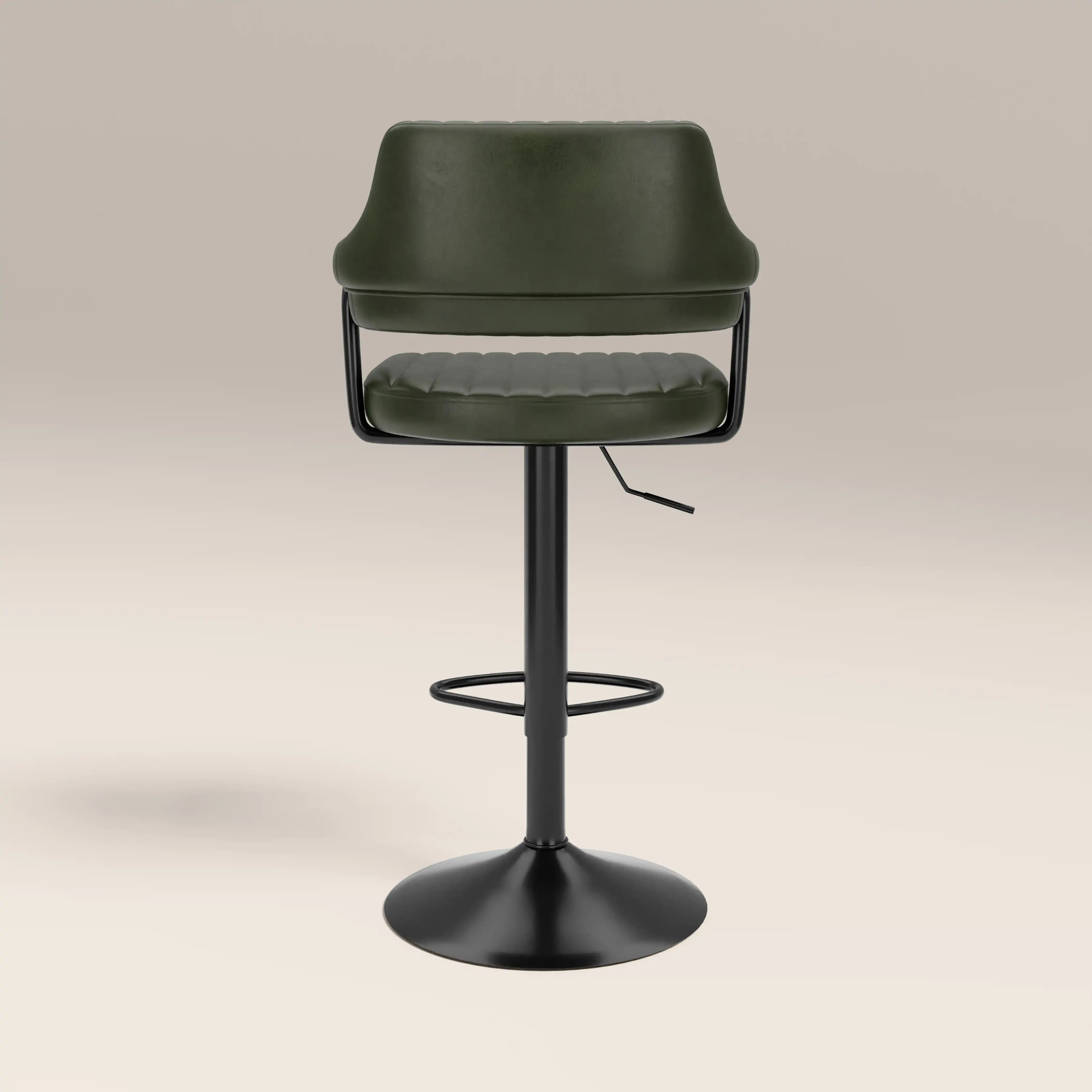 One for the Industrial Design Lovers. Crafted from metal and soft faux leather, the Mindy Bar Stool draws inspiration from industrial design with its vintage green, padded seat and backrest featuring stitched detailing. We love the swooping armrests that blend into the black frame. Featuring a sculpted body design, adjustable height, swivel function, and built-in footrest - you can sit at your kitchen island in blissful comfort.