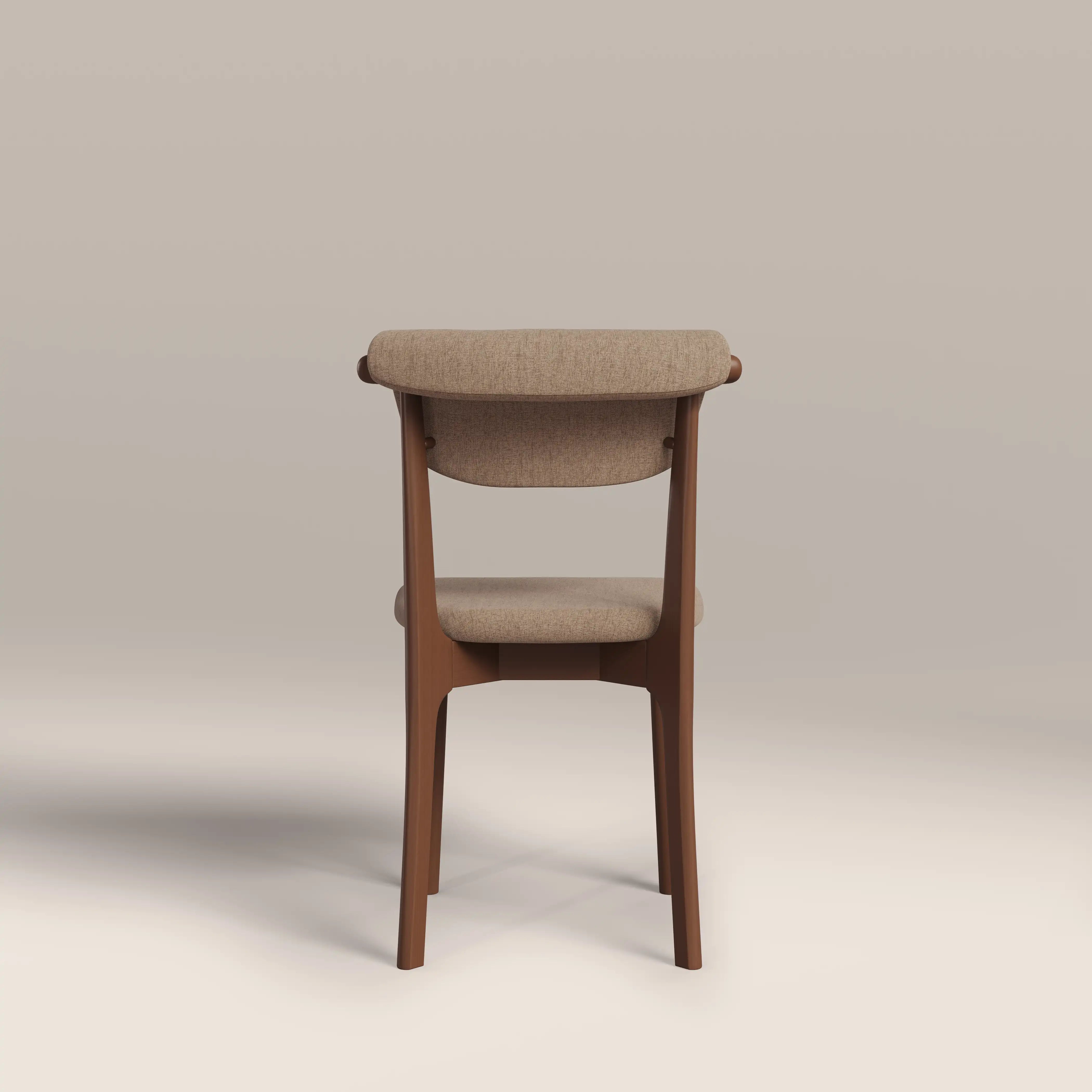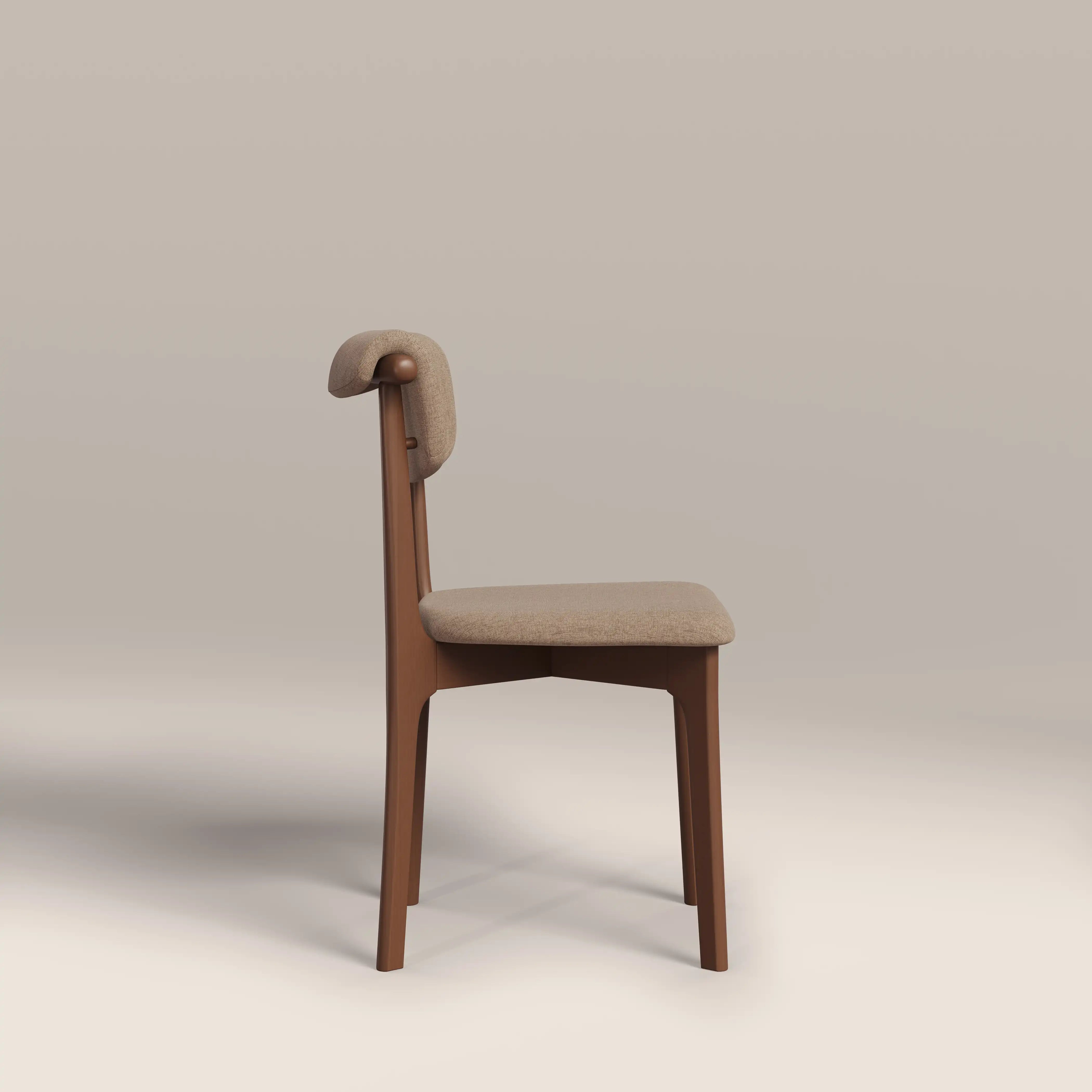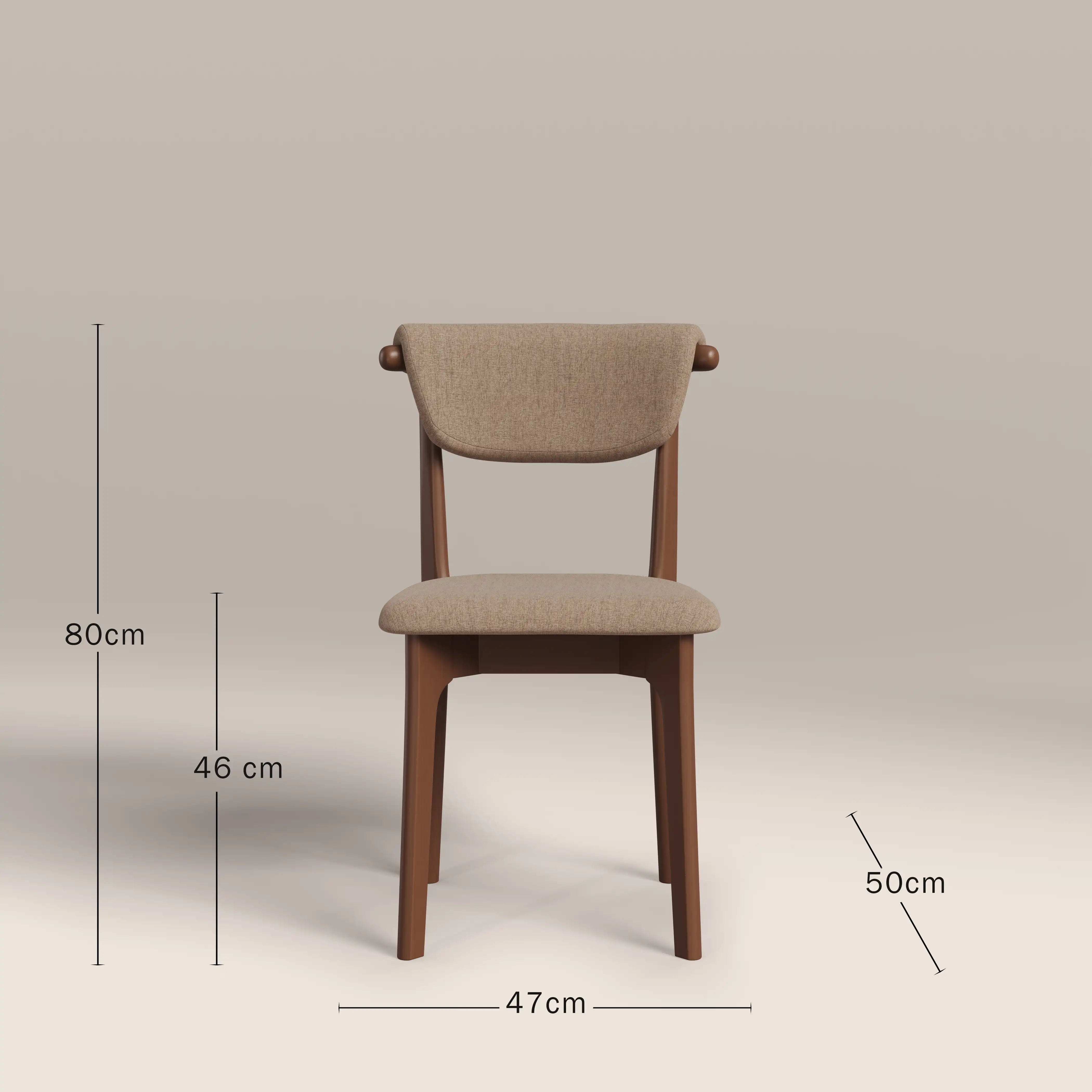 Elevate your dining space with the minimalist elegance of this Japandi-style Nobu dining chair. Blending Scandinavian simplicity with Japanese functionality, this wooden dining chair features clean lines, including upholstery that curves over the backrest and gently tapered legs. In latte brown sustainable fabric, it offers a soft yet durable surface, while the walnut-stained wood frame adds warmth and organic texture. Ideal for modern, minimalist, or serene interiors.