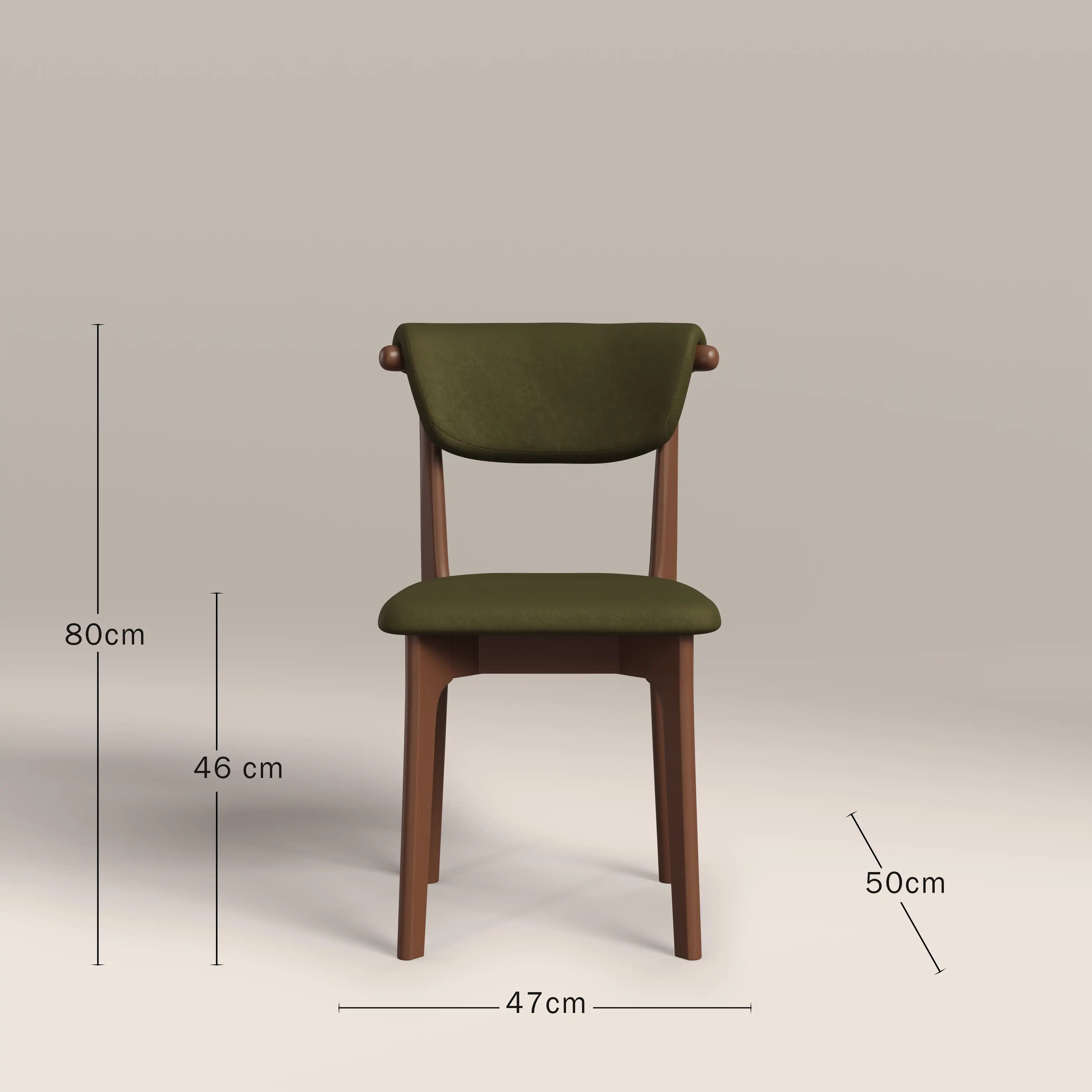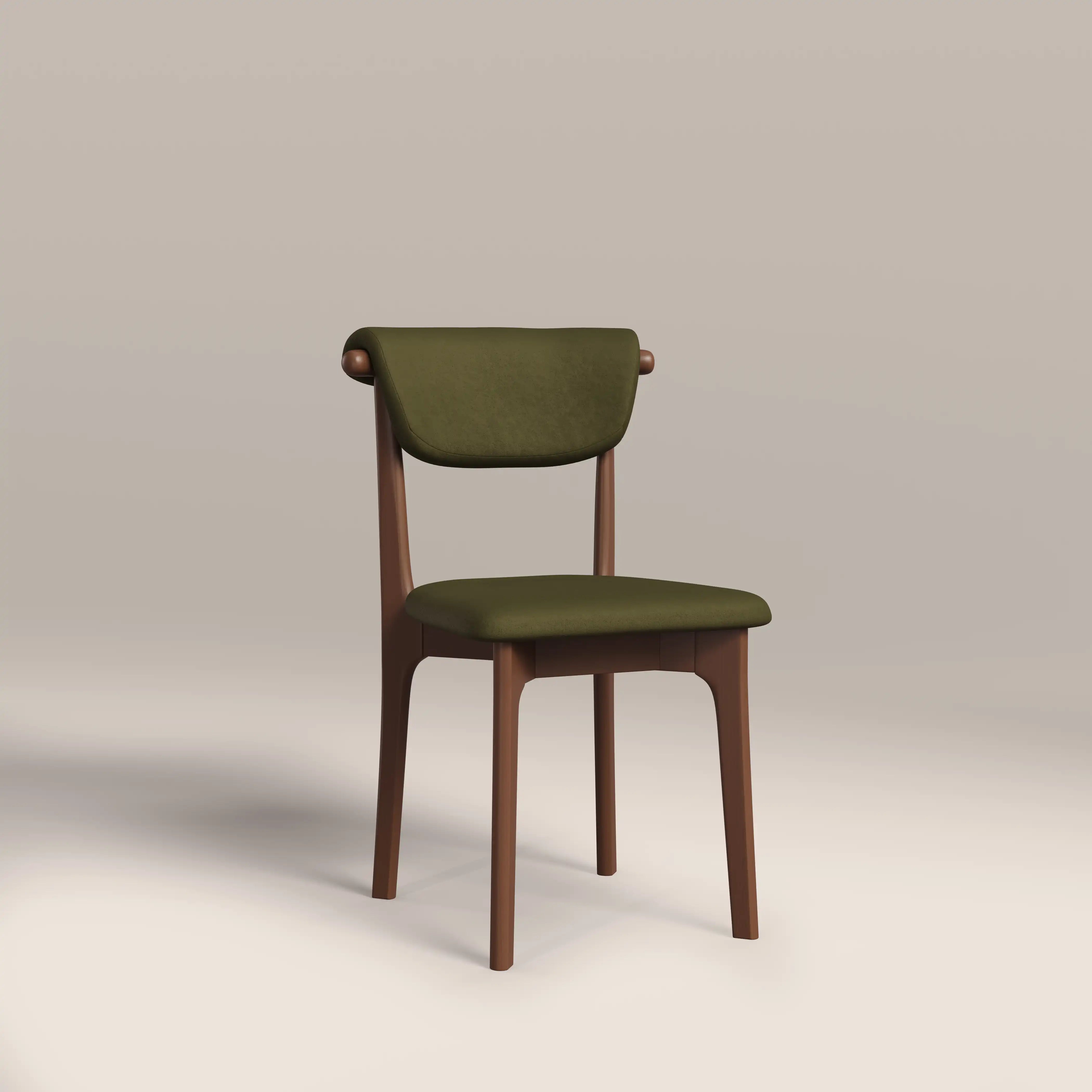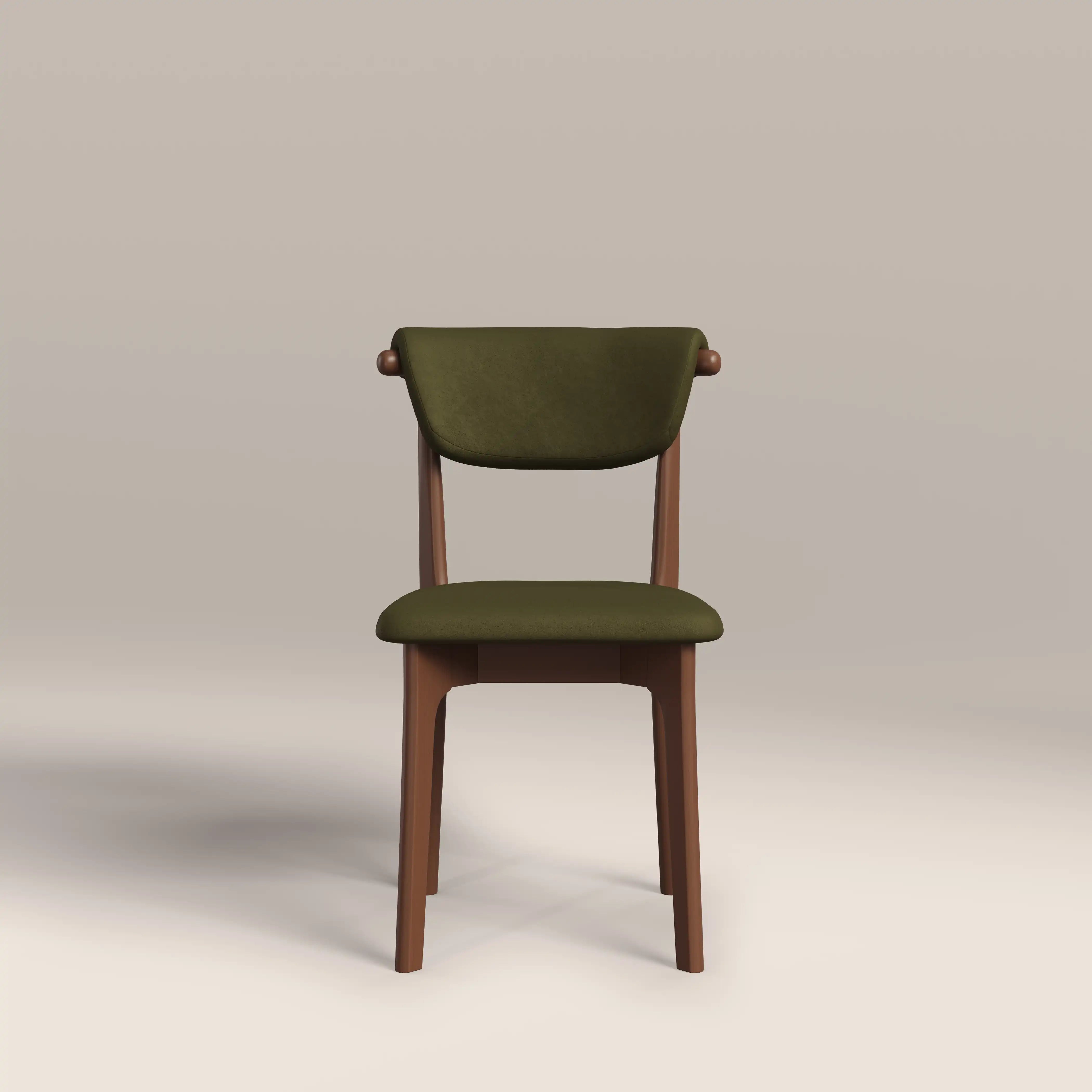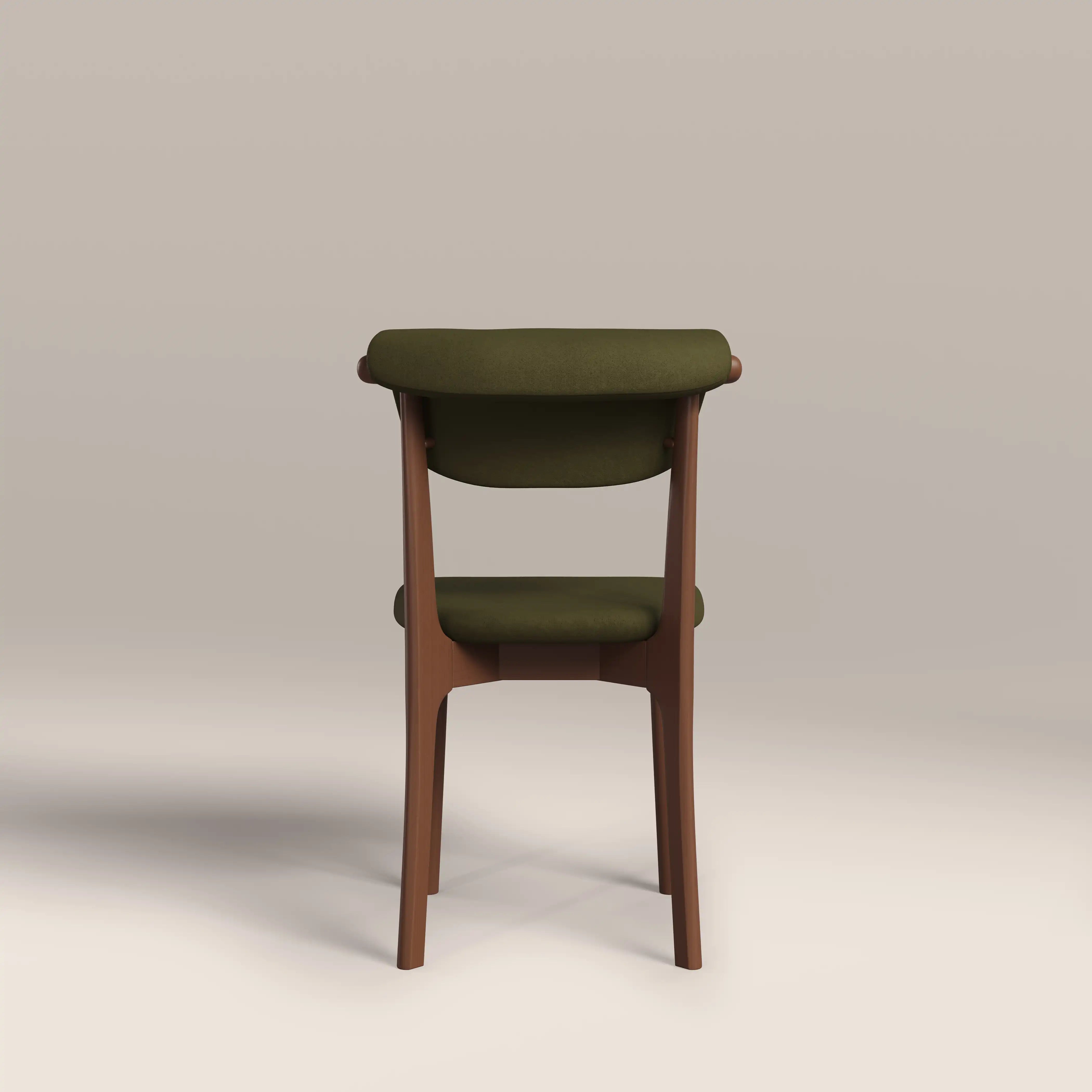 Elevate your dining space with the minimalist elegance of this Japandi-style Nobu dining chair. Blending Scandinavian simplicity with Japanese functionality, this wooden dining chair features clean lines, including upholstery that curves over the backrest and gently tapered legs. In moss green mohair-style sustainable velvet, it offers a soft yet durable surface, while the walnut-stained wood frame adds warmth and organic texture. Ideal for modern, minimalist, or serene interiors.