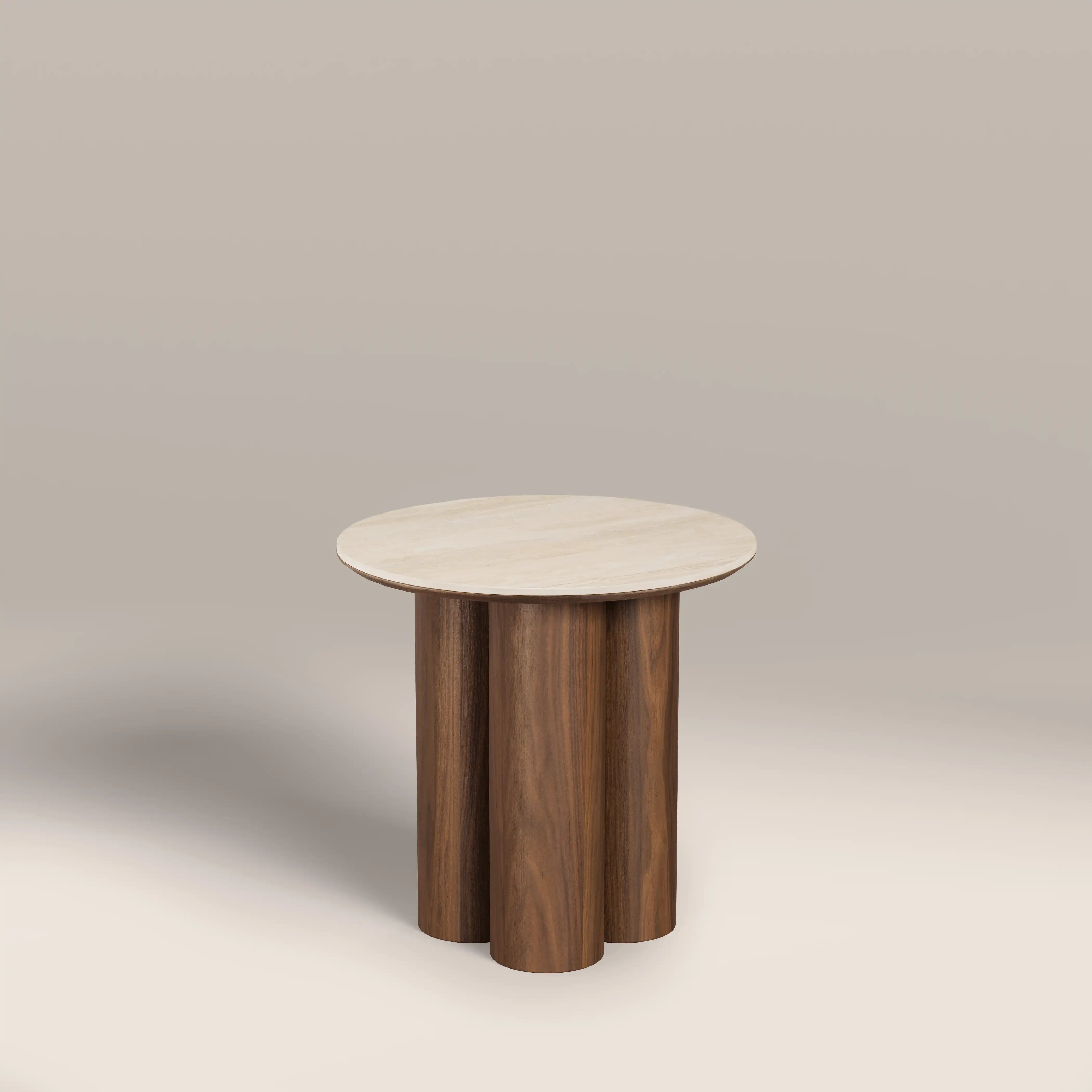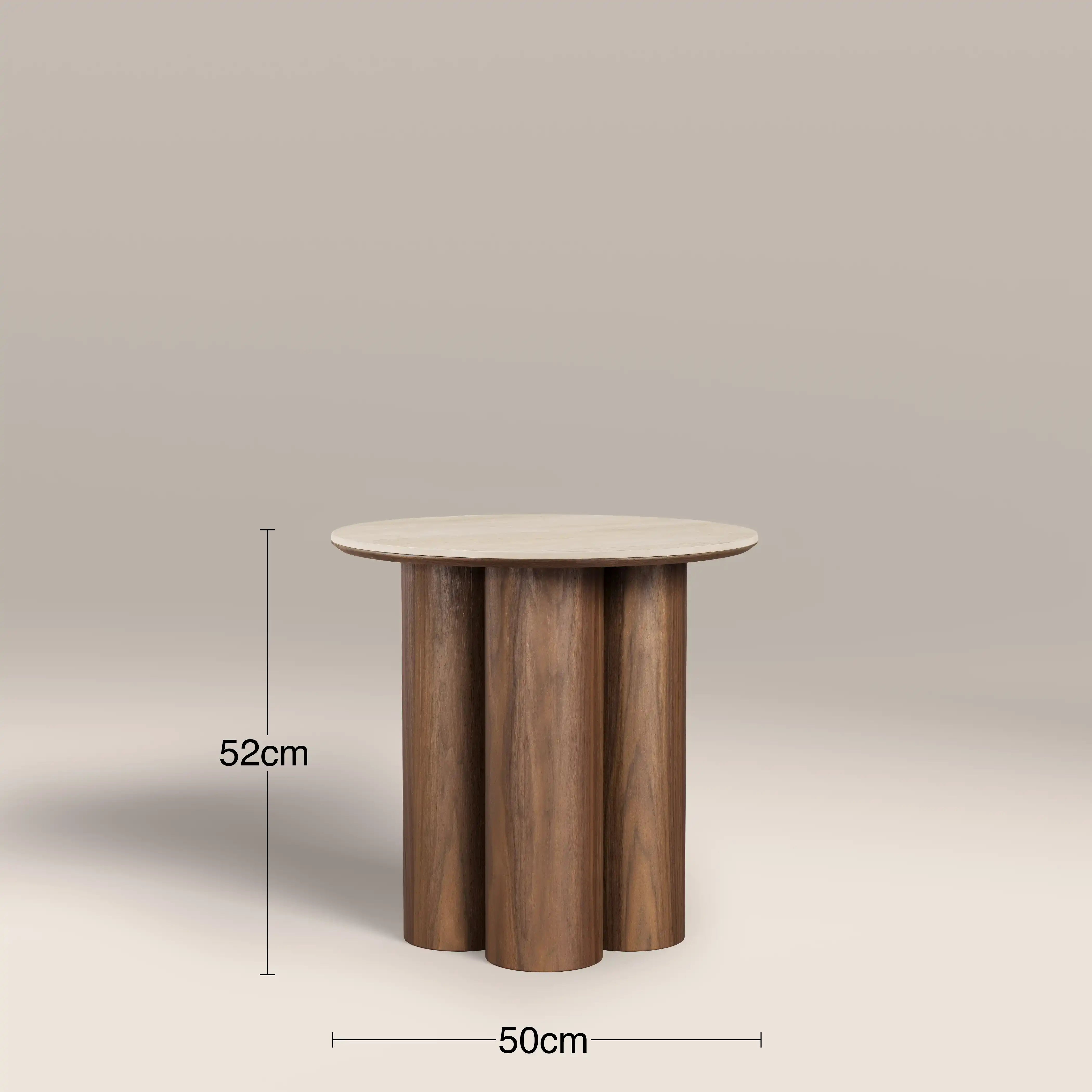 For a refined and irresistible sintered stone side table, the Noelle uses sculptural elements and smooth curves made to capture your attention. The multi-pillared base offers a durable and functional piece, whilst adopting the organic curves of luxe revival design. With a smooth sintered stone top in a natural tone, the Noelle Round Side Table has a stained walnut veneer base, highlighting the natural grains for a refined and sumptuous piece.