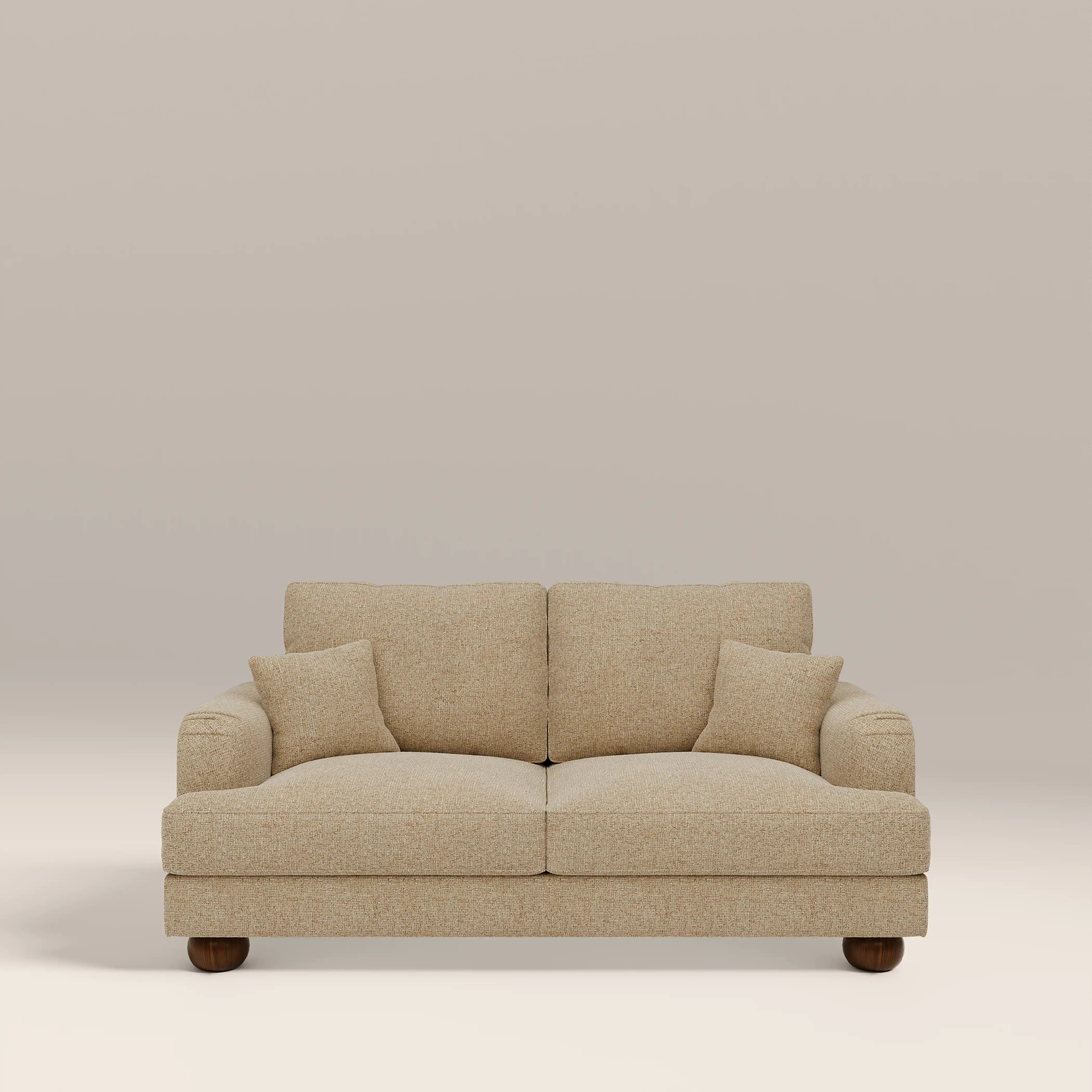 Designed for the style-savvy, the Nola 2 Seater Sofa marries contemporary form with classic influence. Upholstered in soft and tactile boucle, this modern latte light brown sofa features curved soft lines, deep seat cushions, and a warm, refined silhouette. Its timeless appeal and elevated comfort make it a standout piece for interiors that value both aesthetics and sustainability. A 2-seat boucle sofa that speaks to modern living with enduring style.
