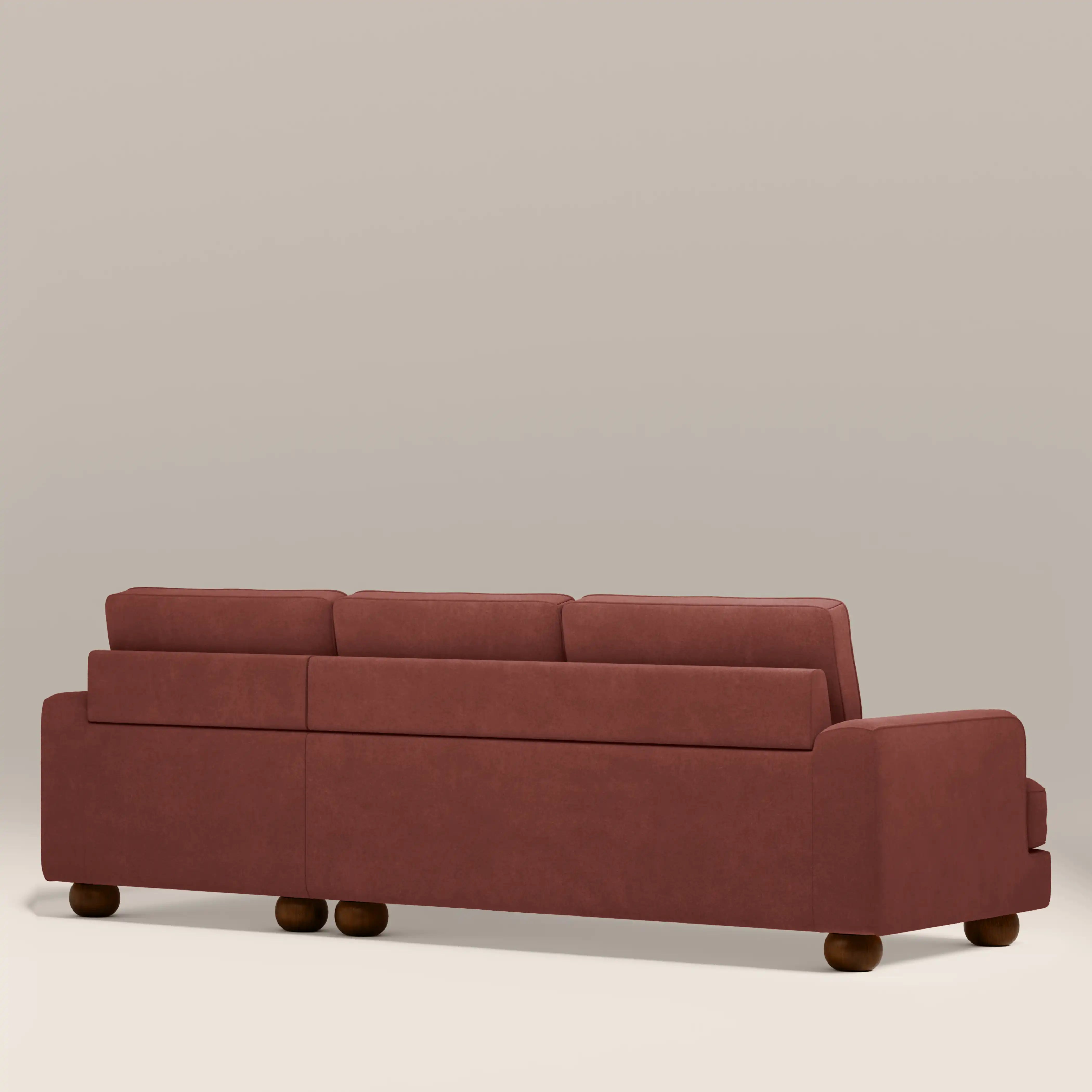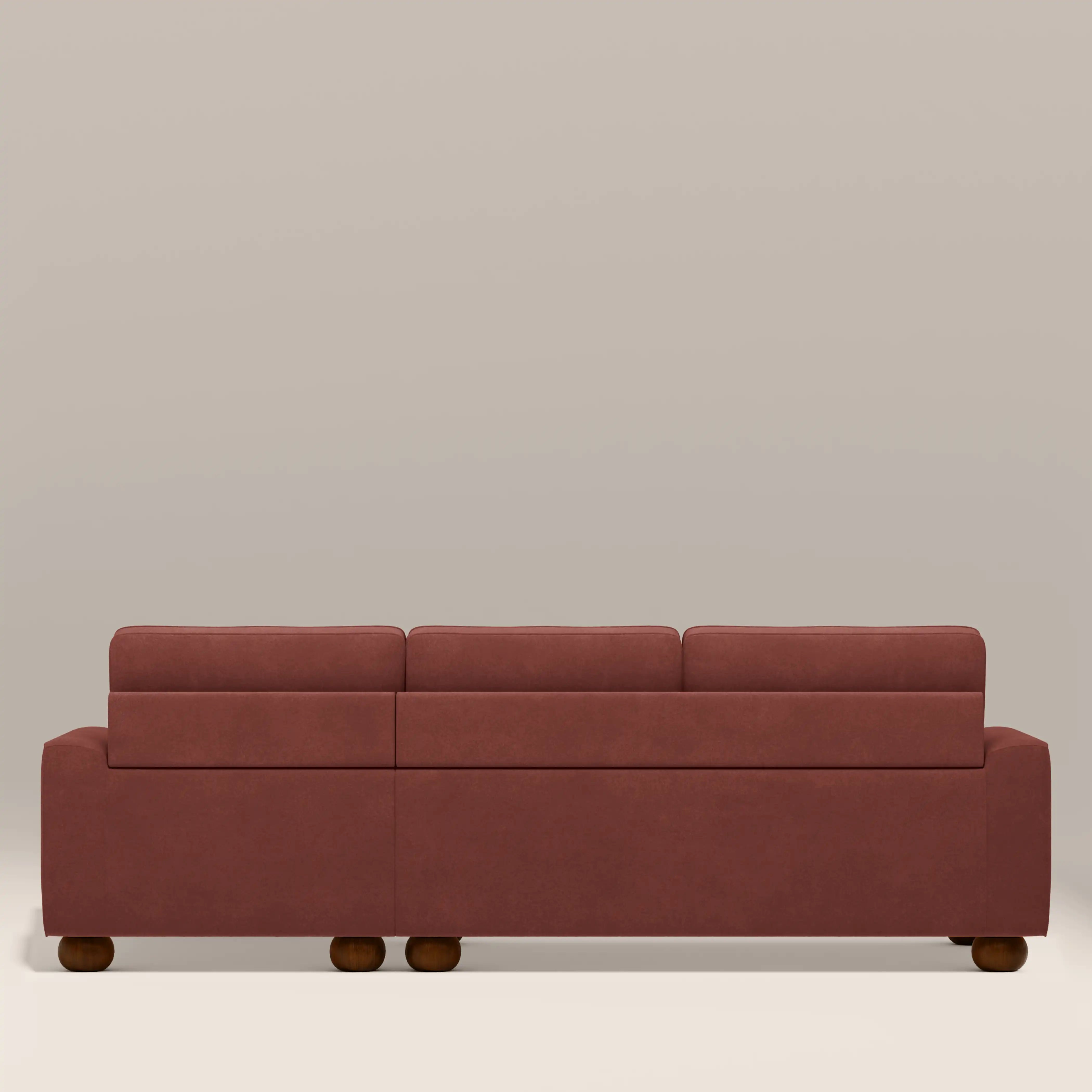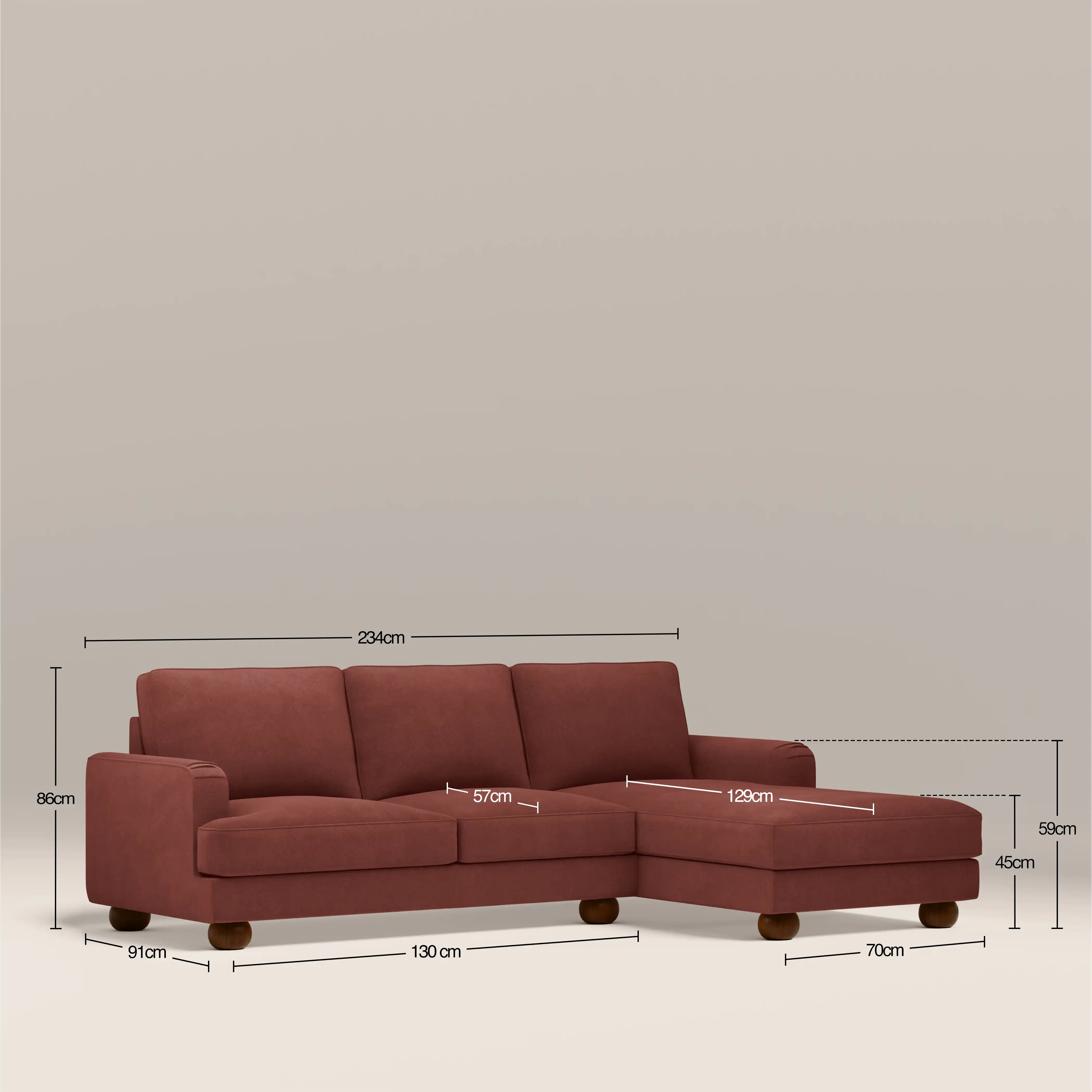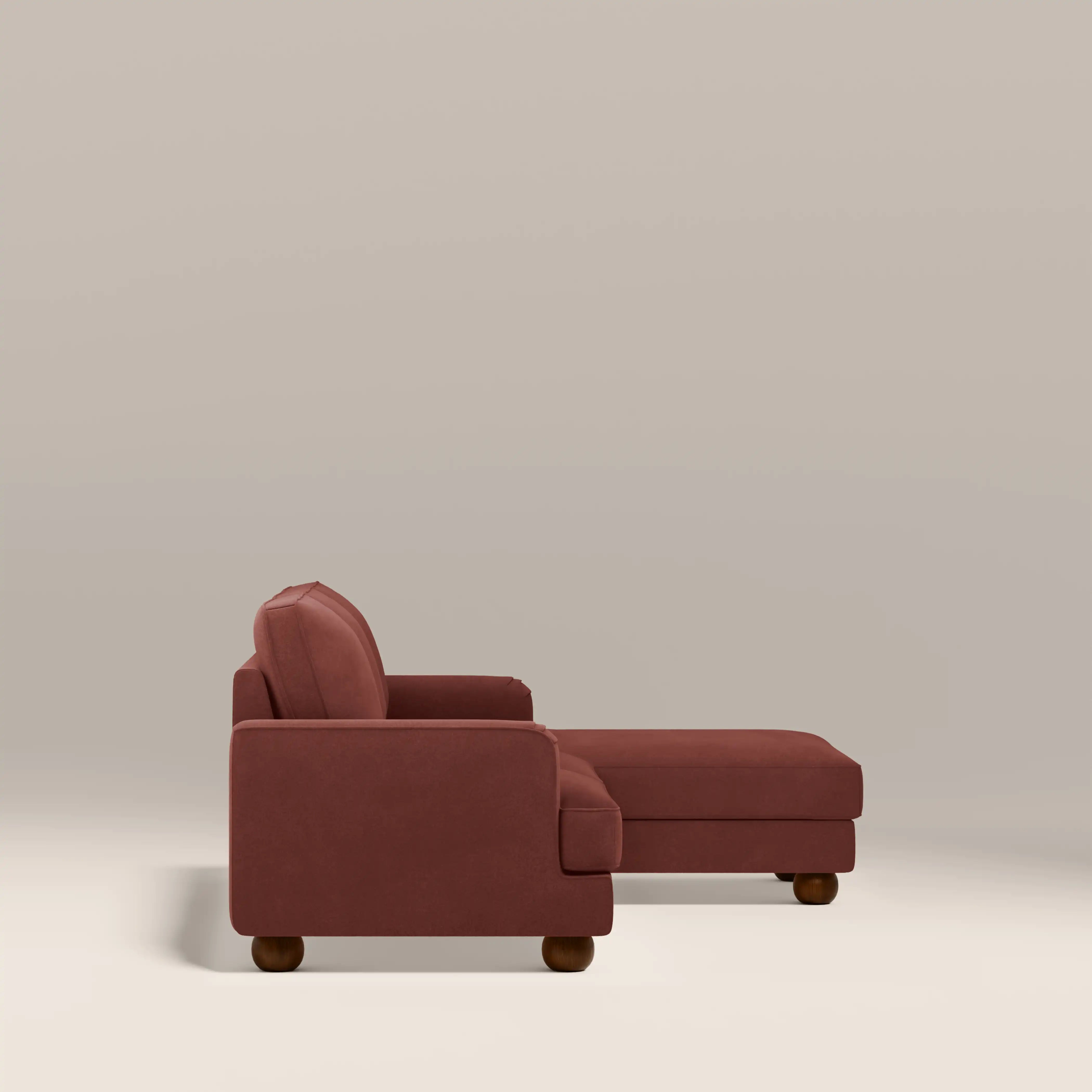 Designed for the style-savvy, the Nola Right Hand Chaise Sofa marries contemporary form with classic influence. Upholstered in sustainable velvet, this modern chaise sofa in rust red features curved soft lines, deep seat cushions, and a warm, refined silhouette. Its timeless appeal and elevated comfort make it a standout piece for interiors that value both aesthetics and sustainability. A velvet sofa that speaks to modern living with enduring style.