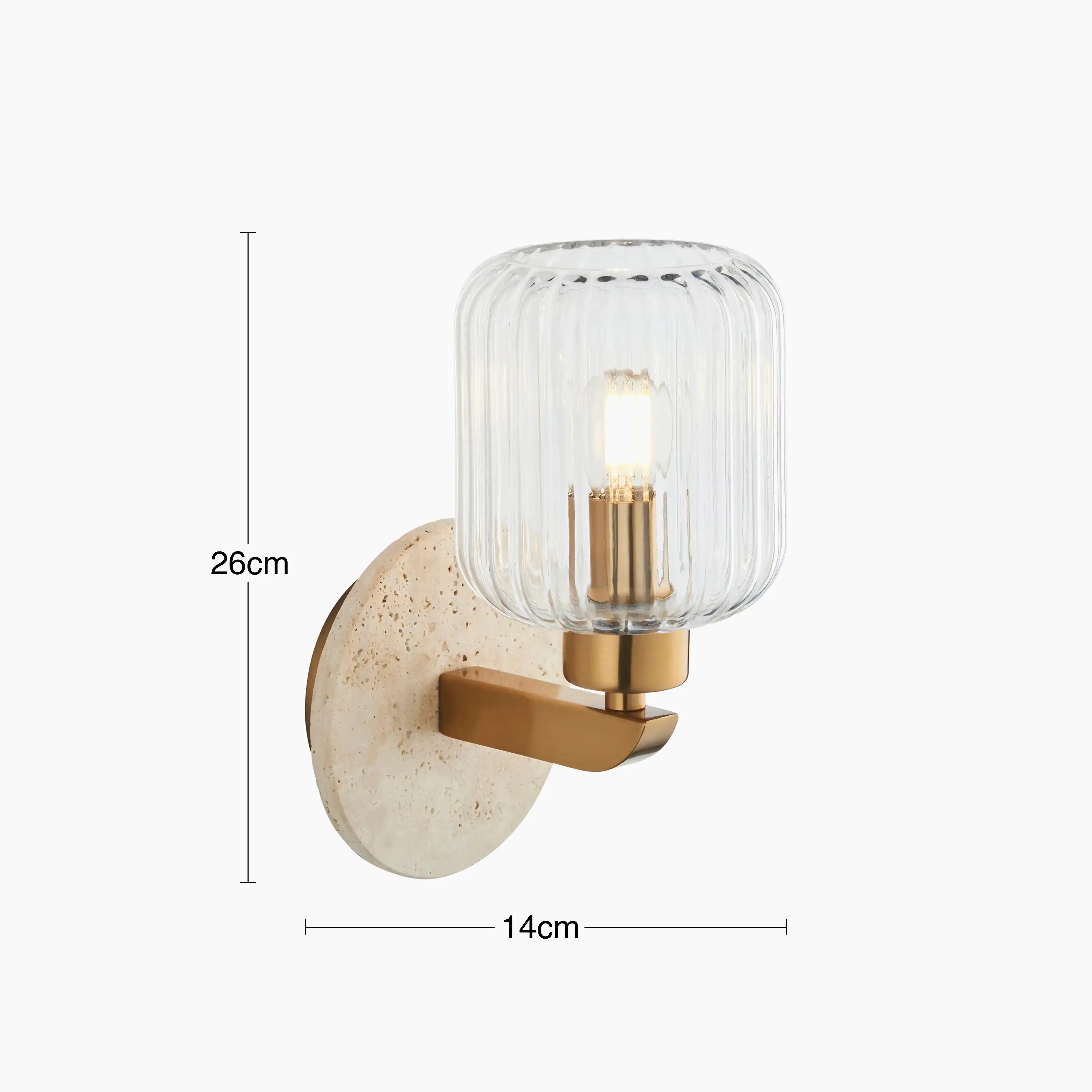 The Nolan Wall Light effortlessly blends organic texture for an instant interior facelift. A natural travertine stone backplate meets a warm brass arm, showcasing a ribbed glass shade. Casting a gentle, dimmable glow, making it perfect for dining rooms, bedrooms, or contemporary living spaces. Understated yet striking, it balances sleek refinement with tactile warmth, creating a sculptural, luminous centrepiece.