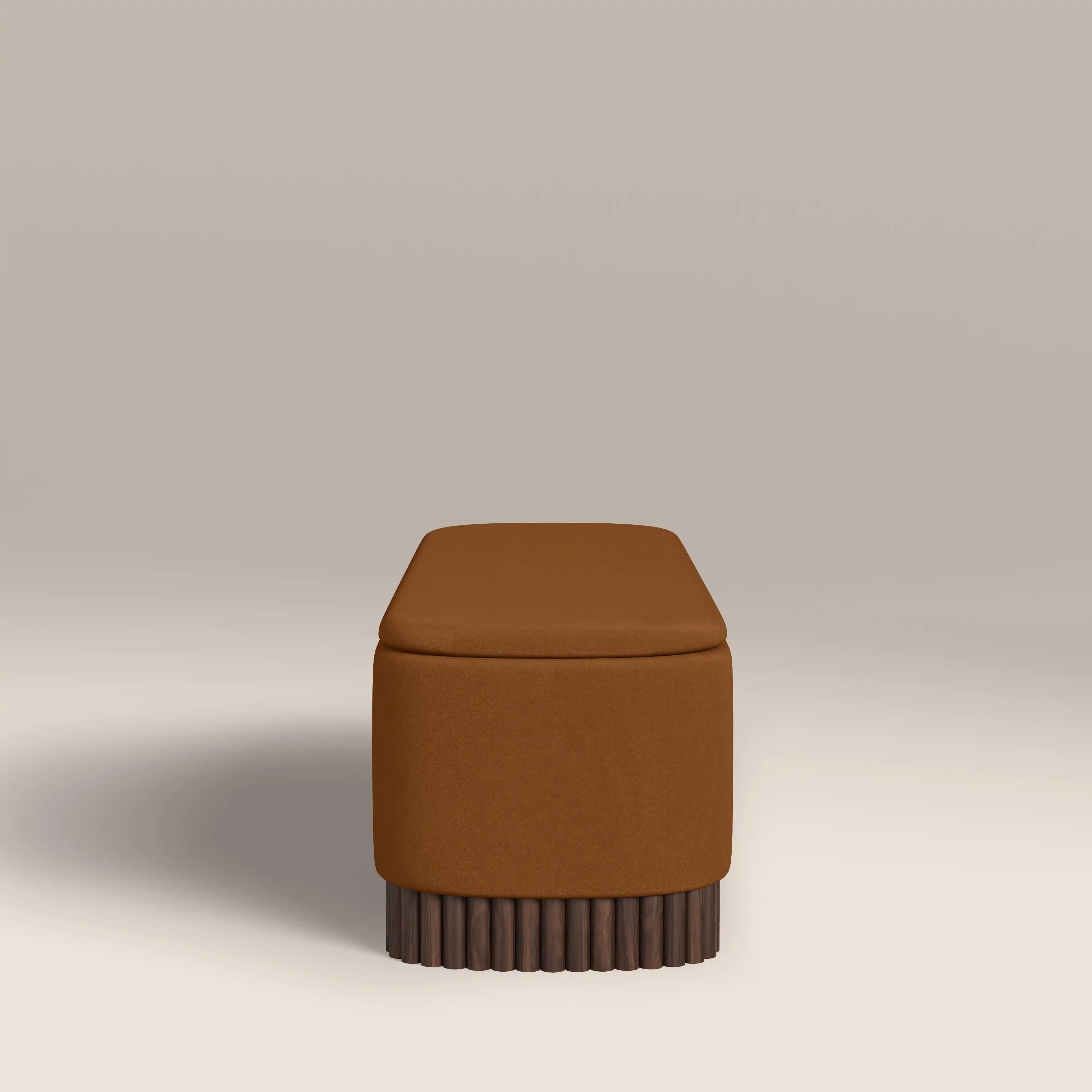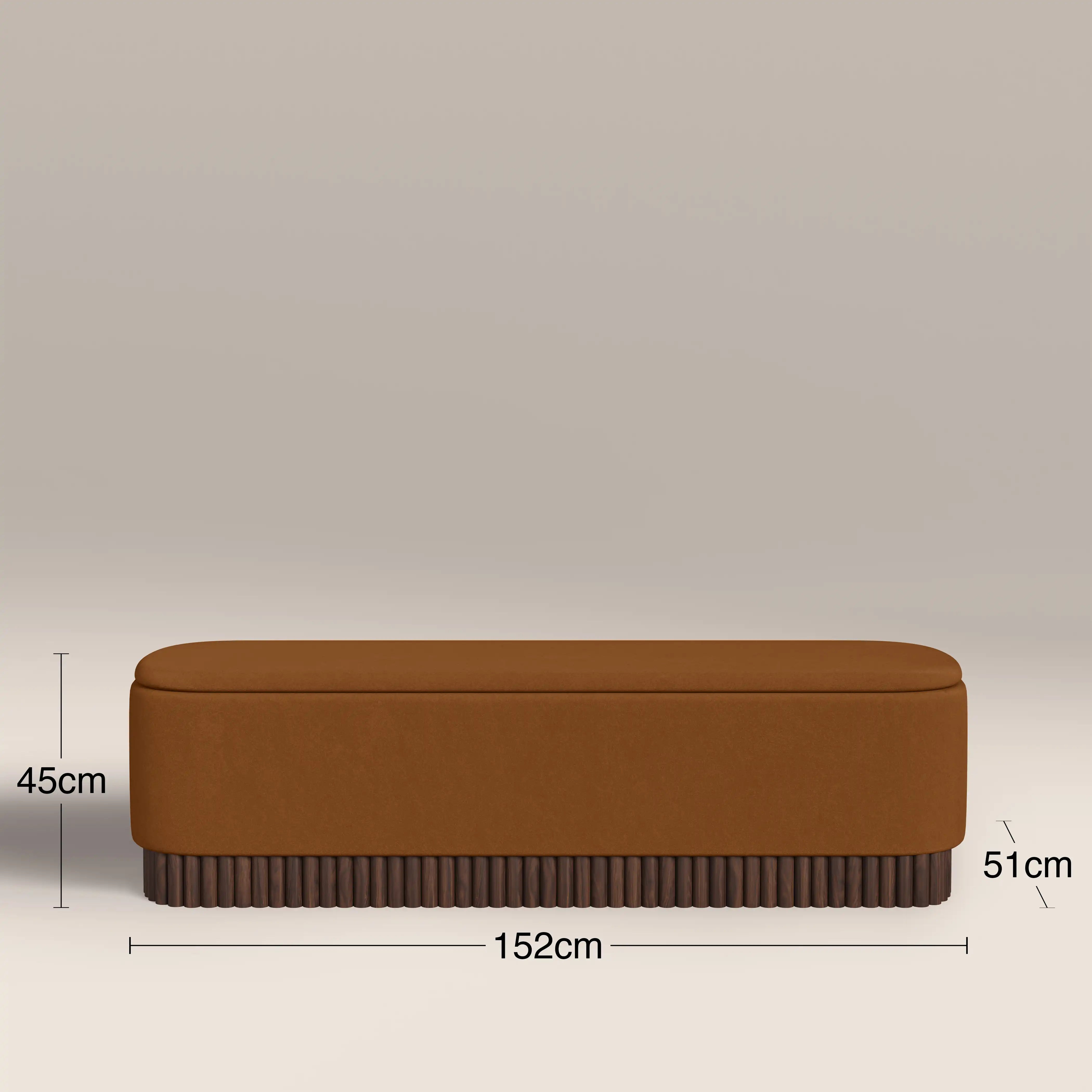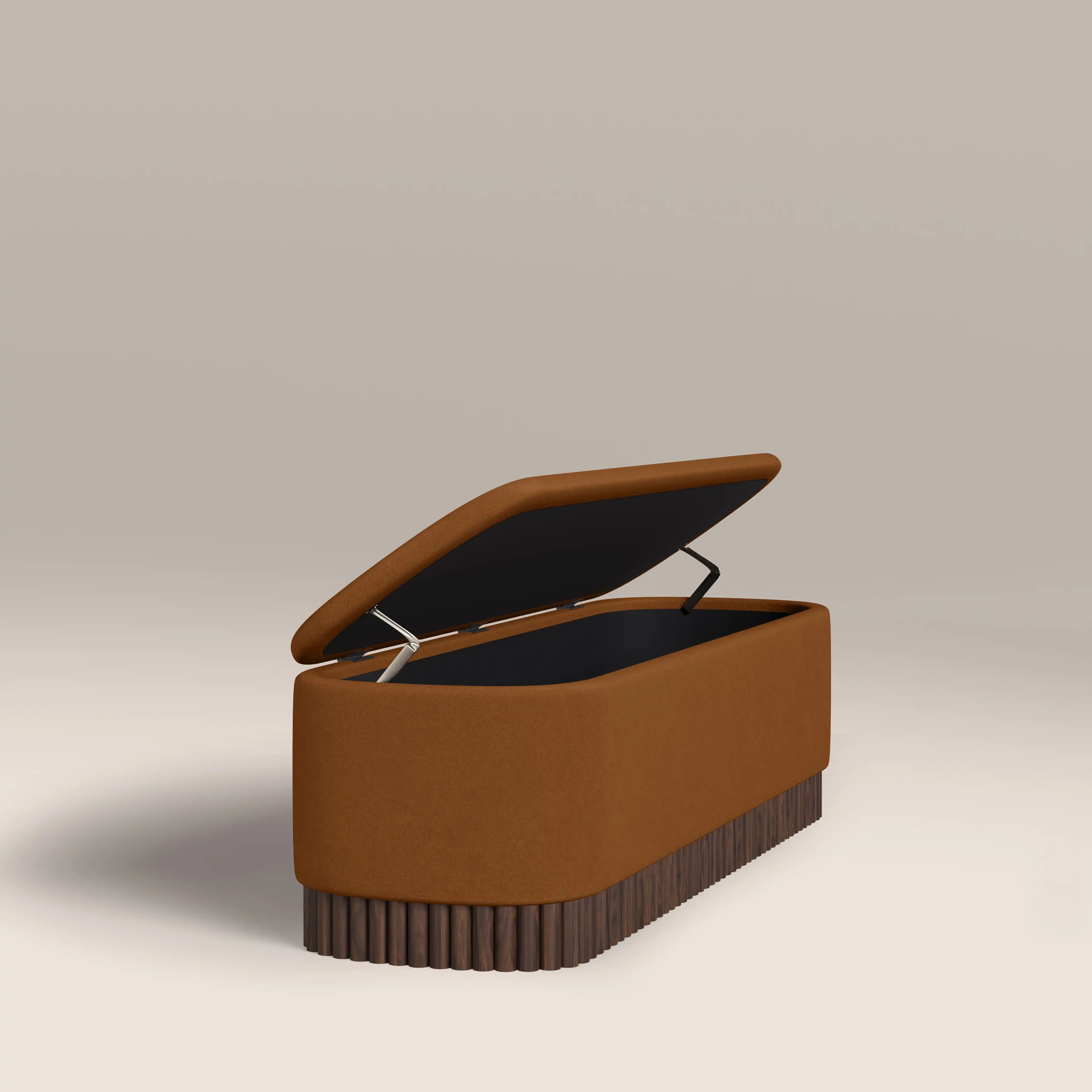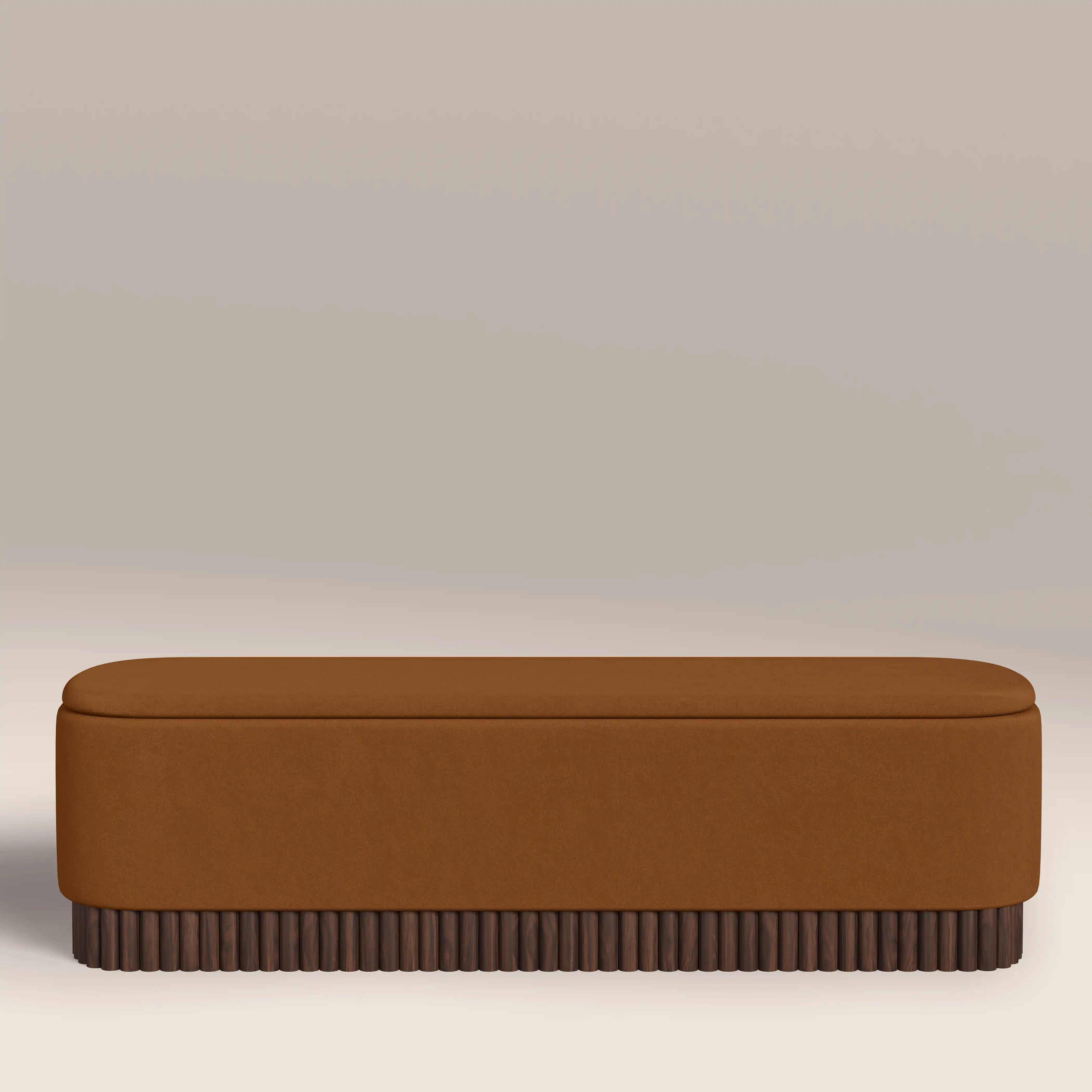 The Oberon Ottoman uses the warmth of caramel brown and walnut for a retro accent to your bedroom, hallway, or living space. Wrapped in a soft sustainable mohair velvet in our signature caramel brown that complements the walnut-stained wood base. Its soft shape is ideal for giving the illusion of more space, and highlights the ribbed detailing on the base beautifully. With handy storage compartment, it's more than just an attractive piece of furniture.