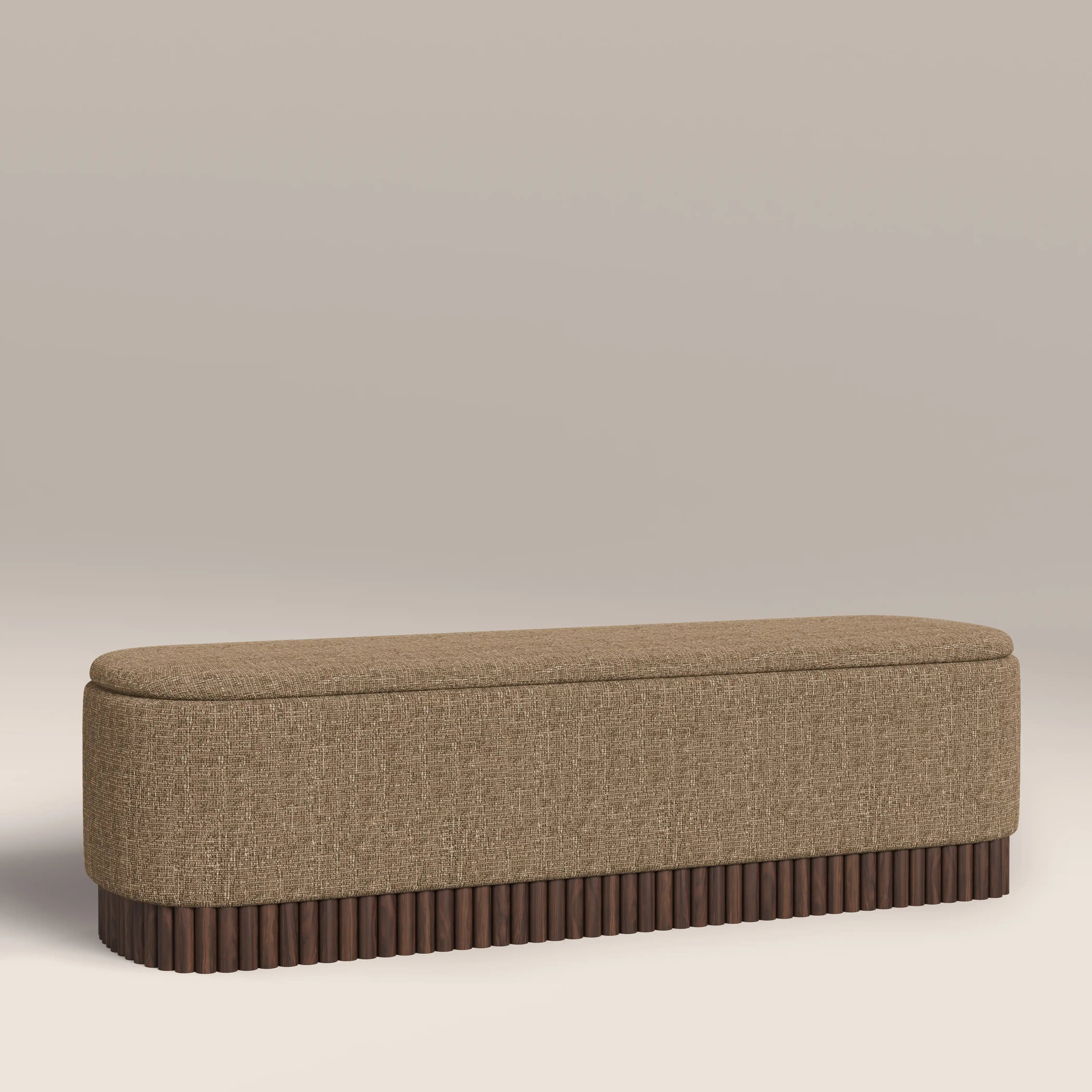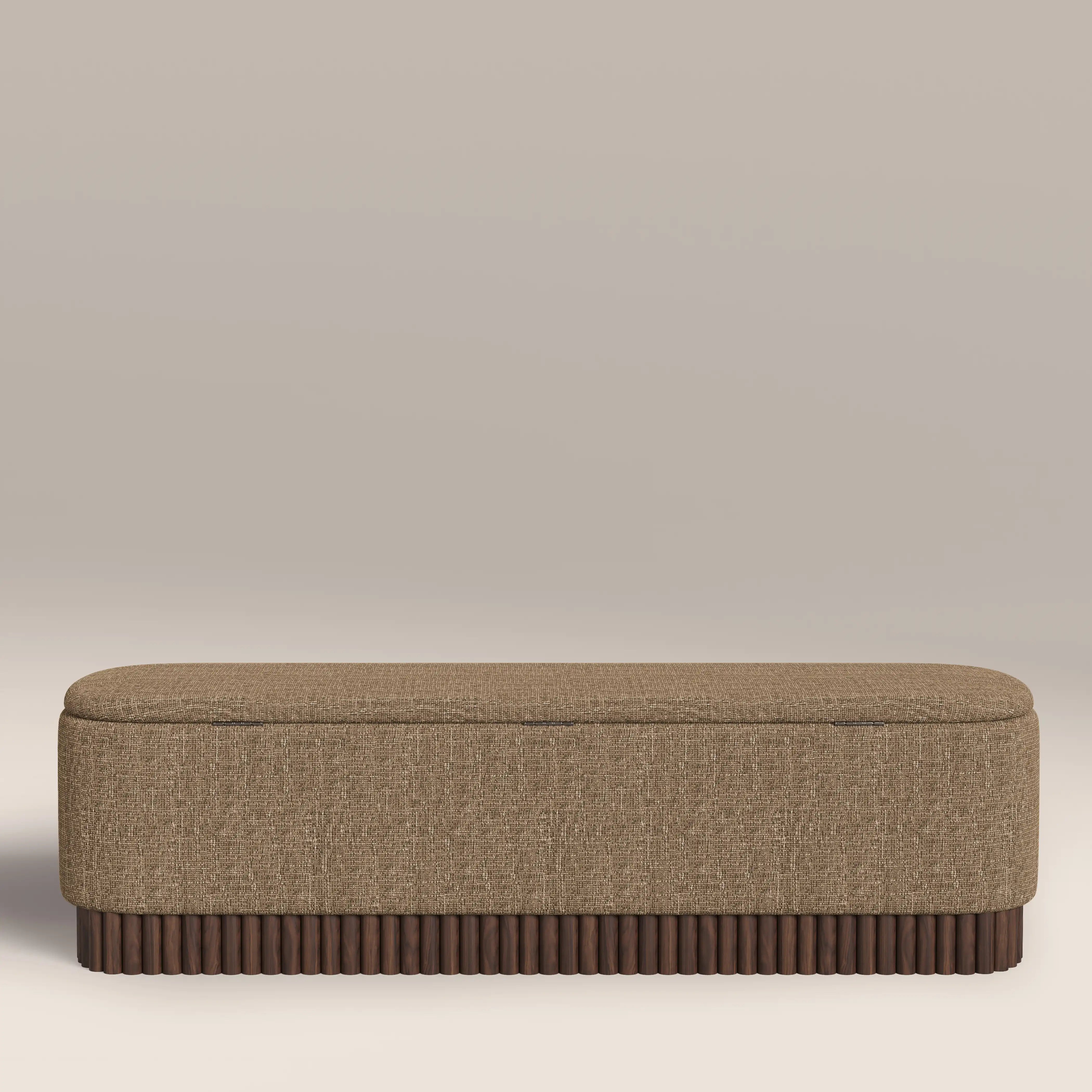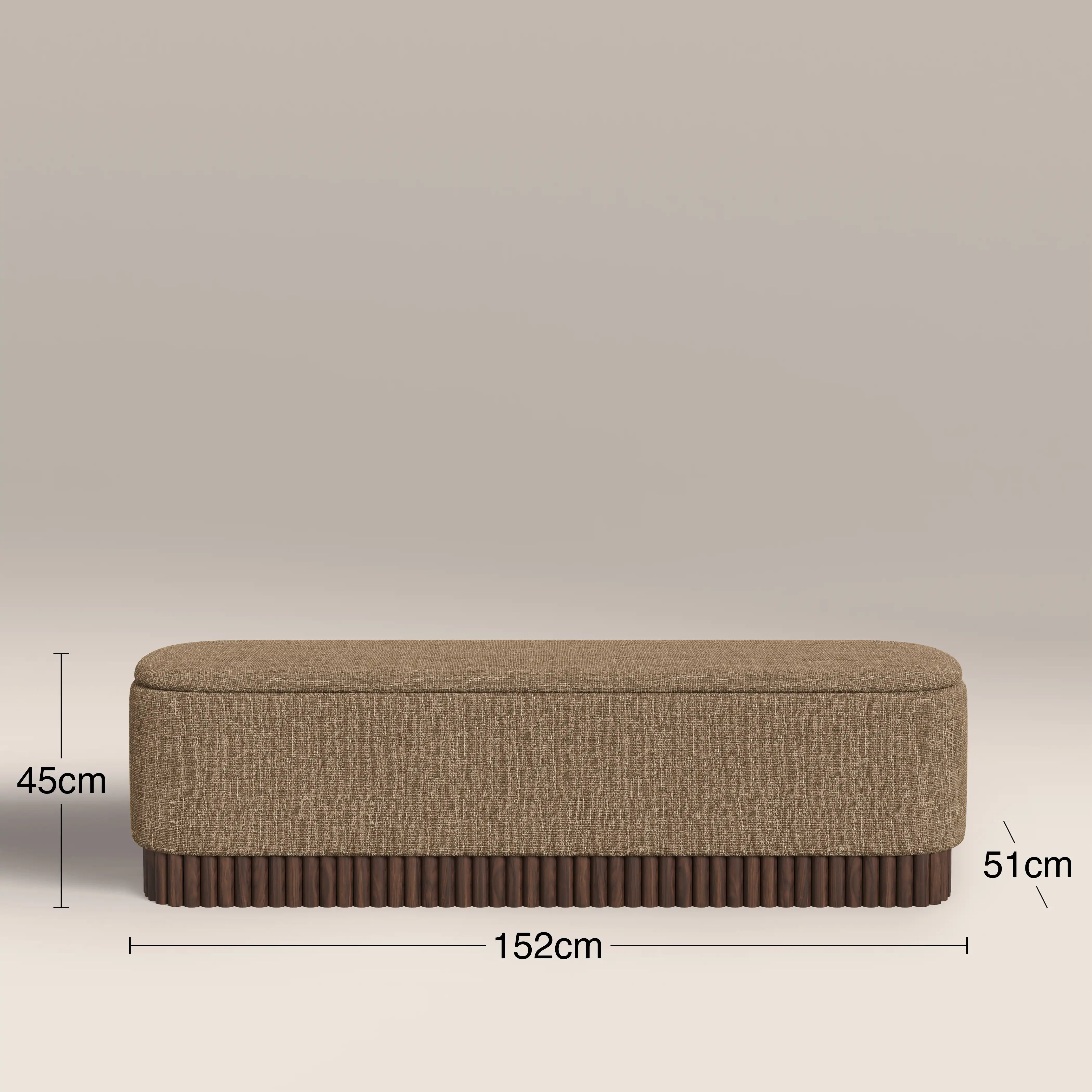 The Oberon Boucle Ottoman uses contrasting textures and a warm, inviting colour palette for a retro accent to your bedroom, hallway, or living space. Wrapped in a soft sustainable boucle in our signature speckled cappuccino, the subtle mix of browns complements the walnut-stained wood base. Its soft shape is ideal for giving the illusion of more space, and highlights the ribbed detailing on the base beautifully. With handy storage compartment, it's more than just an attractive piece of furniture.