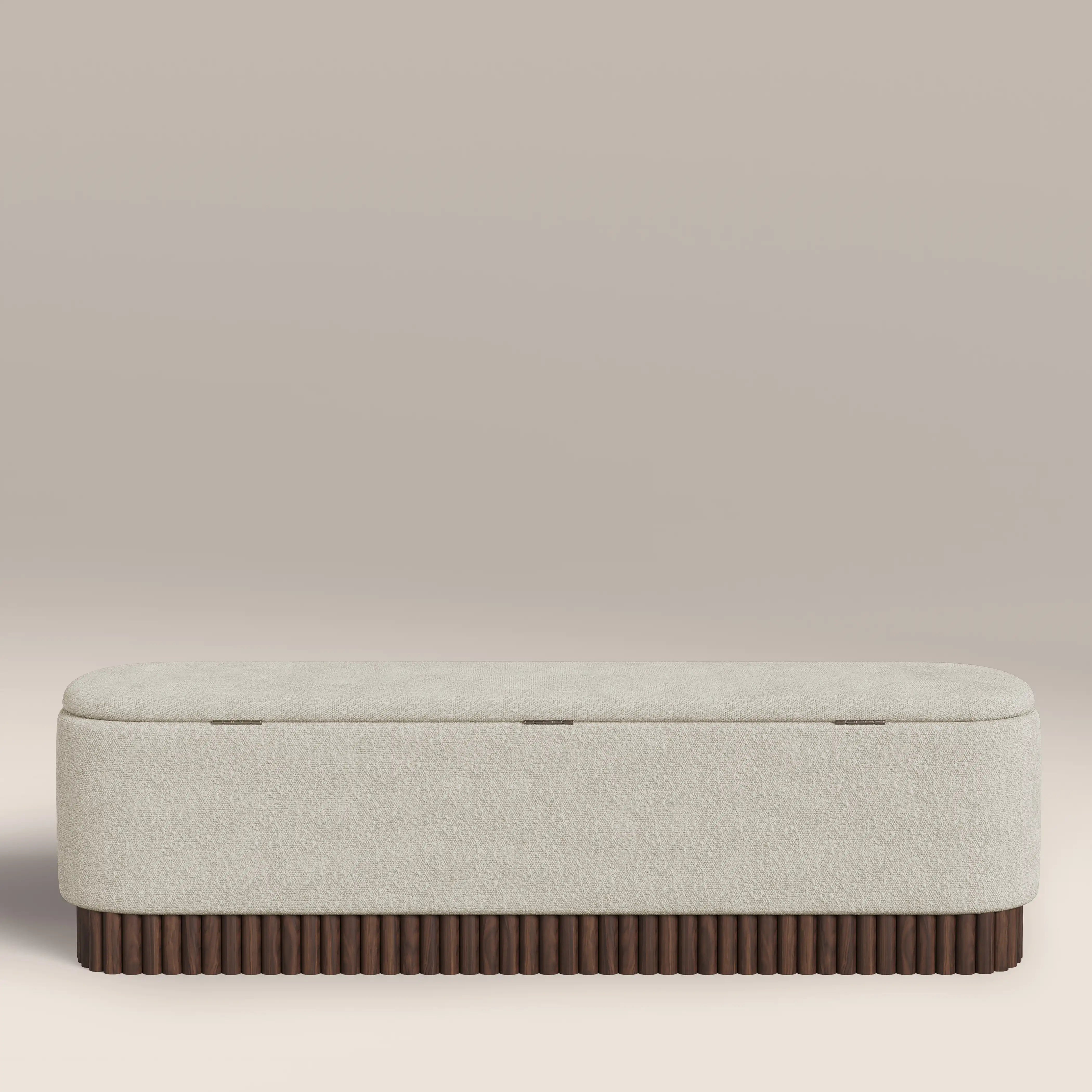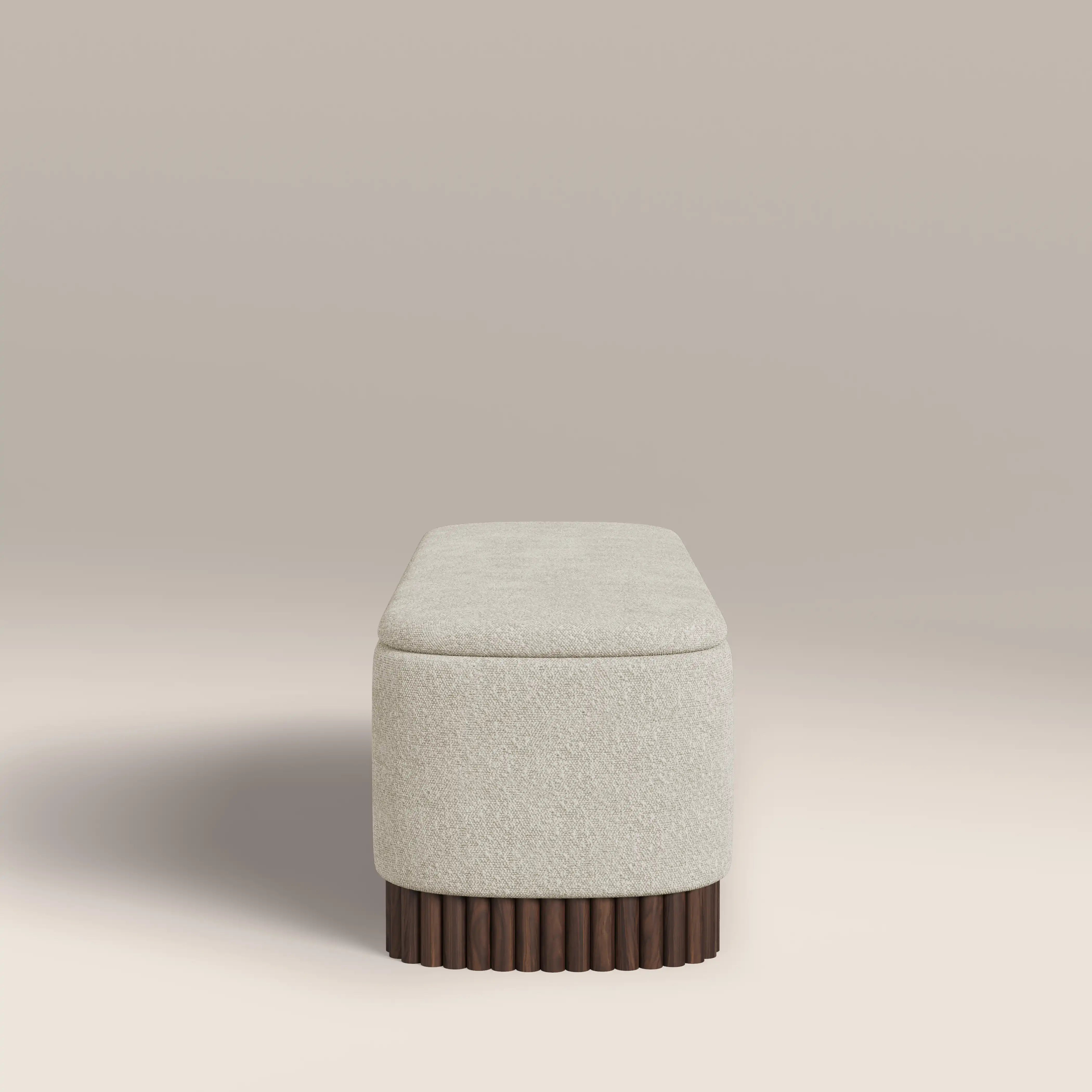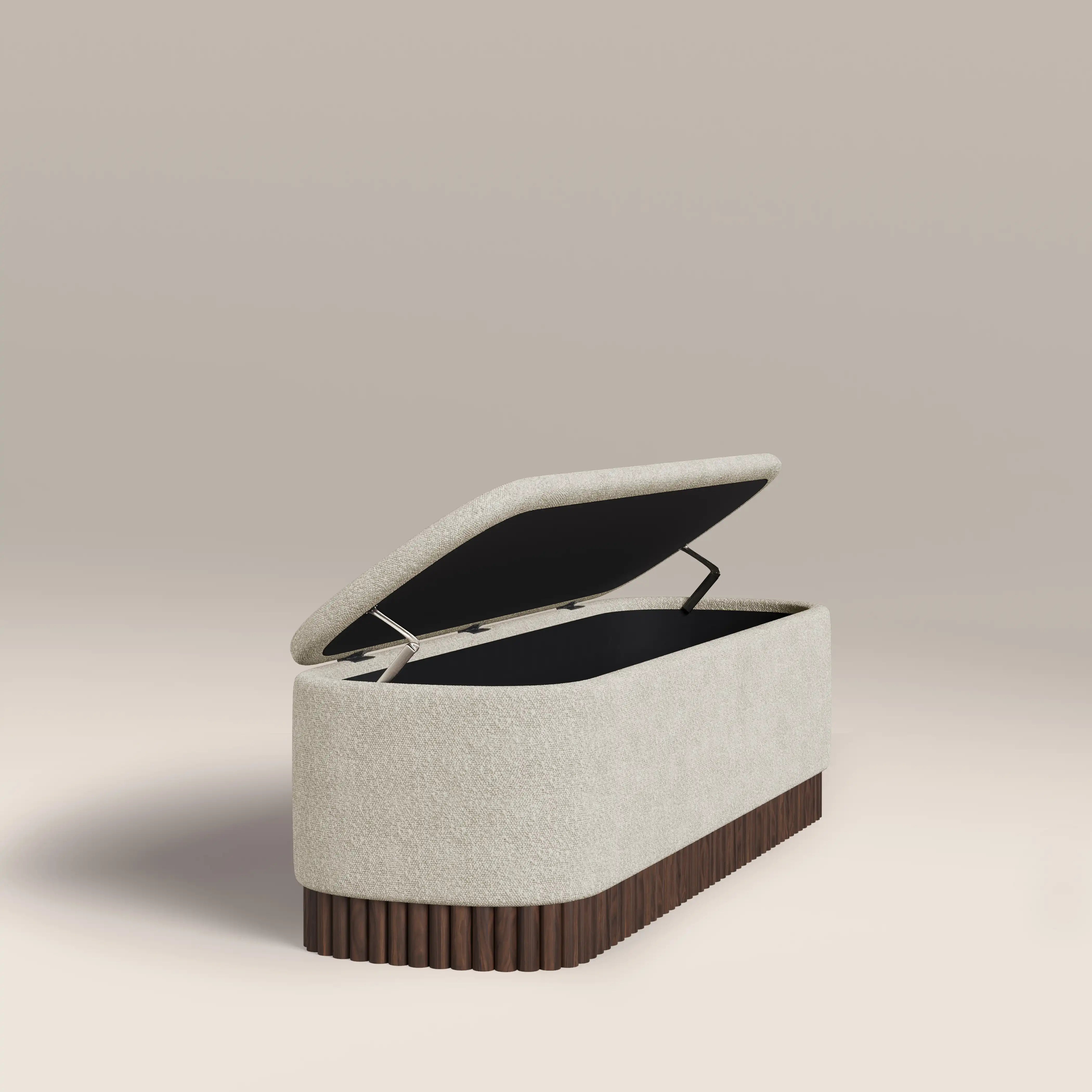 The Oberon Boucle Ottoman uses contrasting textures and a neutral colour palette for a minimalist Scandic accent to your bedroom, hallway, or living space. Wrapped in a soft sustainable boucle in our signature speckled stone, the subtle mix of cream and grey complements the walnut-stained wood base. Its soft shape is ideal for giving the illusion of more space, and highlights the ribbed detailing on the base beautifully. With handy storage compartment, it's more than just an attractive piece of furniture.