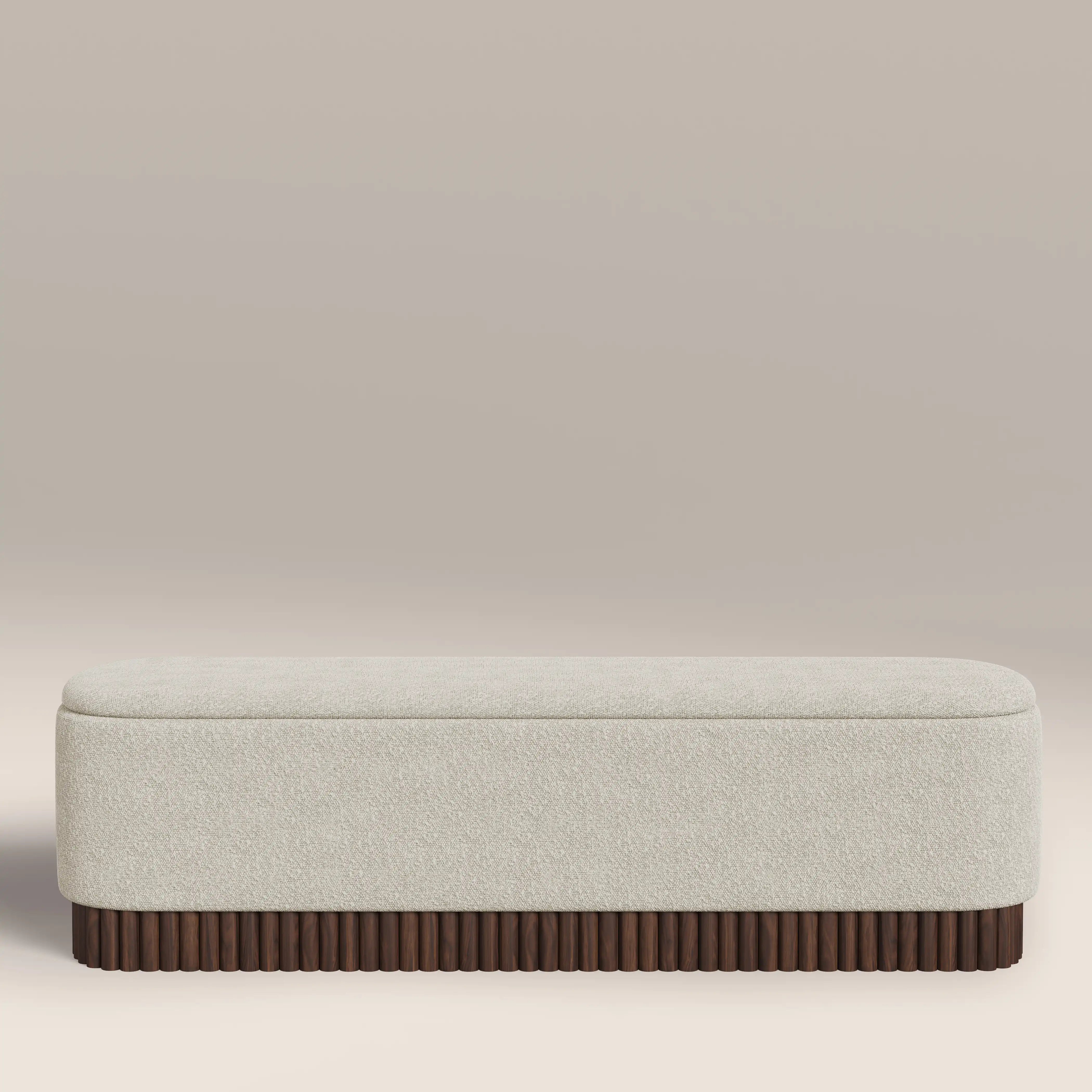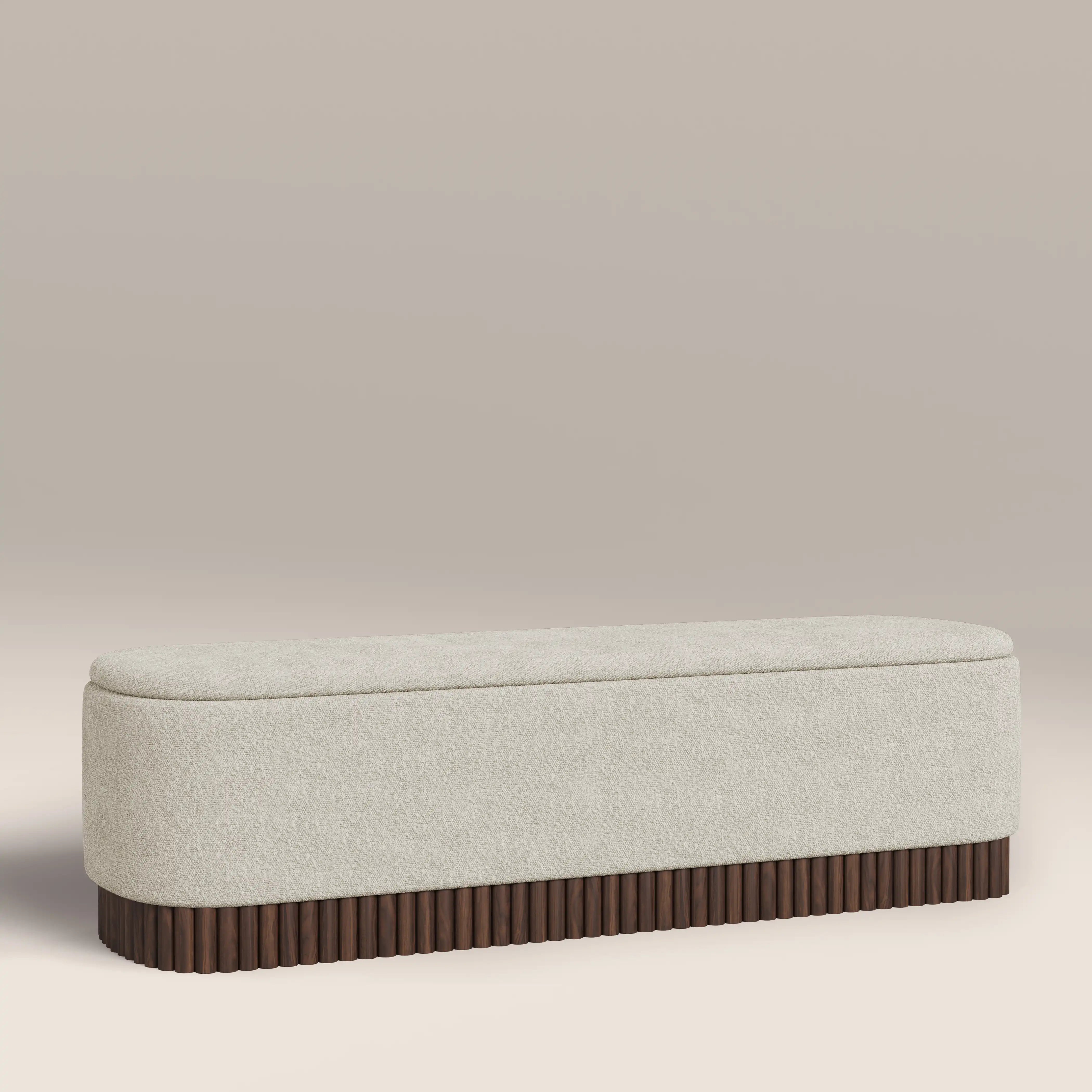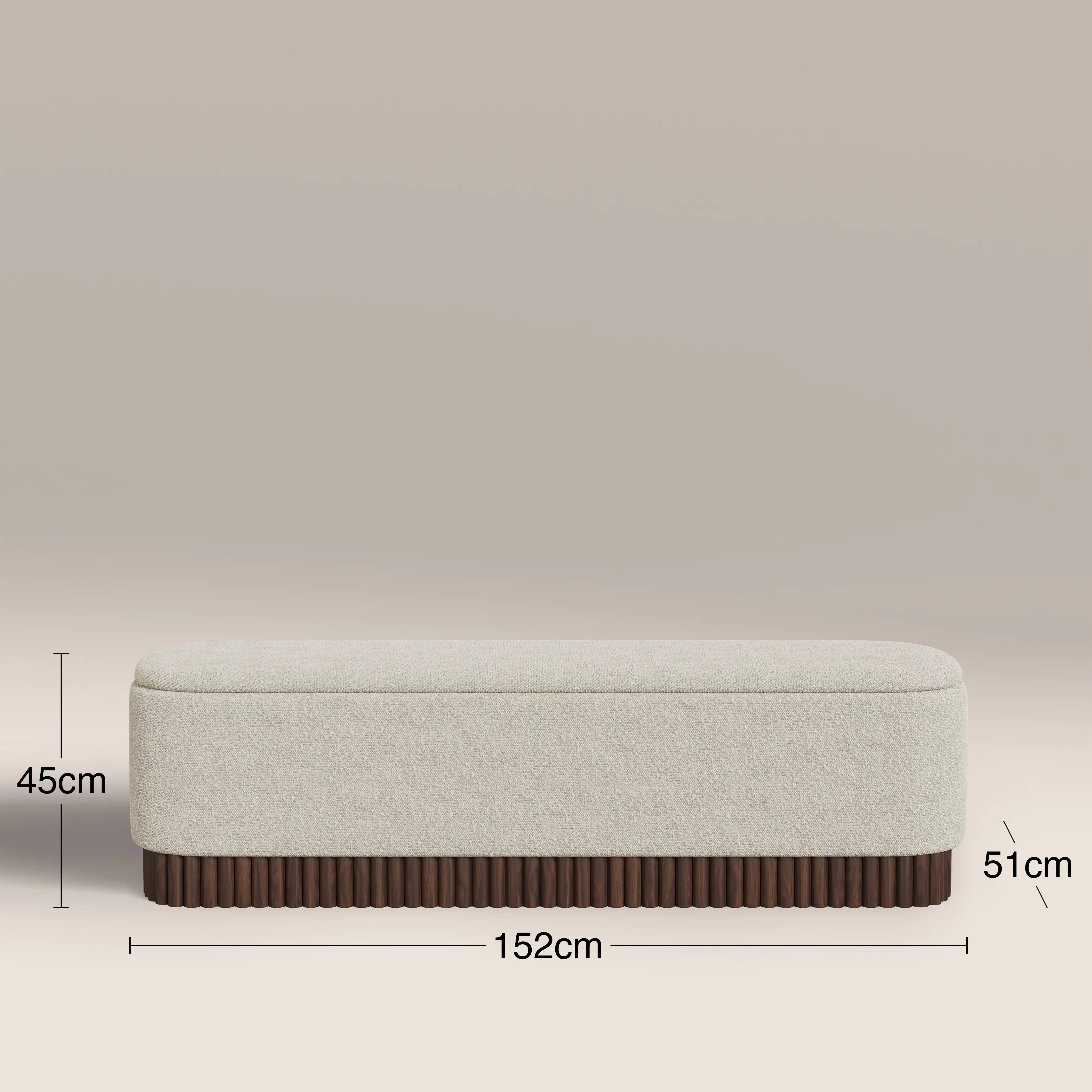 The Oberon Boucle Ottoman uses contrasting textures and a neutral colour palette for a minimalist Scandic accent to your bedroom, hallway, or living space. Wrapped in a soft sustainable boucle in our signature speckled stone, the subtle mix of cream and grey complements the walnut-stained wood base. Its soft shape is ideal for giving the illusion of more space, and highlights the ribbed detailing on the base beautifully. With handy storage compartment, it's more than just an attractive piece of furniture.
