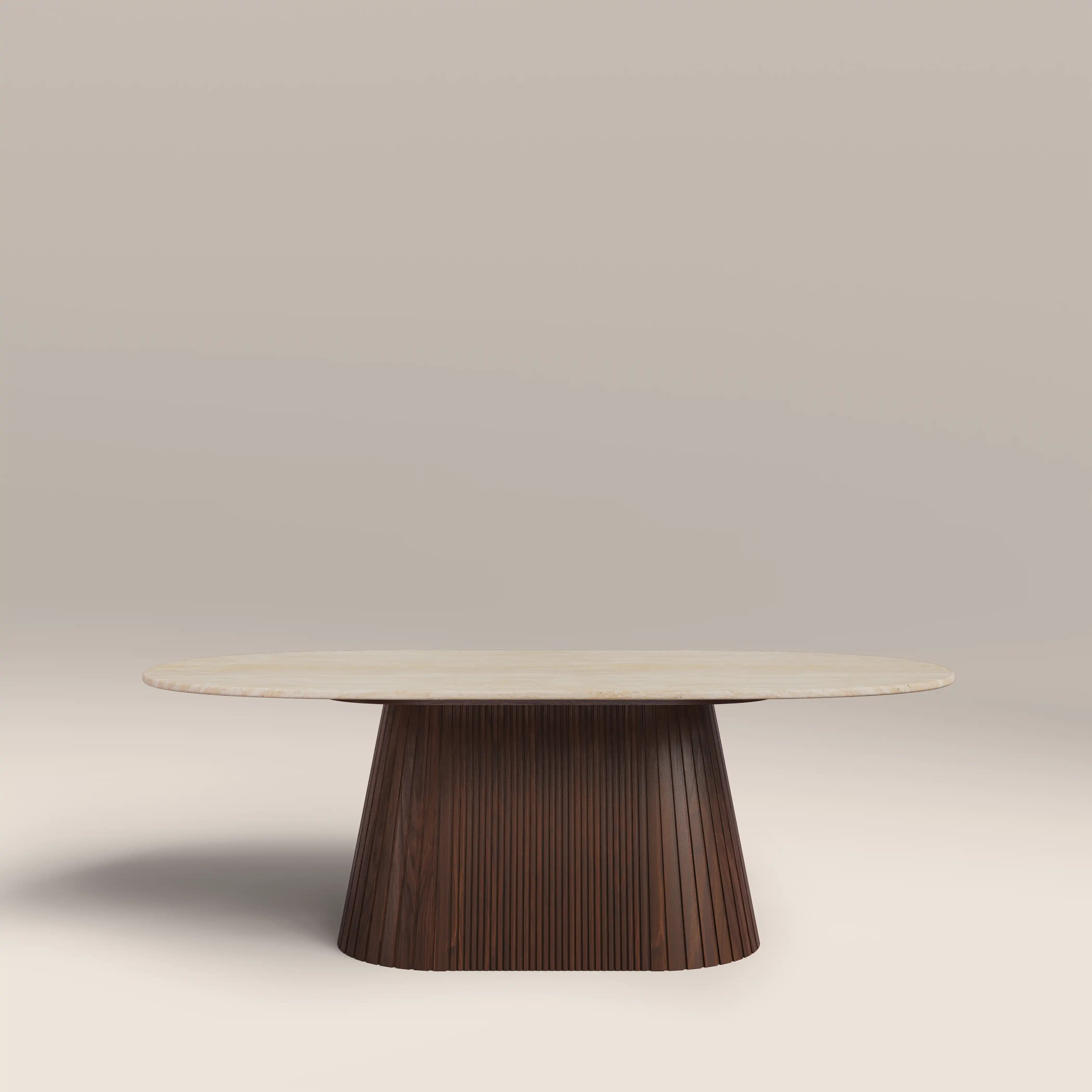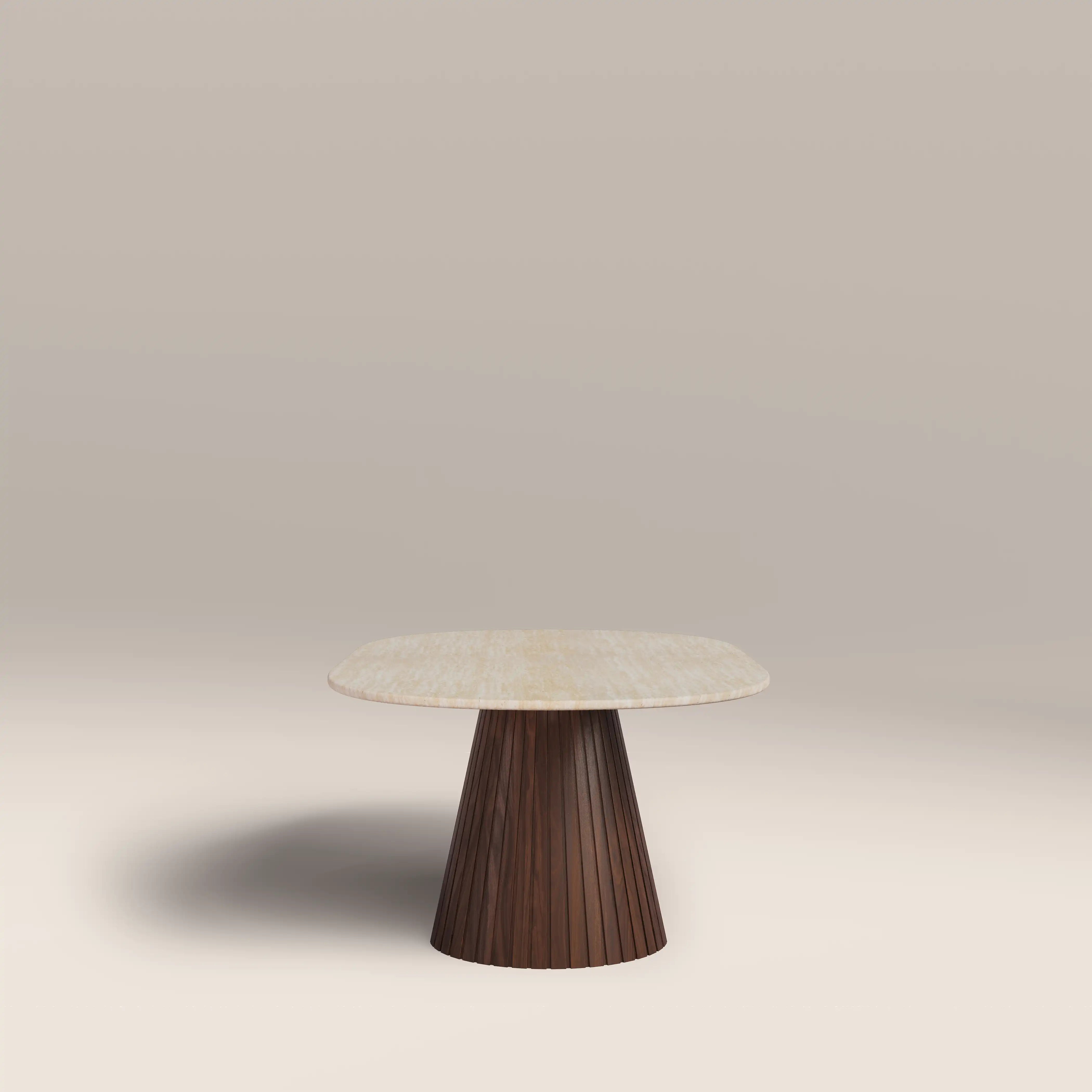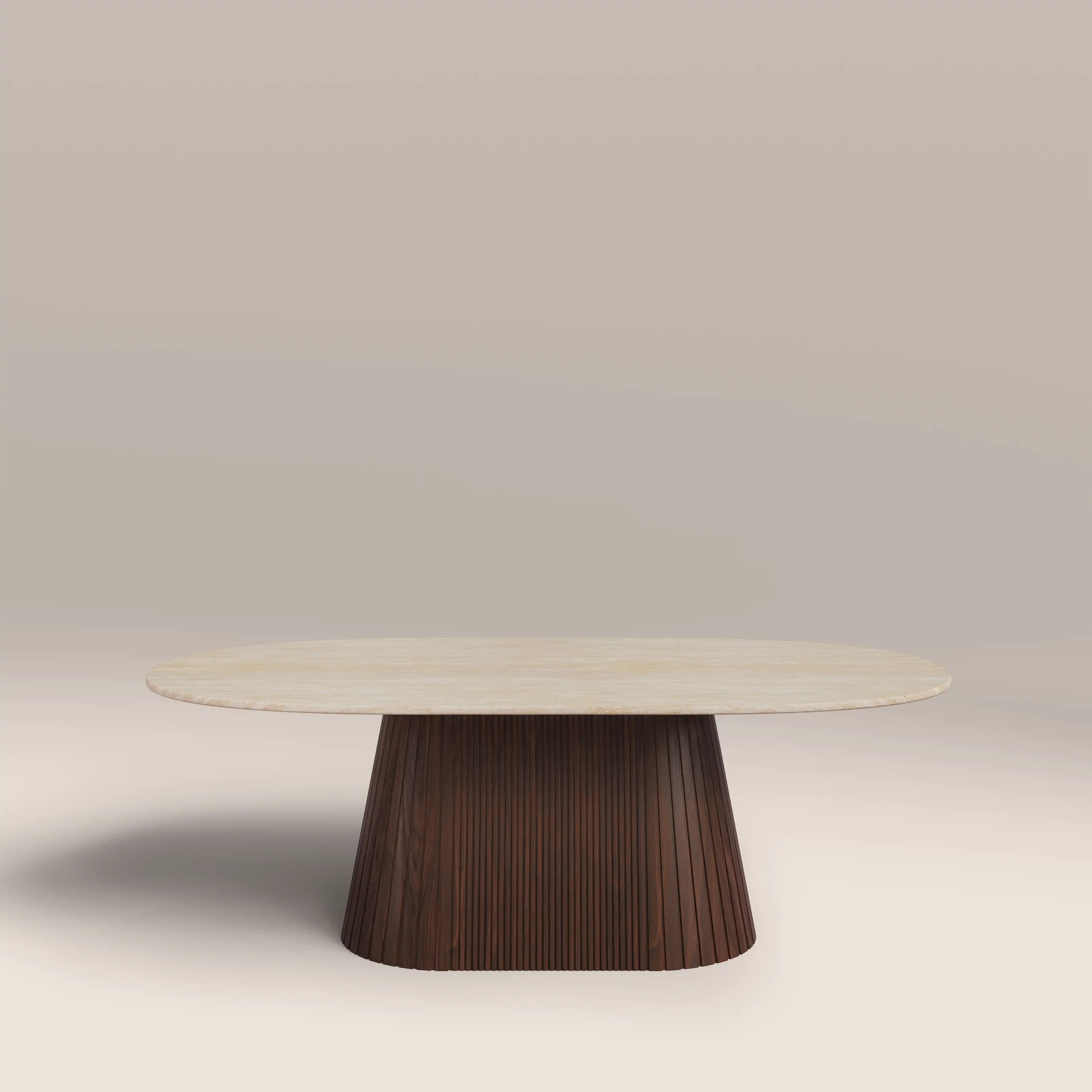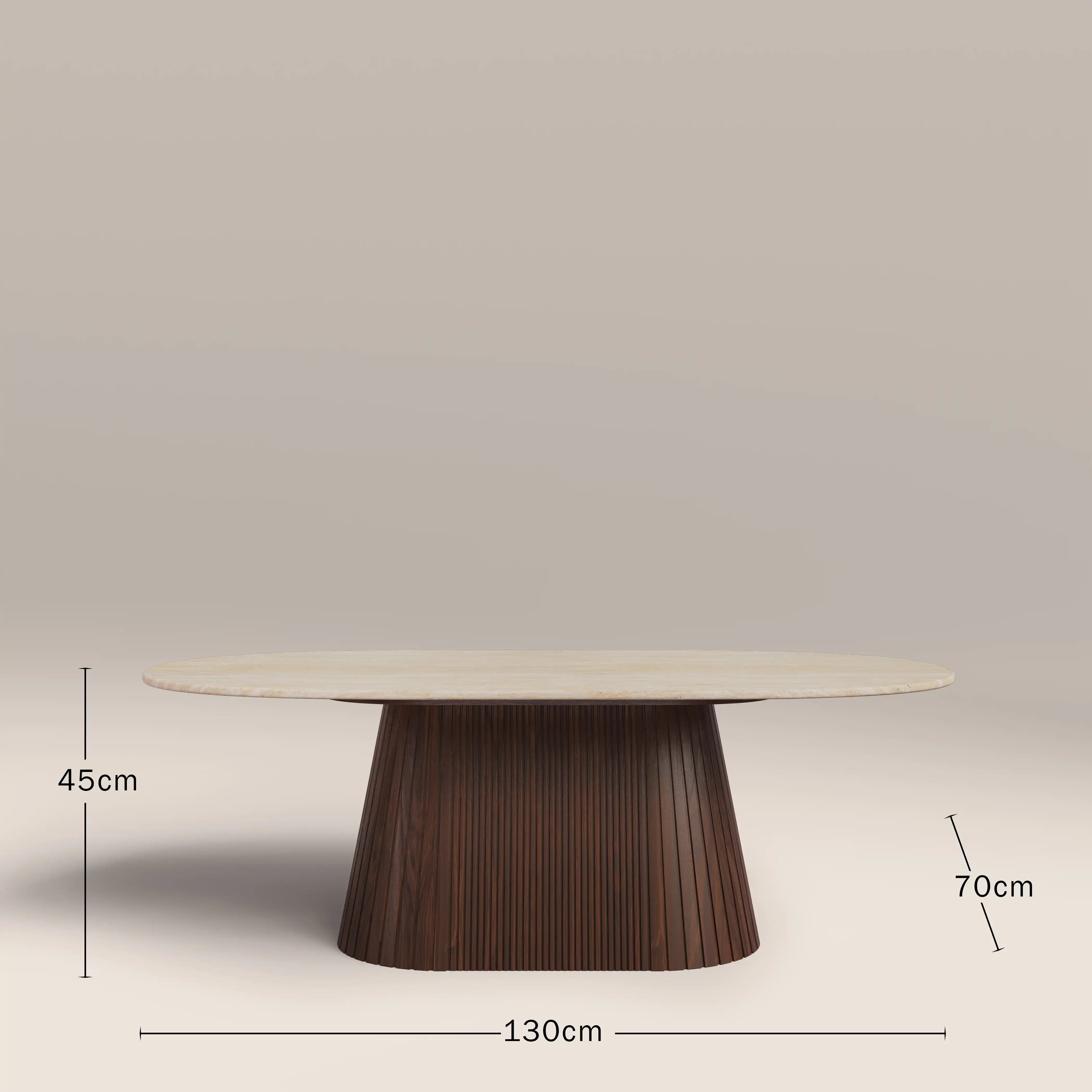 The Oxborough Coffee Table combines a neutral colour palette of creams and browns for a living room table with long-lasting appeal. Featuring a travertine effect tabletop and conical base with ribbed walnut wood effect finish for style as well as stability, this cream coffee table is elevated elegance.