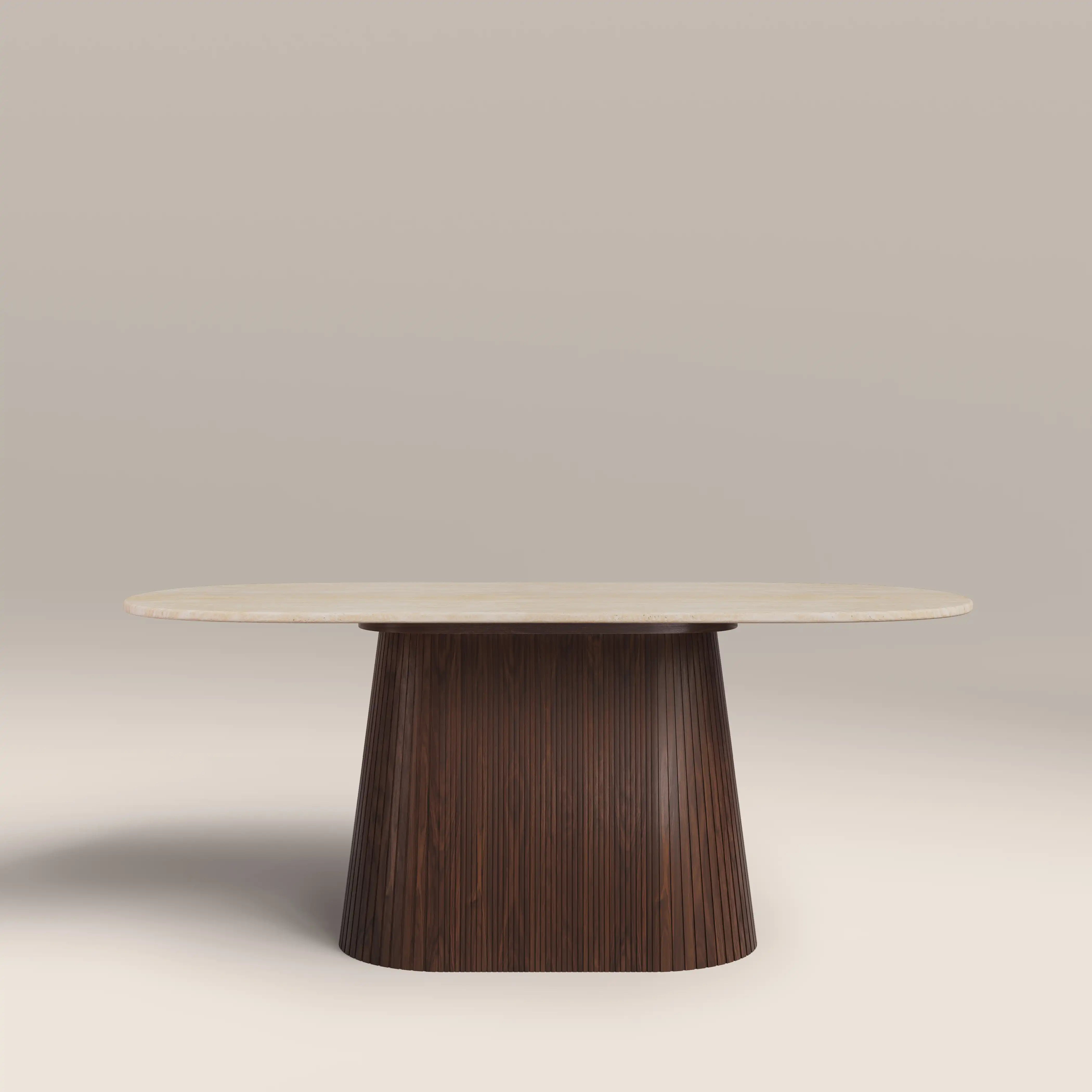 The Oxborough Oval 6 Seat Dining Table is elevated elegance. Combining a neutral colour palette of creams and browns, this stone dining table has a travertine and wood effect finish that ensures durability and low maintenance. With a conical base in a ribbed walnut wood effect for style as well as stability, there's plenty of space to gather with the Oxborough.