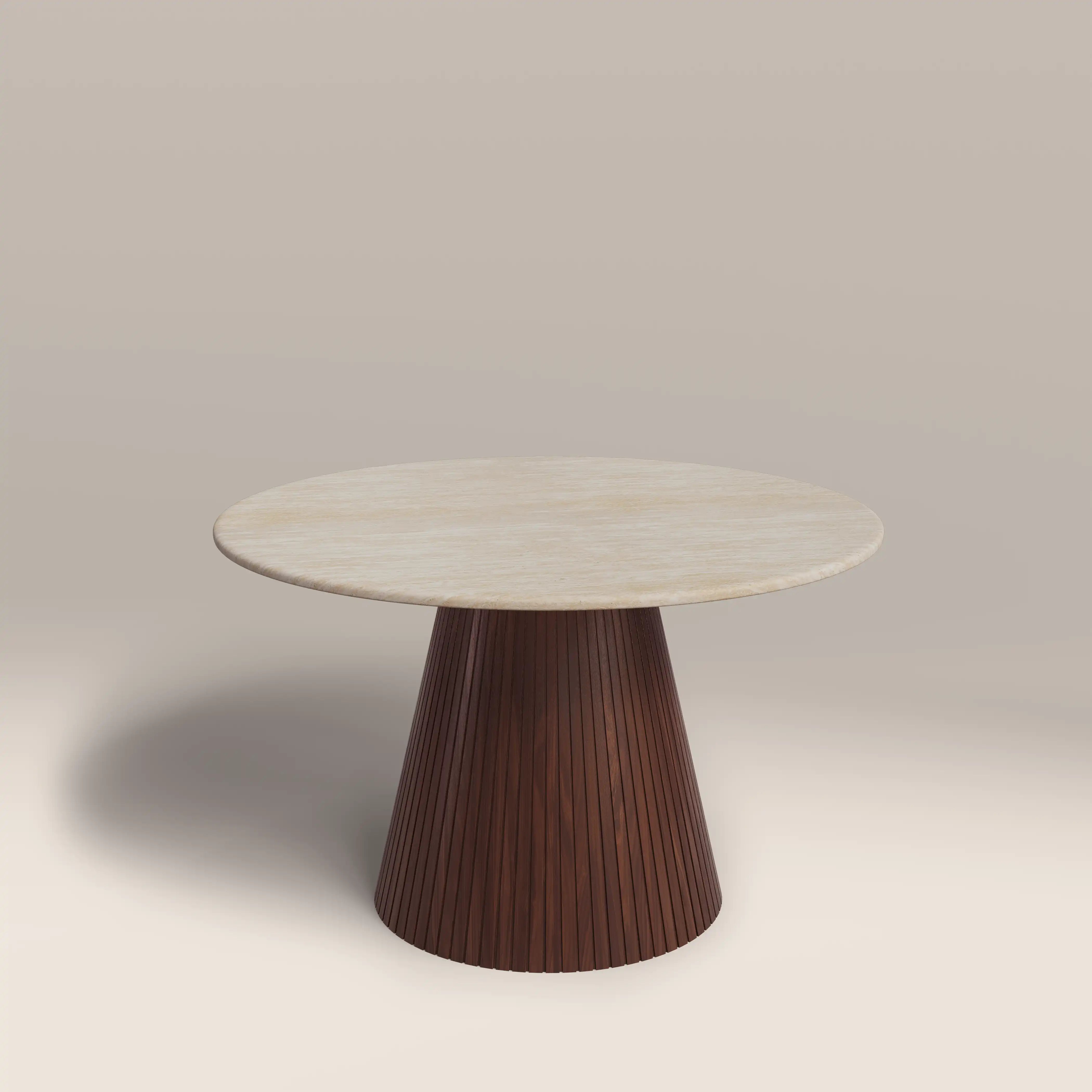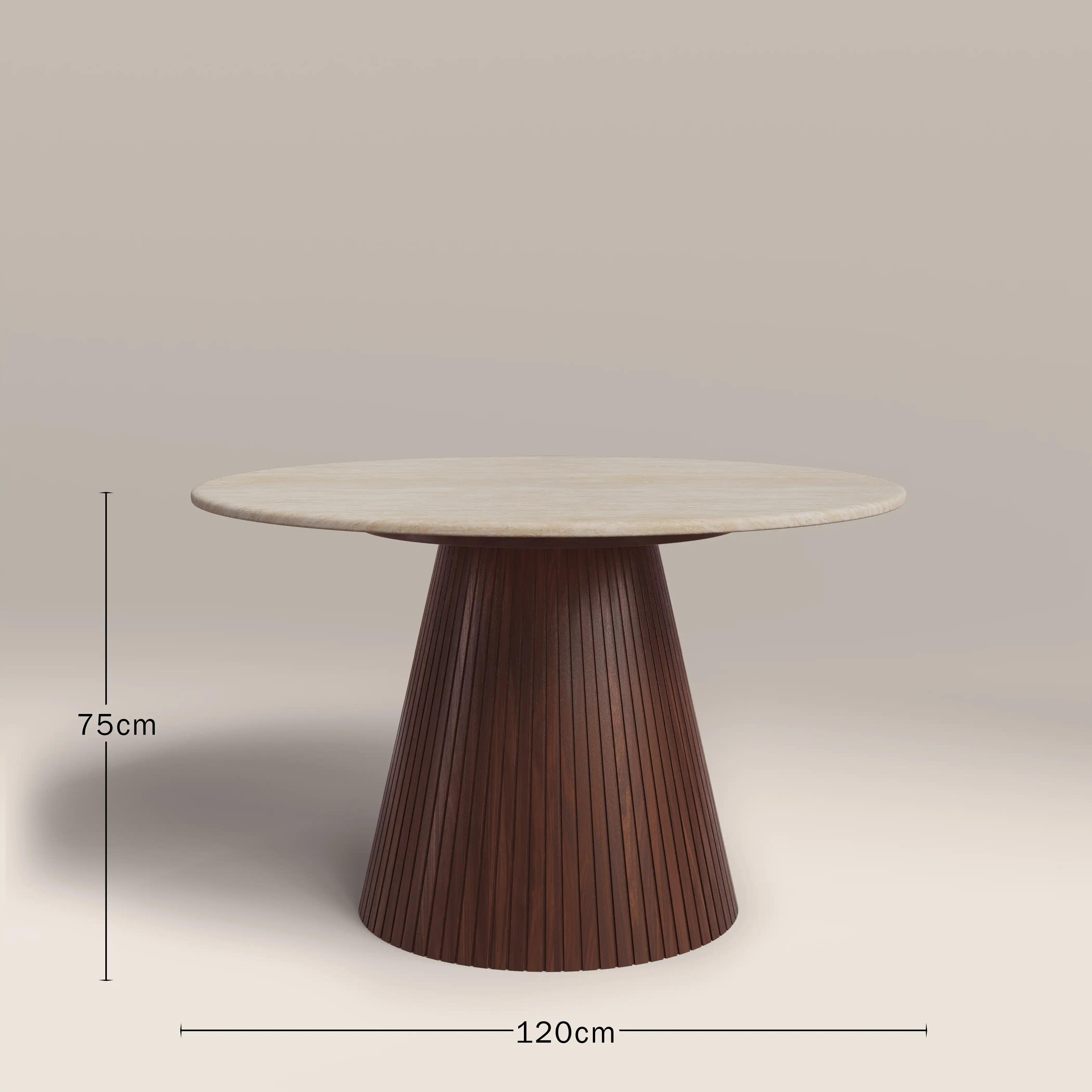 The Oxborough 6 Seat Dining Table is elevated elegance. Combining a neutral colour palette of creams and browns, this stone dining table has a travertine and wood effect finish that ensures durability and low maintenance. With a conical base in a ribbed walnut wood effect for style as well as stability, there's plenty of space to gather with the Oxborough.