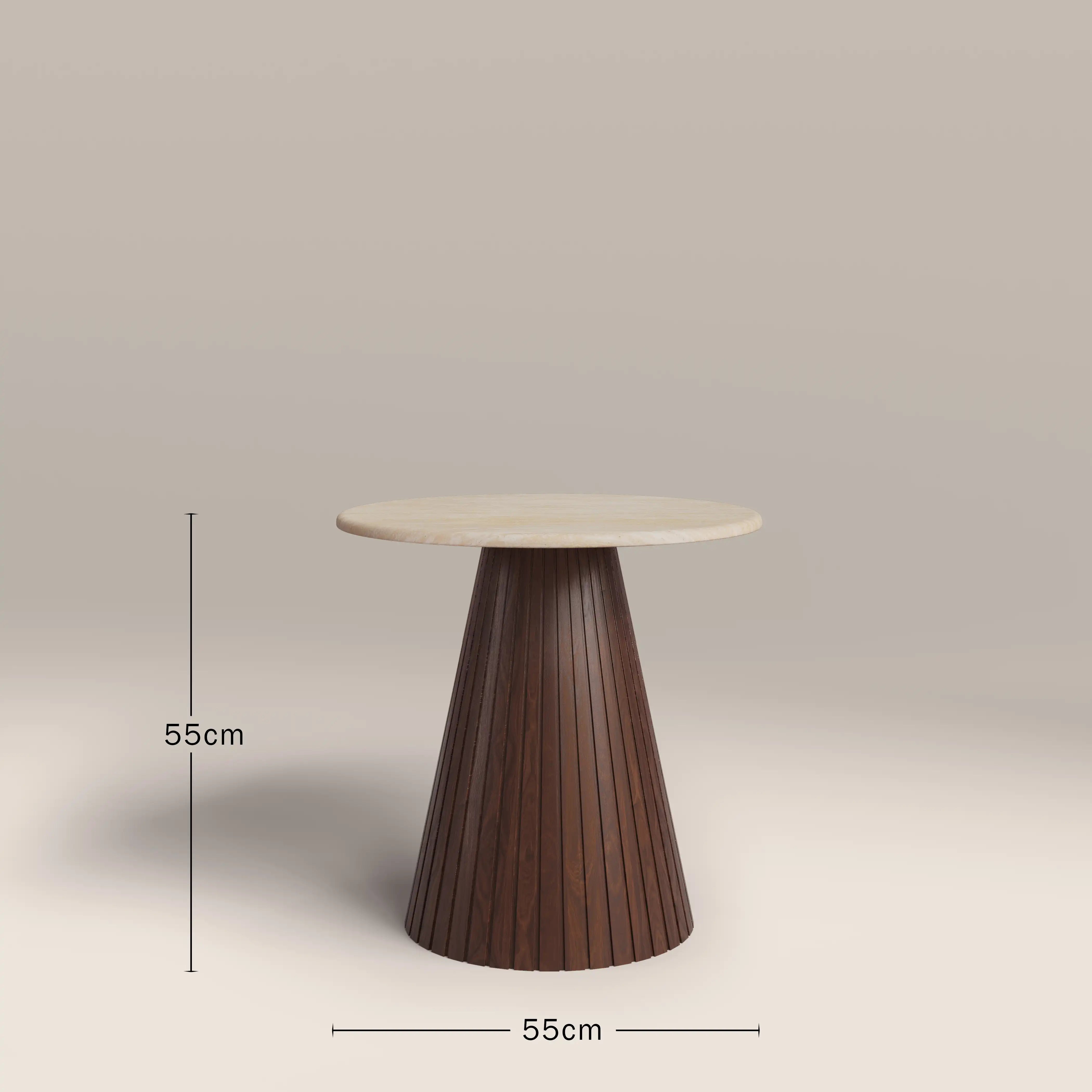 The Oxborough Side Table combines the neutral colour palette of creams and browns for a living room end table with long-lasting appeal. Featuring a travertine effect tabletop and conical base with ribbed walnut wood effect finish for style as well as stability, this cream side table is elevated elegance.