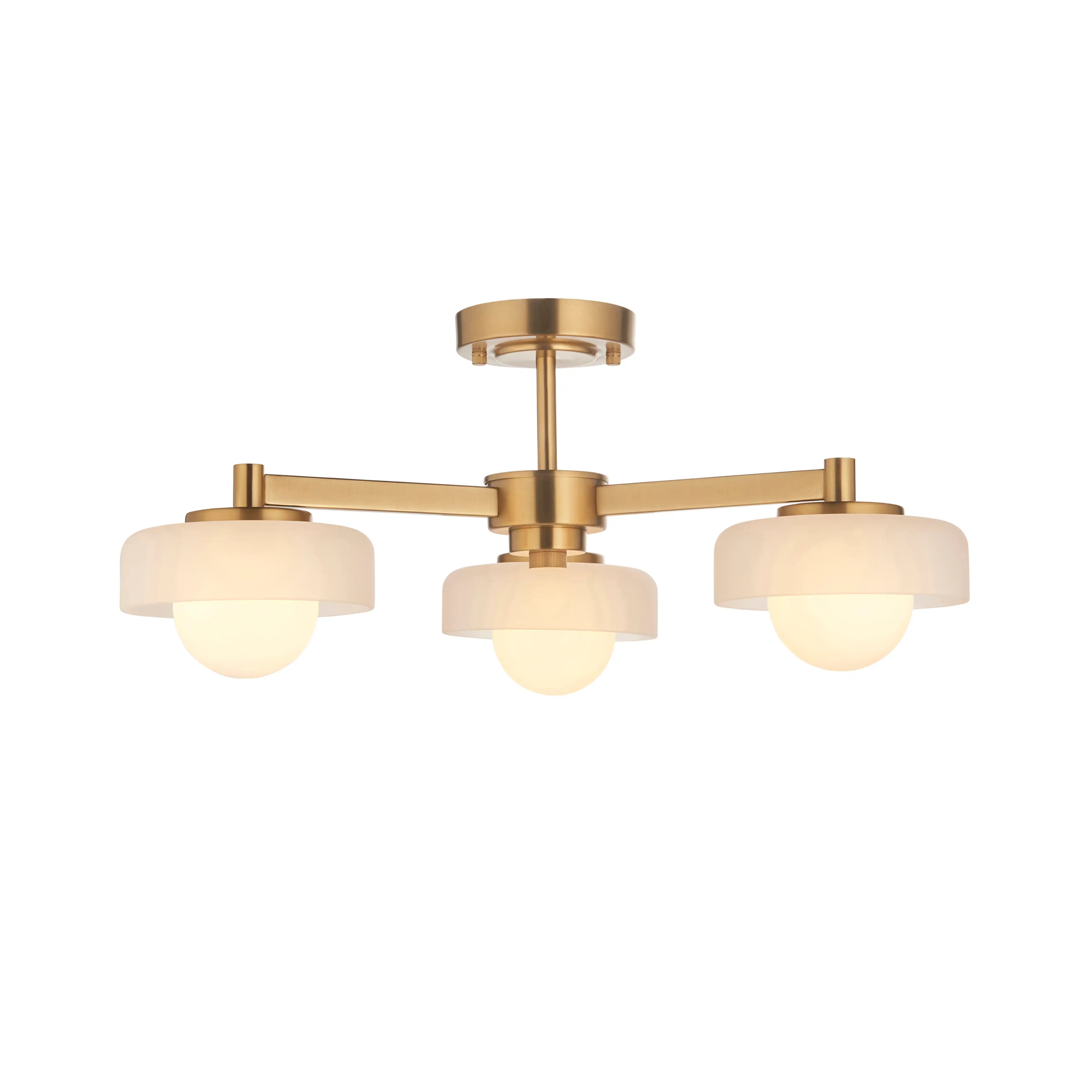 The Parson Semi-Flush Light delivers striking mid-century-inspired style. This retro light has three lights with frosted outer shades and opal inner globes for a soft, inviting glow. Ideal for low ceilings in dining rooms, living rooms or hallways, the brushed aged brass finish adds enduring elegance. With crisp lines, harmonious proportions, and dimmable functionality, the Parson is perfect for those seeking sophisticated retro flair.