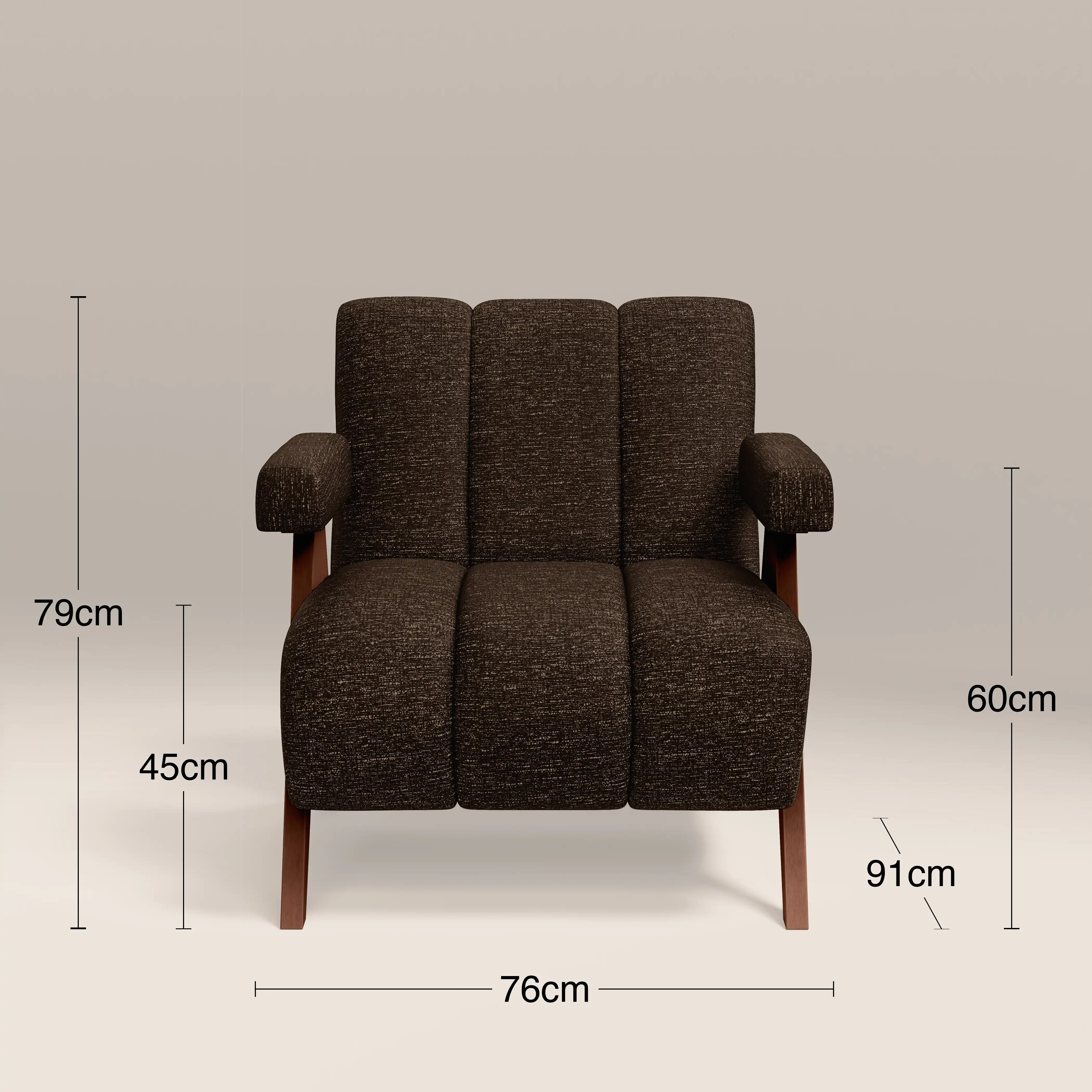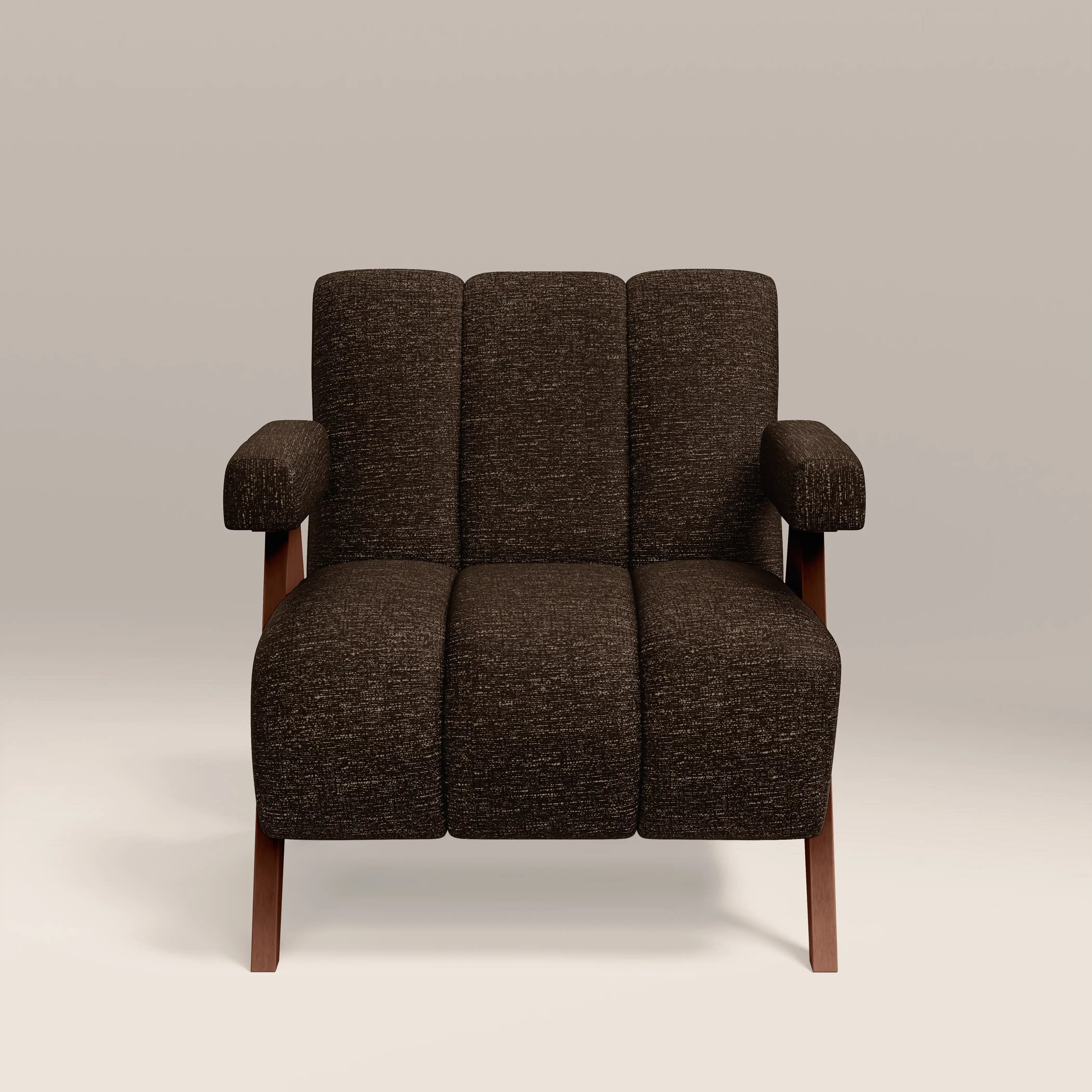 Introducing the Paulo Boucle Armchair; a luxe 70s revival armchair that commands your attention. This statement chair has a tactile seat and backrest in boucle that features dynamic ribbed stitching within the sturdy walnut-stained wooden frame for definition and refined design. For ultimate comfort, the Paulo has padded armrests and a spring-set seat. In a warm and soft speckled espresso boucle for a neutral and calming aura.