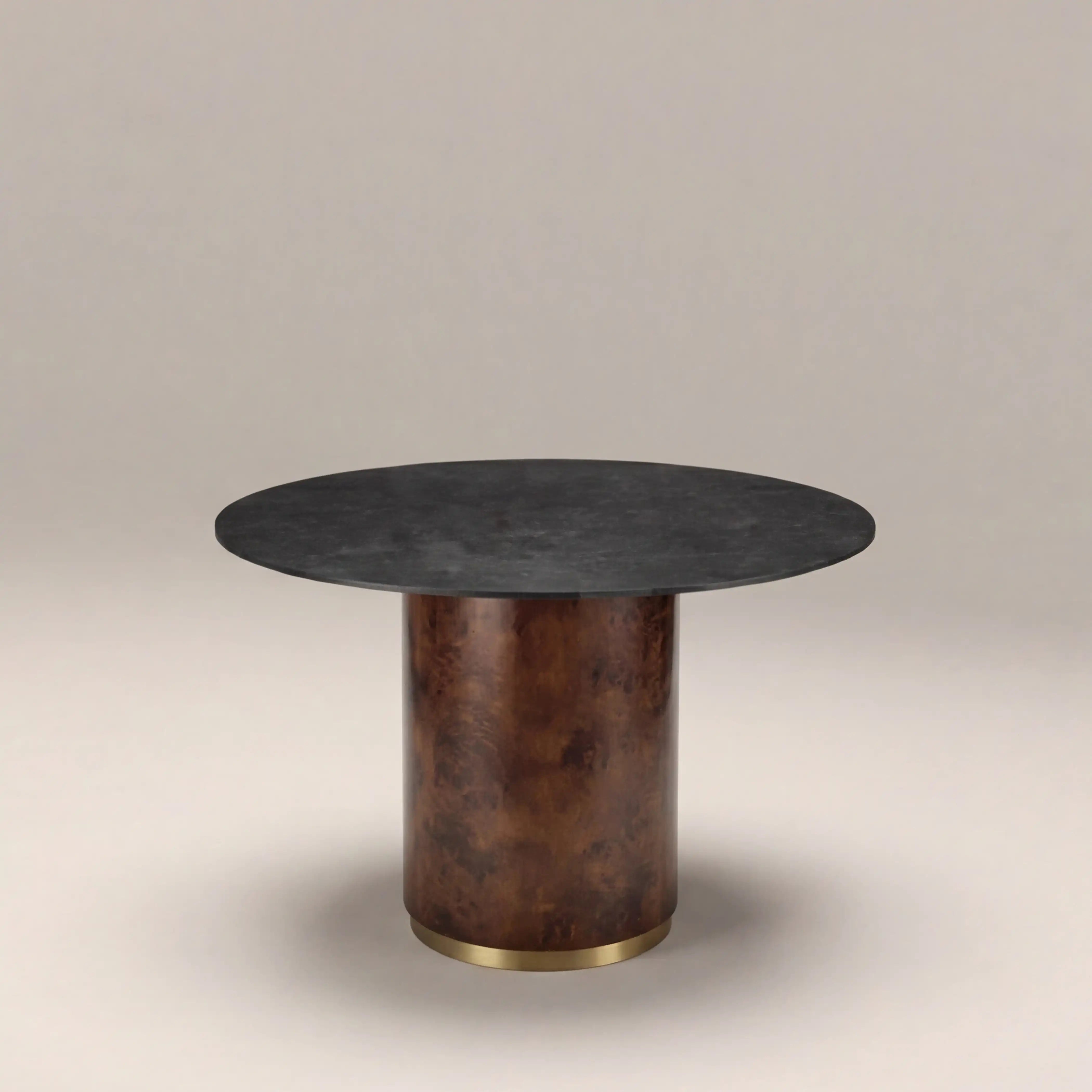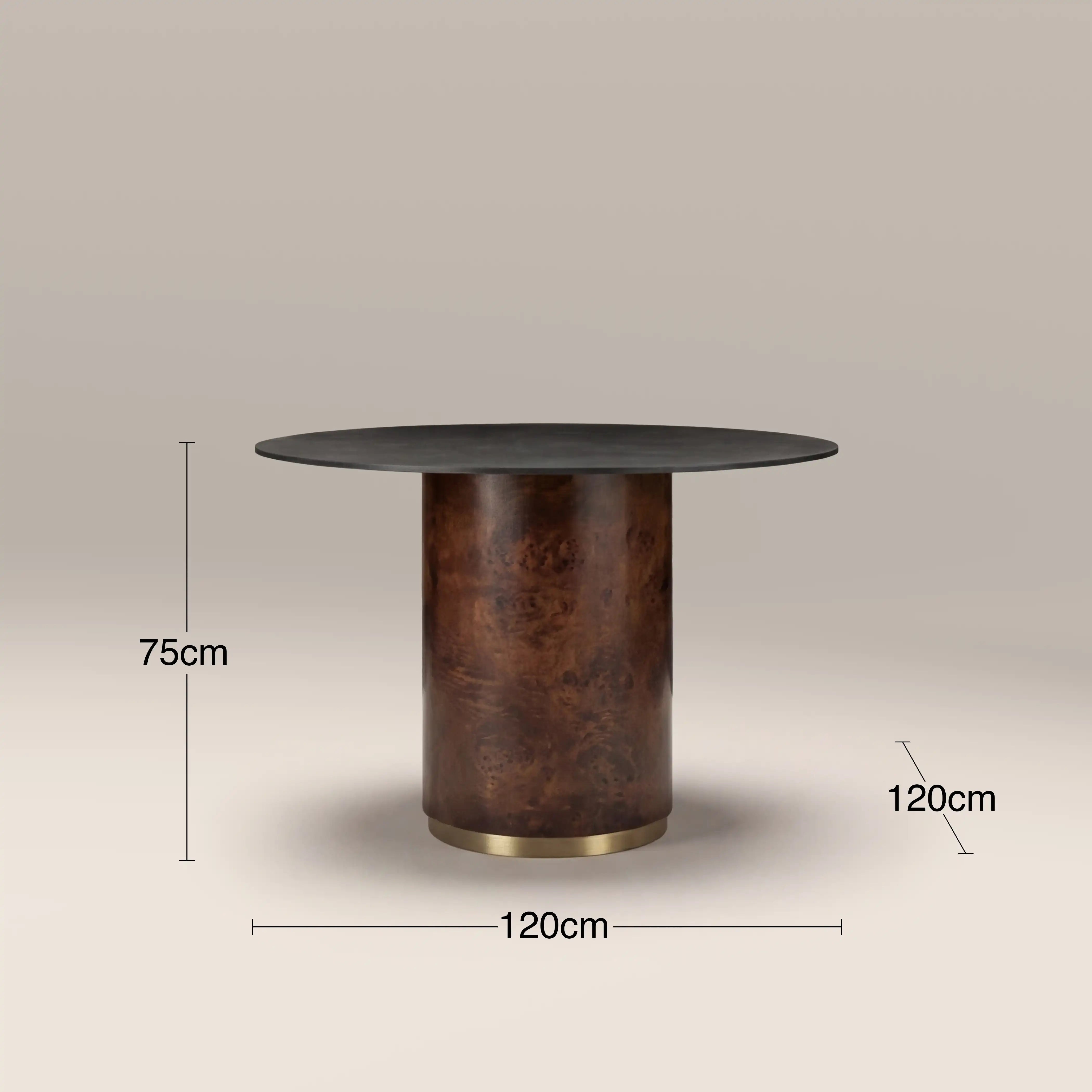 This striking 4 Seat round dining table features a sleek black sintered stone top, prized for its durability and sophisticated matte finish. The top rests gracefully on a walnut stained burl wood veneer pedestal base, showcasing rich, organic patterns unique to each piece. A brushed brass rim adds a touch of refined contrast, highlighting the table’s clean silhouette and luxurious materials. Match with the Perry carver dining chair, perfect as a statement centrepiece for both a modern and retro luxe aesthetic.