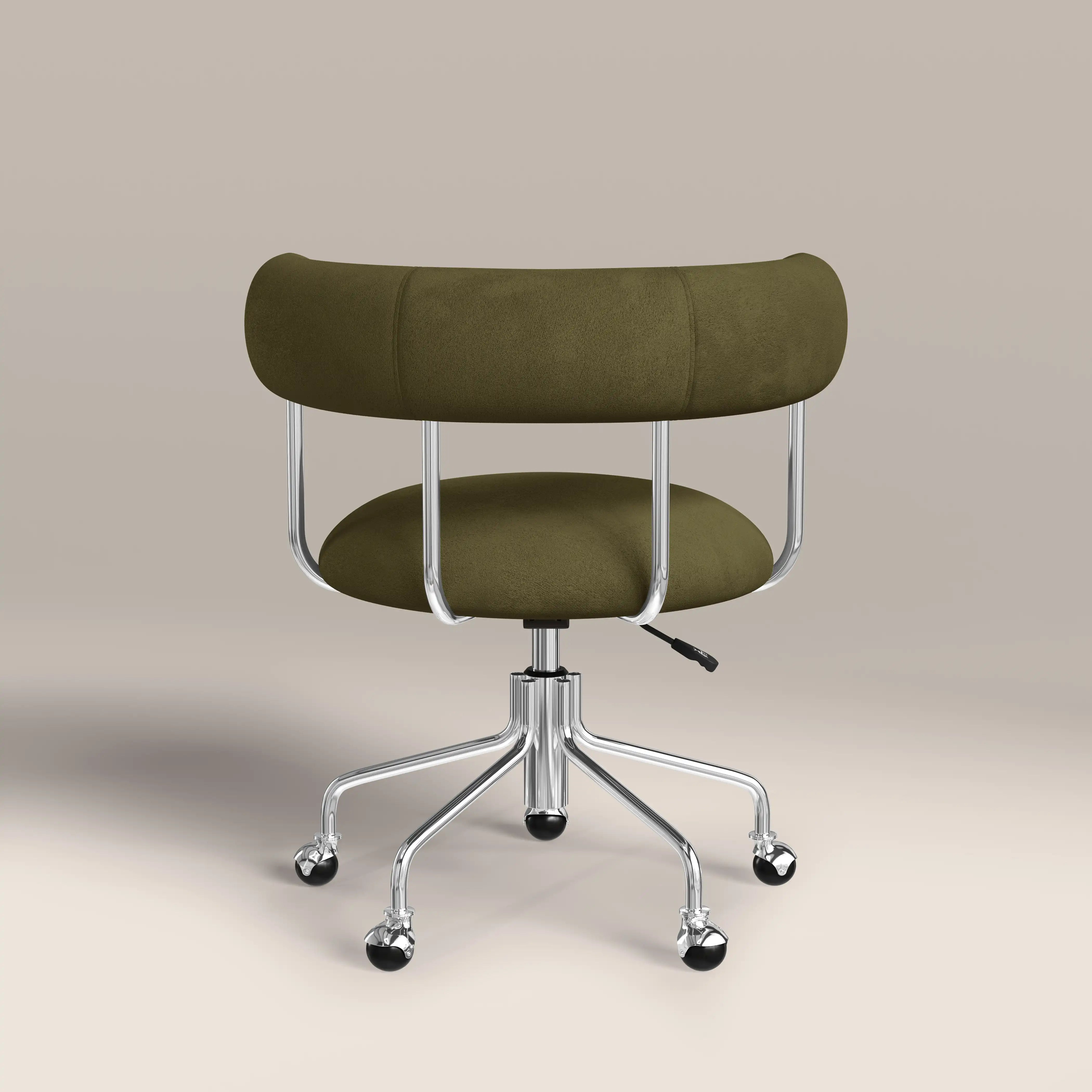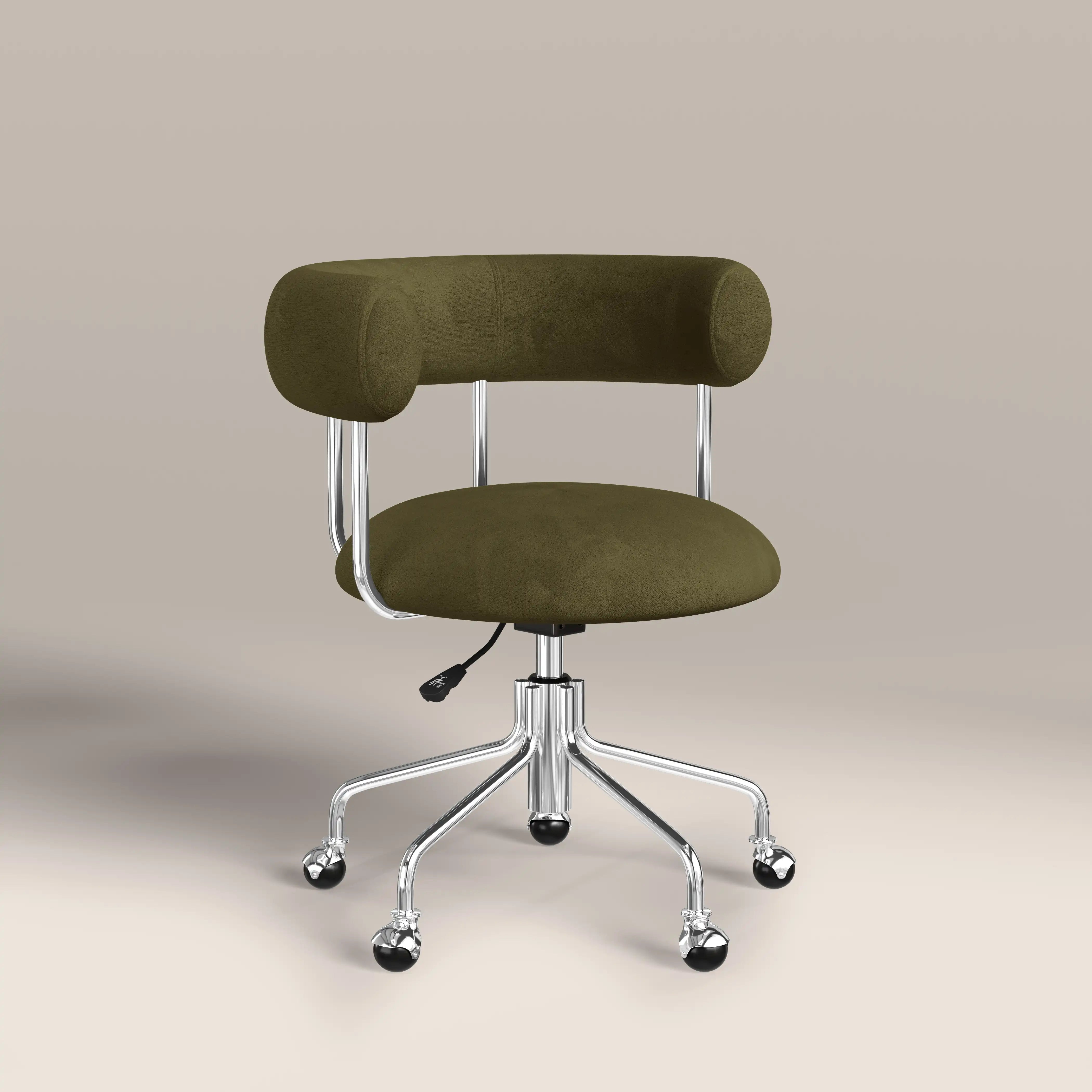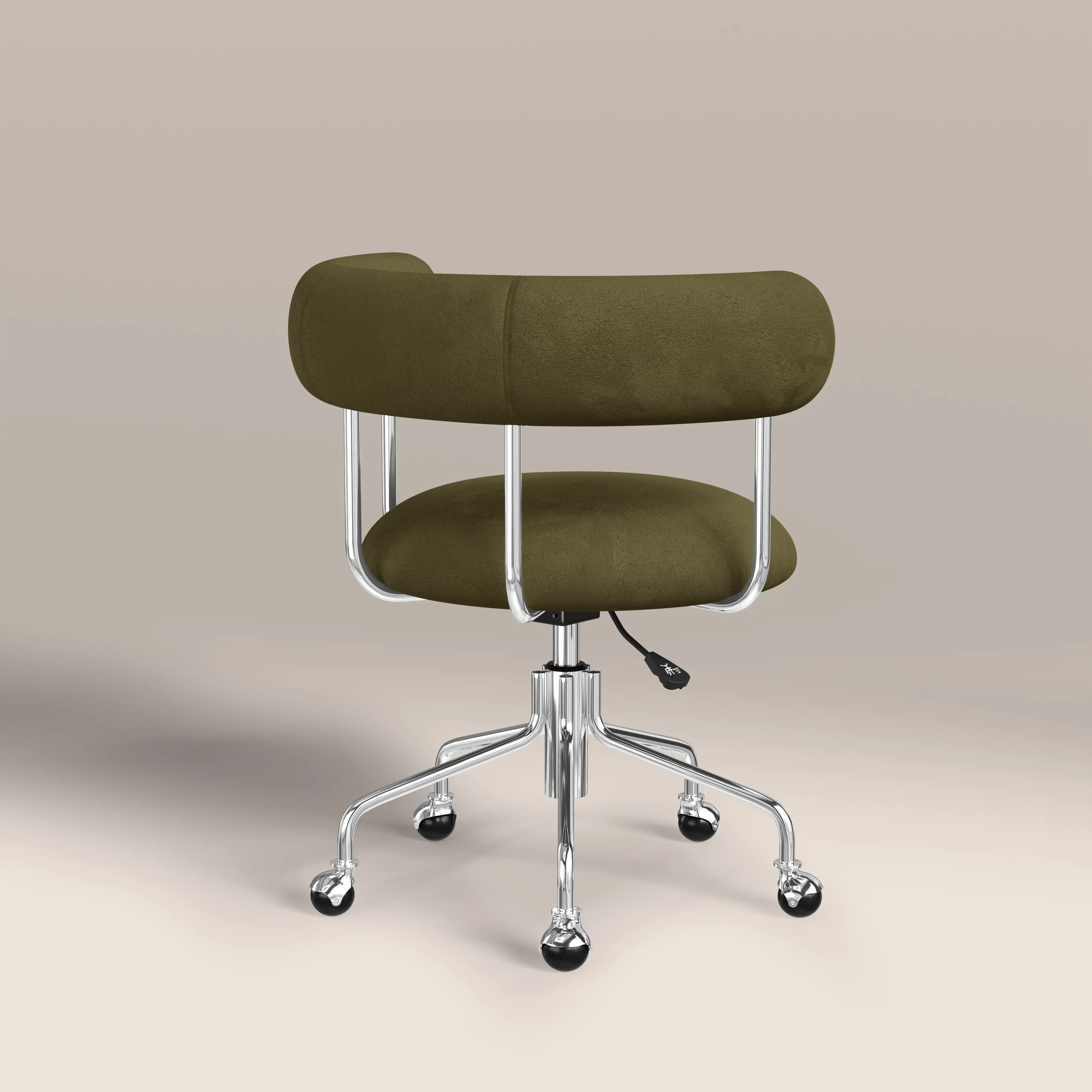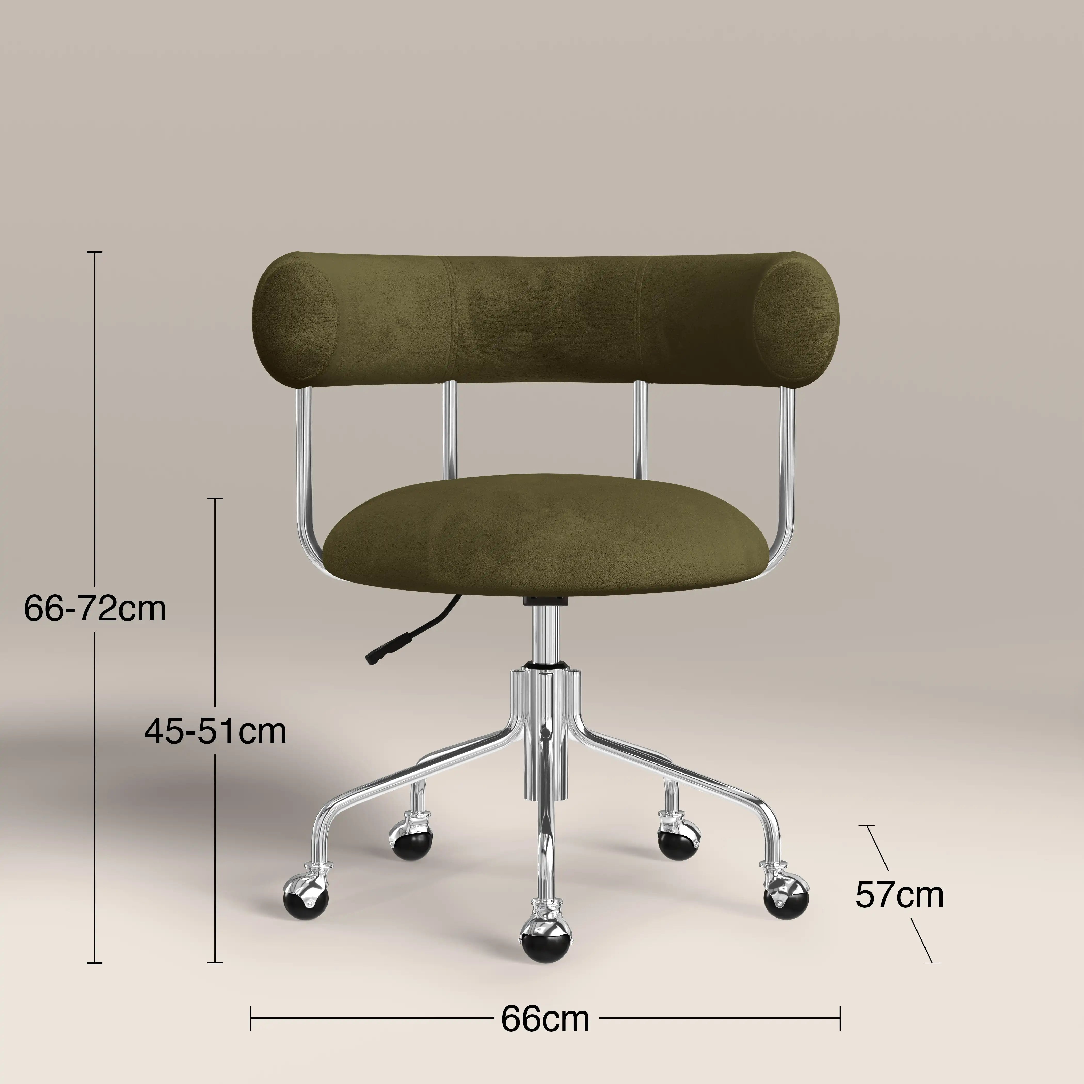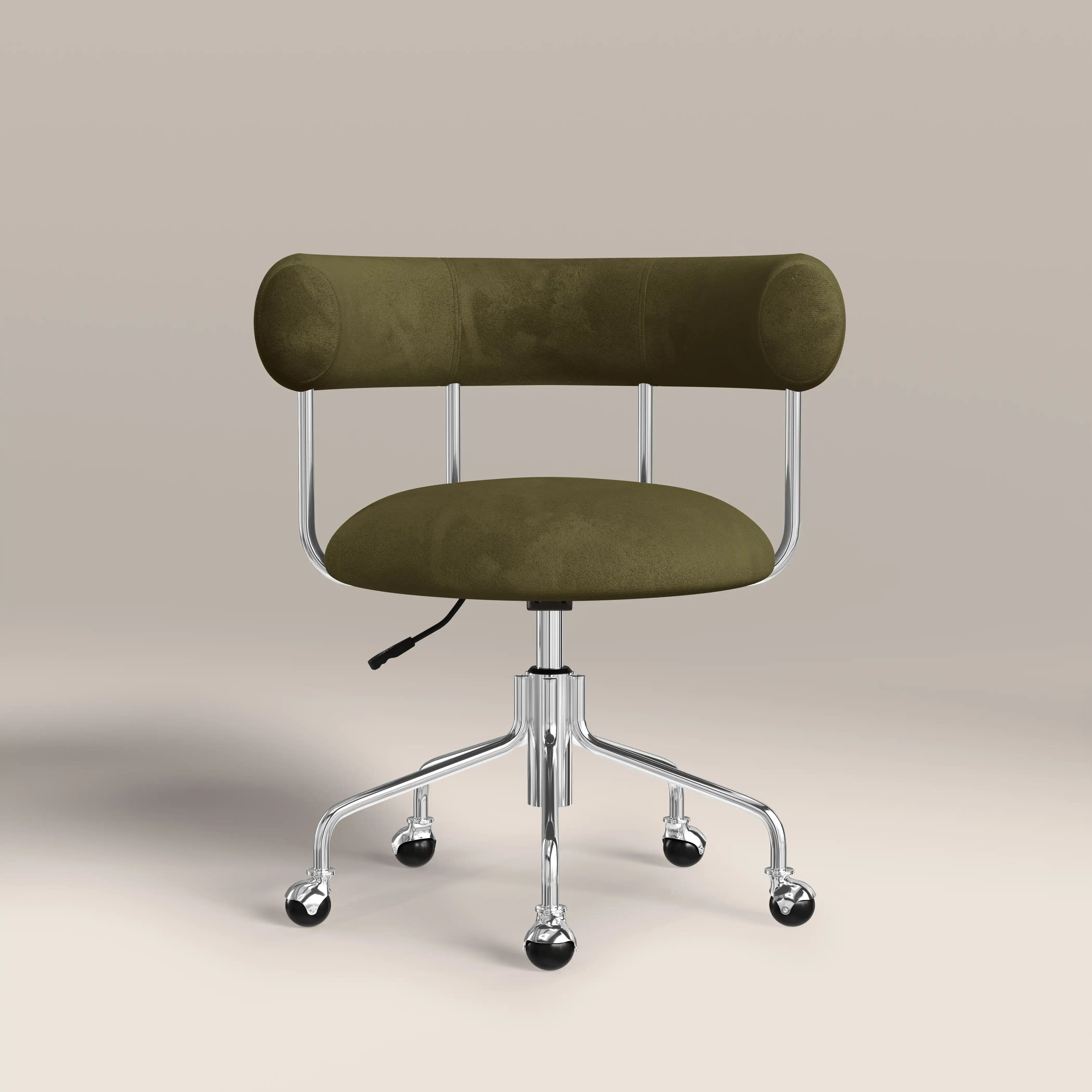 Say hello to your new favourite office chair! With its sumptuously soft mohair velvet in luscious moss green and sleek, curved design, the Rae Office Chair is as chic as it is functional. The chrome frame and smooth-rolling casters bring a touch of cool while making it super easy to move around. Plus, the adjustable height means it'll fit just right at your desk. Whether it's for your home office or a chic workspace, this chair is the perfect mix of comfort and modern.