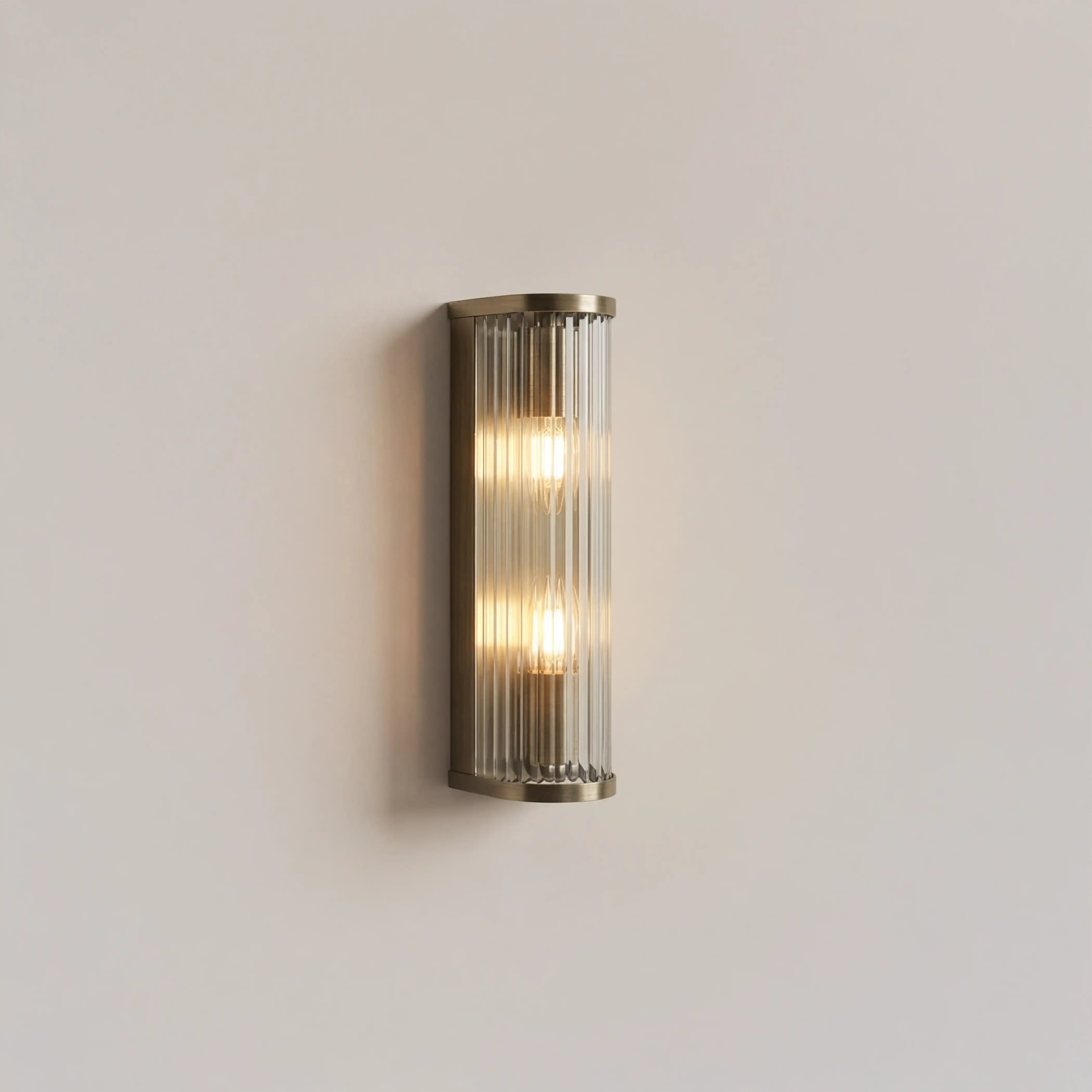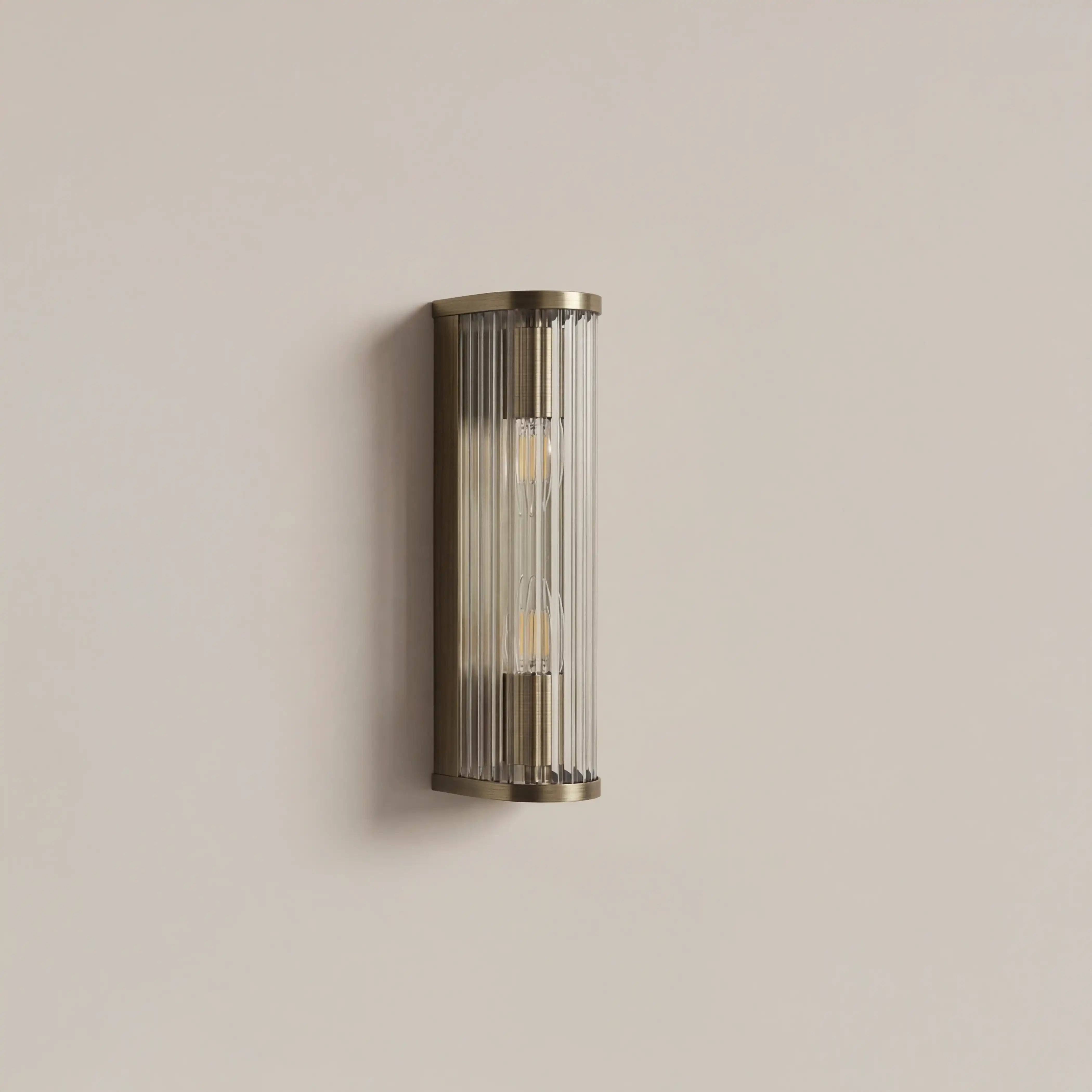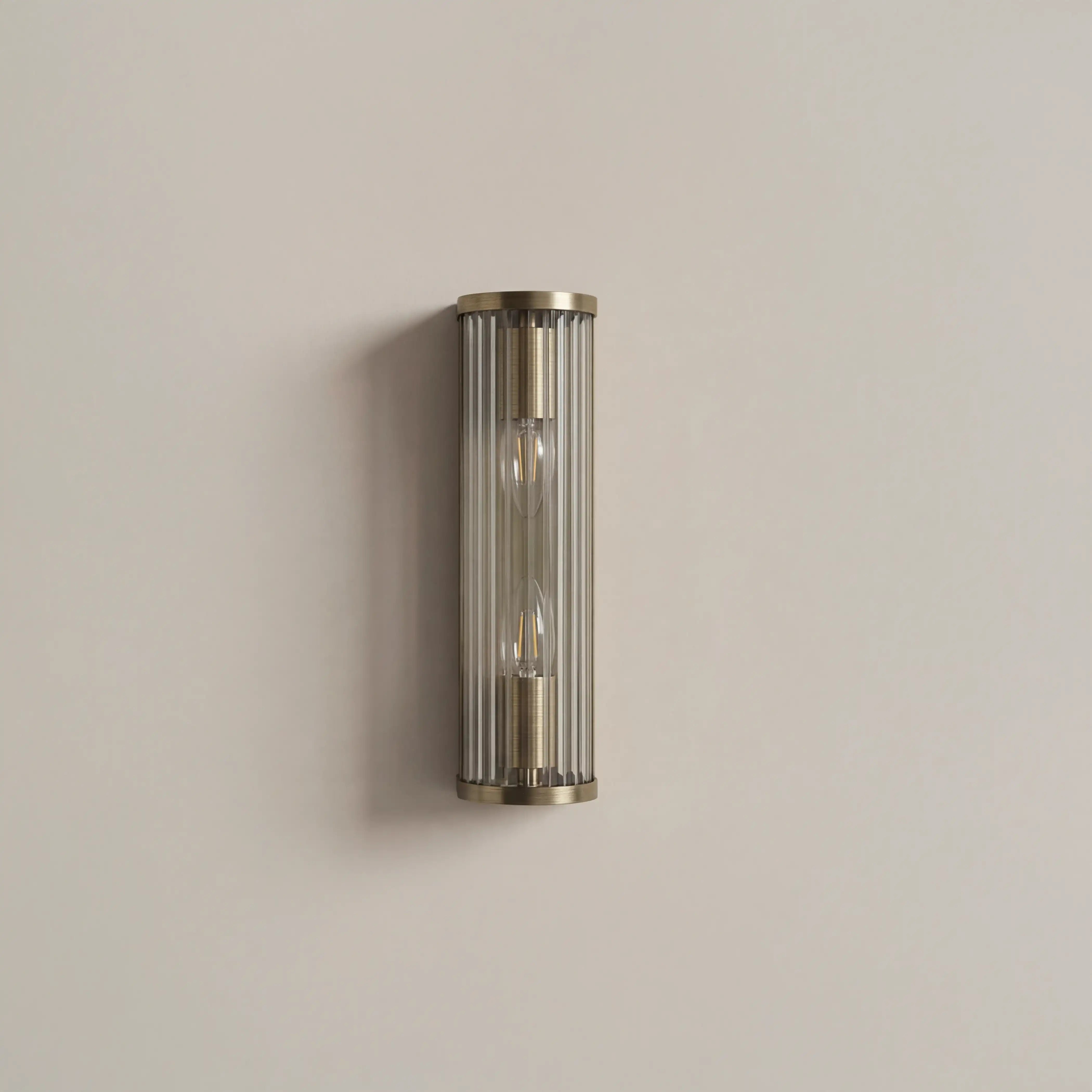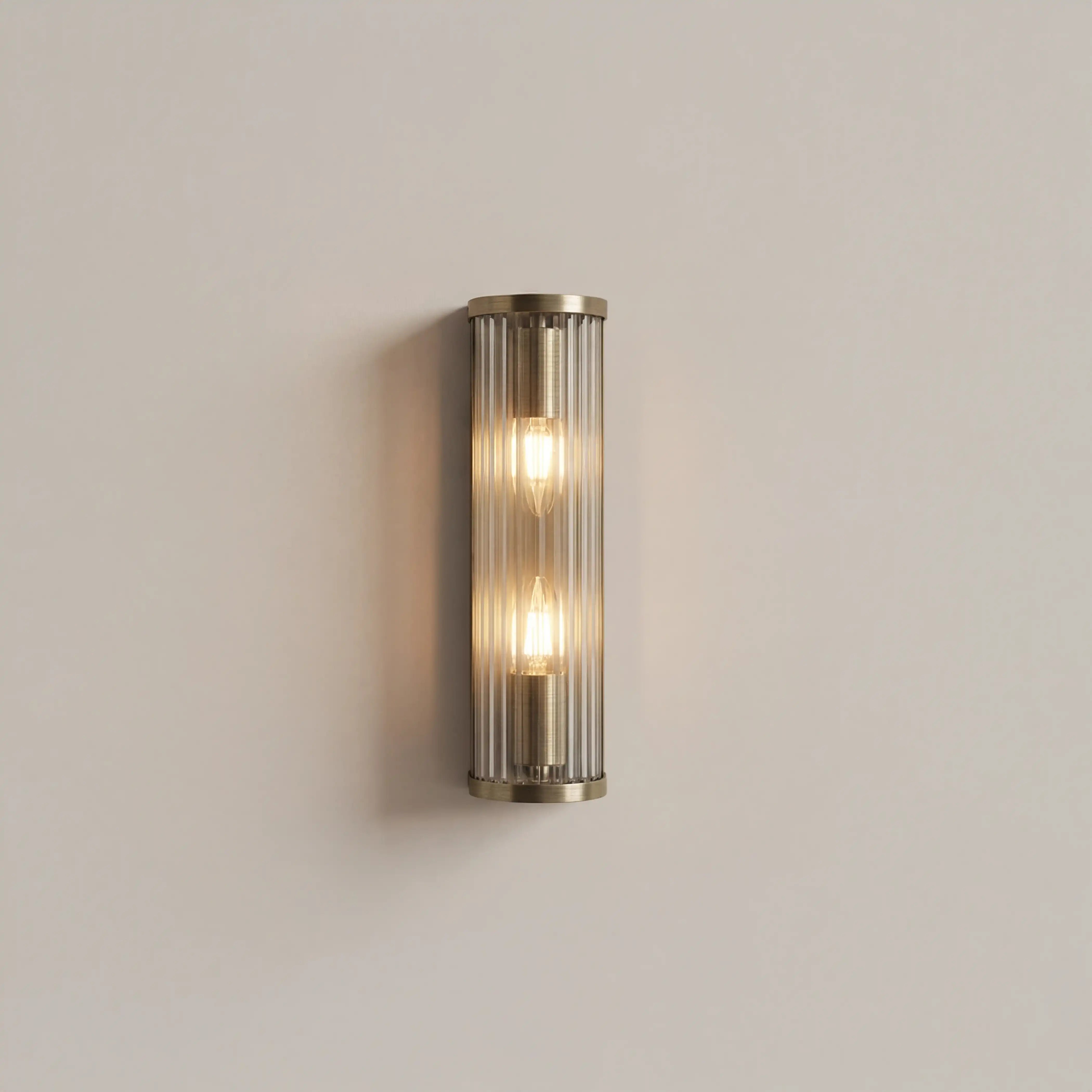 The Ridgton Two-Light Wall Light blends elegance and timeless design, featuring a cylindrical shade of vertically ribbed glass that balances texture with transparency. Framed in antique brass, it casts a soft, ambient glow while beautifully showcasing the bulb within. Ideal for hallways, dining rooms and living rooms, or as a pair beside a bed, this dimmable light delivers understated sophistication and sculptural presence, transforming everyday spaces into effortlessly refined interiors.