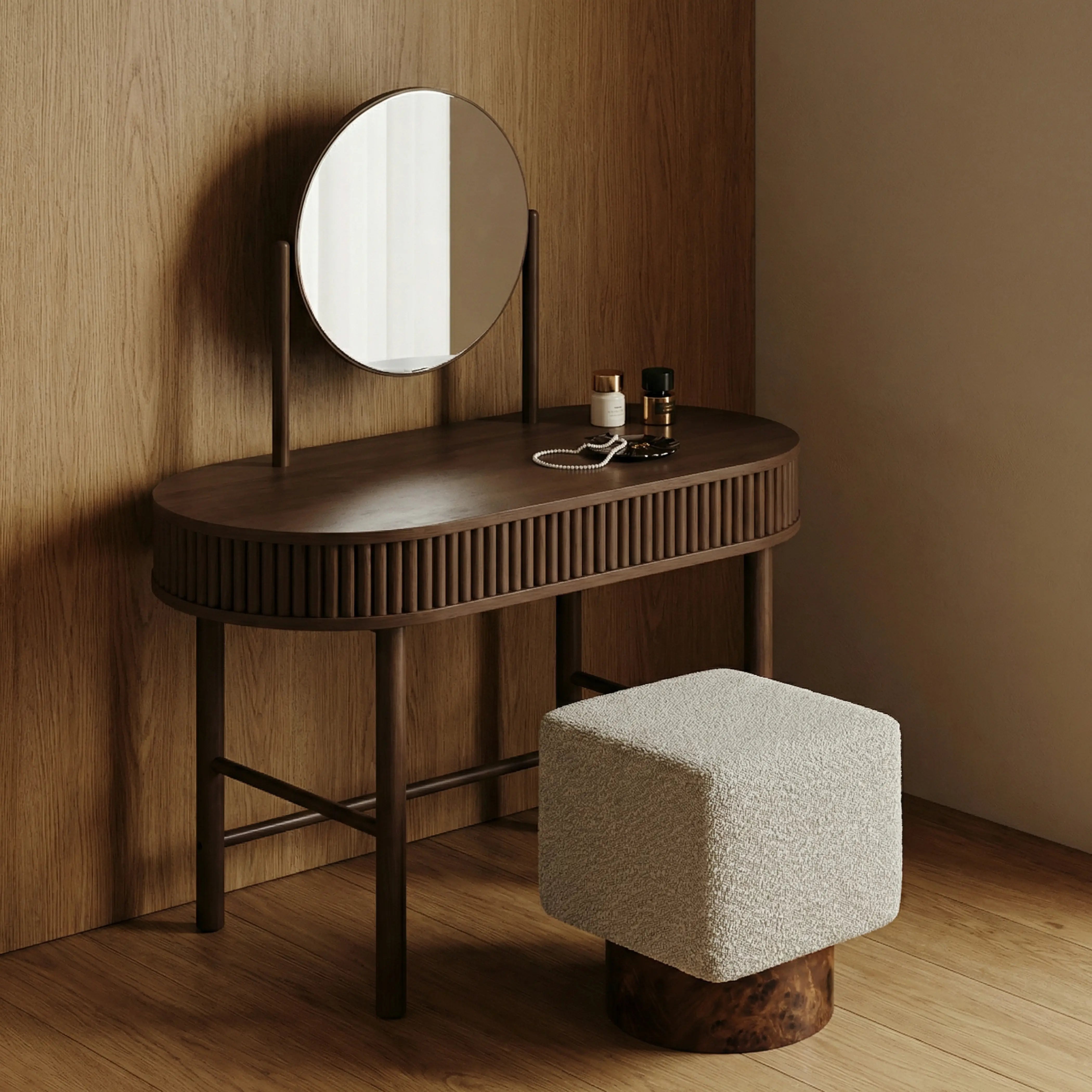 The Santana Wood Dressing Table blends natural beauty with smart design to create a stylish and practical space for your daily routine. The ribbed smoked walnut veneer adds warmth, while the smooth surface provides plenty of room for your essentials. A tilting mirror lets you find the perfect angle, and the single drawer offers convenient storage to keep your makeup and accessories organised.