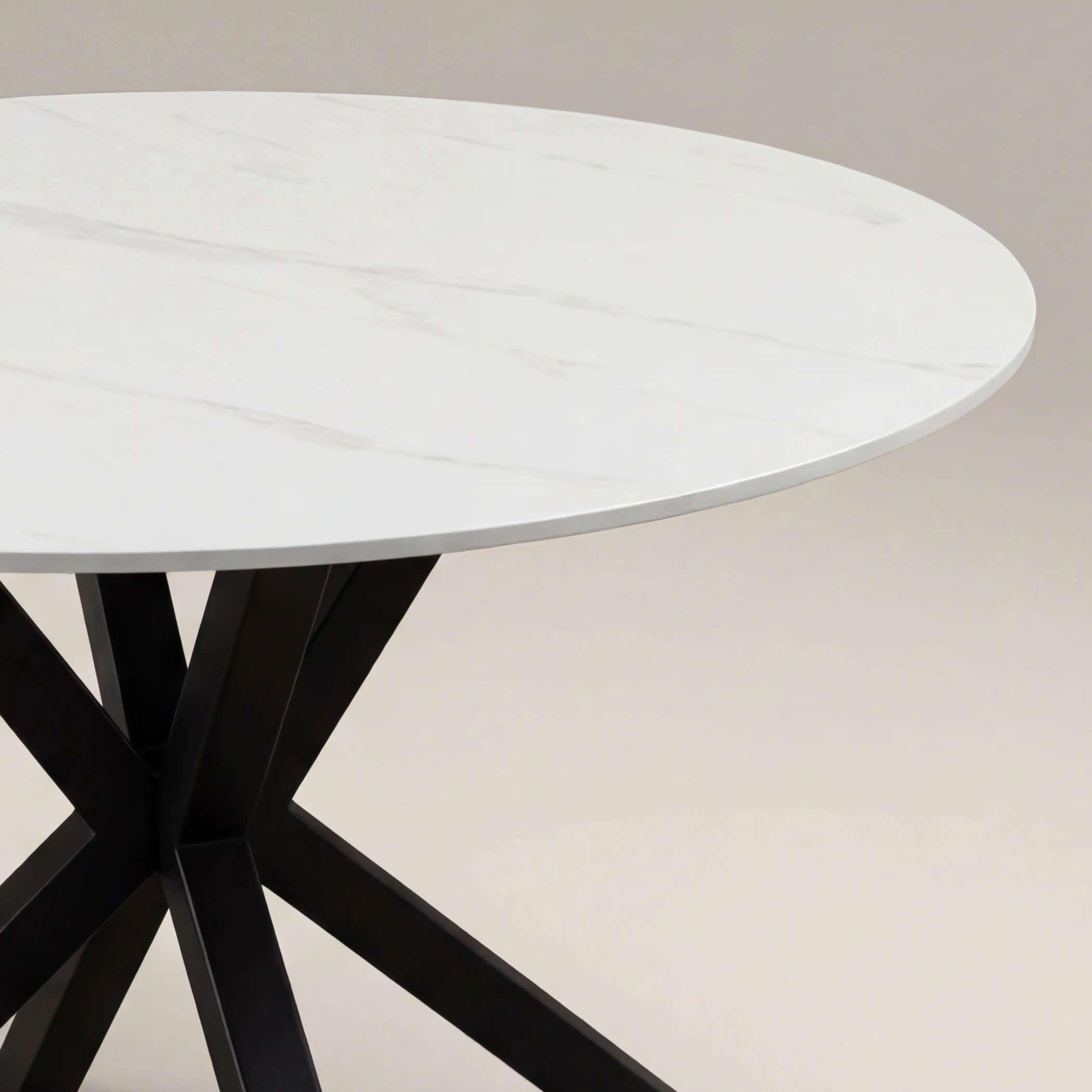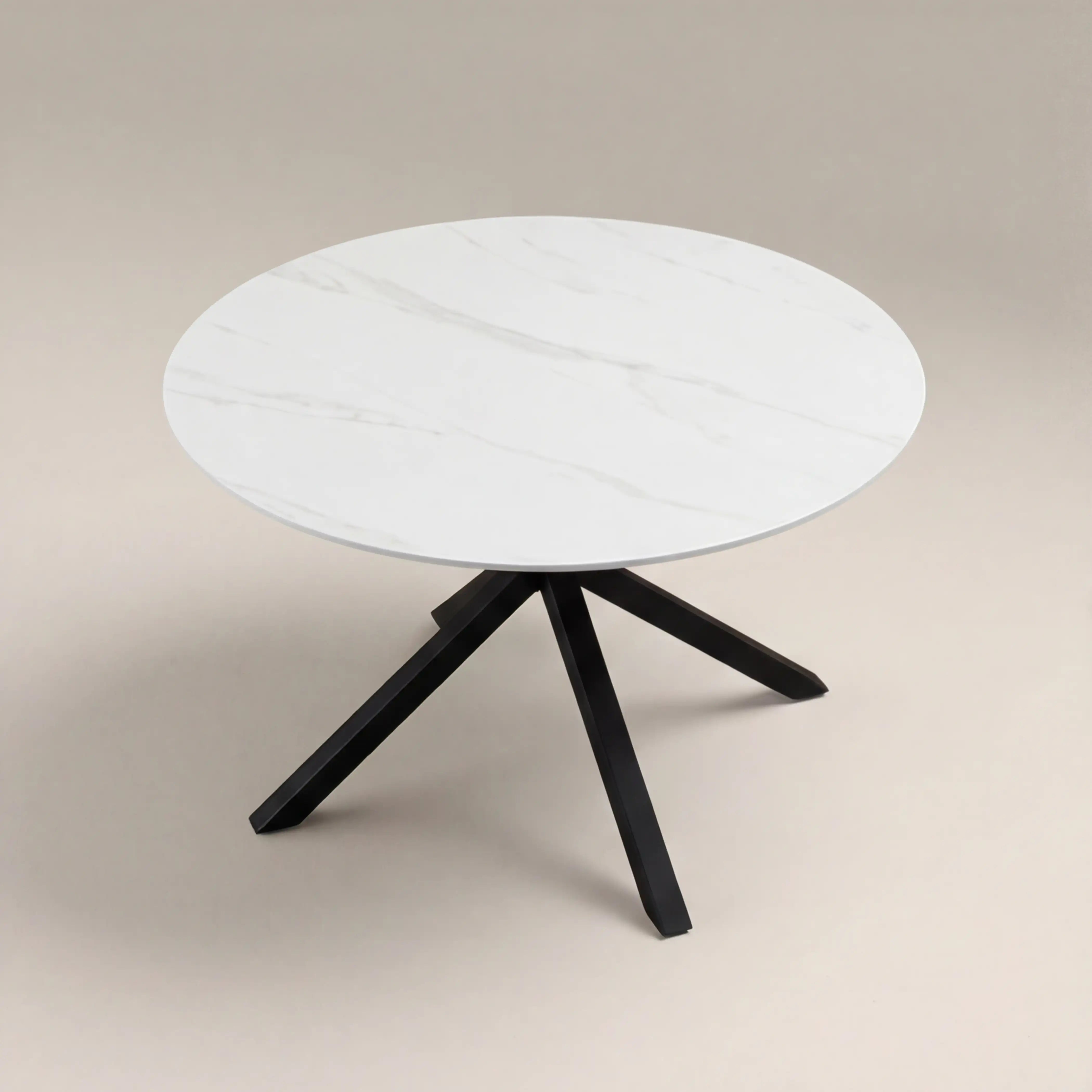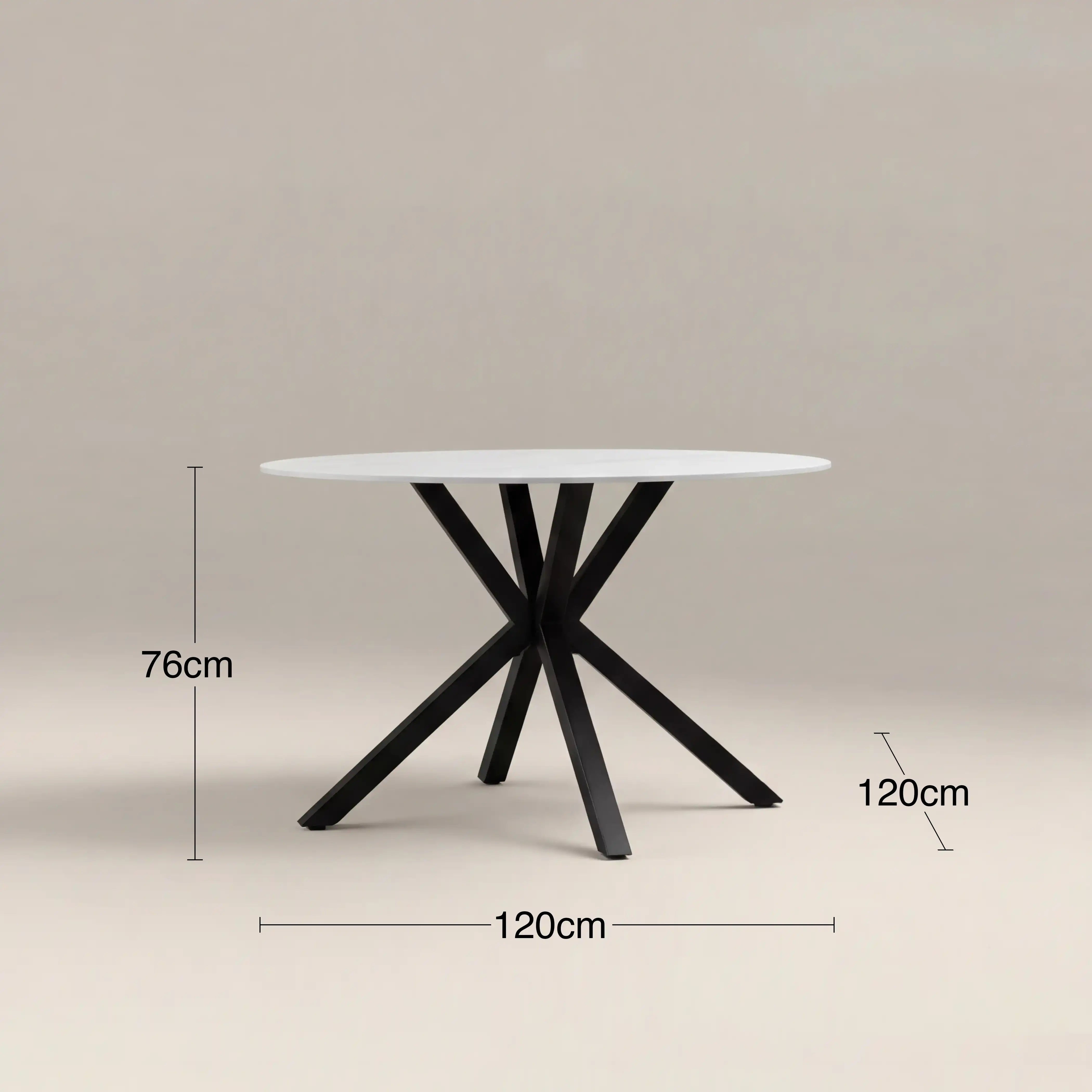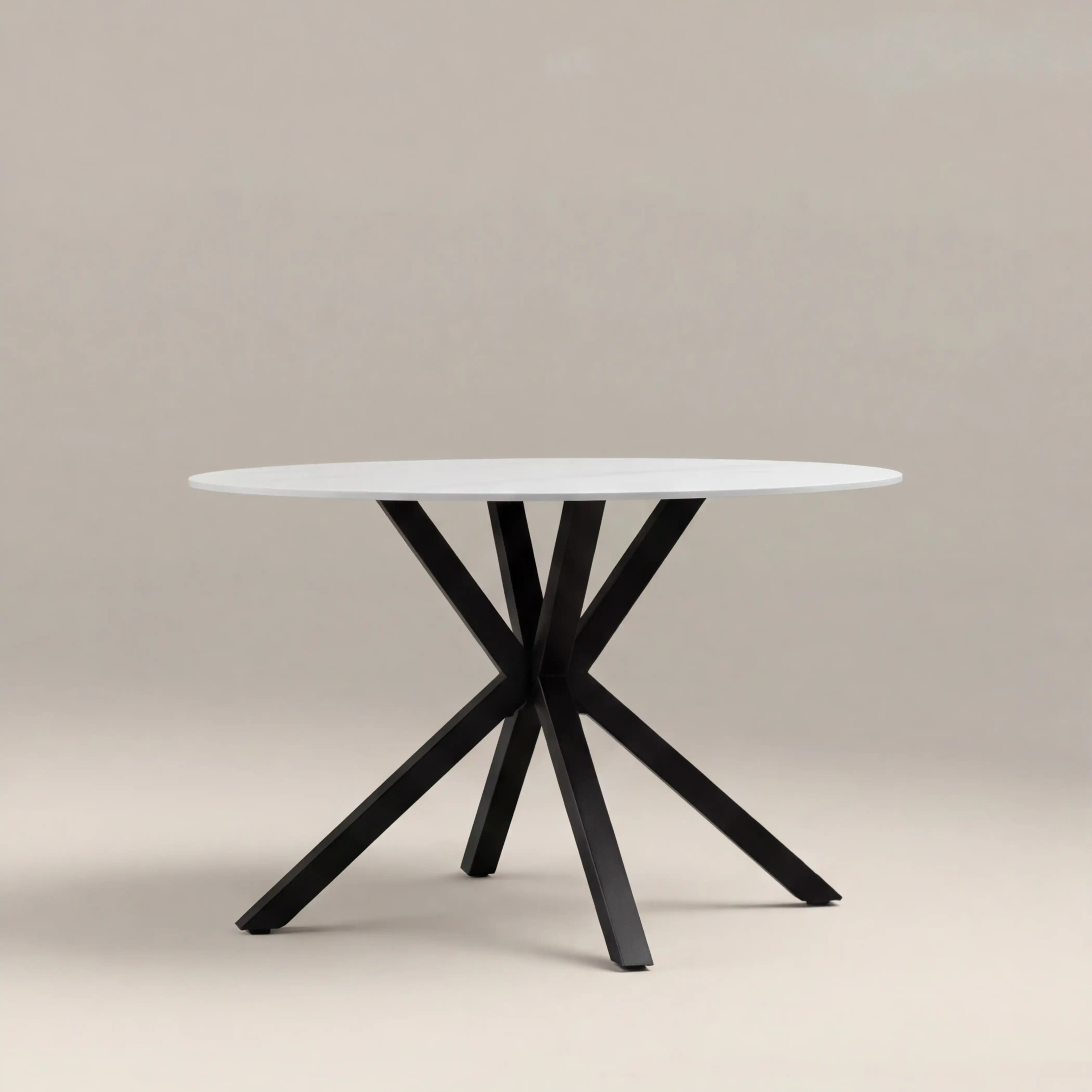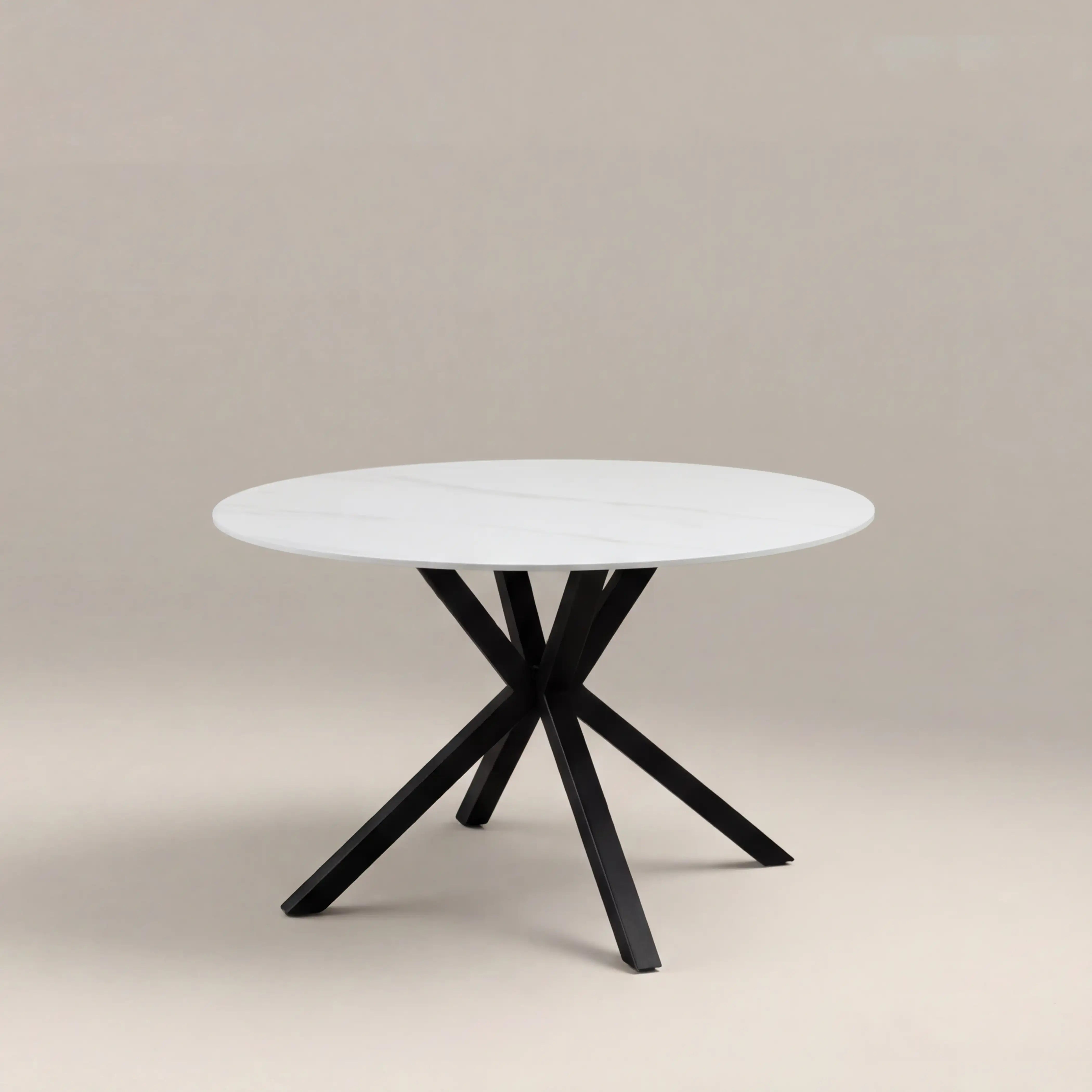 Comfortably sitting 4 people, the blend of raw materials mixes contemporary industrial design with everyday dining for a modern dining table built to last. The Sawyer Round Dining Table in White features sculptural starburst metal legs in black that offer stability and maximise legroom whilst the luxurious white tabletop is made from smooth and durable ceramic; low maintenance in a contemporary modern design.